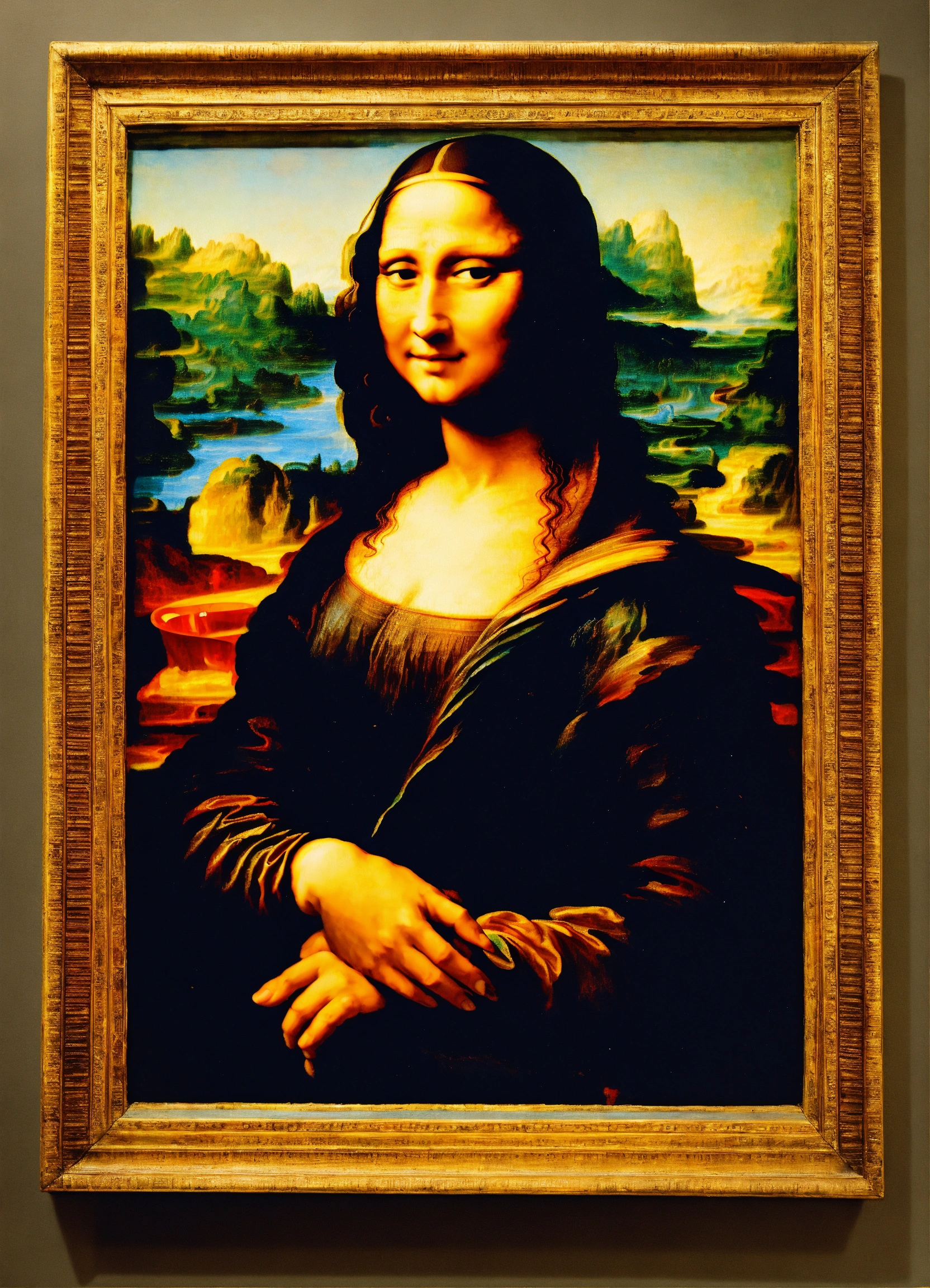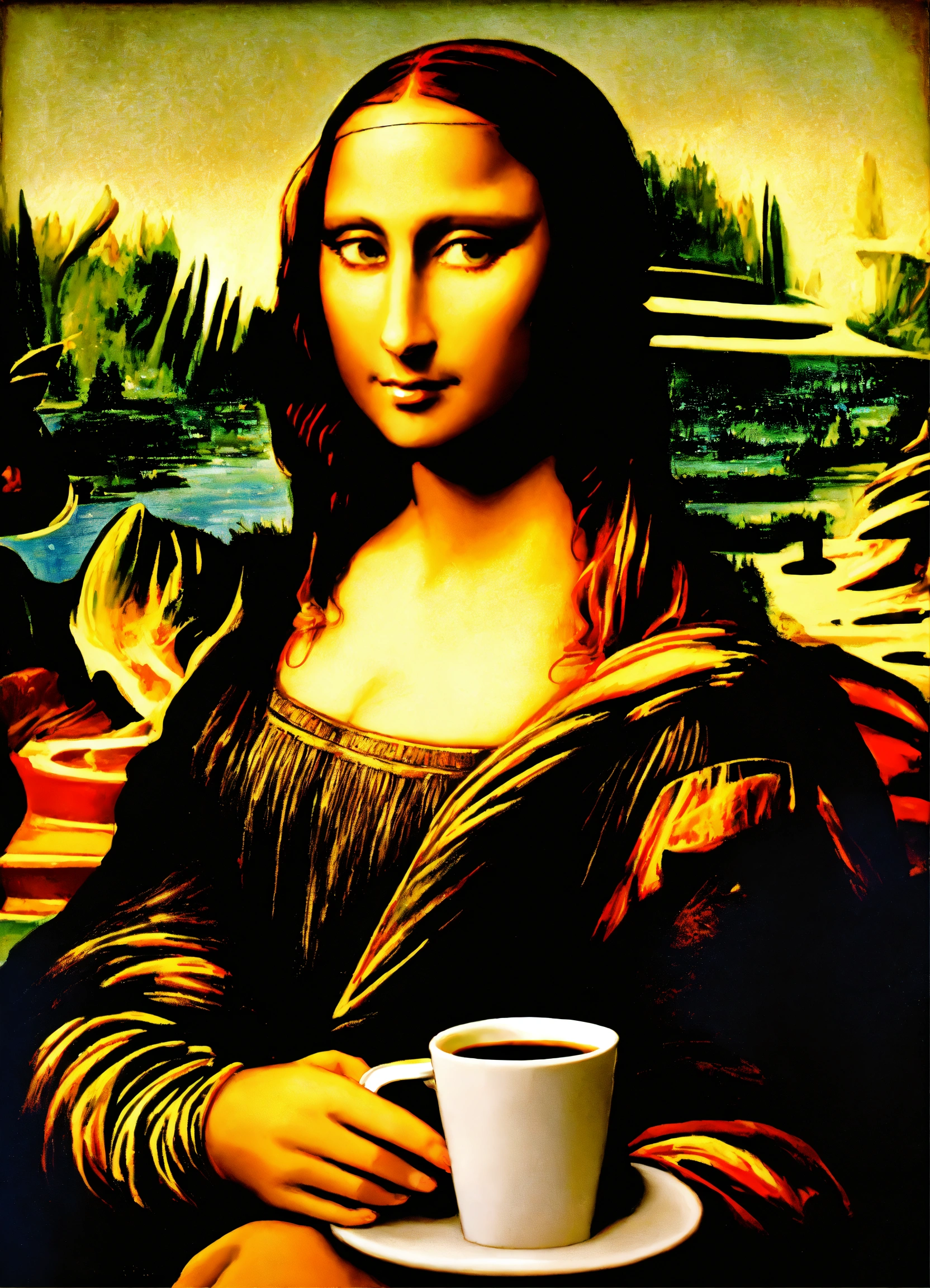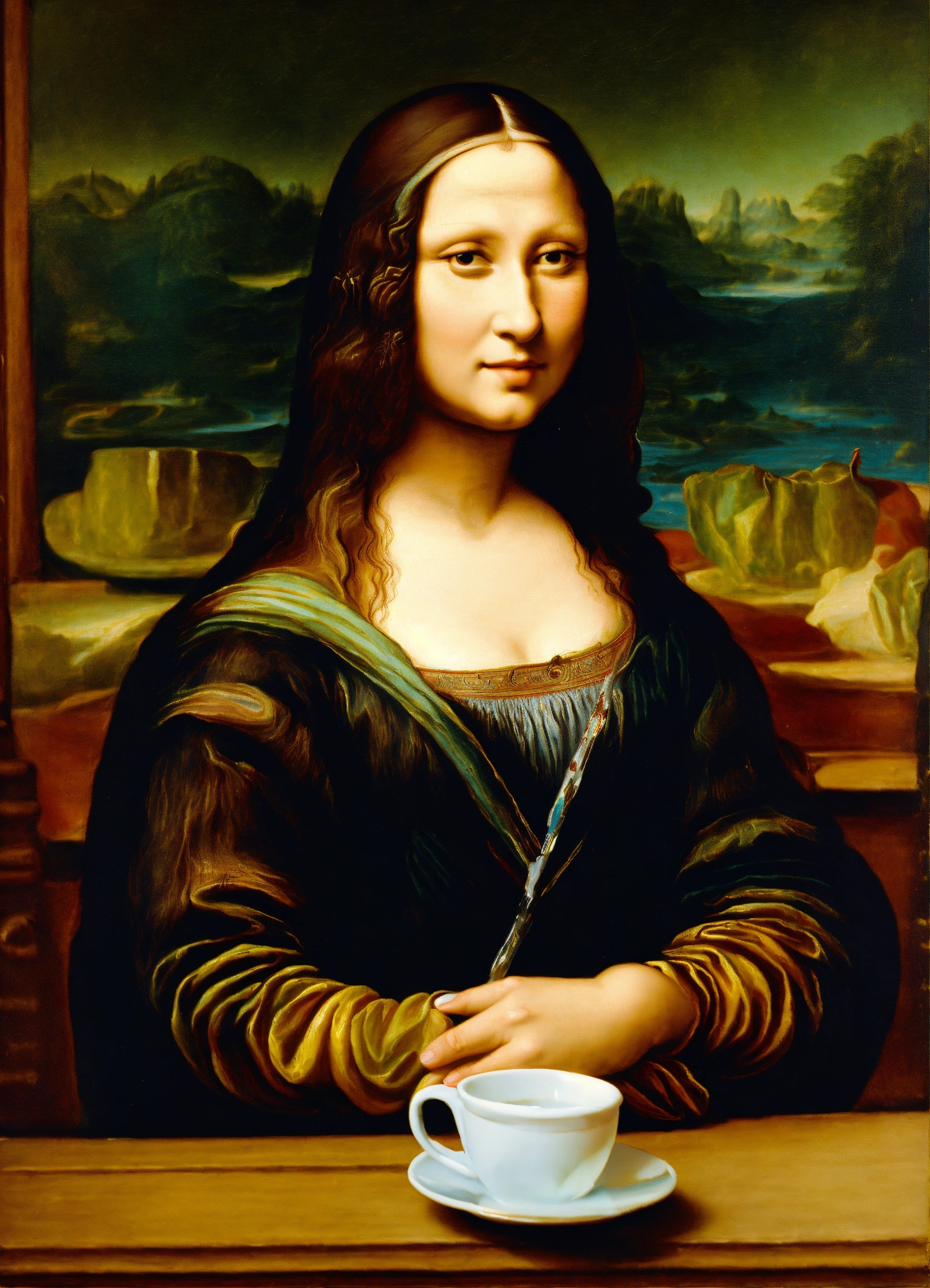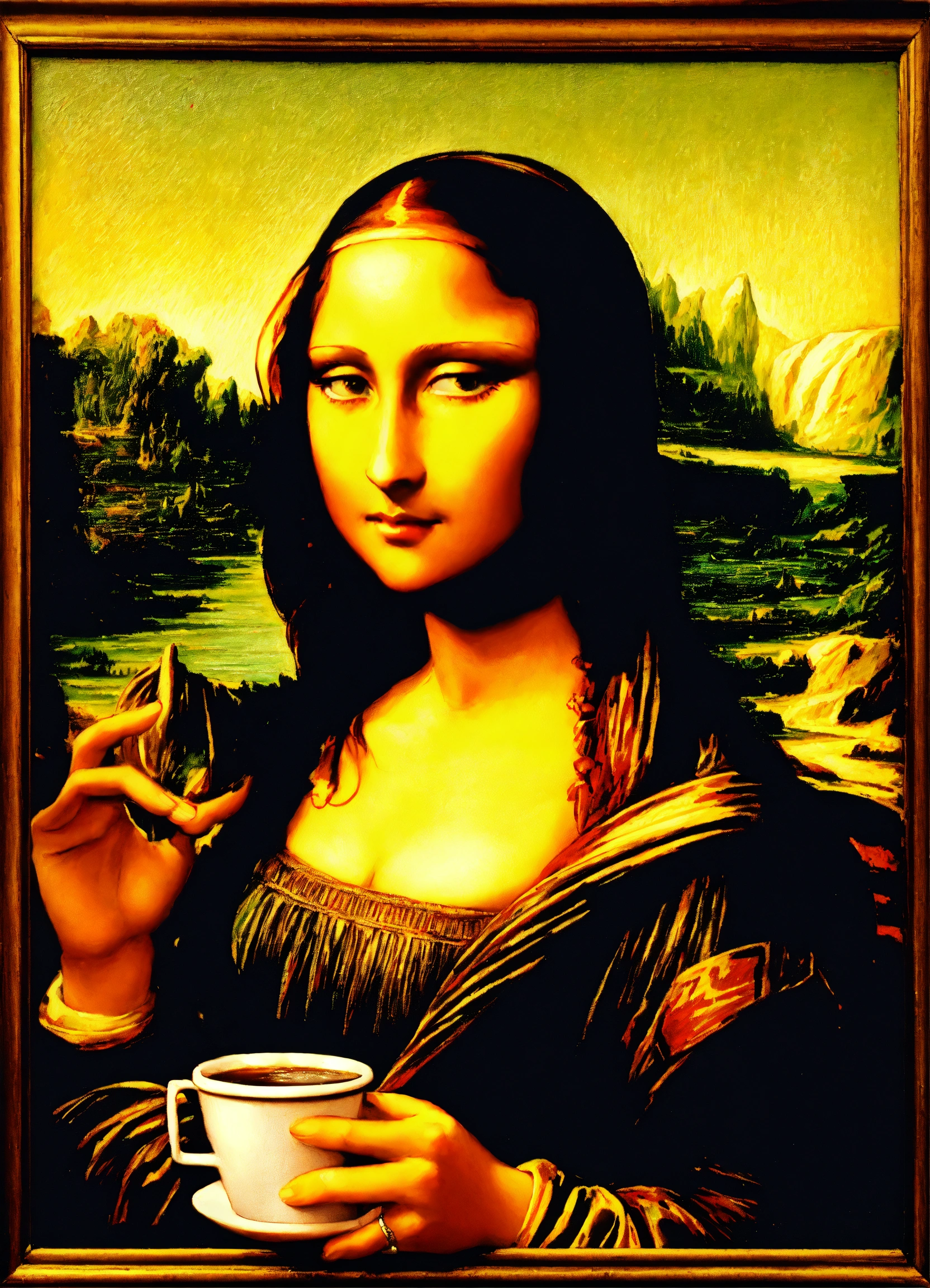 Antique painting of mona lisa drinking coffee from a paper cup