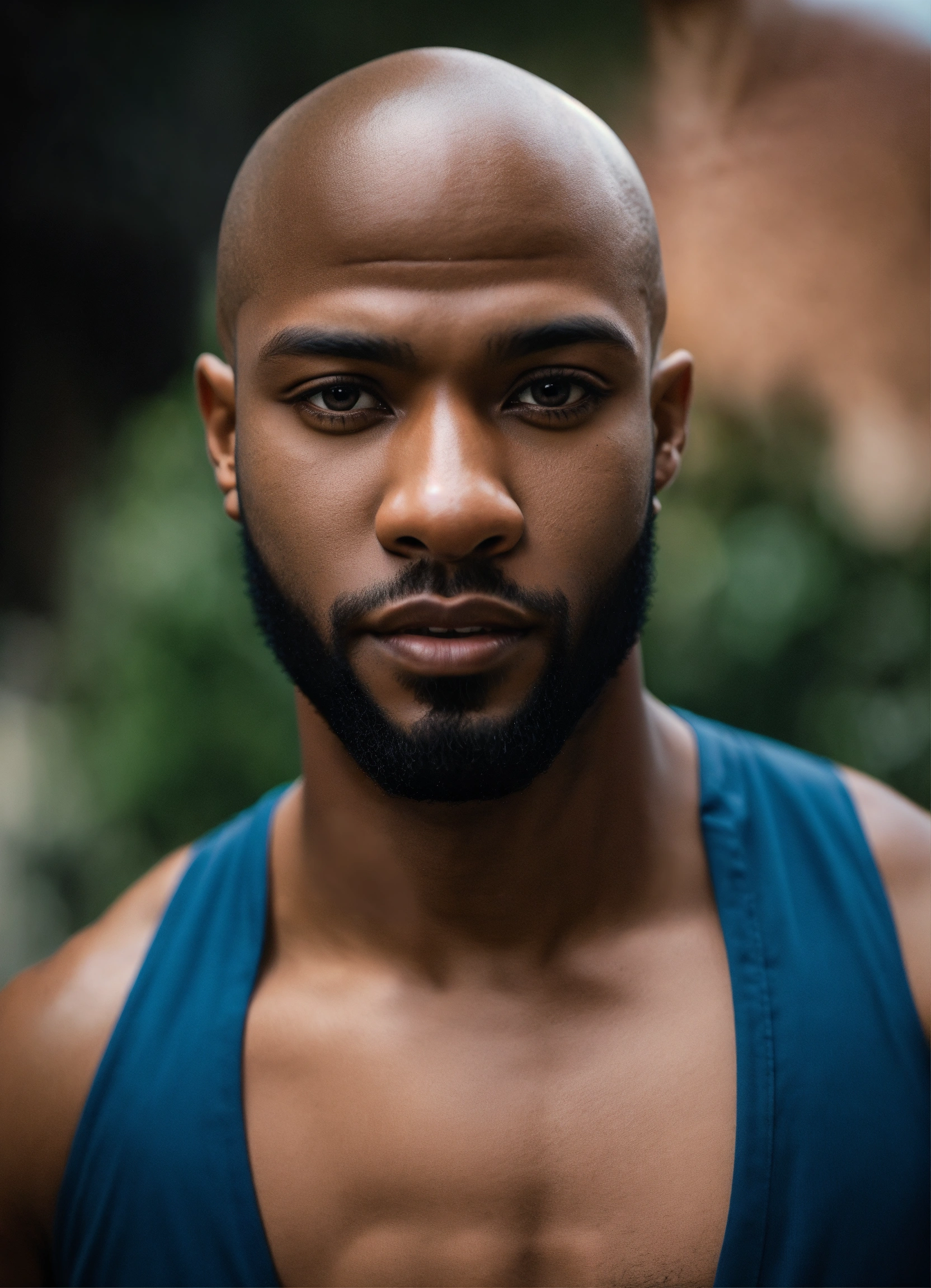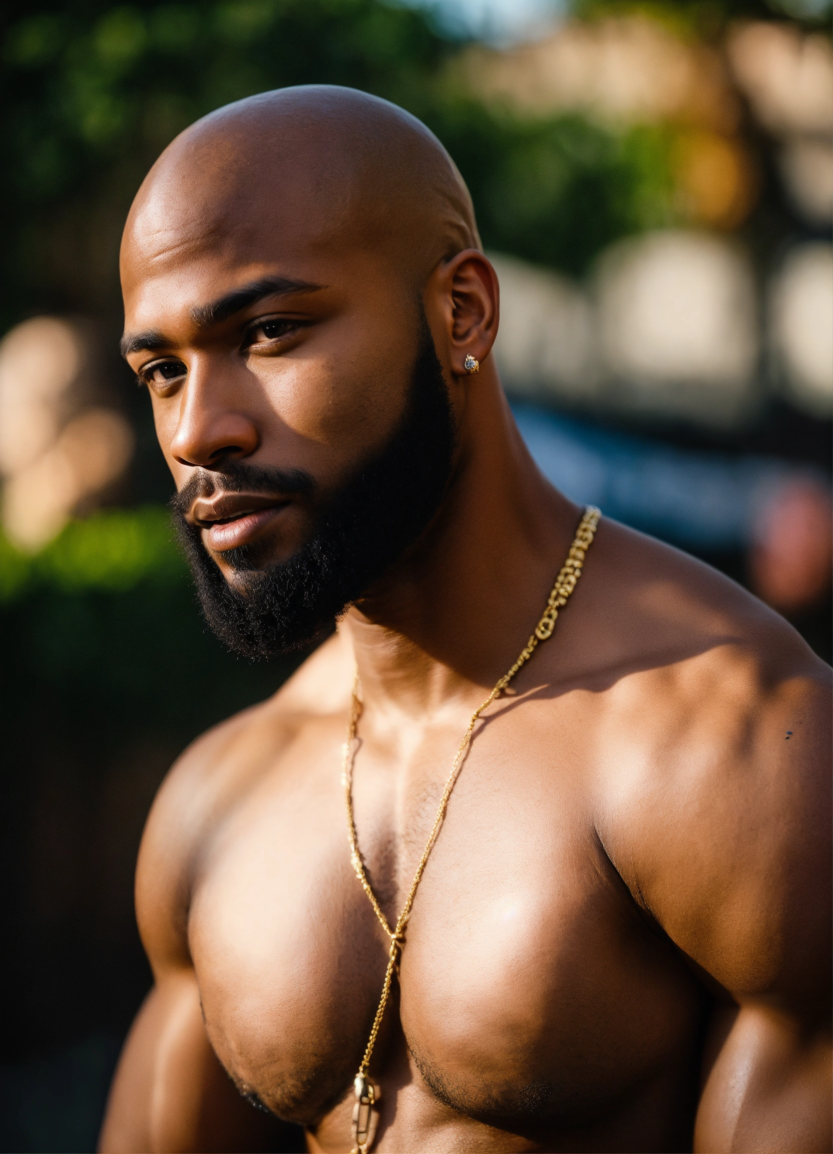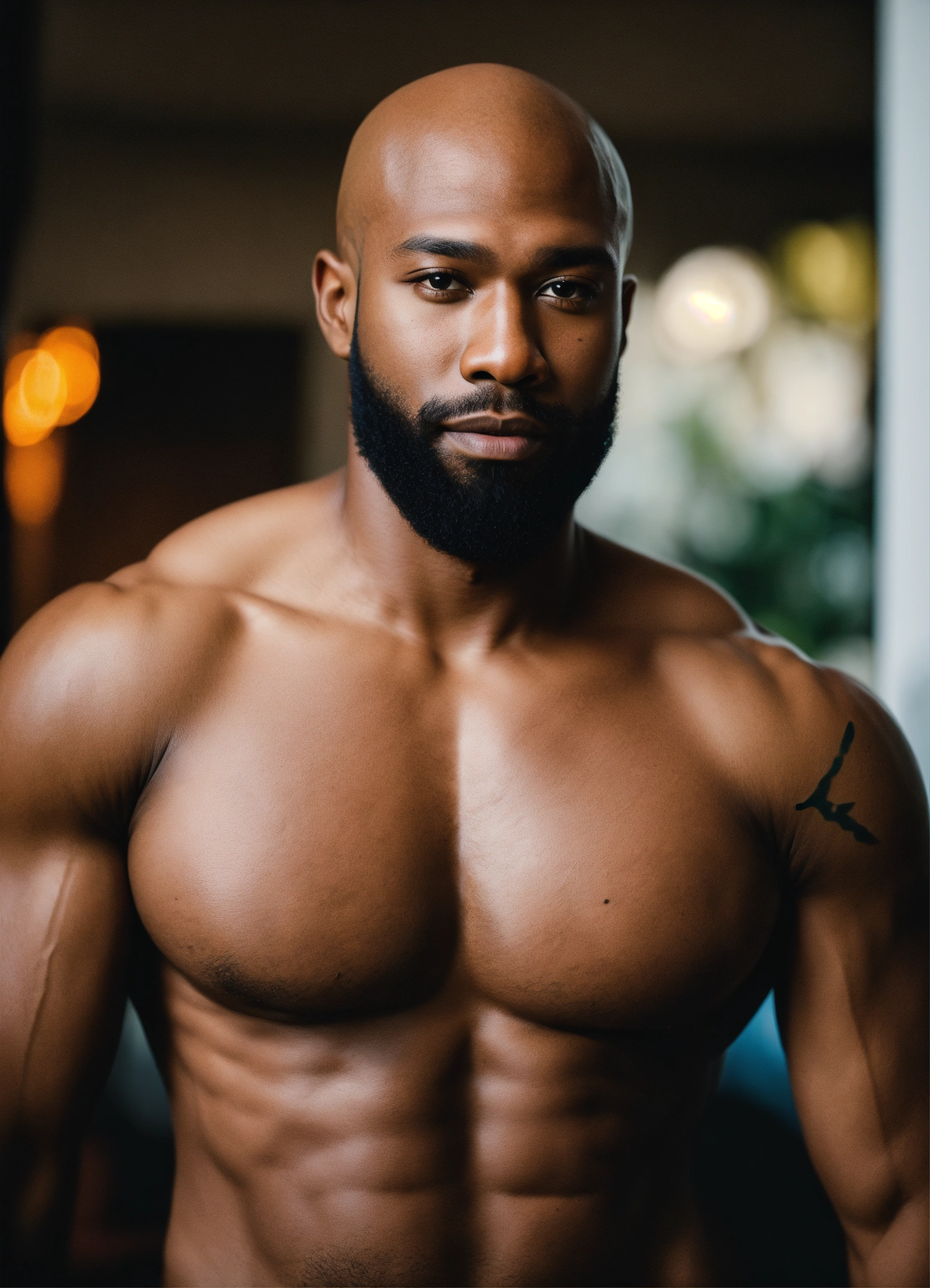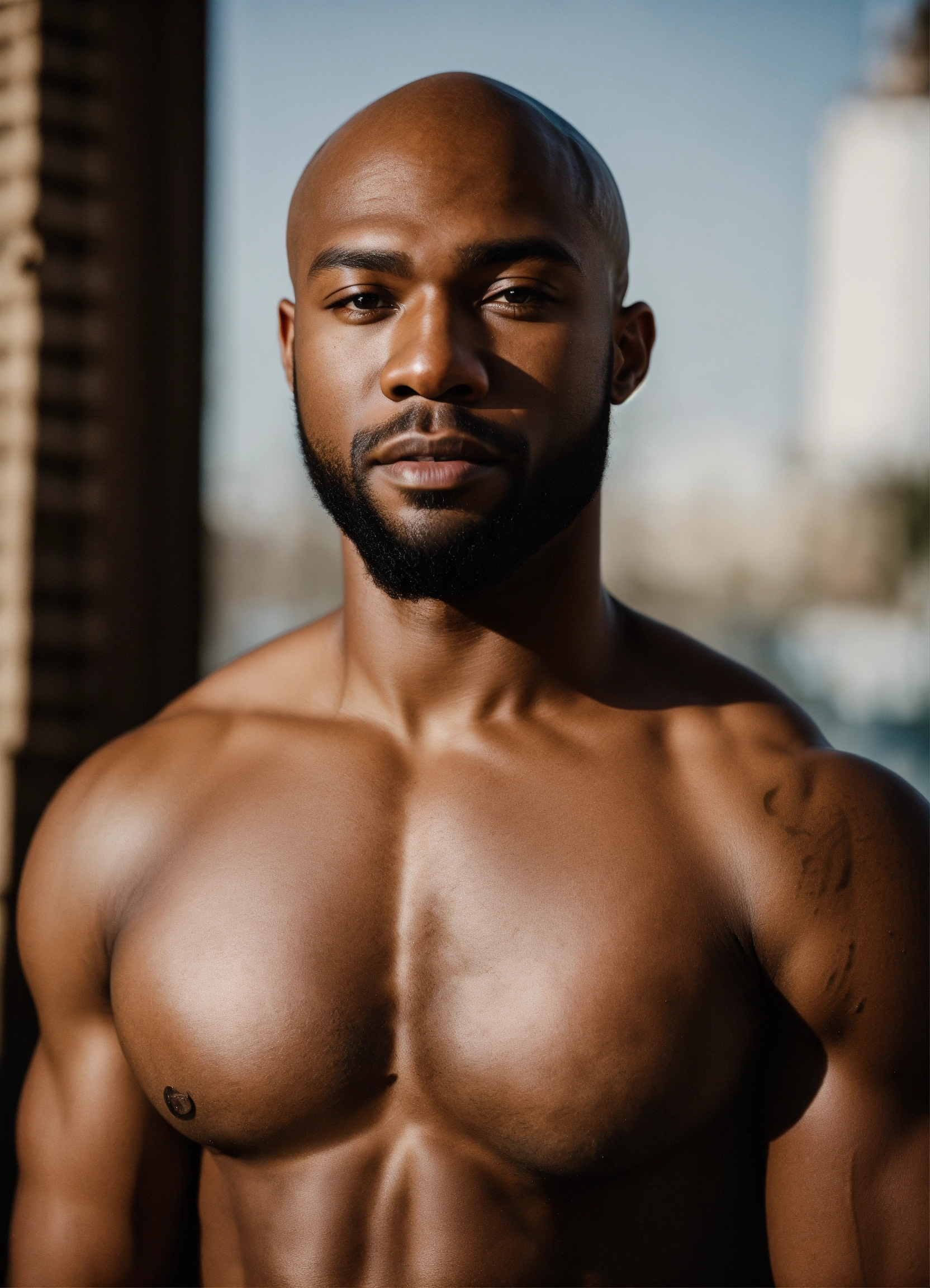Photo portrait of a gorgeous 30-year-old black man with a bald head, shirtless, light brown skin, big muscular pecs, short beard, brown eyes, hyperrealistic, fujifilm x-t3, 1/1250sec at f/2.8, iso 160, 84mm
