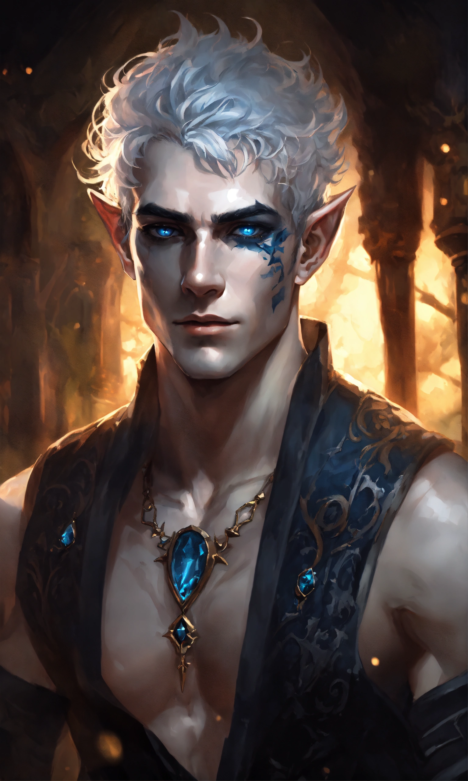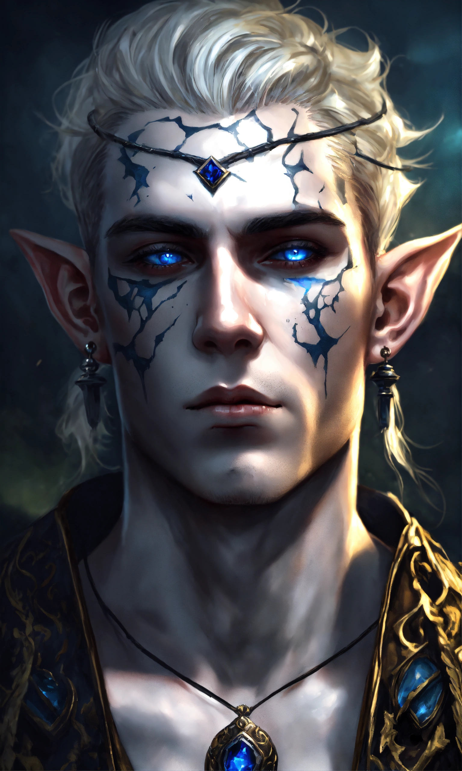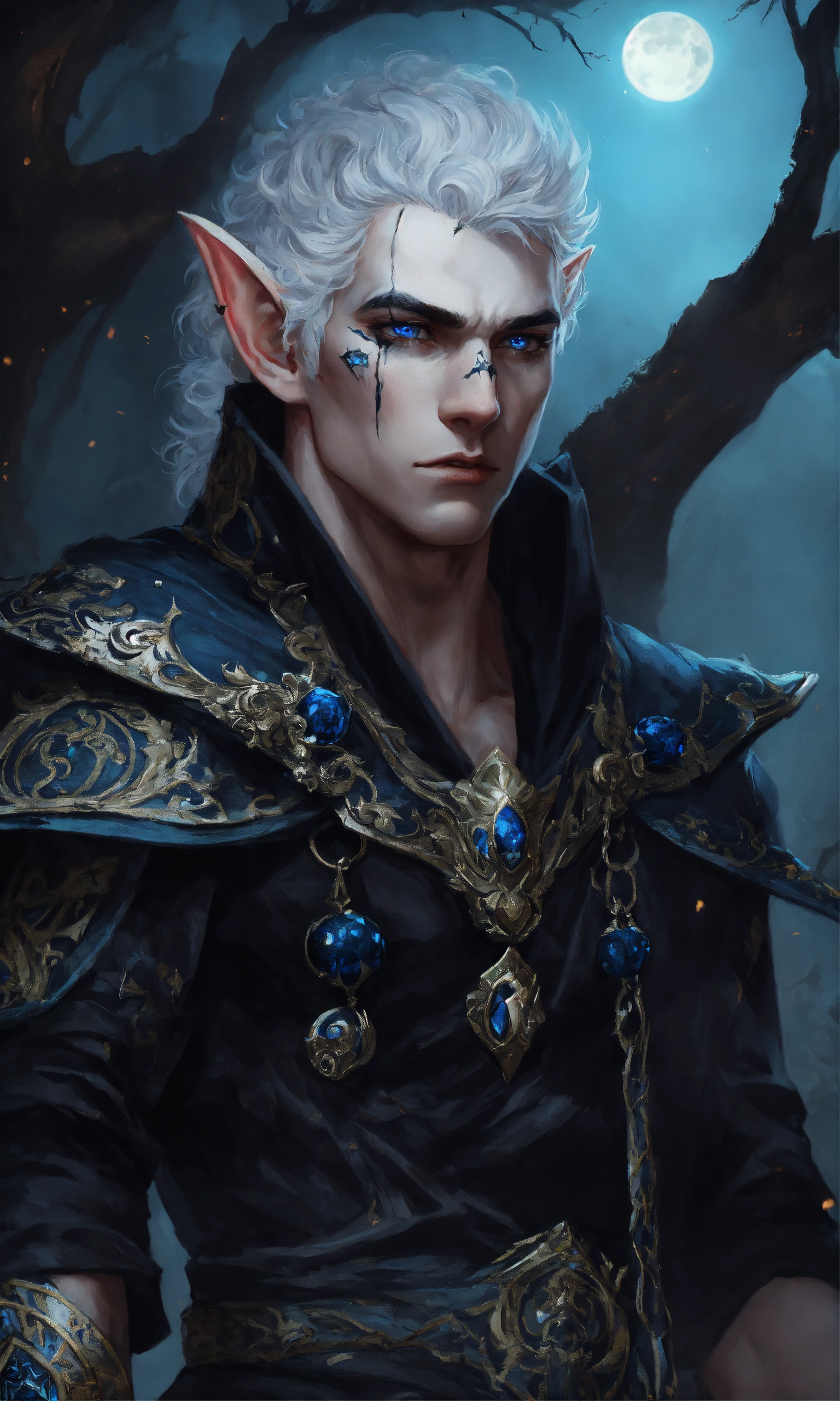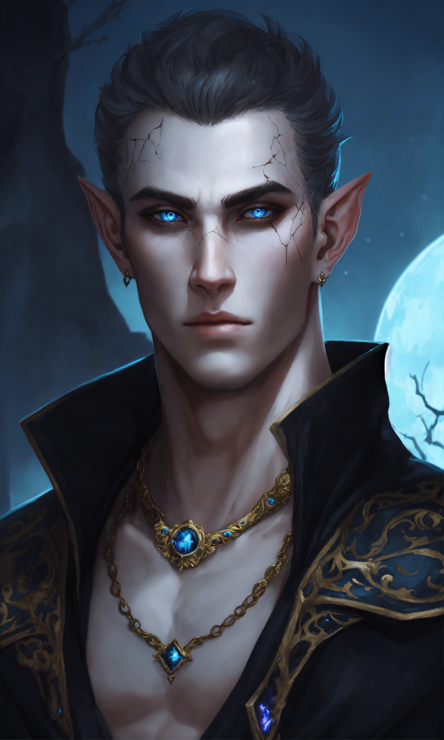 Fantasy portrait of a gaunt male elf, sickly thin, gaunt body type, shirtless monk, pale skin, black shattered skin, black cracked face, broken skin, inocent expression, chin up, lifted brow, pointy chin, glowing curly white hair, big blue eyes, lost expression, black shadow magic, ultra detailed, piercings, moonlight graveyard background