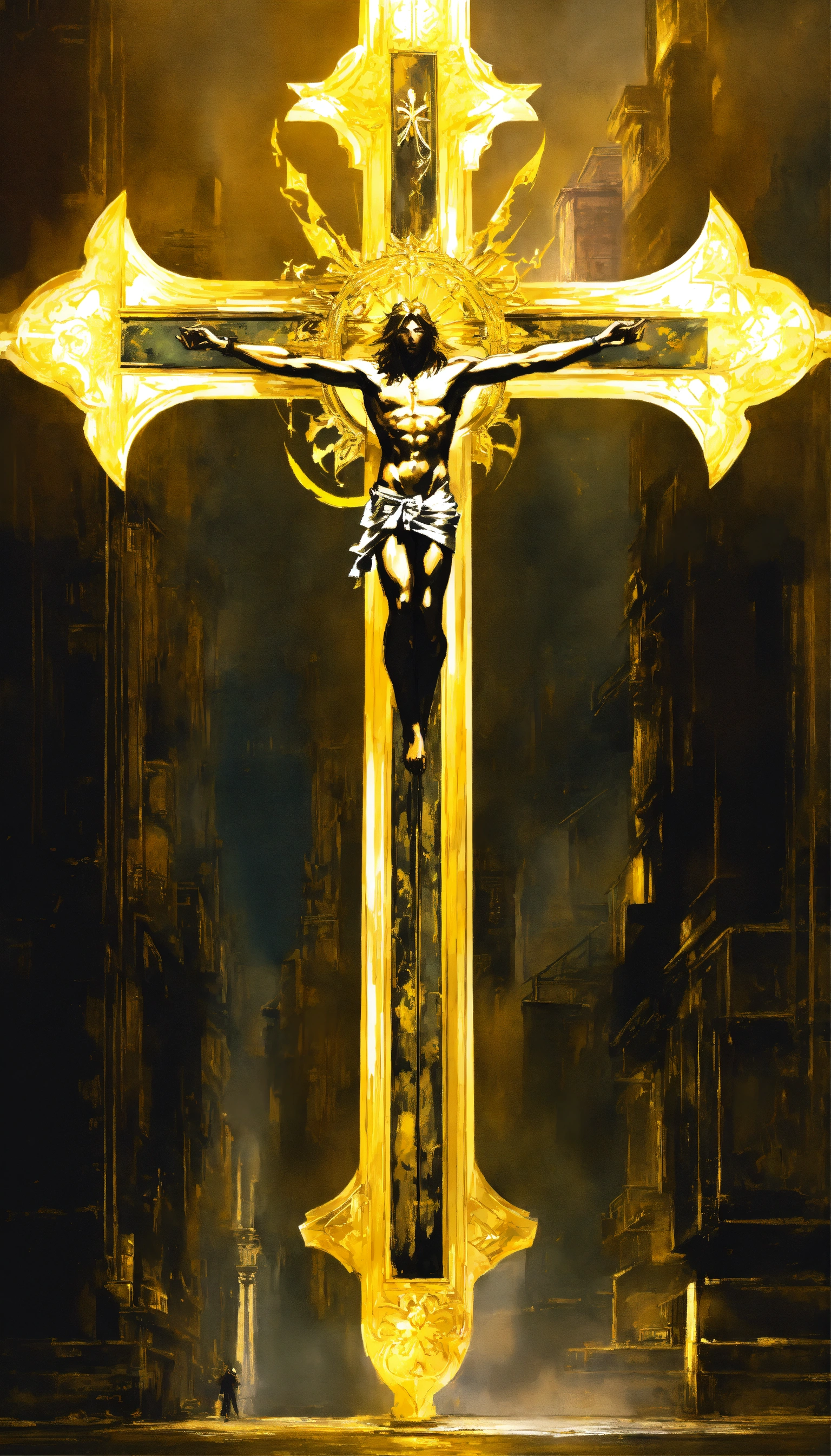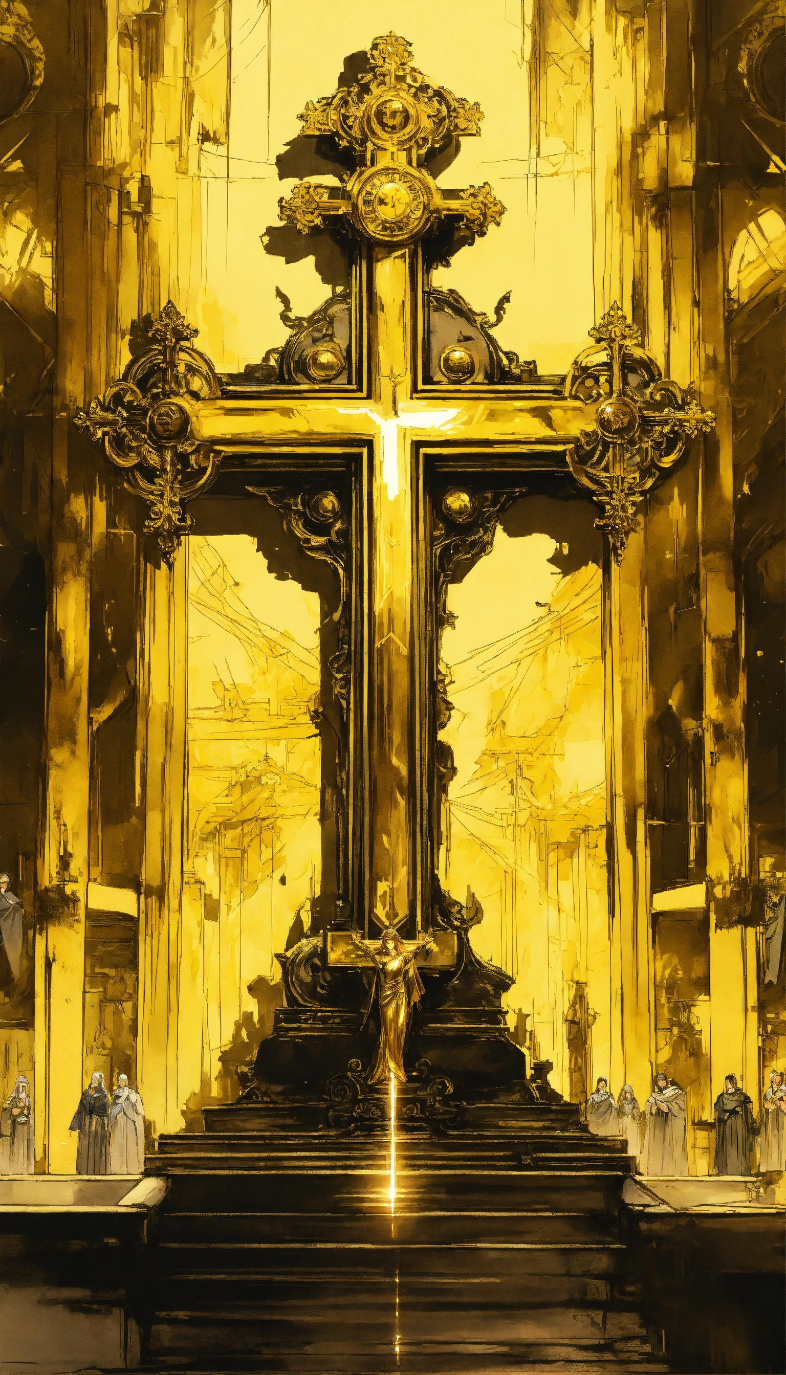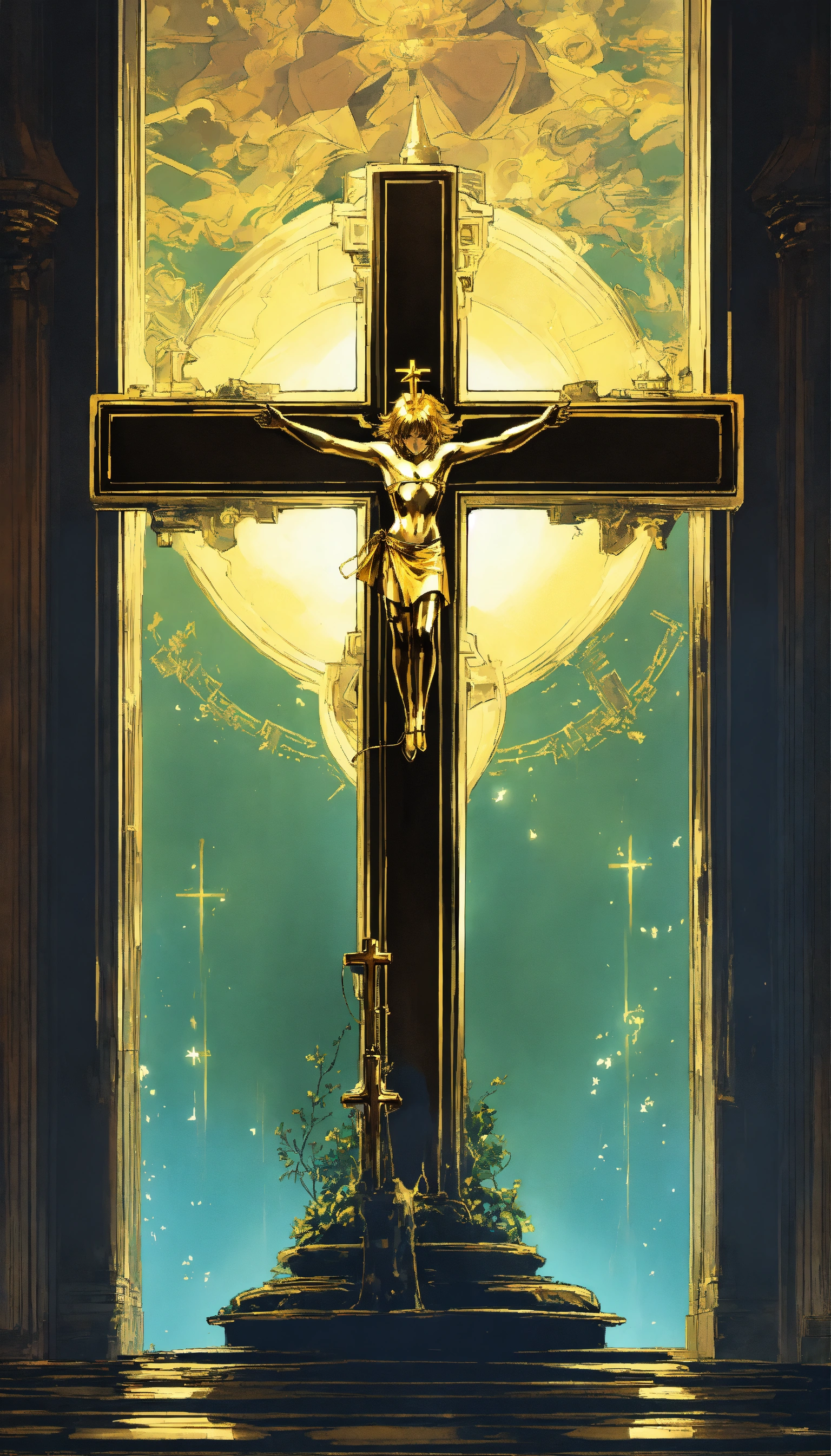 Holy glorious shiny golden cross. in dark fantasy 80s anime style