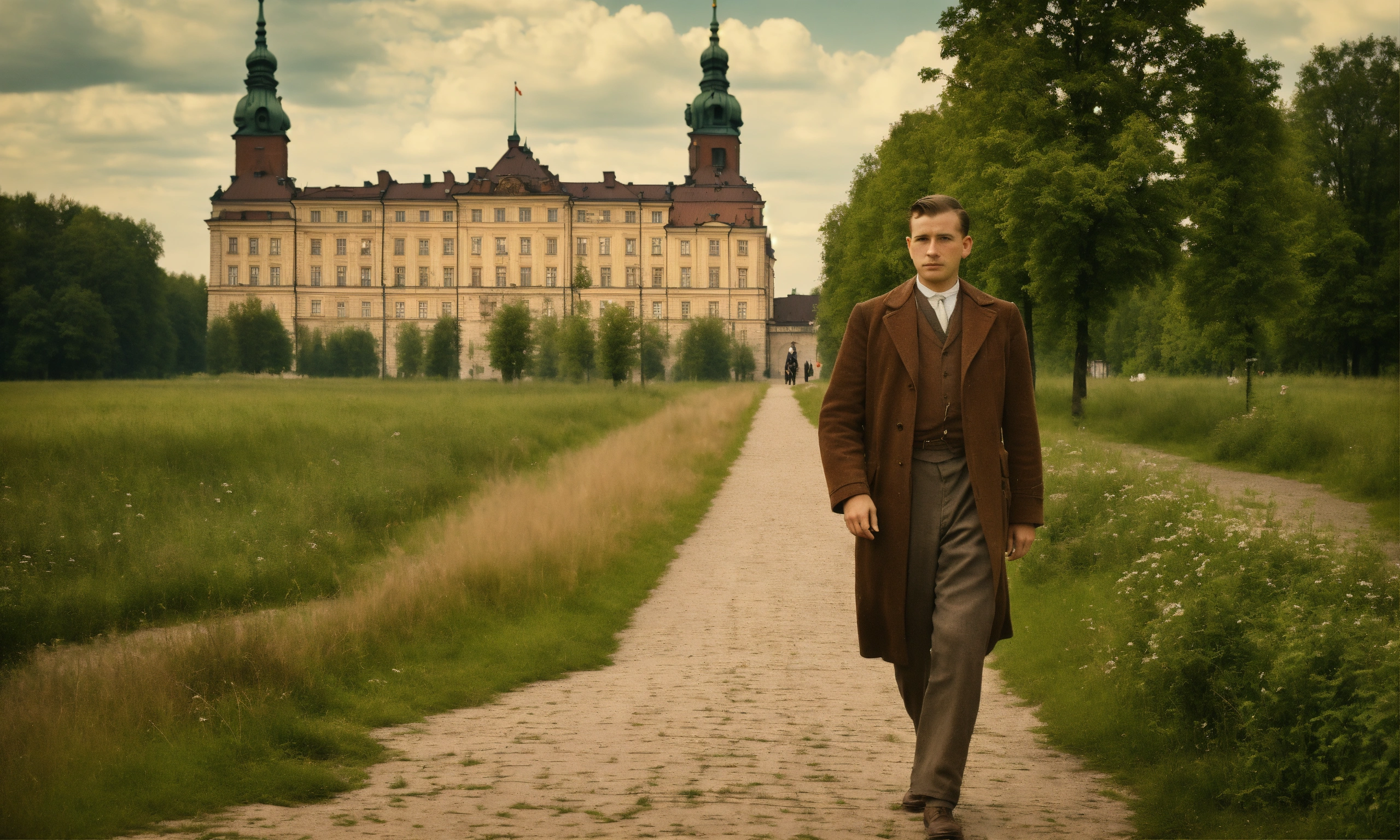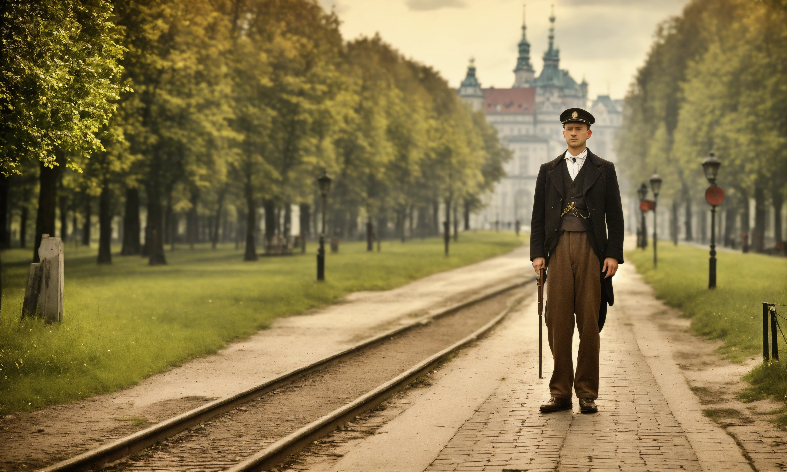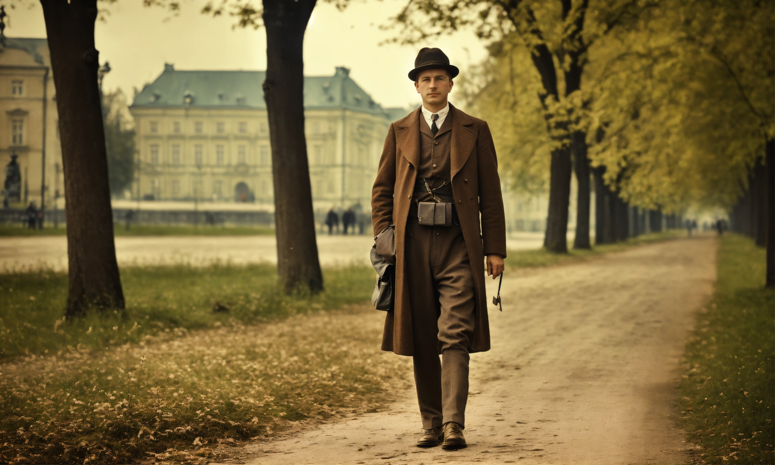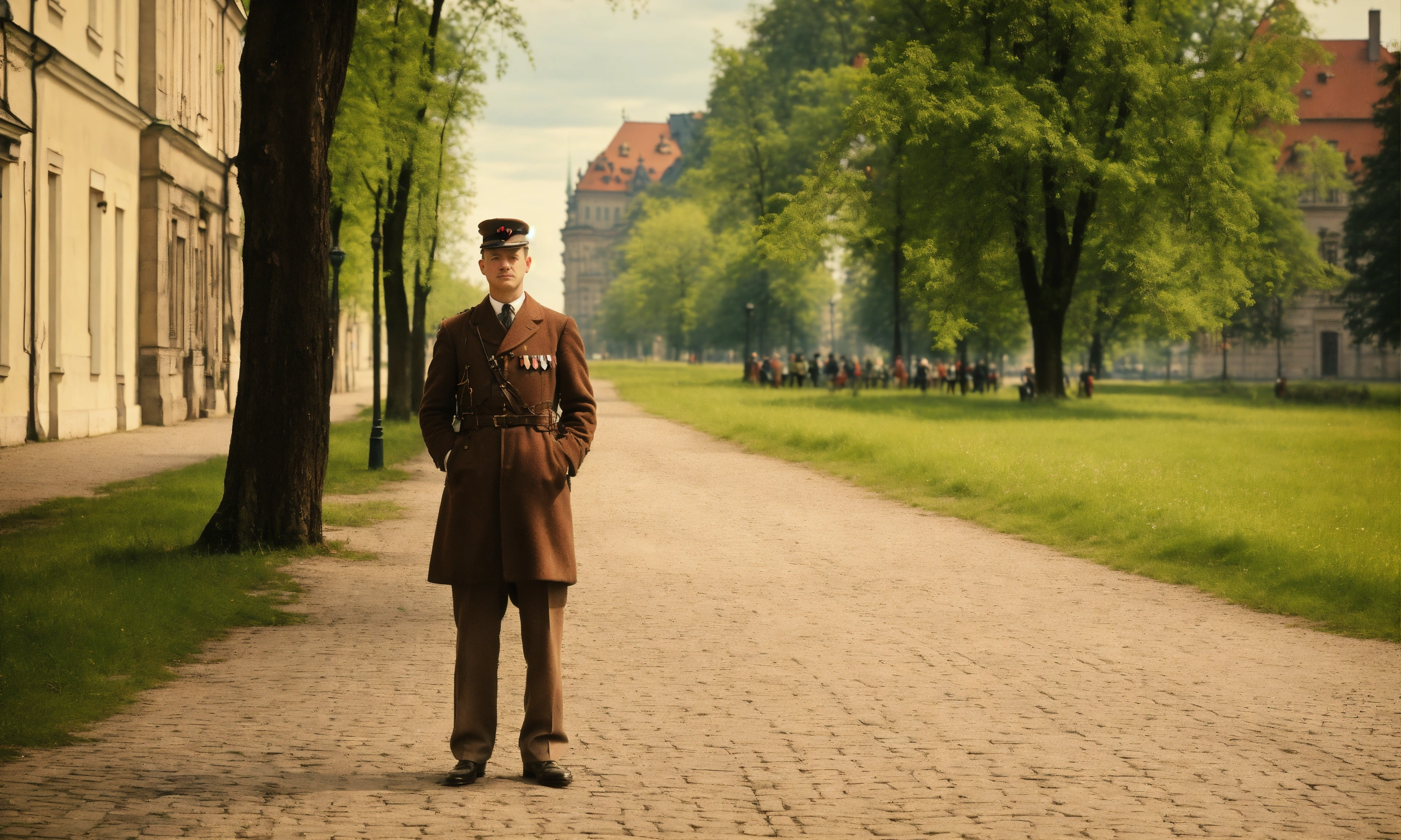 Poland poor man age 30, 1920-1930 on streen in warshaw. retro style photo full height. without people. focus camera on face man. season summer, keep in mind that the must be without people, retro style photo. warshaw without people, warshaw the royal castle