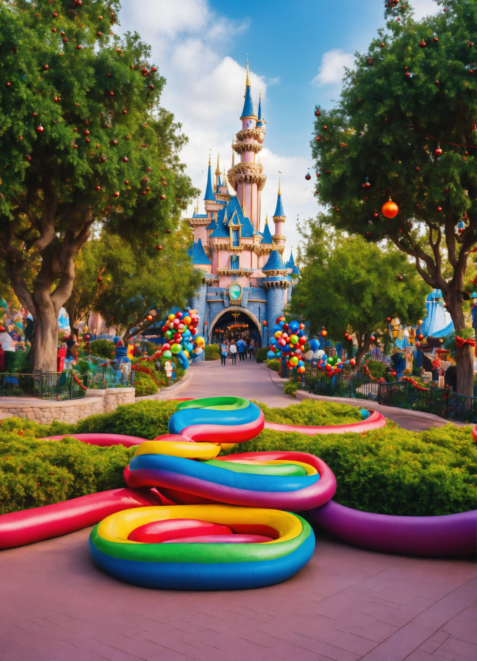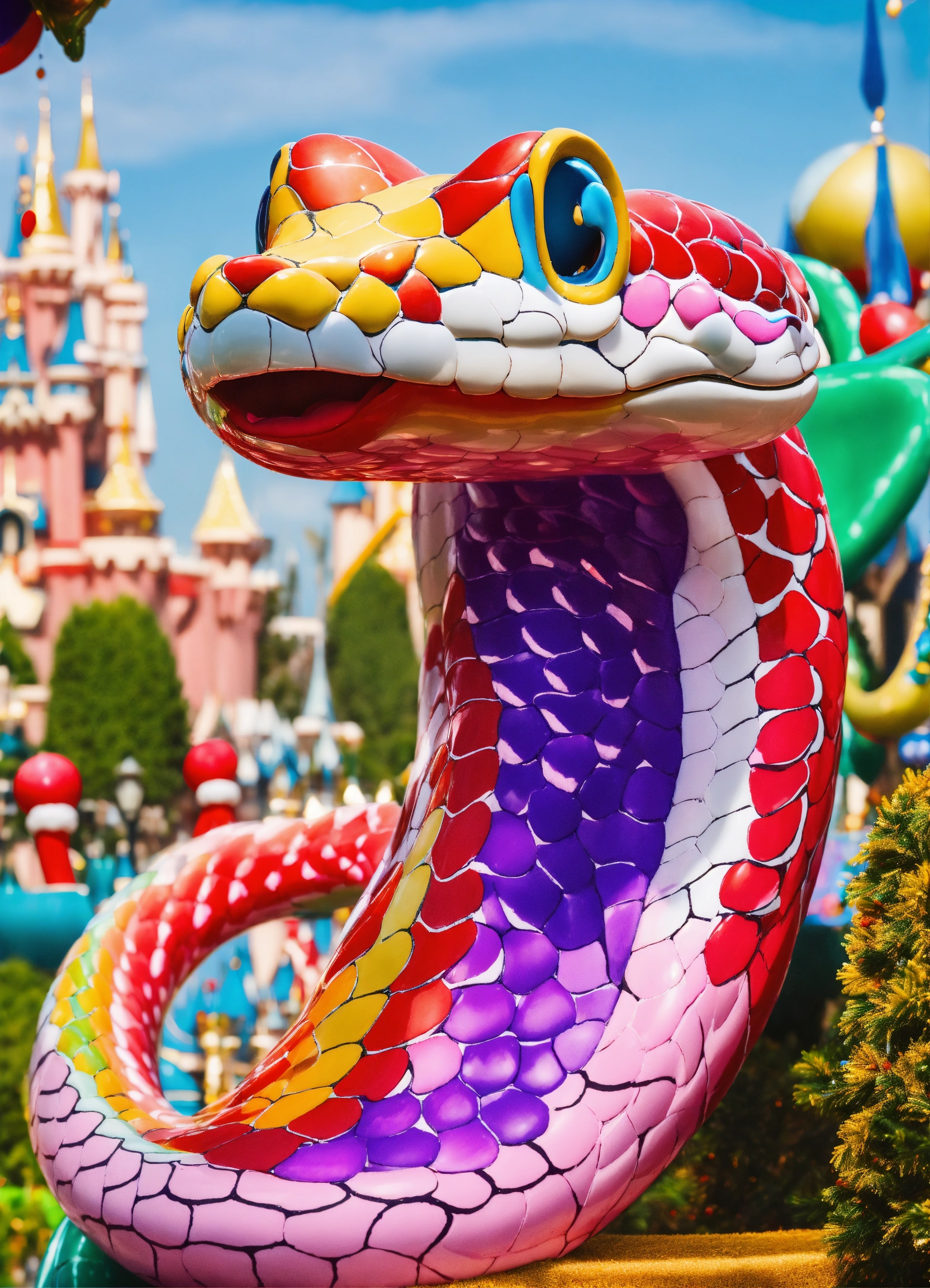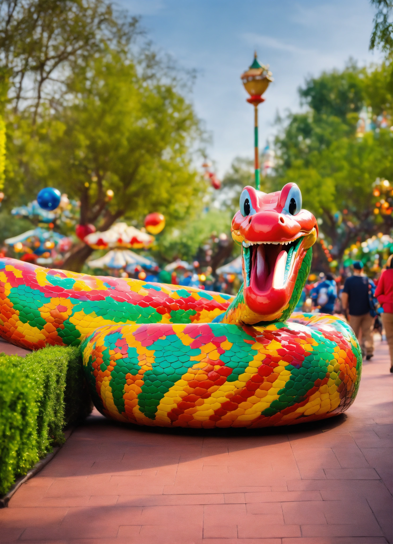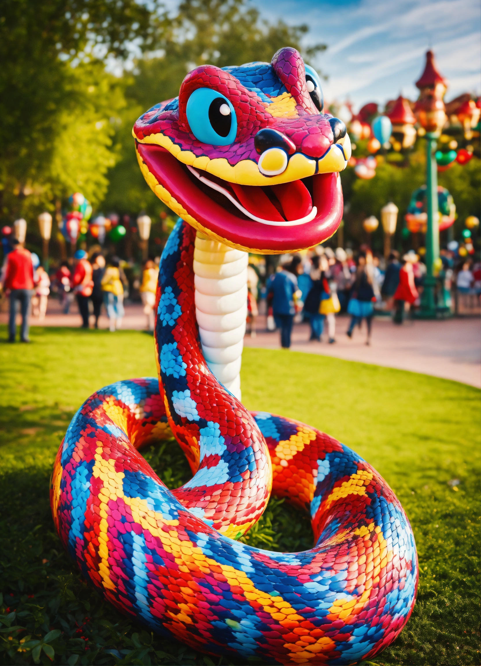 Disneyland type colorful snake character thin lips in a happy festive park like environment photo real