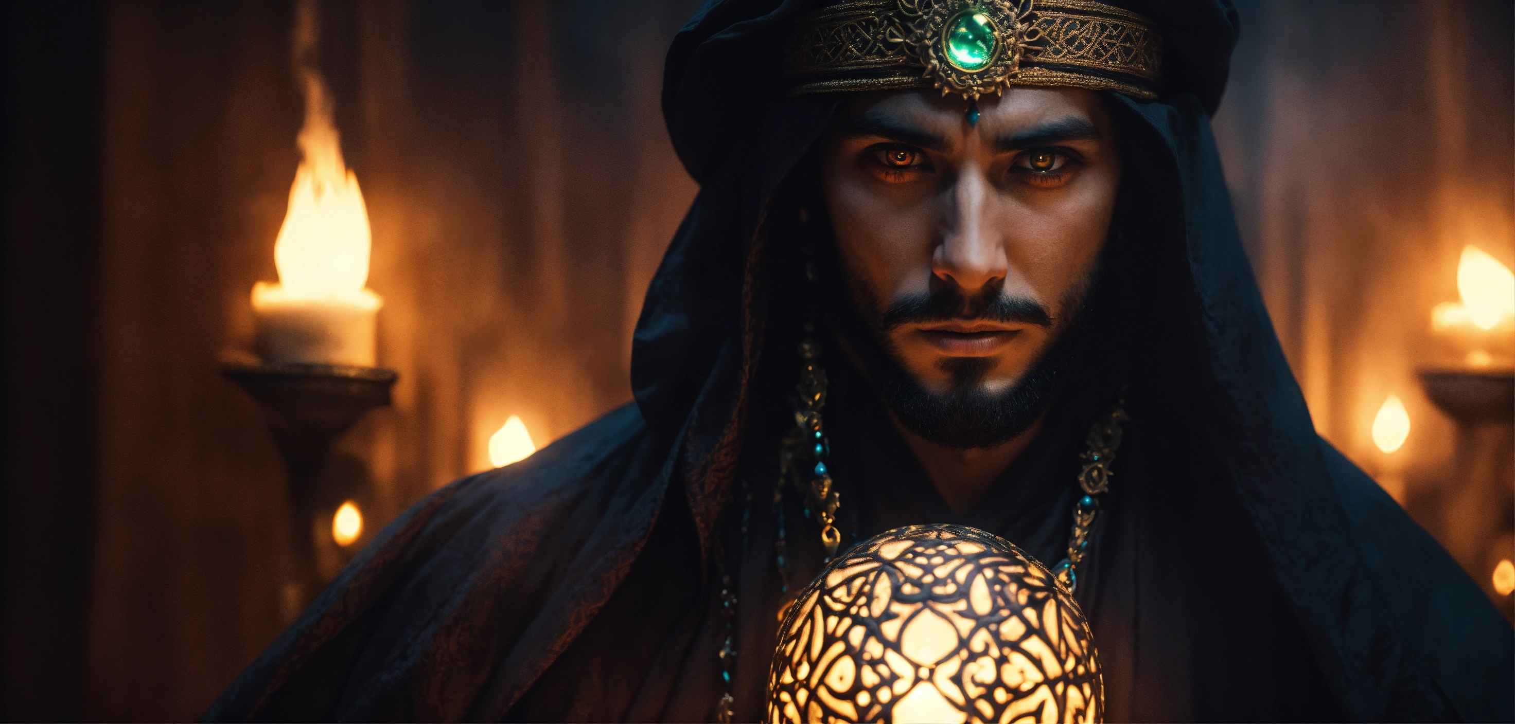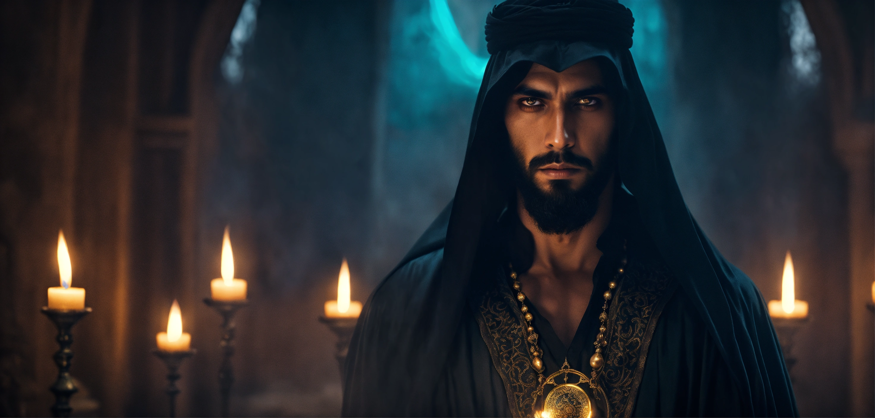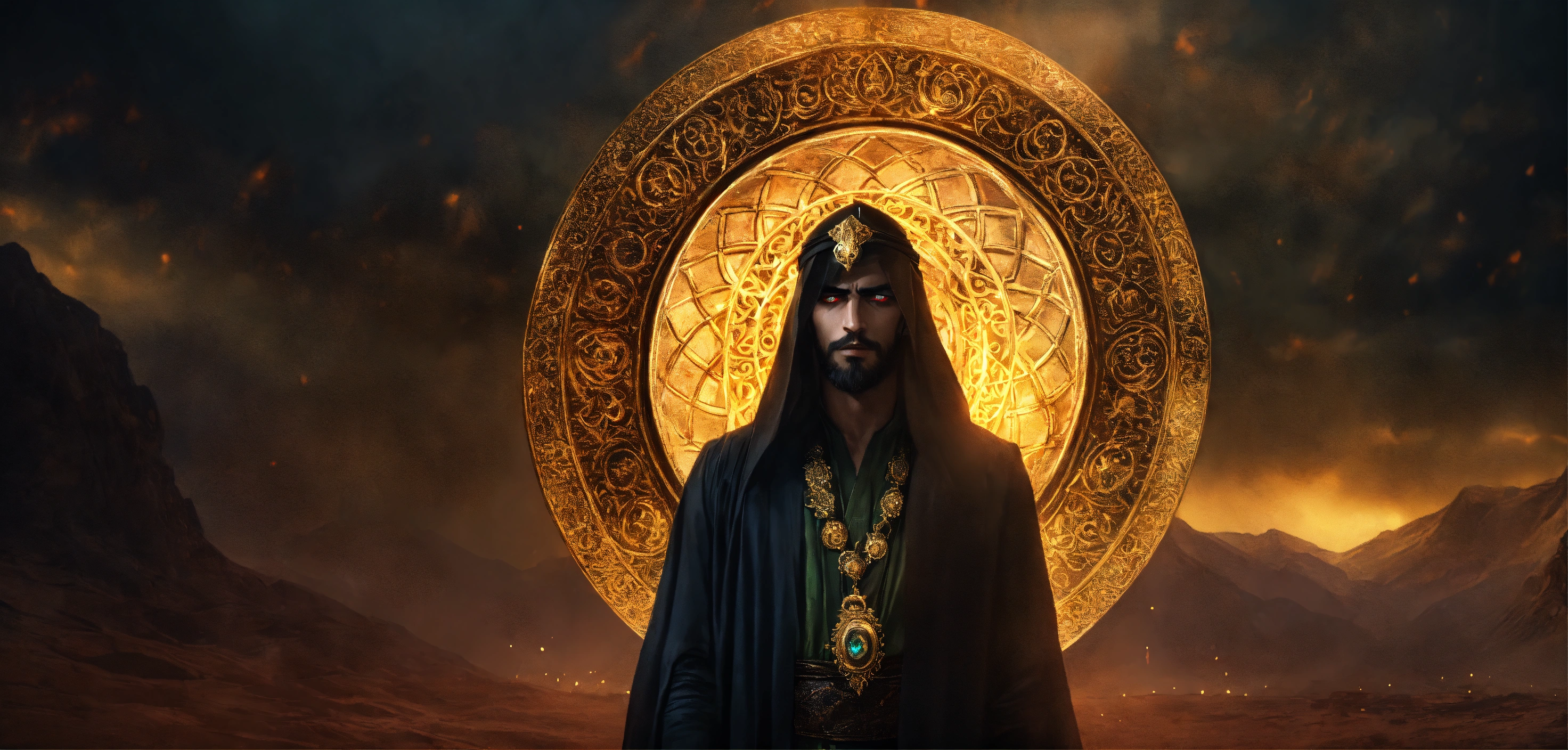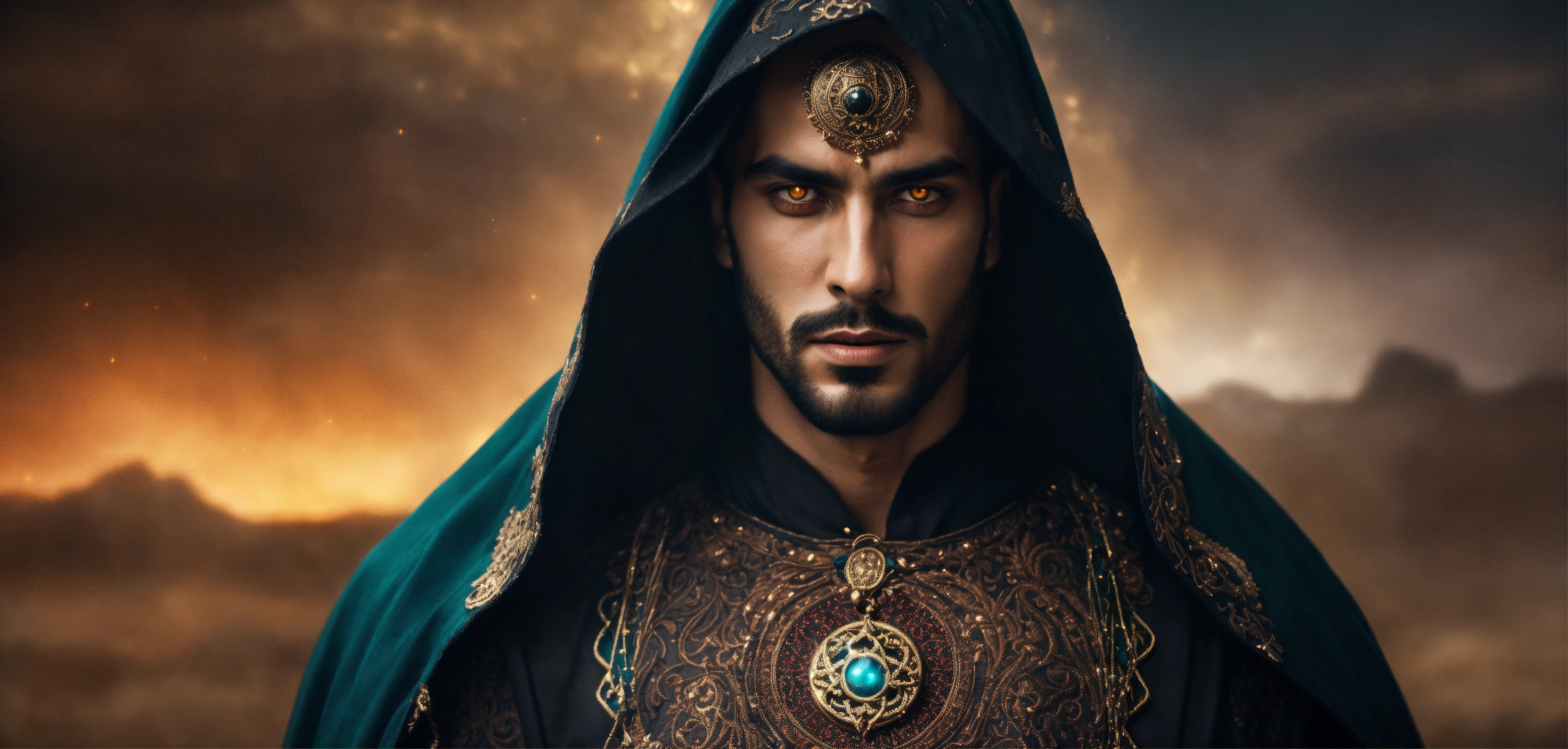Dark, mysterious and dramatic fantasy portrait of a handsome arabic wicked sorcerer with glowing hypnotic eyes in eerie ceremonial garb.