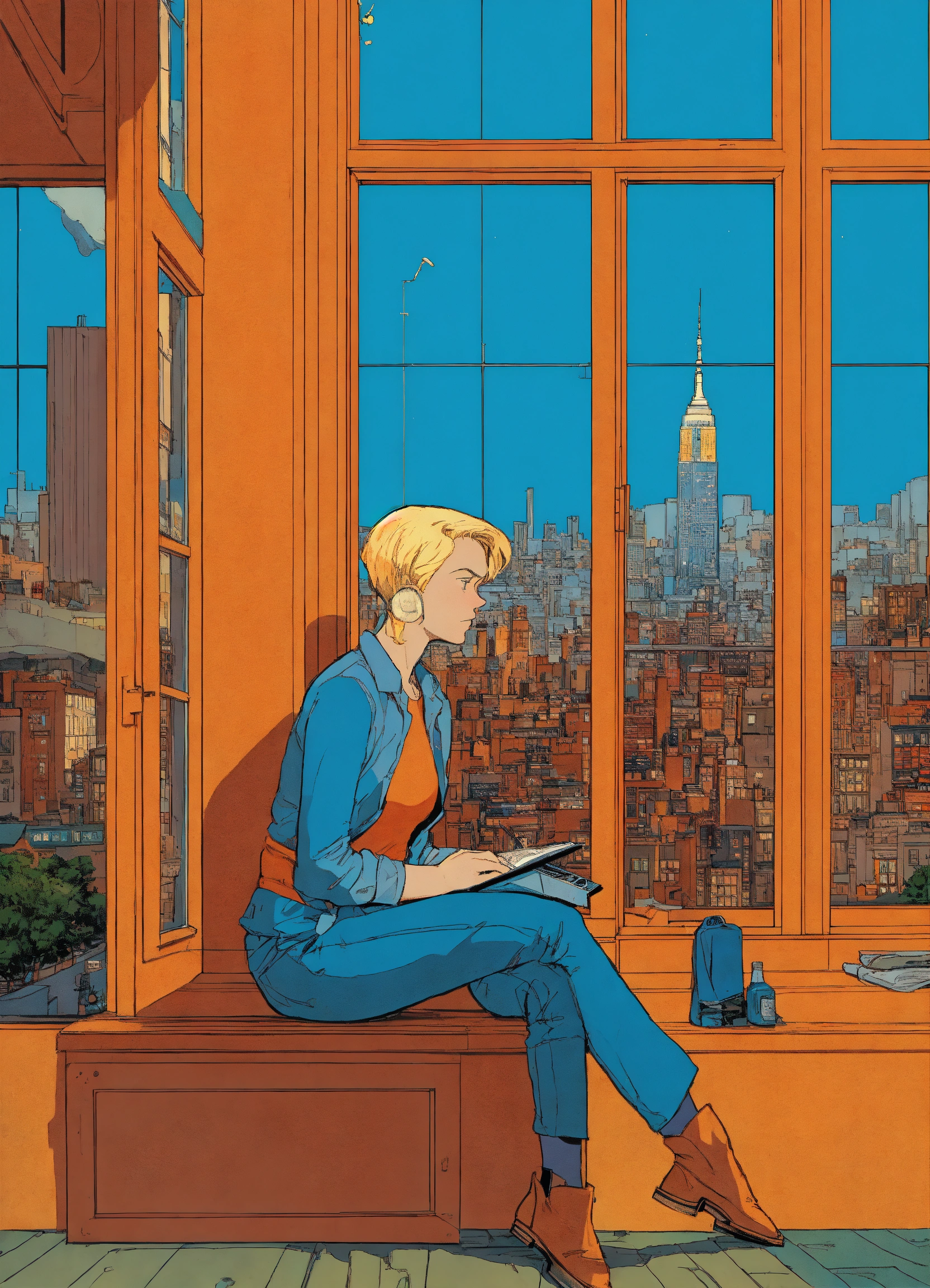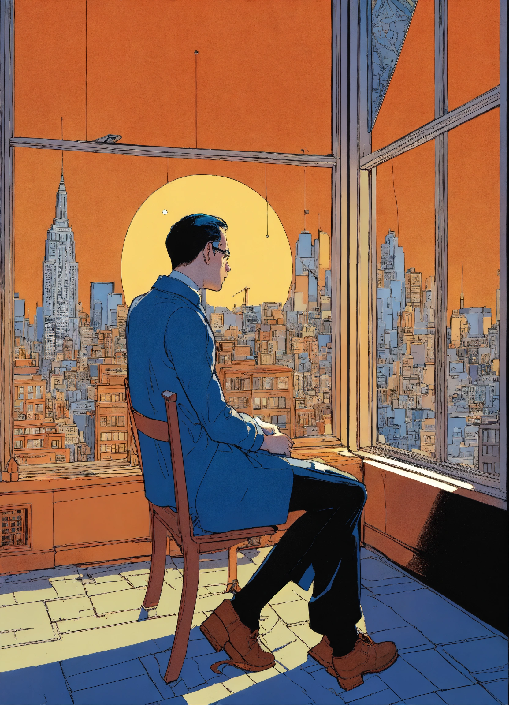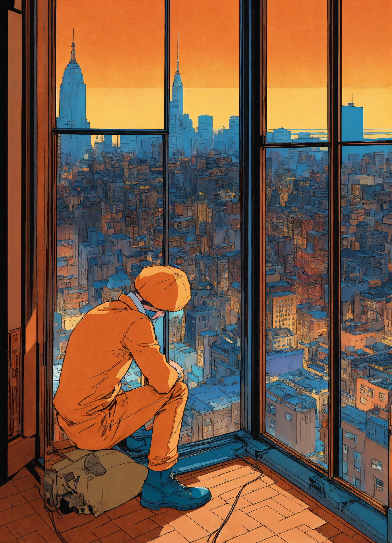 The original cover for the american comic book artist, charles mcmurdo, in the style of contemplative atmosphere, asaf hanuka, winsor mccay, new york cityscape, windows vista, blue and orange, lee miller