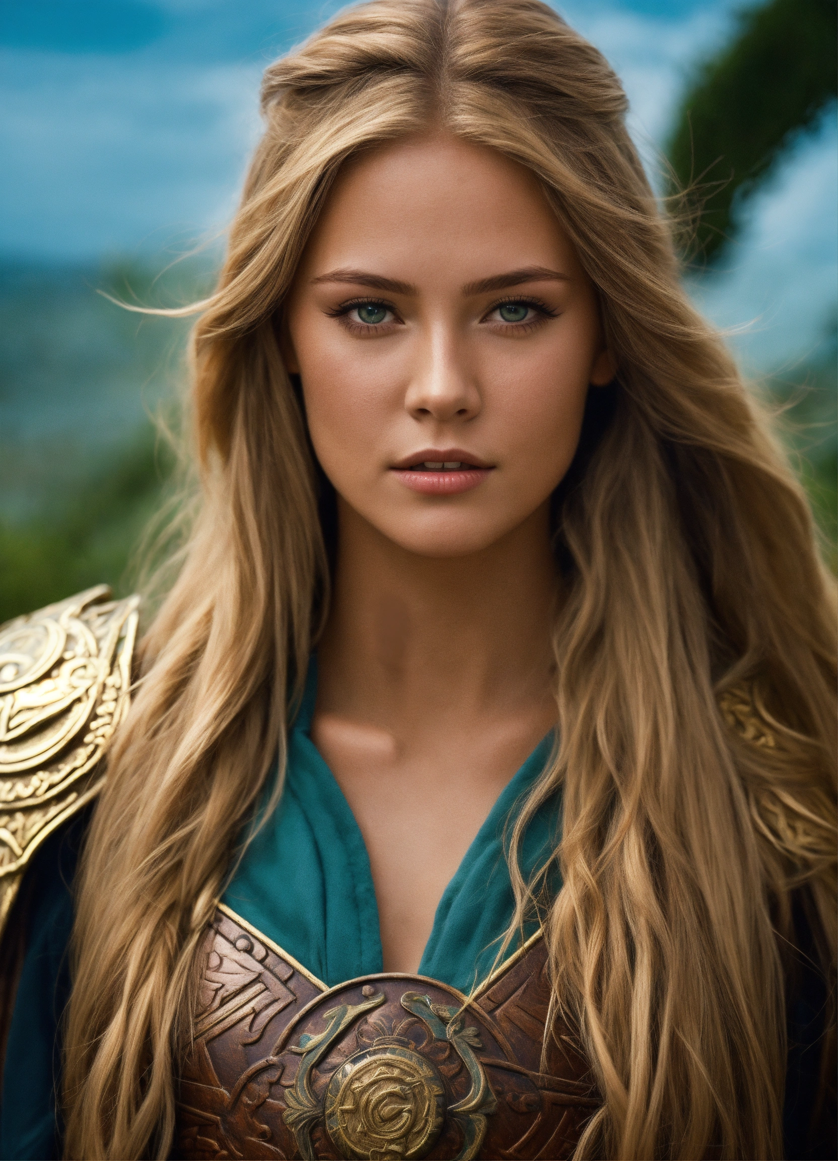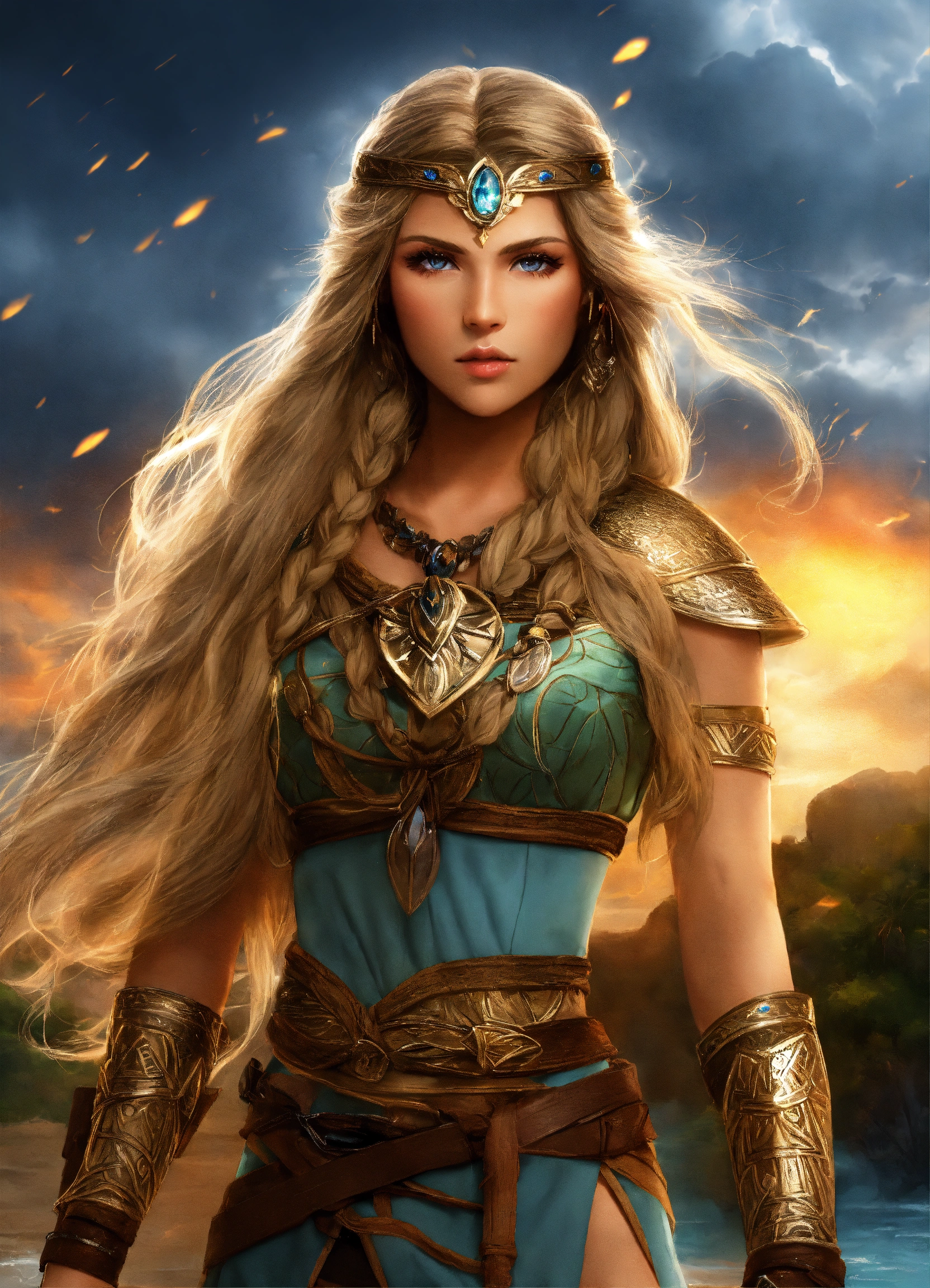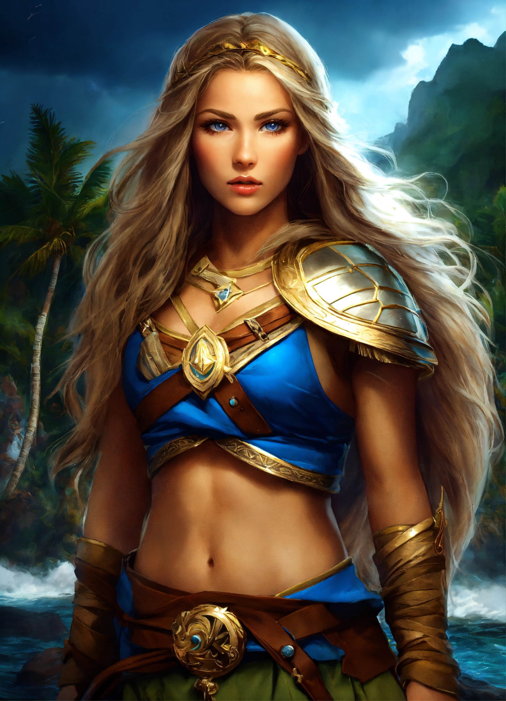 Beautiful, female, island warrior princess, long dark blonde hair, bright eyes, round face, storm powers