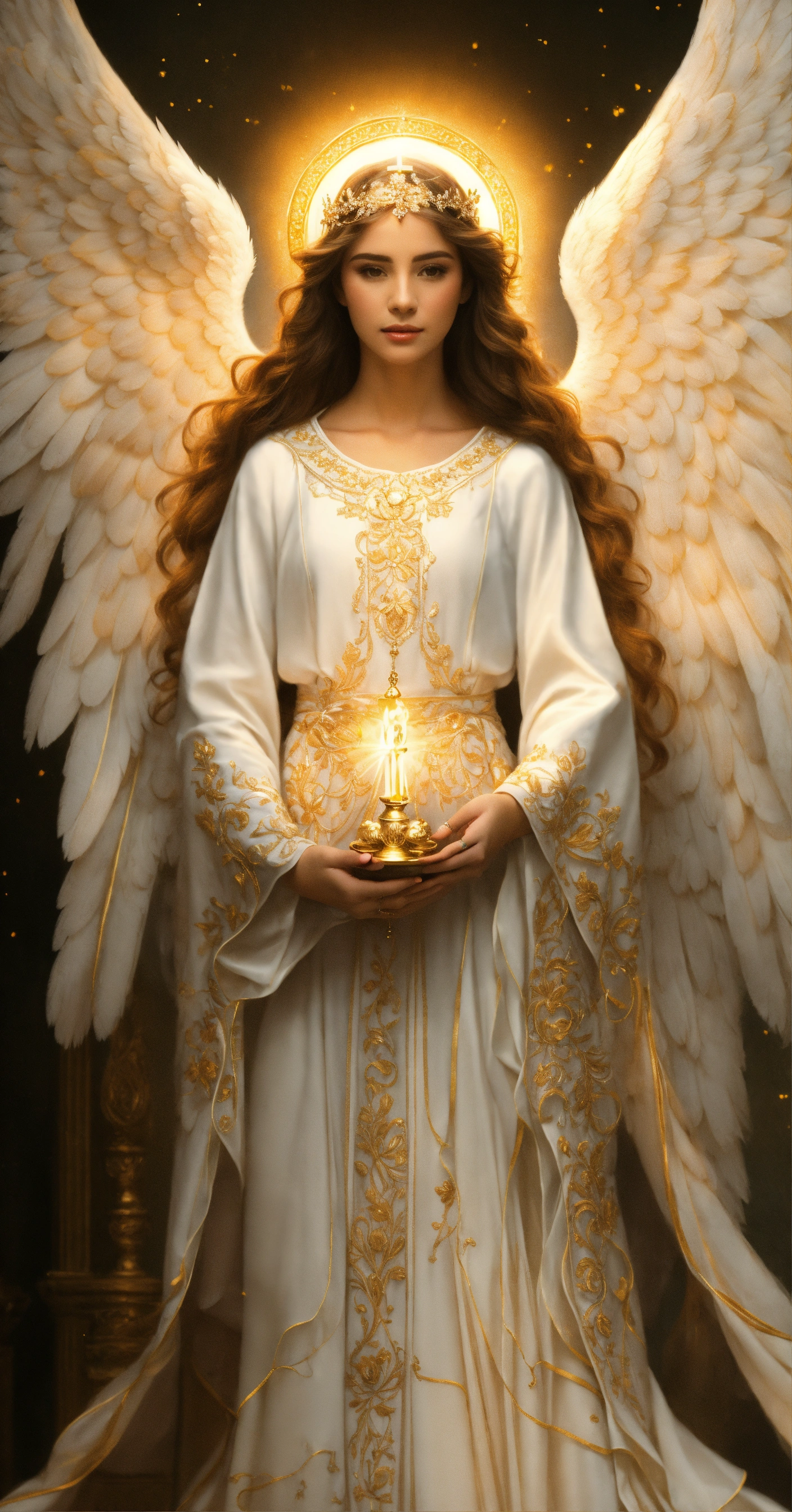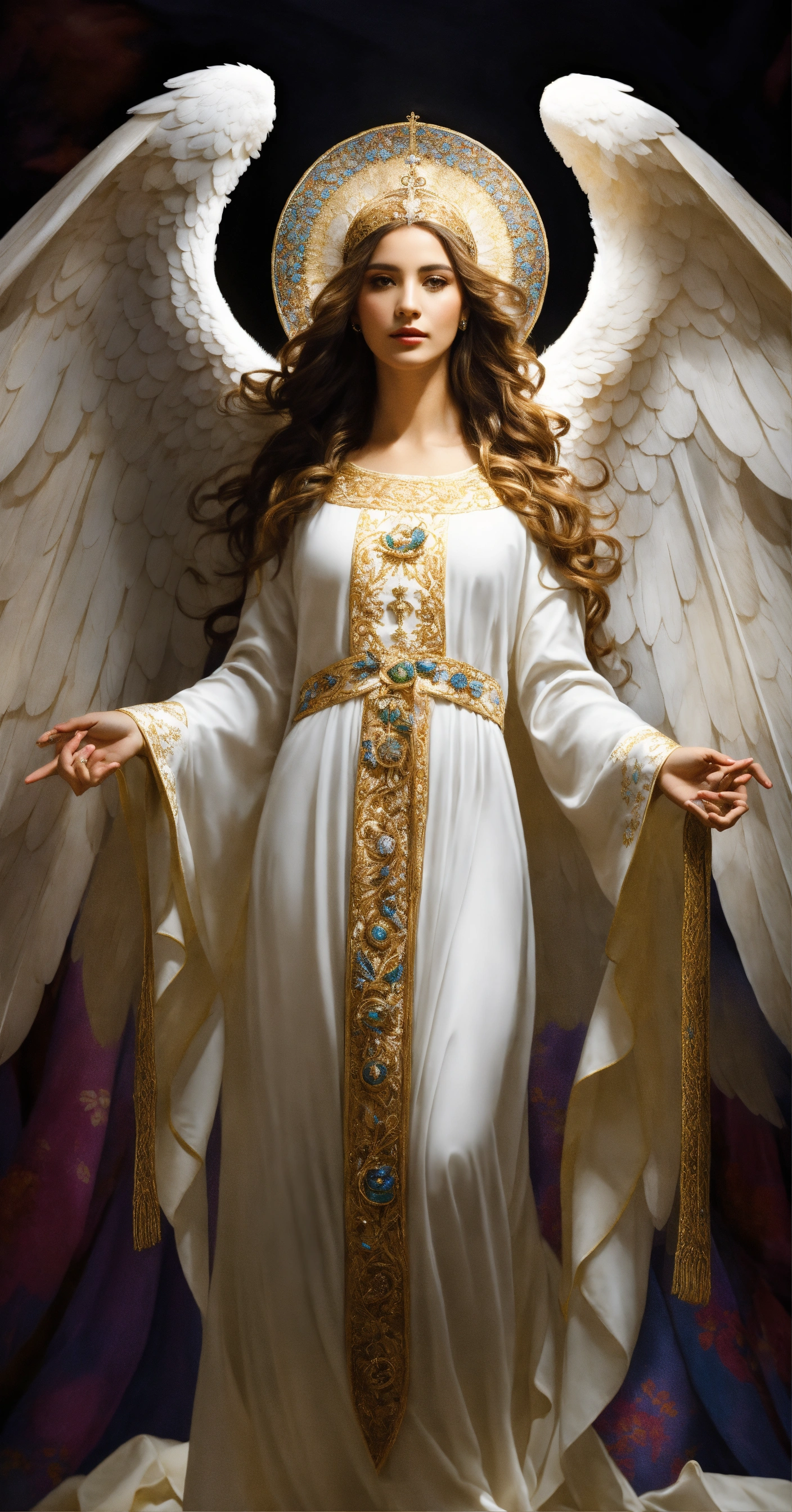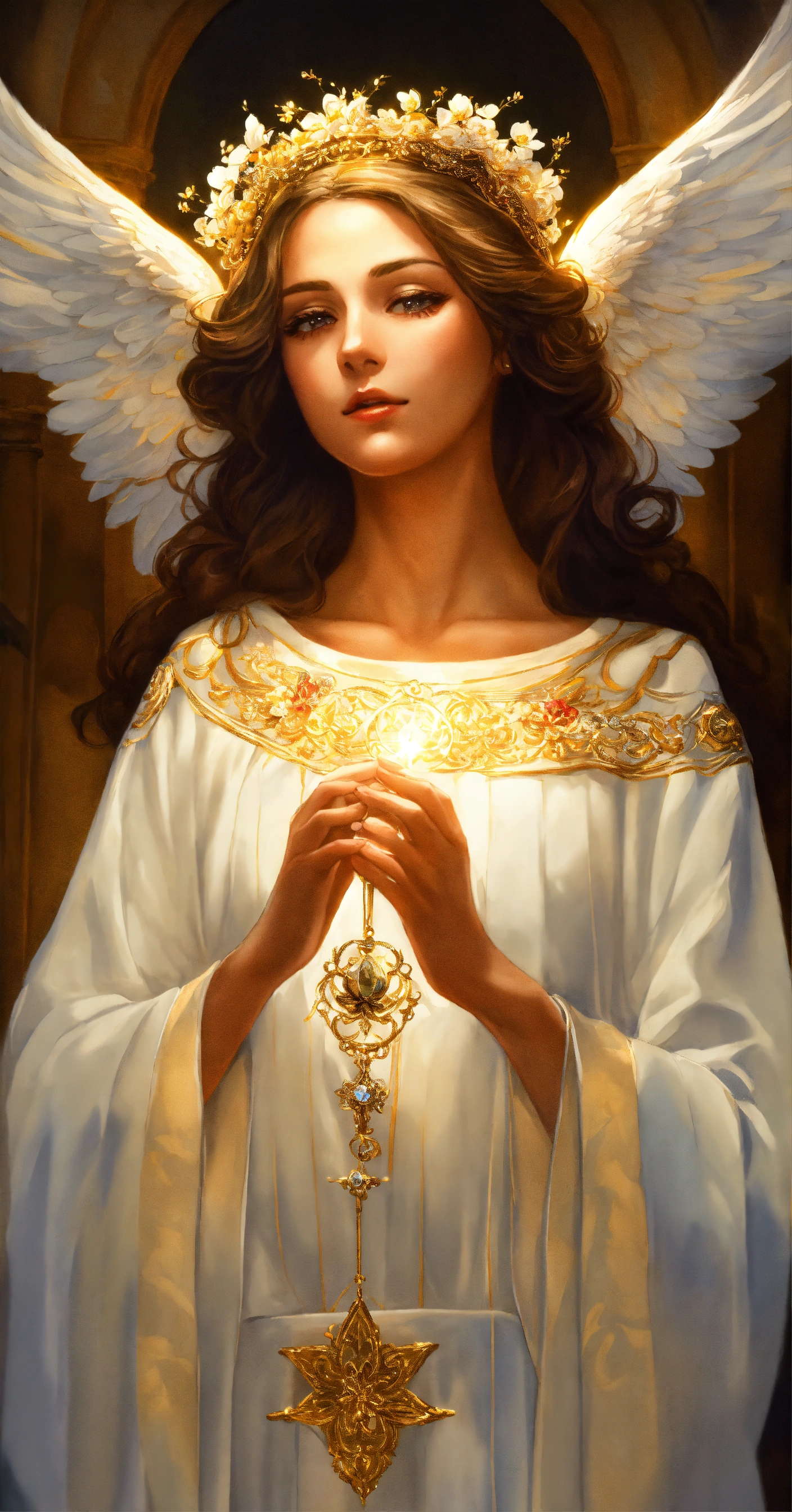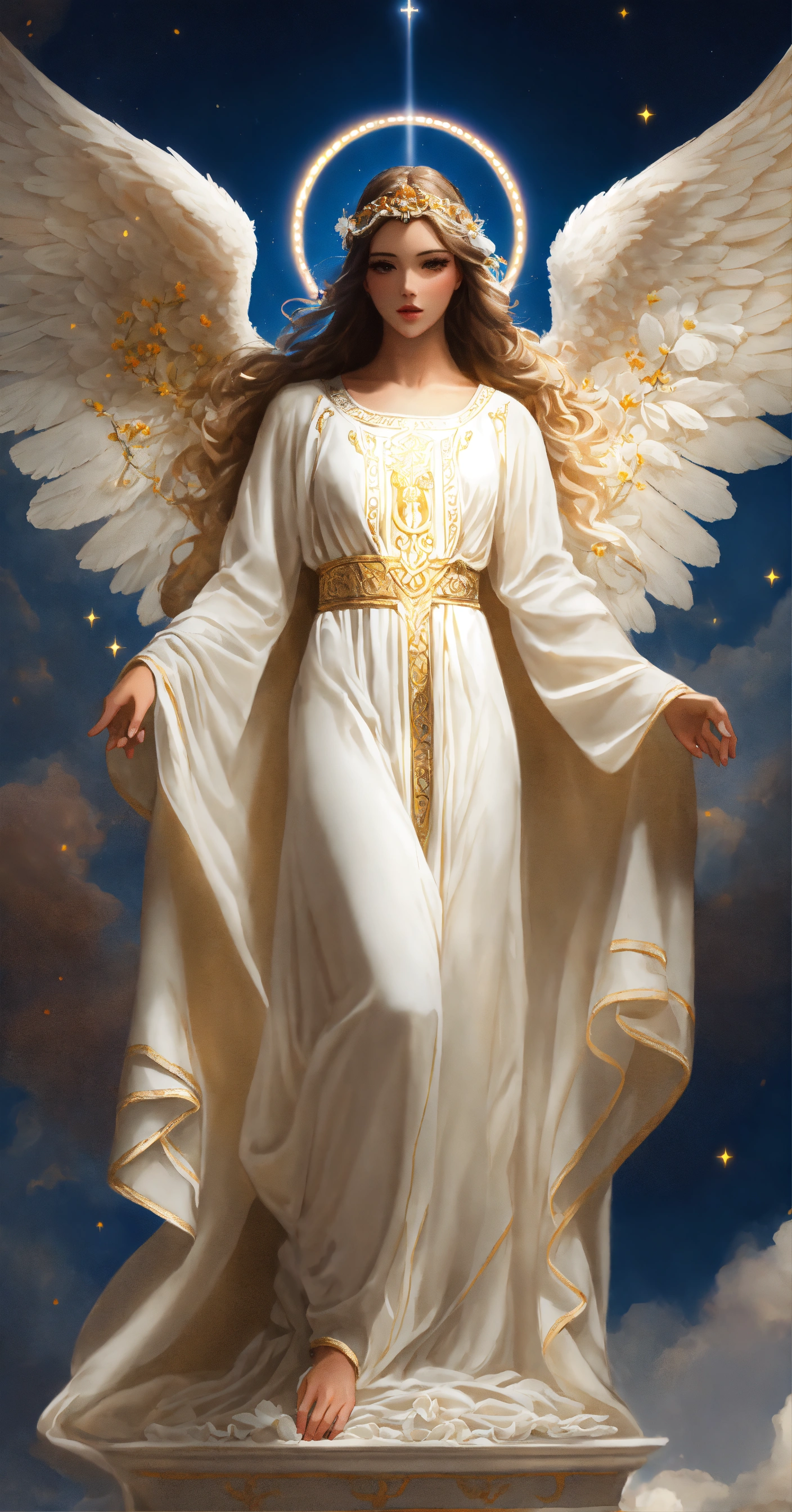 Sacerdotisa angel mujer hermosa y perfecta con alas de angel de color blanco y destellos luminosos detalladas y definidas, alas de angel completas y grandes, sacerdotisa angel hermosa y divina con alas grandes y uniformes, rostro precioso y detallado, ojos muy claros con una mirada profunda y penetrante, cabello largo de color blanco muy definido, vestido celestial tipo tunica de sacerdotisa de color blanco con muchos detalles plateados y con mucha luz, en sus manos tiene una flor blanca, obra maestra, realismo, hd, alta calidad, alta resolución, 8k