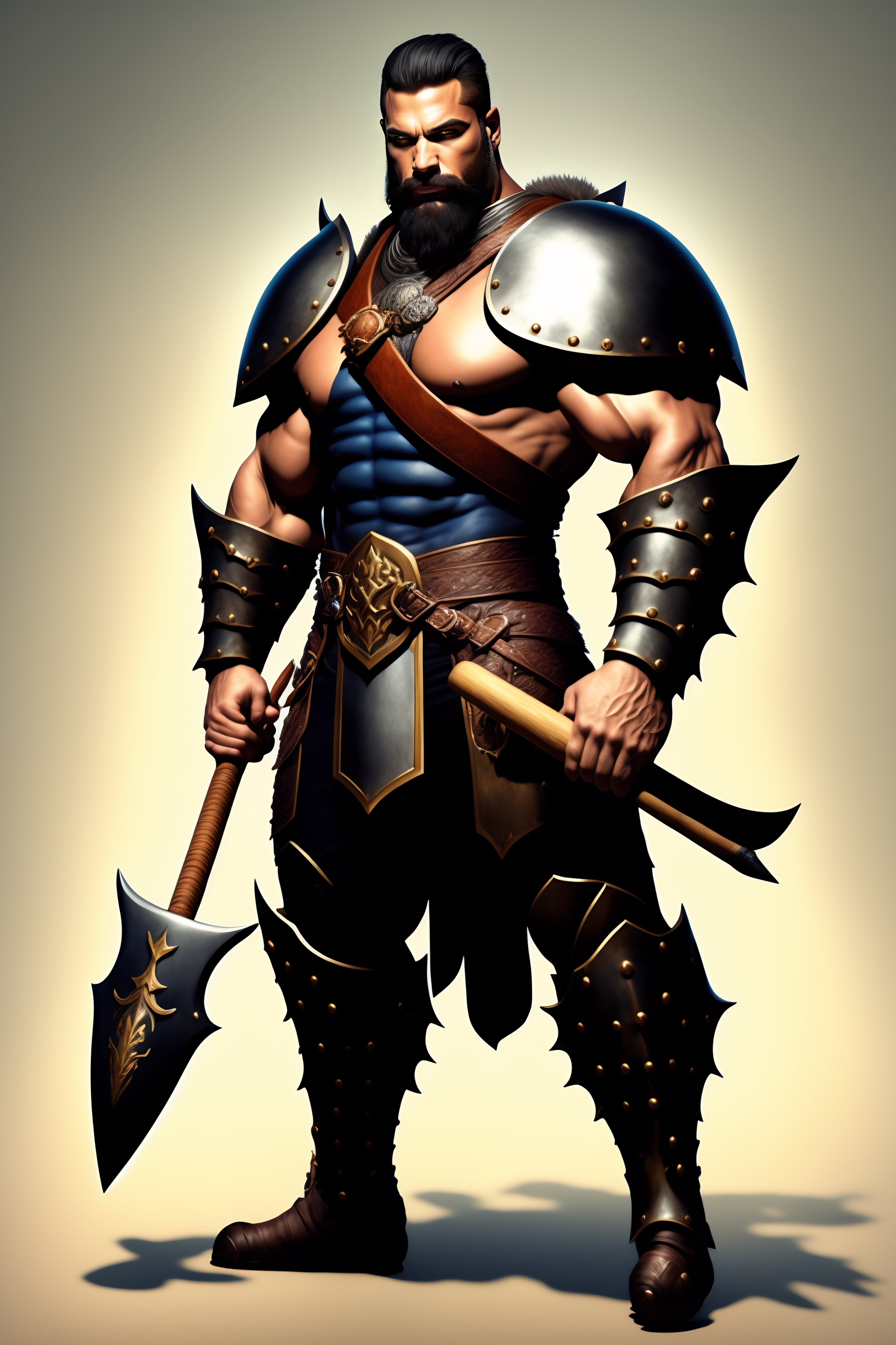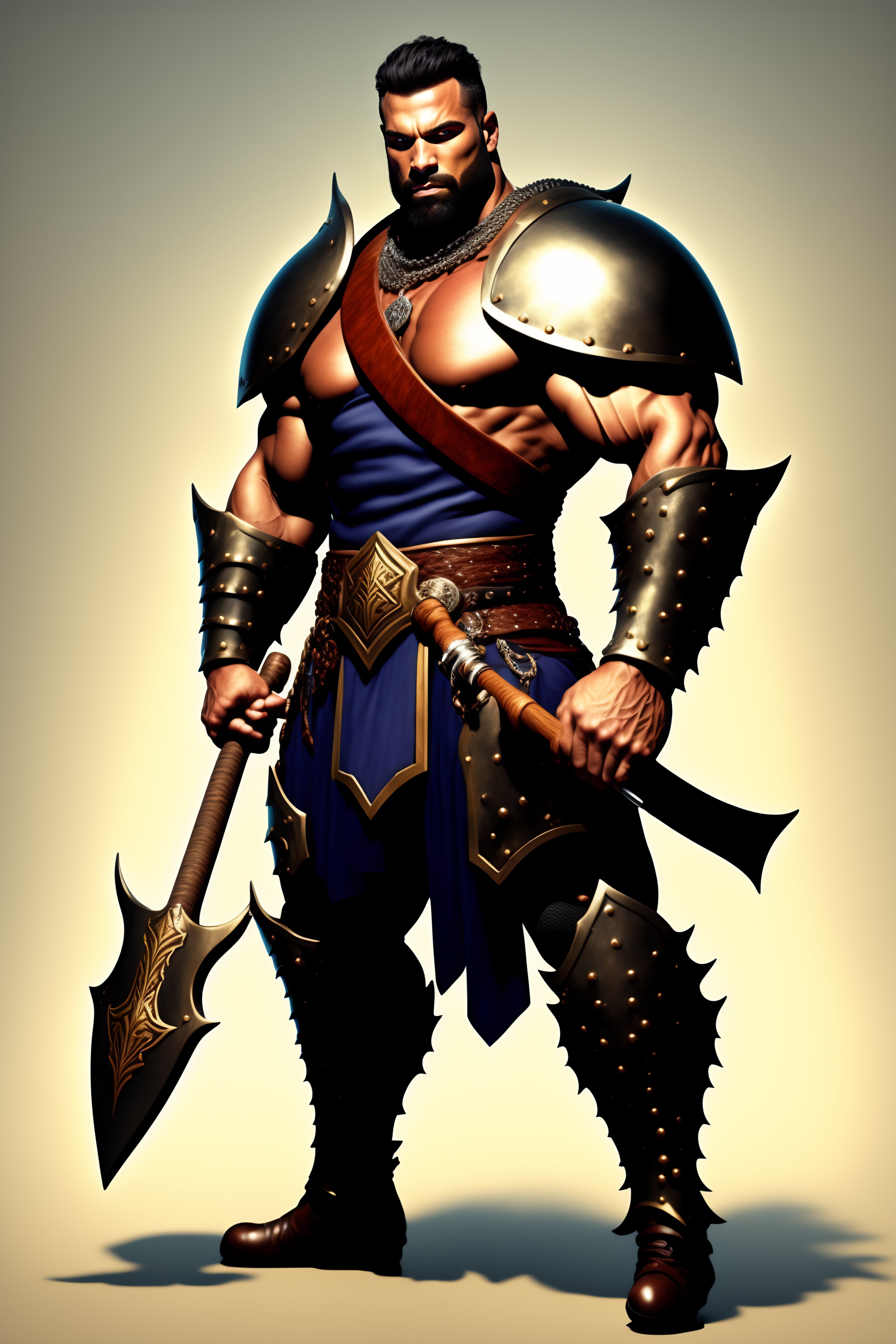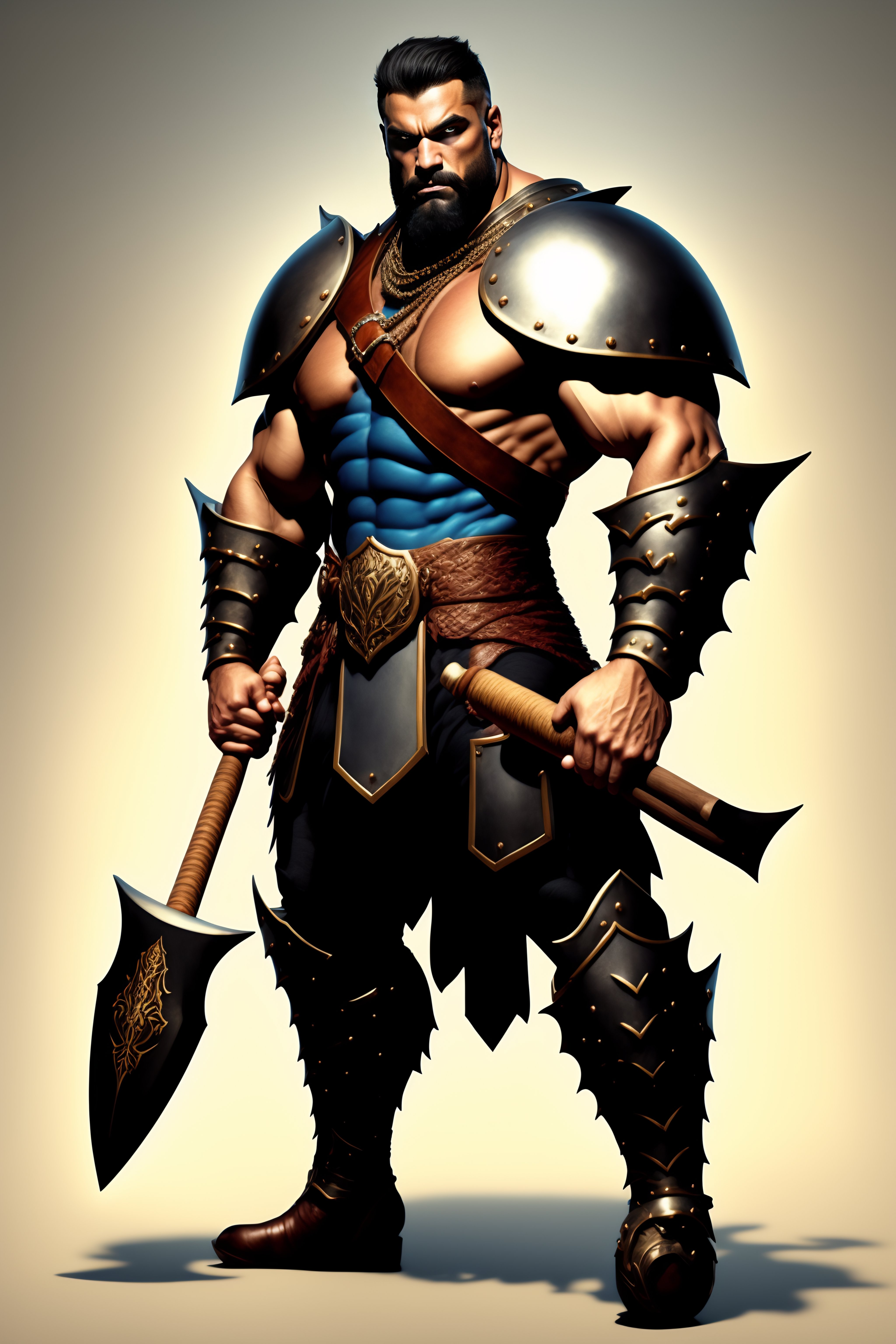 Full body portrait, front facing, man, savage, muscular body, holding a large hammer, heavy leather armor, dnd character