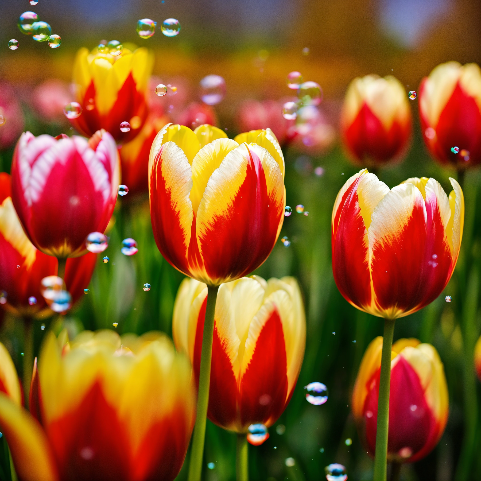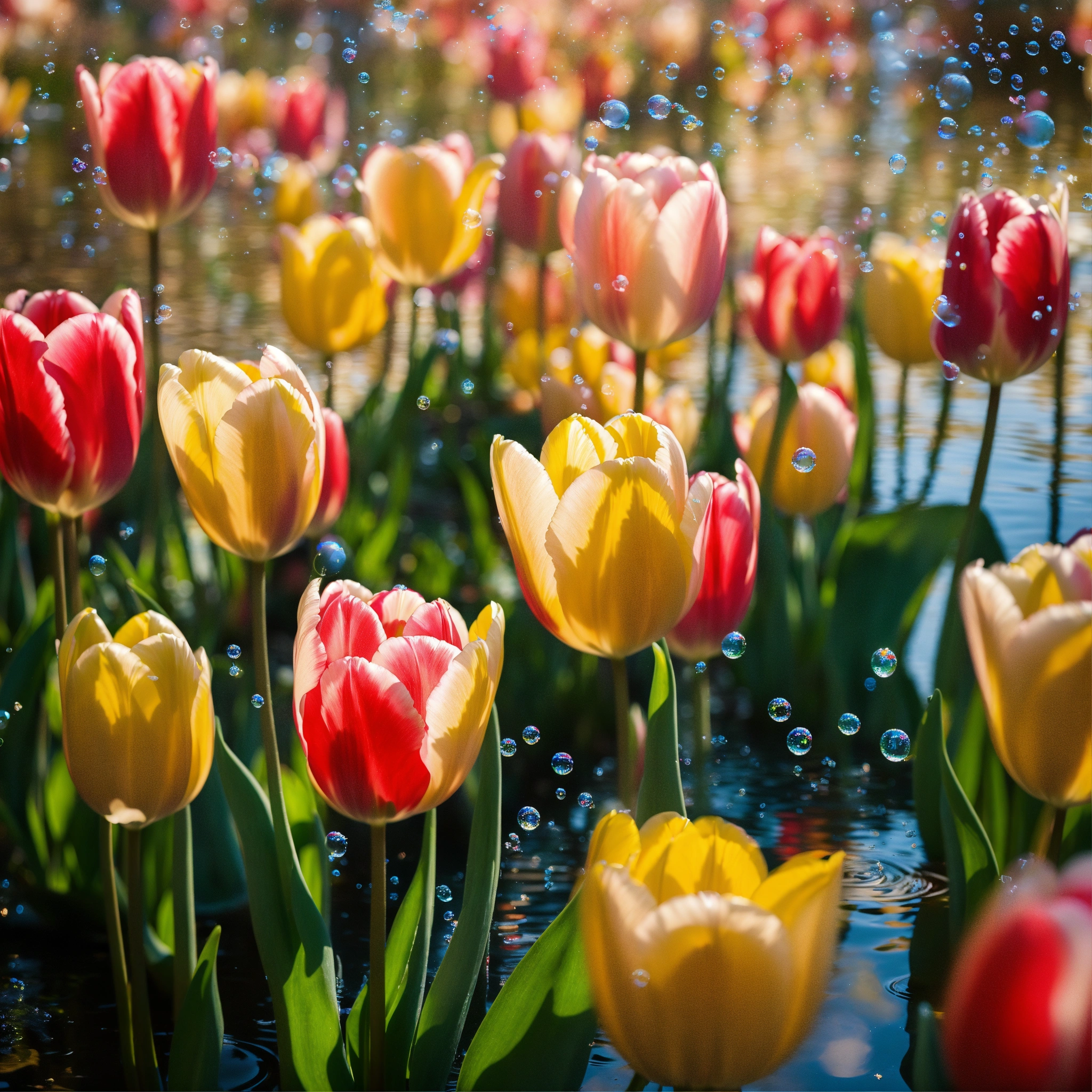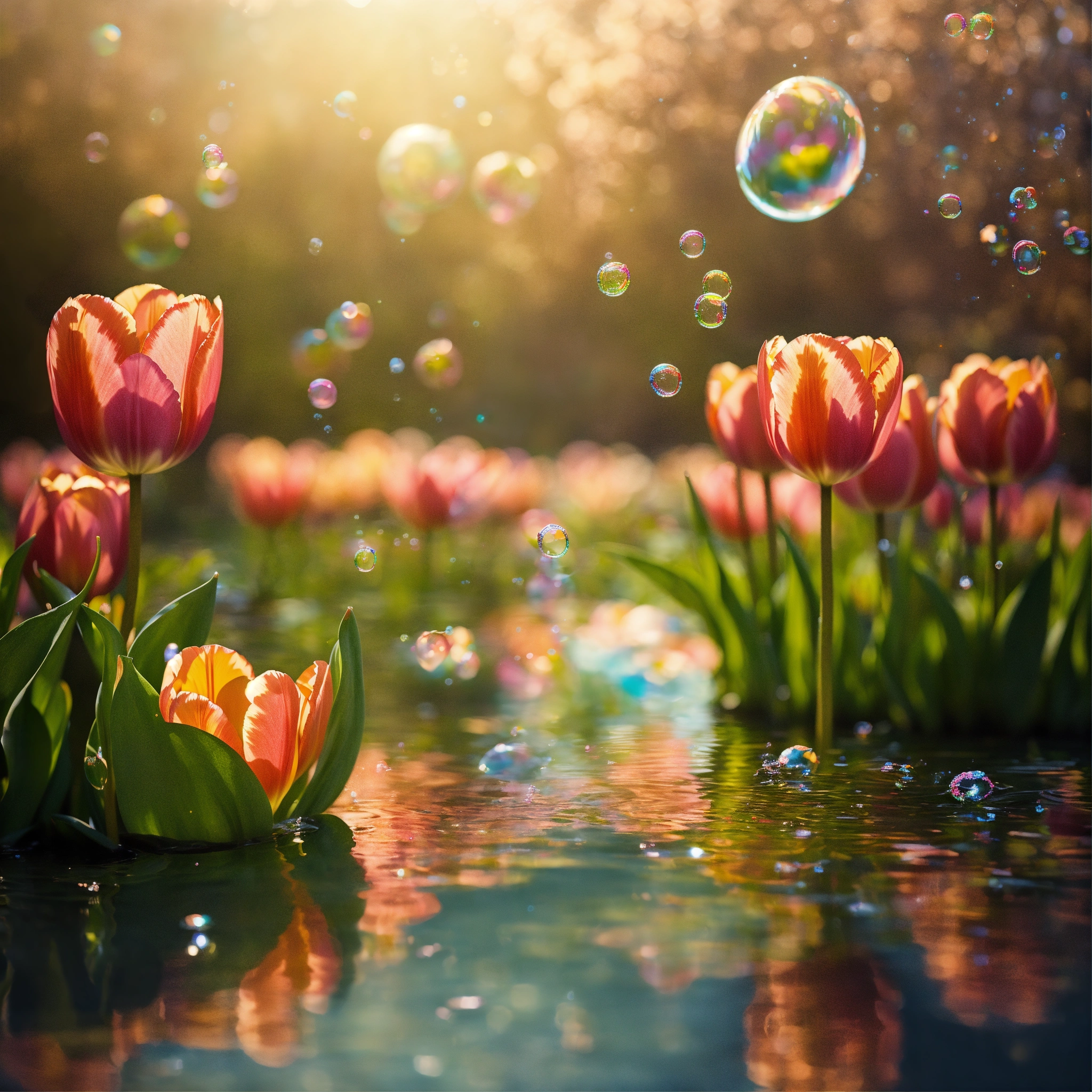 Tulips ethereal floating with bubbles in a pond earth tones