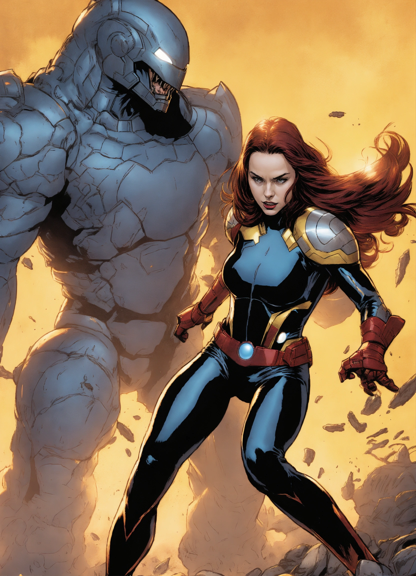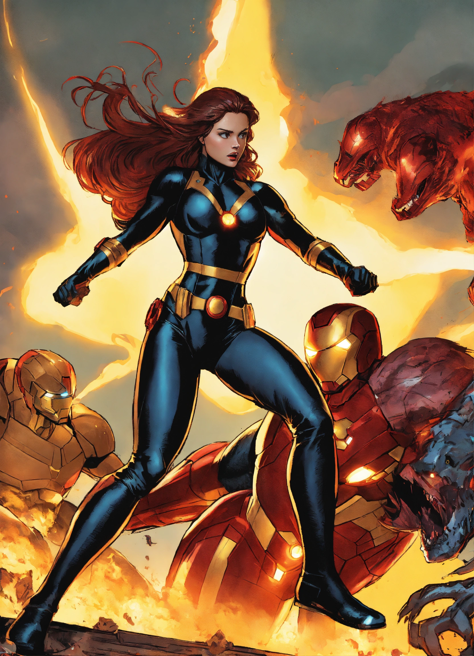Female x-men shadowcat wearing black metal iron man costume fighting alien monster