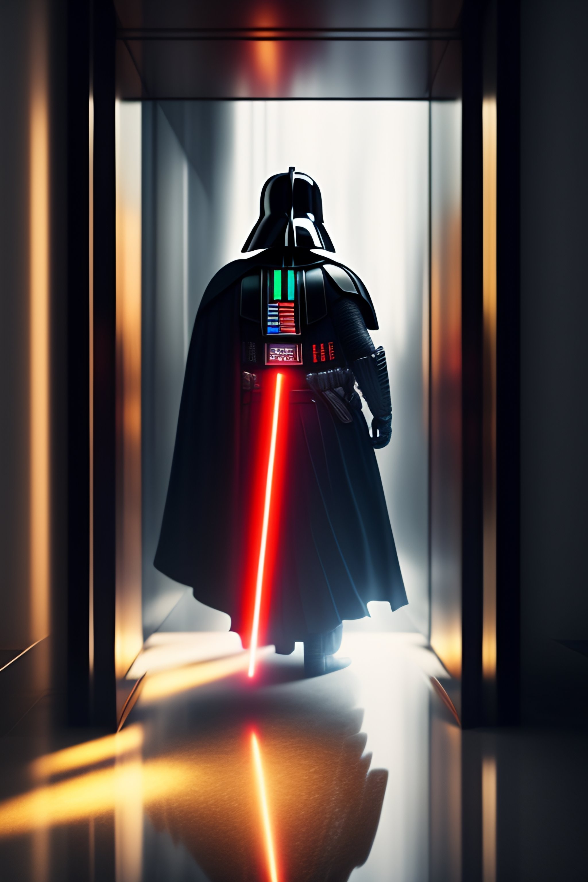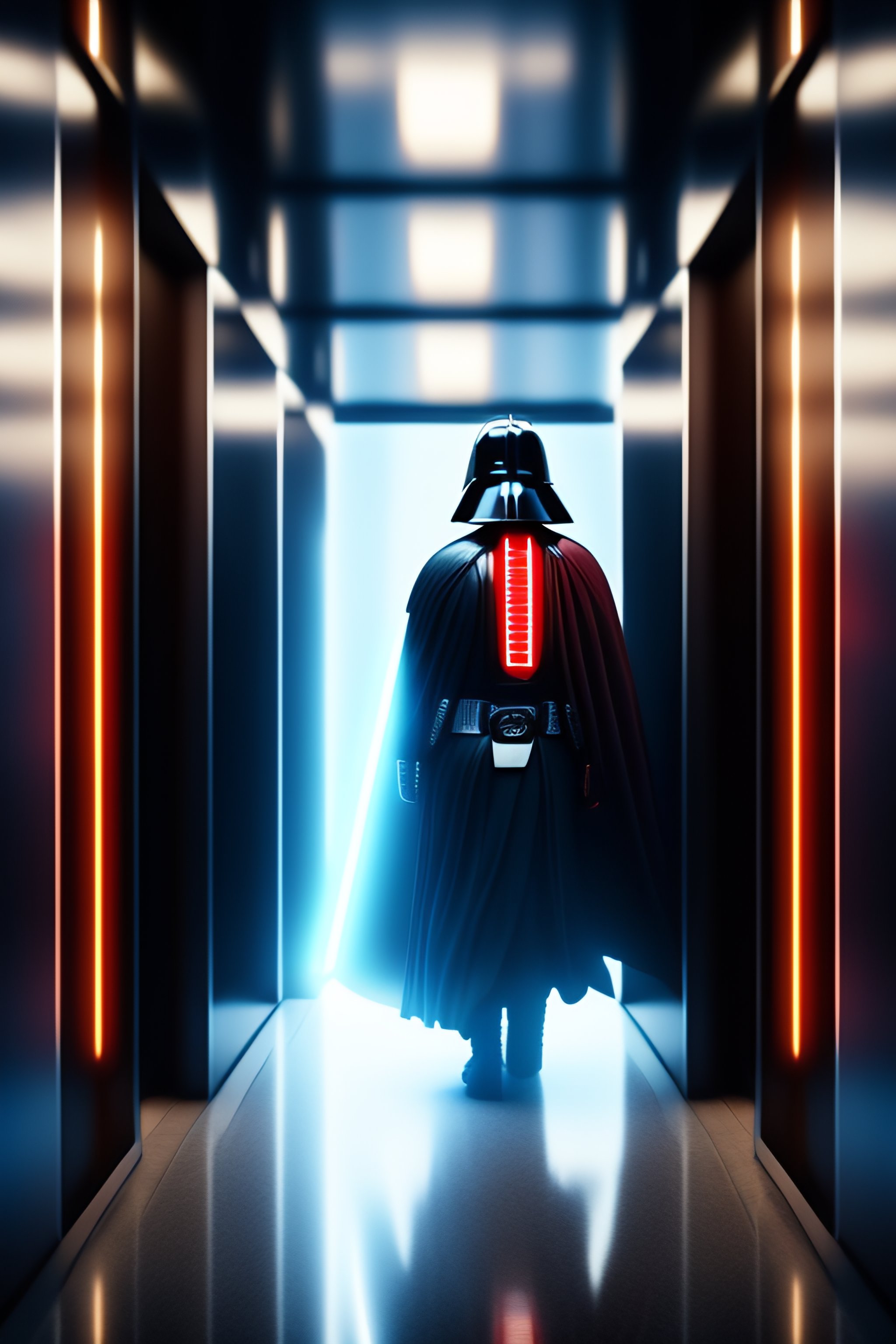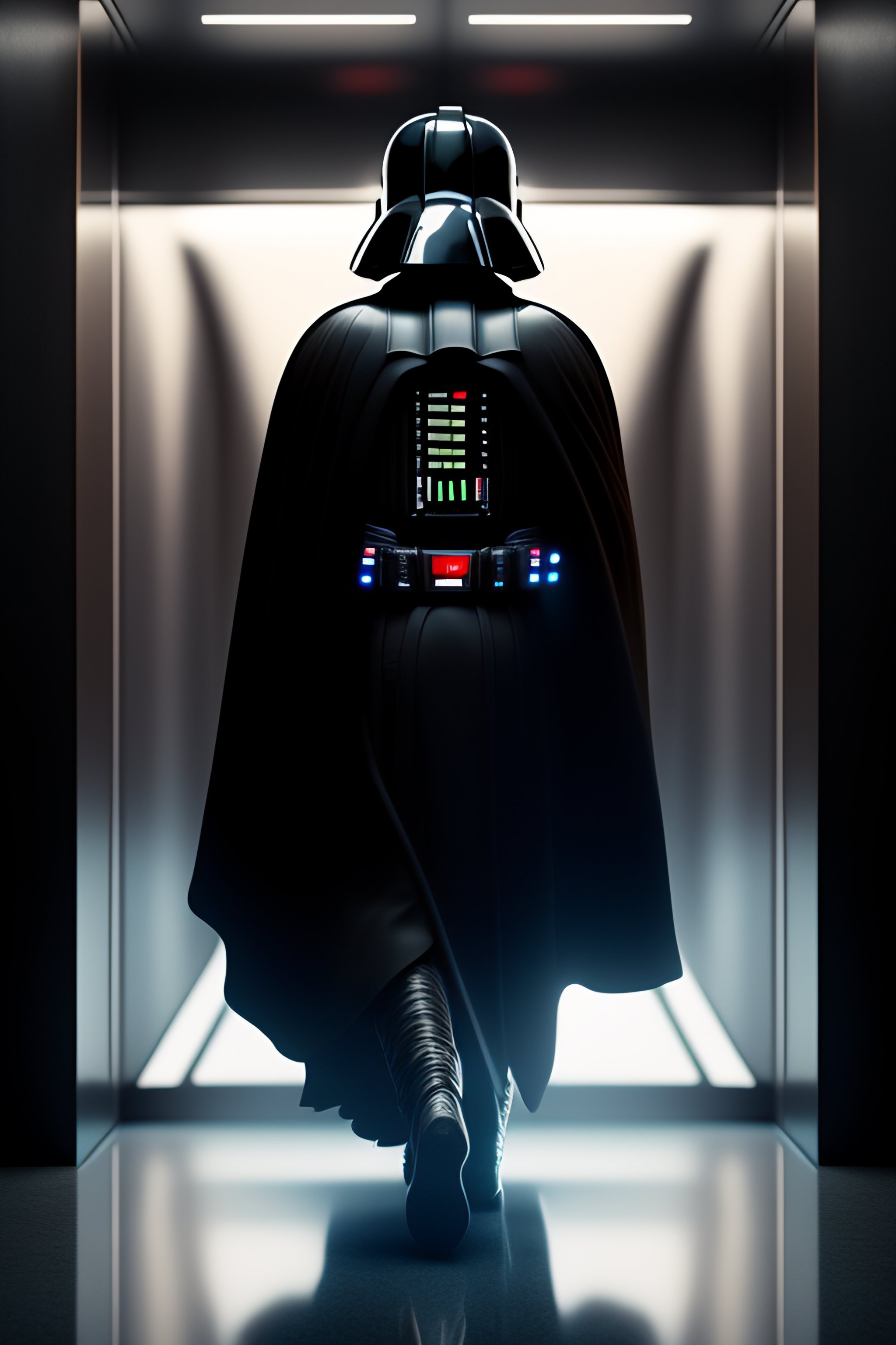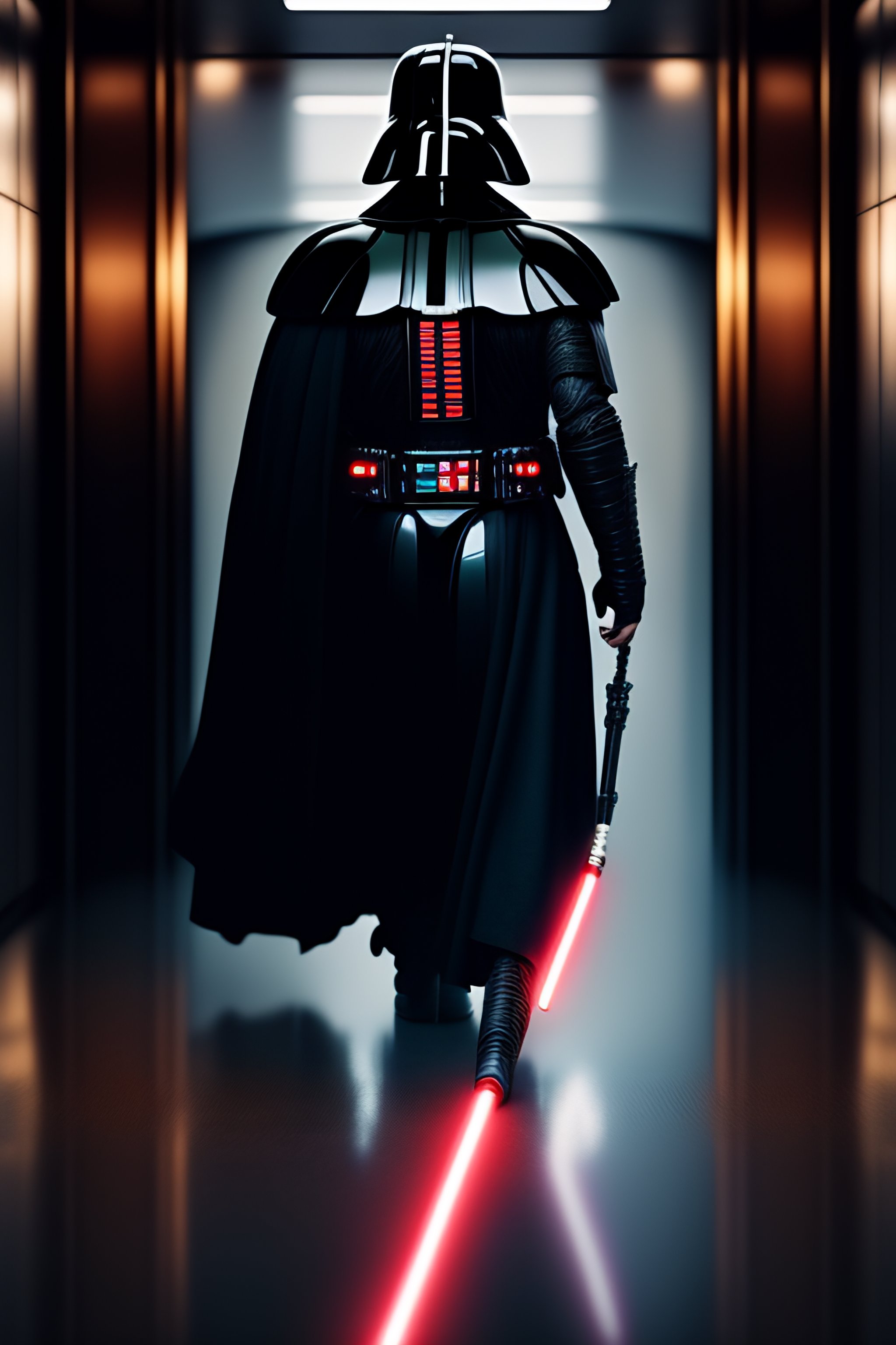 Darth vader exiting an elevator holding a lightsaber. ultra realistic