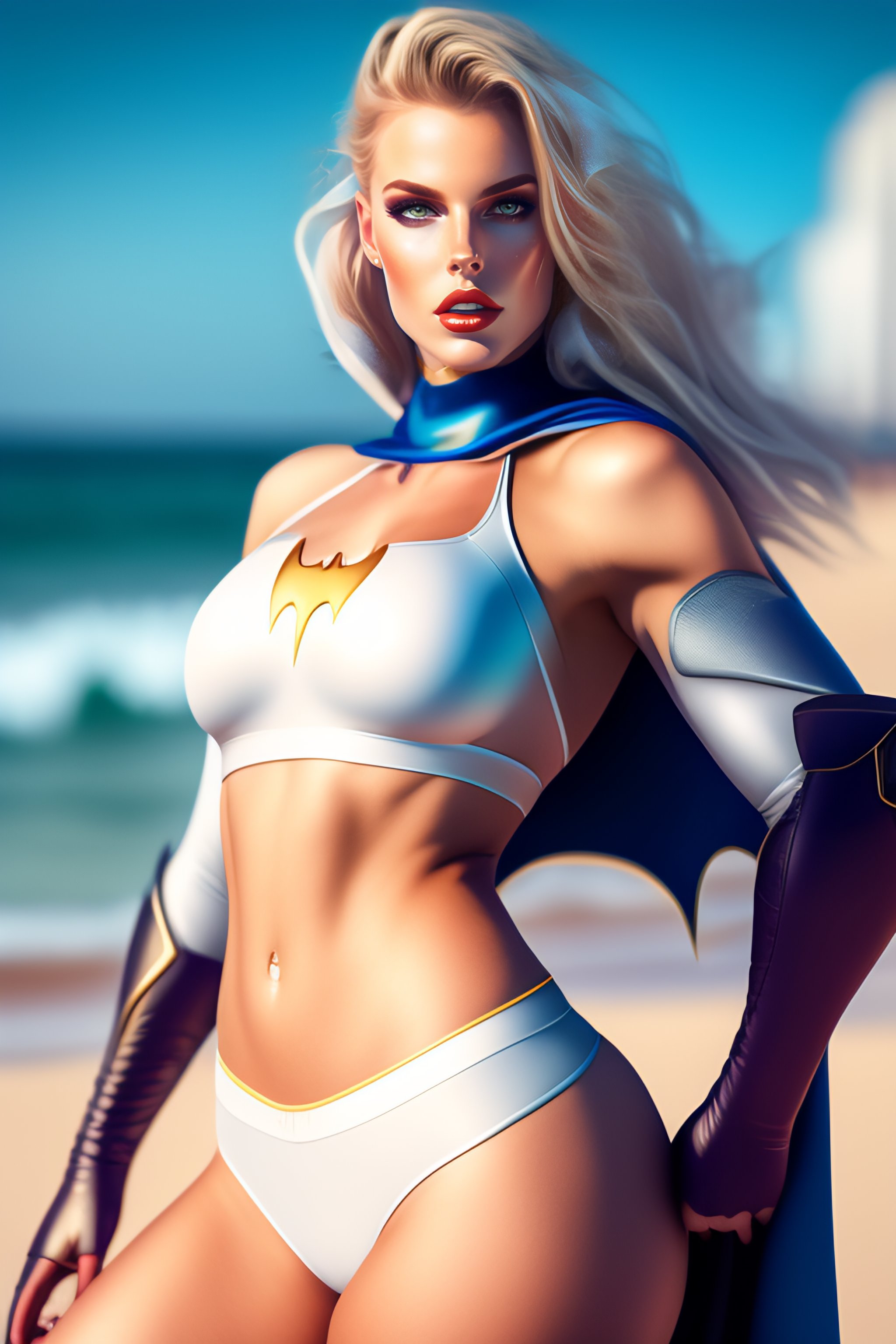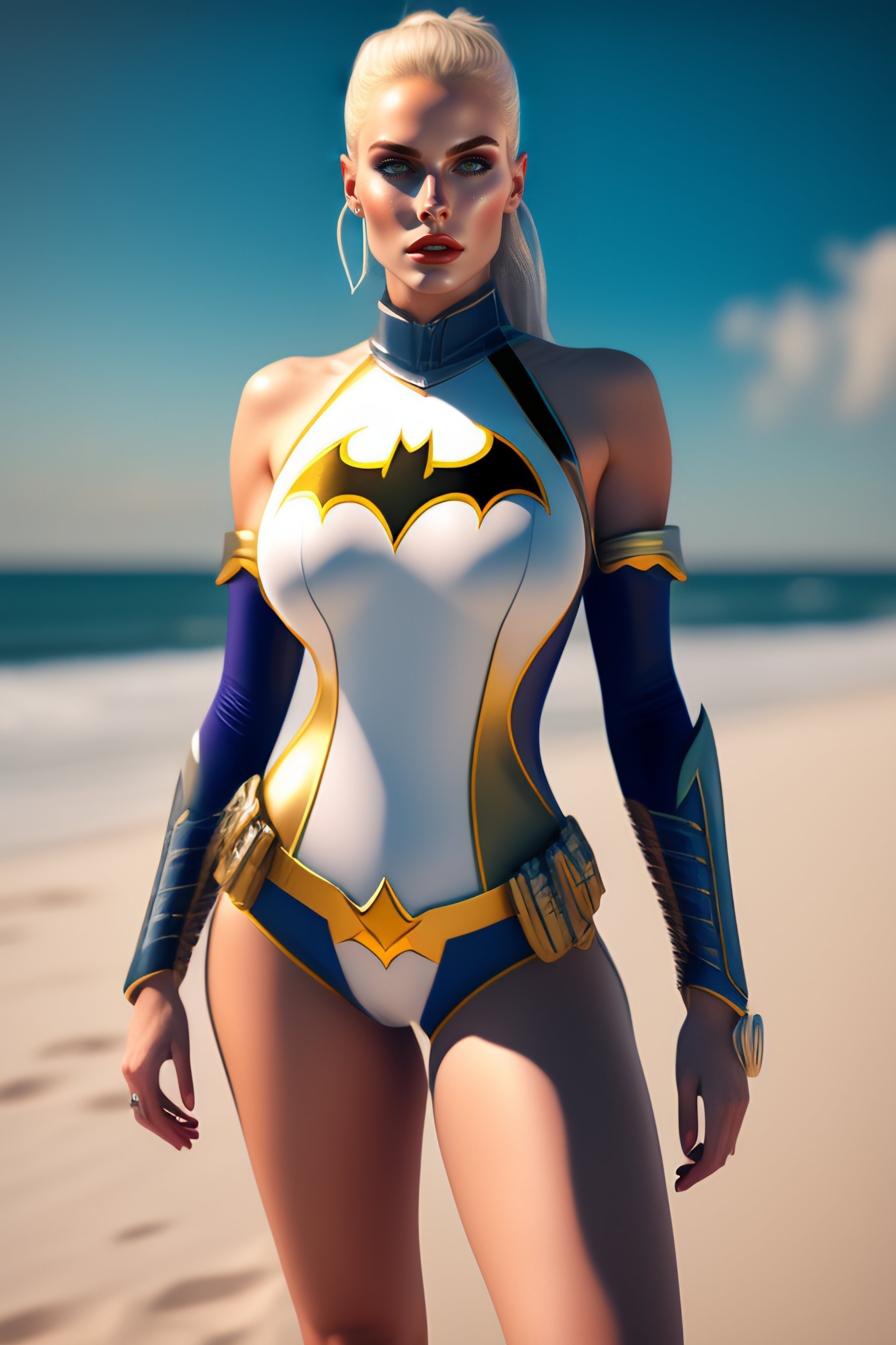 Batgirl, highly detailed, wearing a white bikini, dystopian, big luscious lips, big female chest spheres, digital painting, artstation, concept art, sharp focus, illustration, beautiful face, ripped clothes, at the beach, small waist, nice legs, elegant, attractive, pretty, beautiful model, full-body shot, 4k
