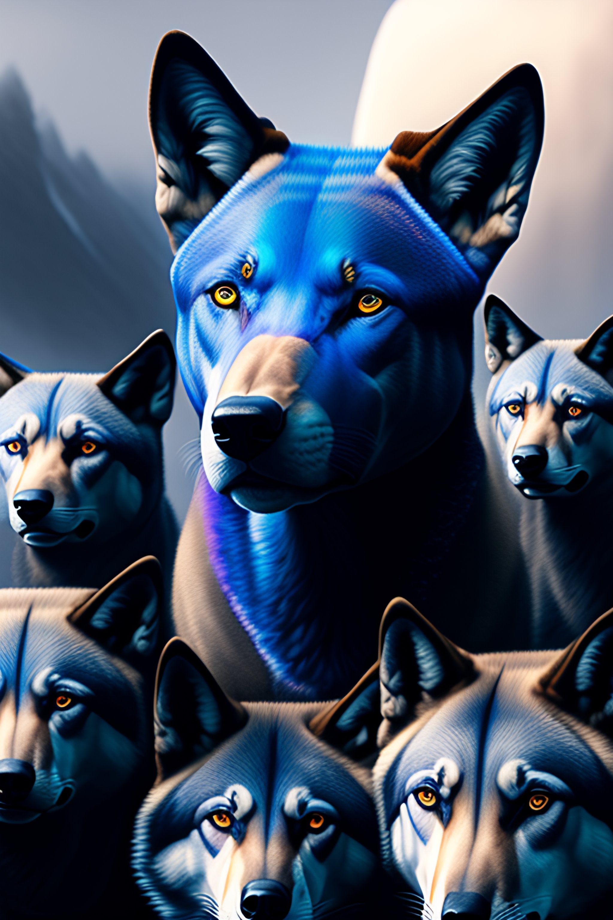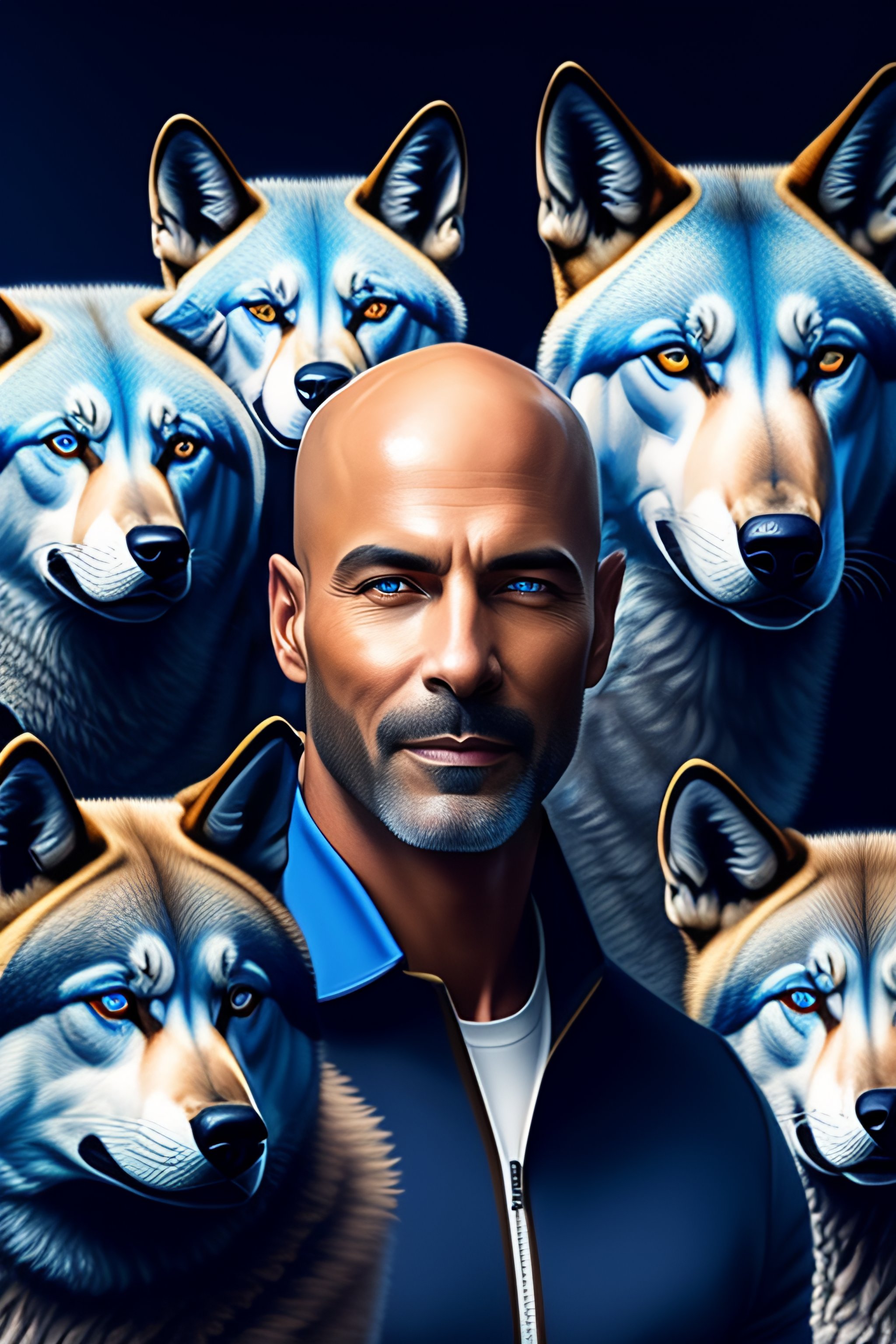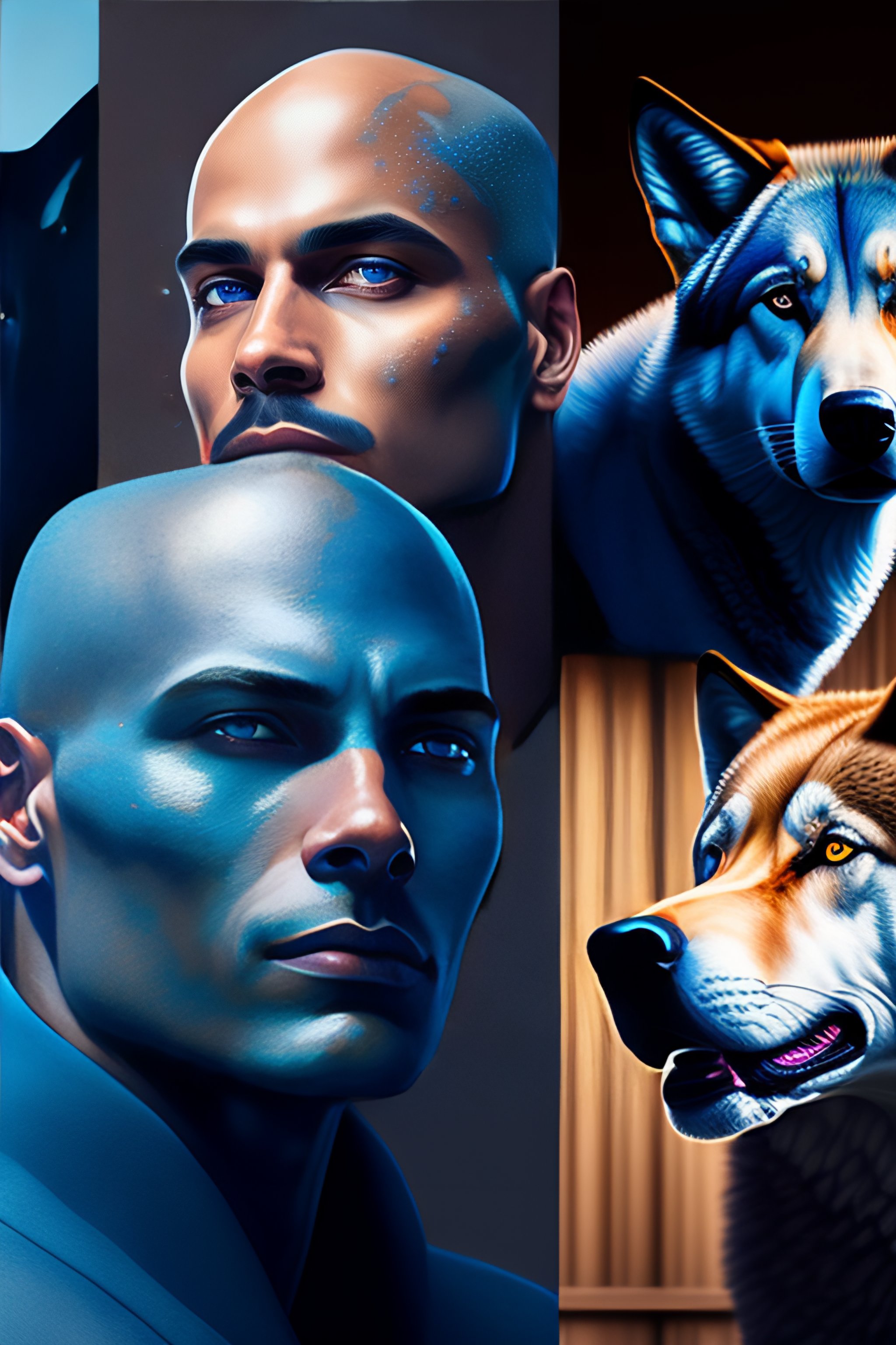 Detailed illustration of a bald blue man surrounded by a wolf pack, coherent face symmetry, ultra realistic, concept art, intricate details, eerie, highly detailed, photorealistic, octane render, 8 k, unreal engine, art by artgerm and greg rutkowski and alphonse mucha