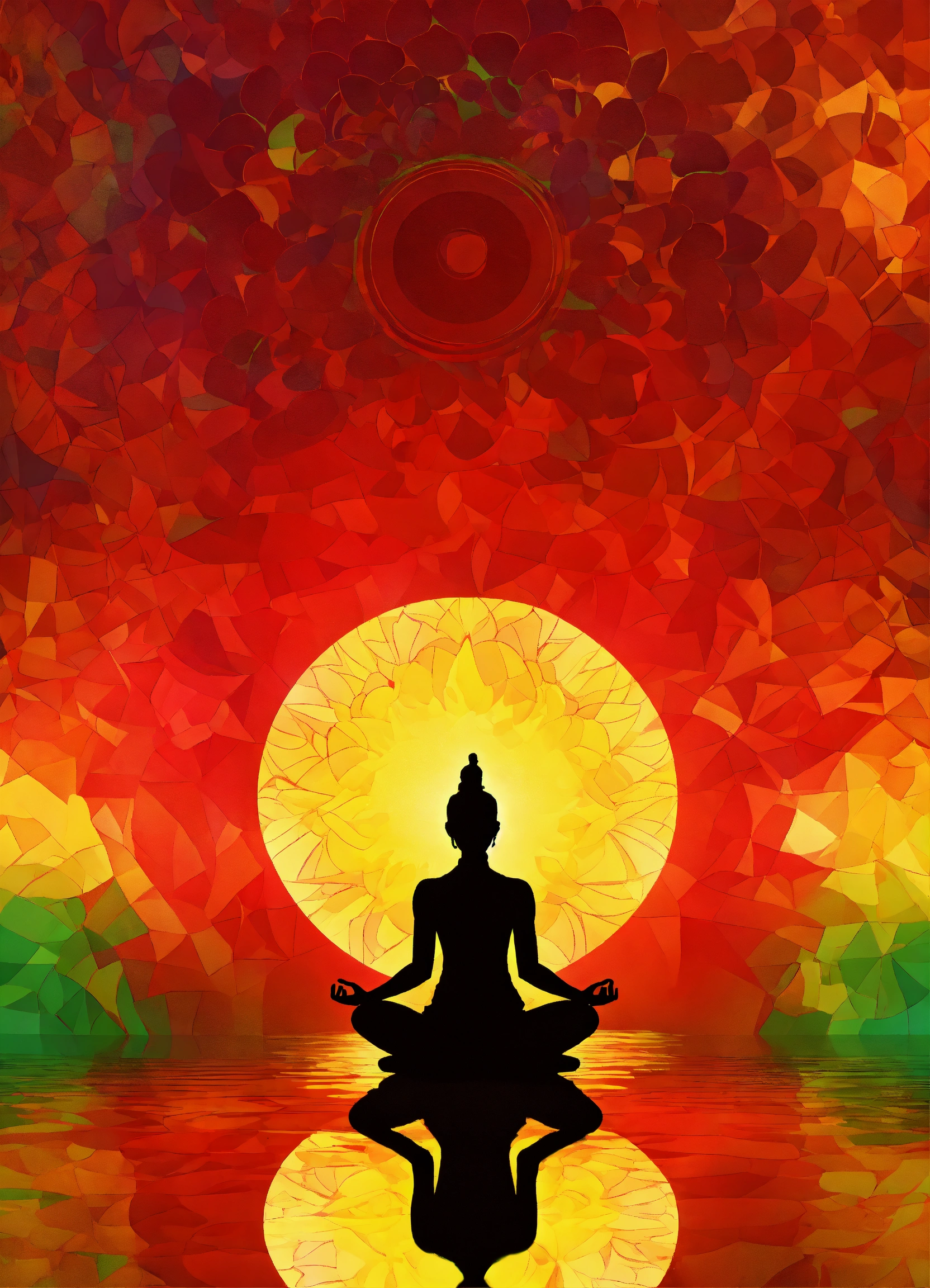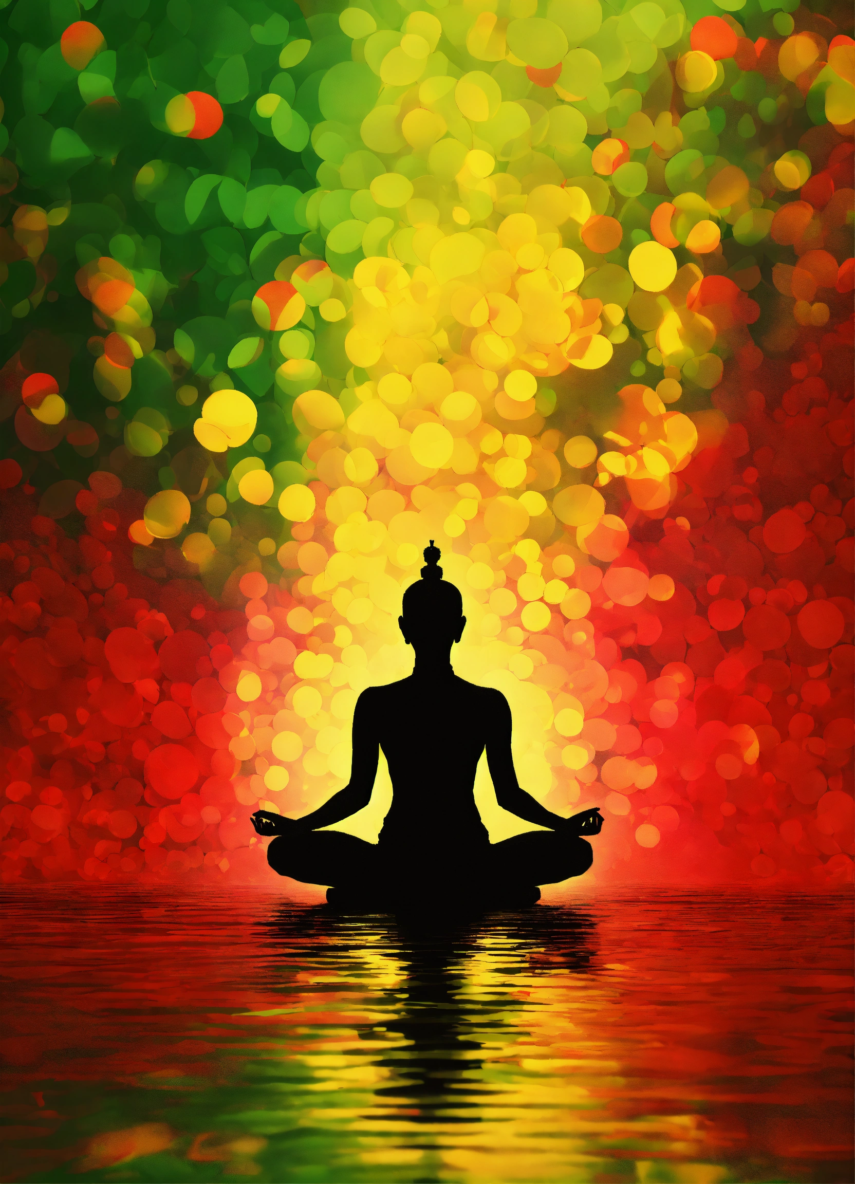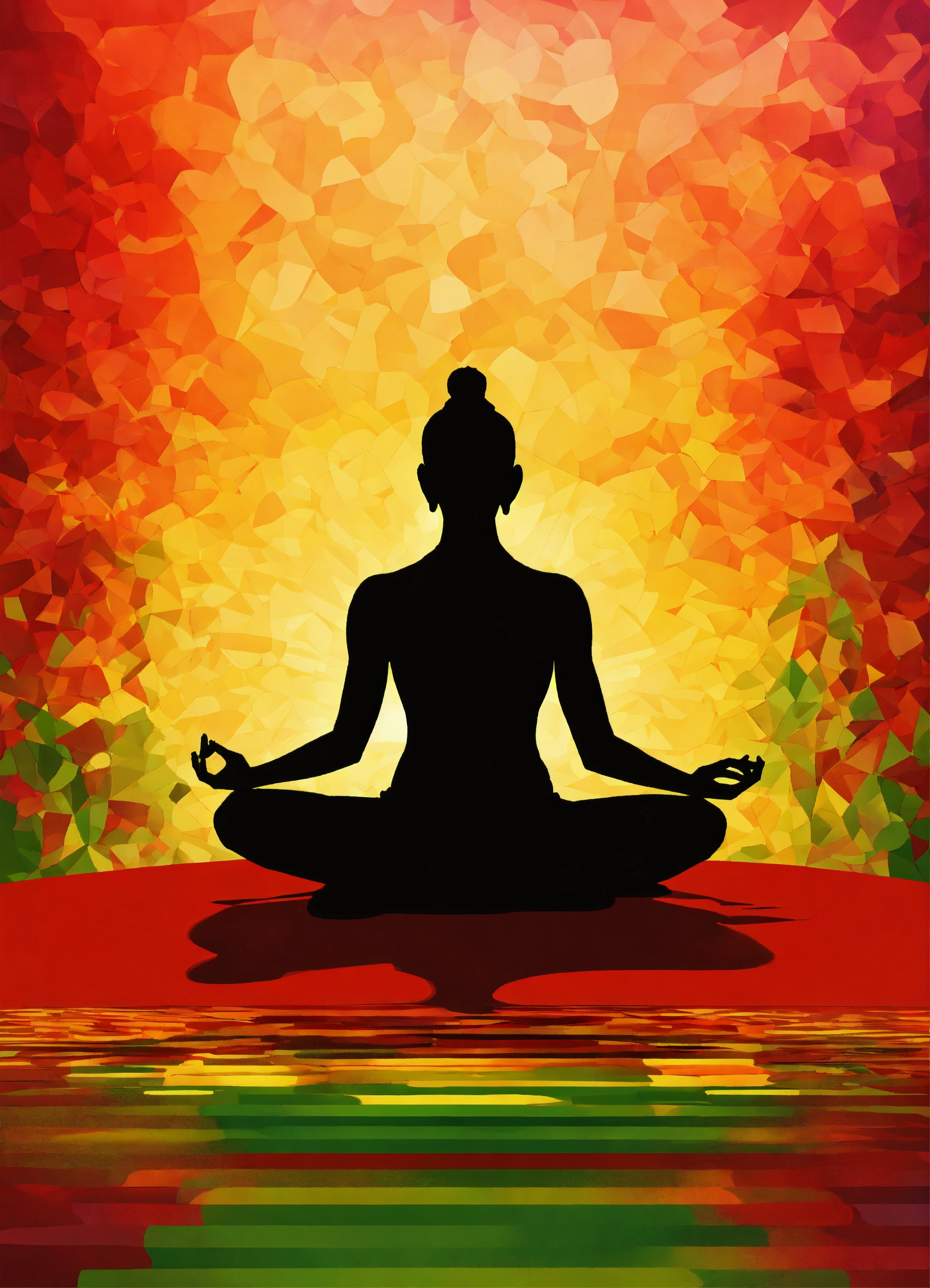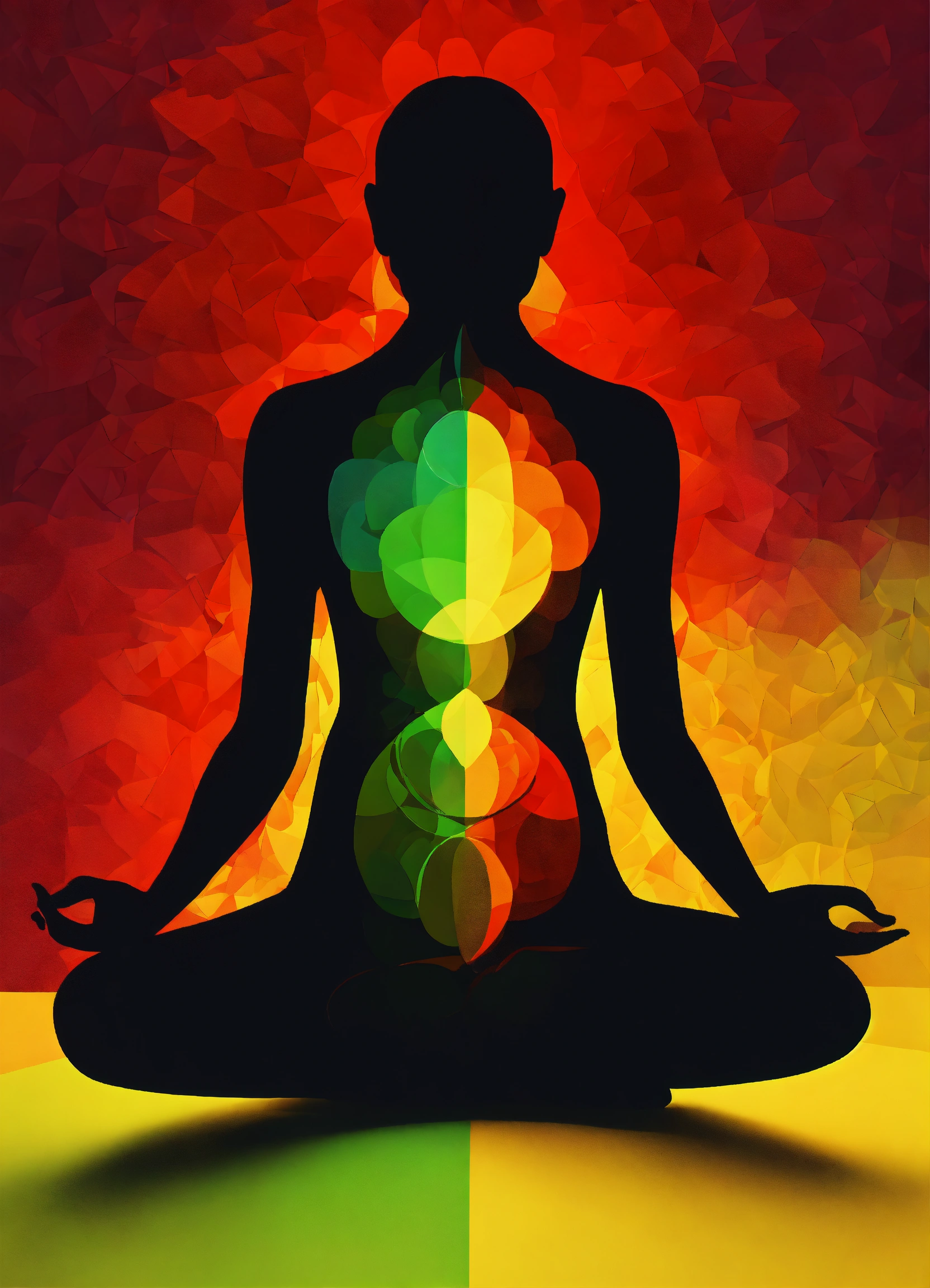 Create an image of a silhouette seated in a lotus position against an abstract background with new year colors (red, green, yellow)