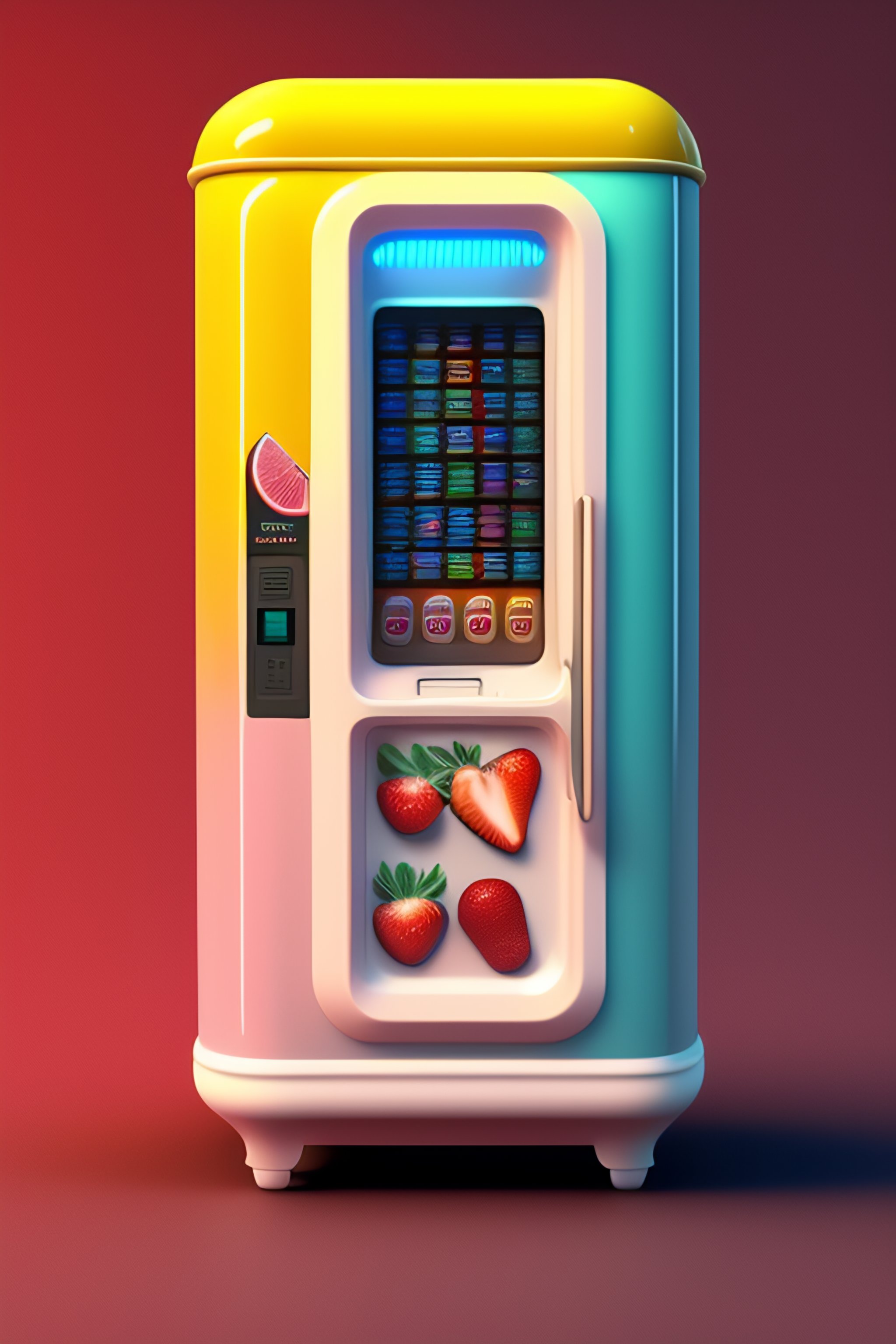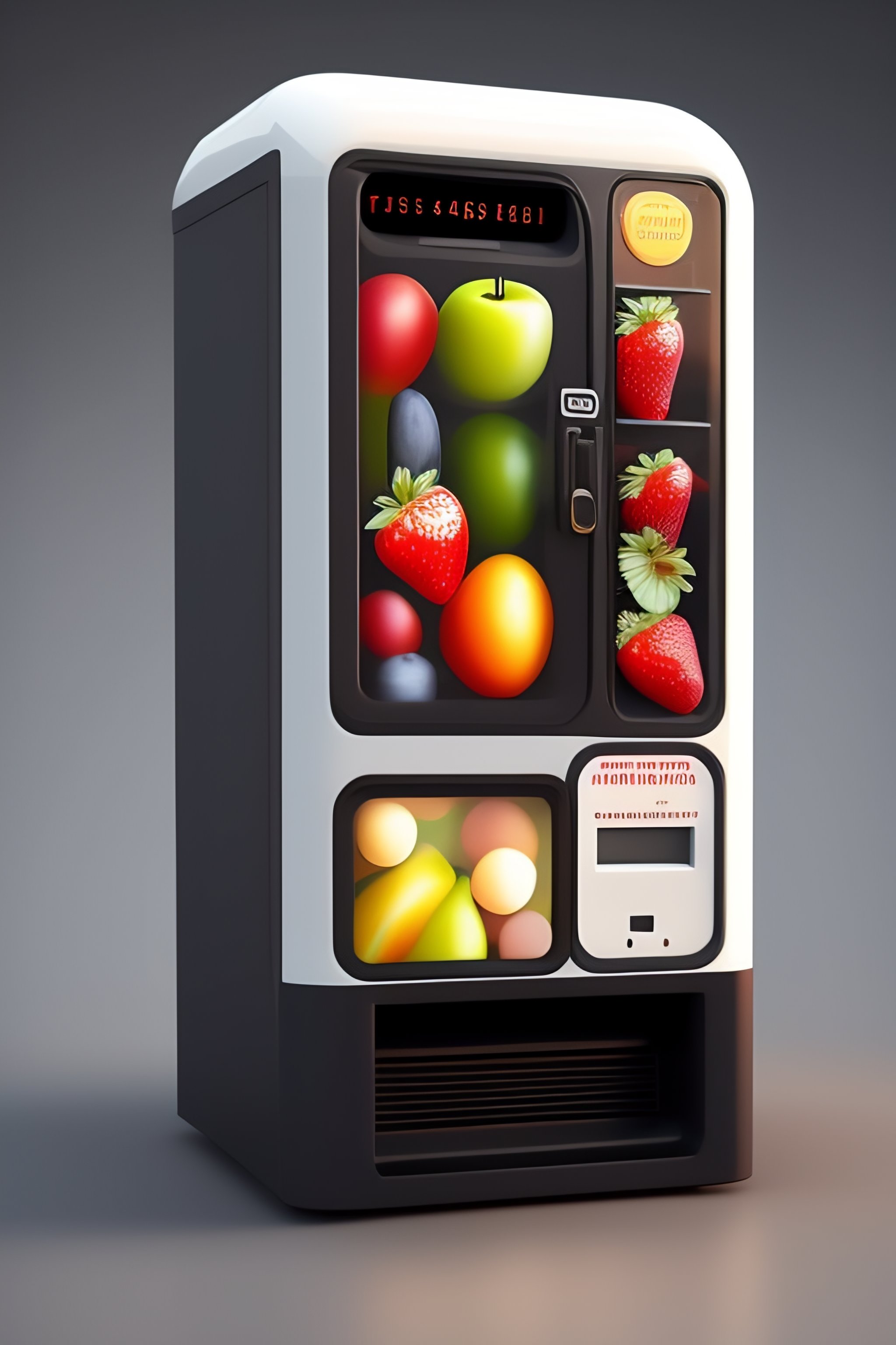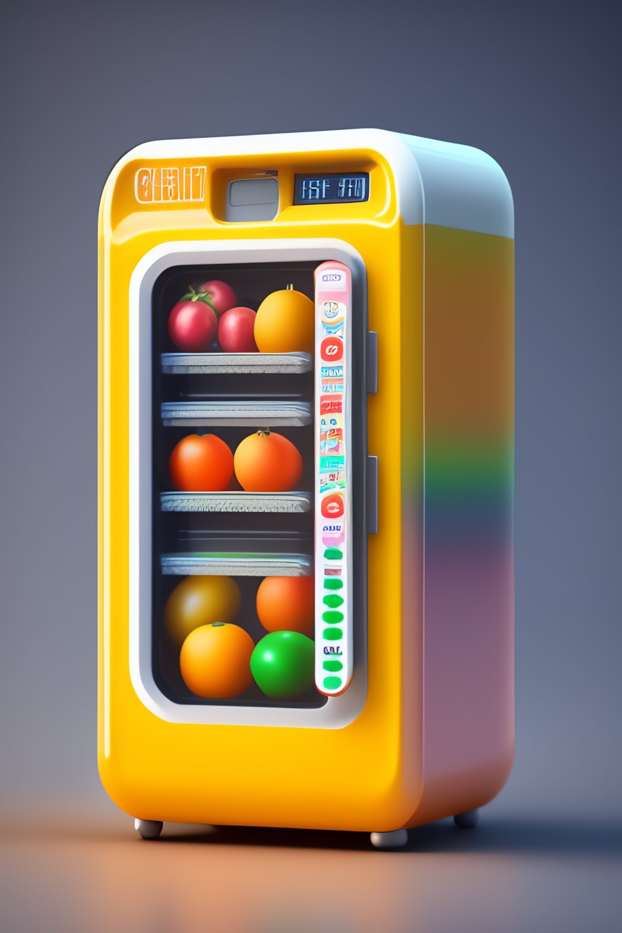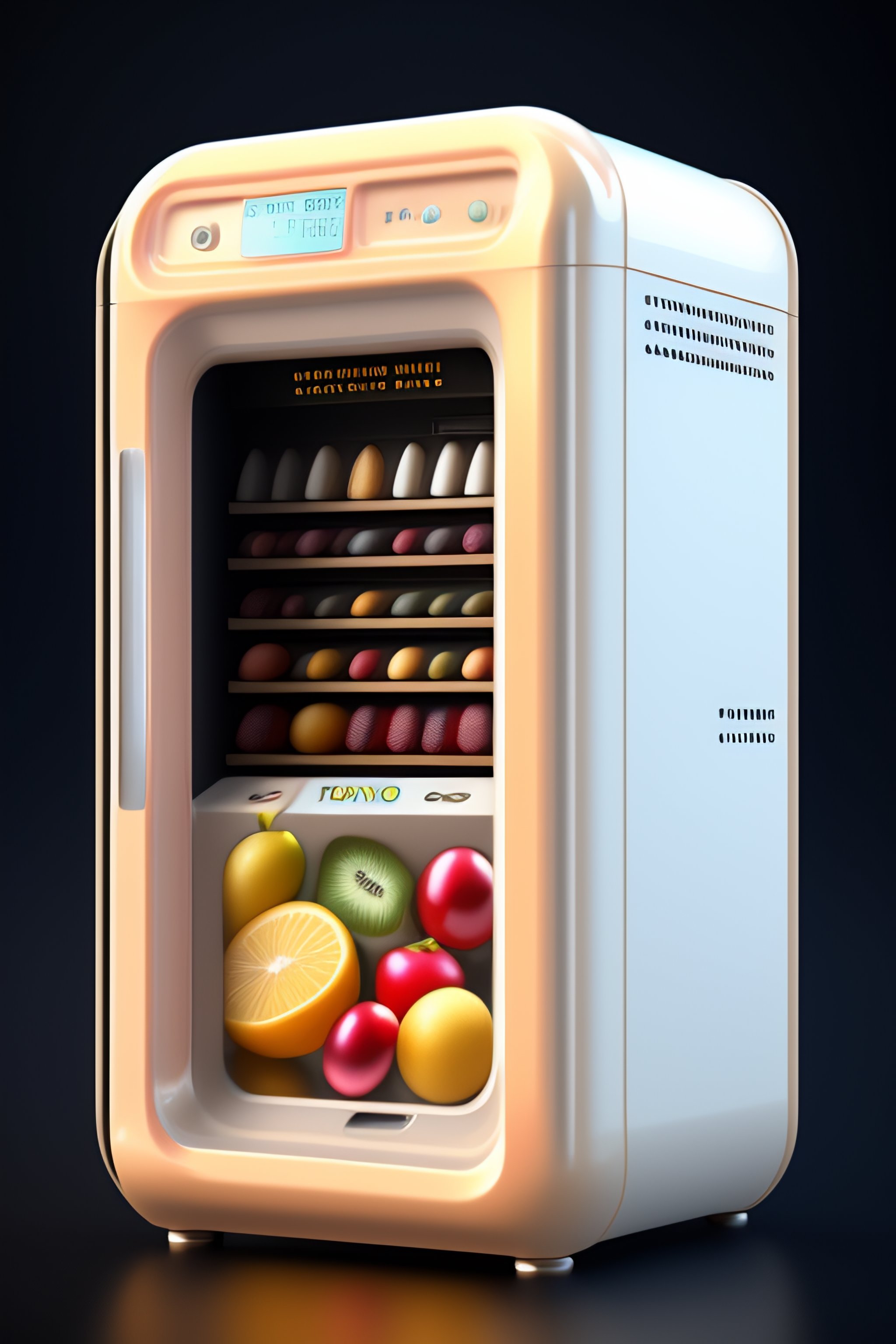 Tiny vending machine for fruits, 3d render, light pastel colors. cute extremely chibi vending machine. white background, bokeh 8k