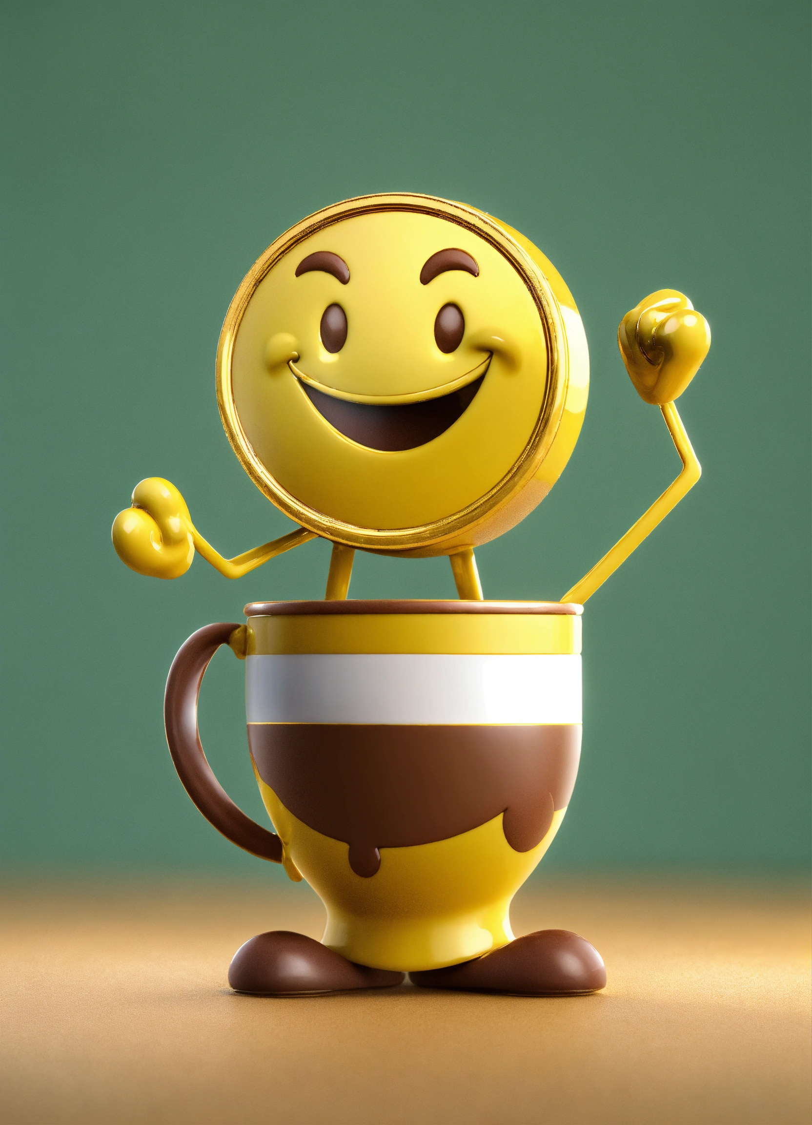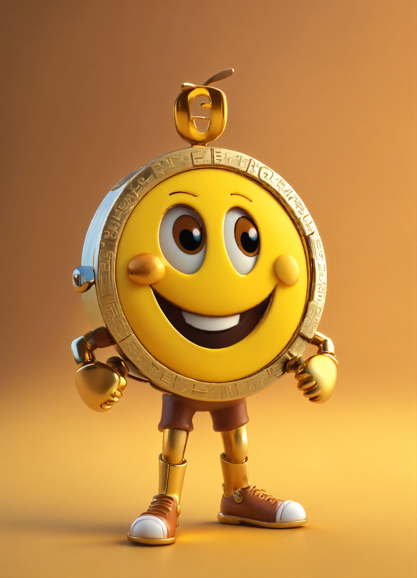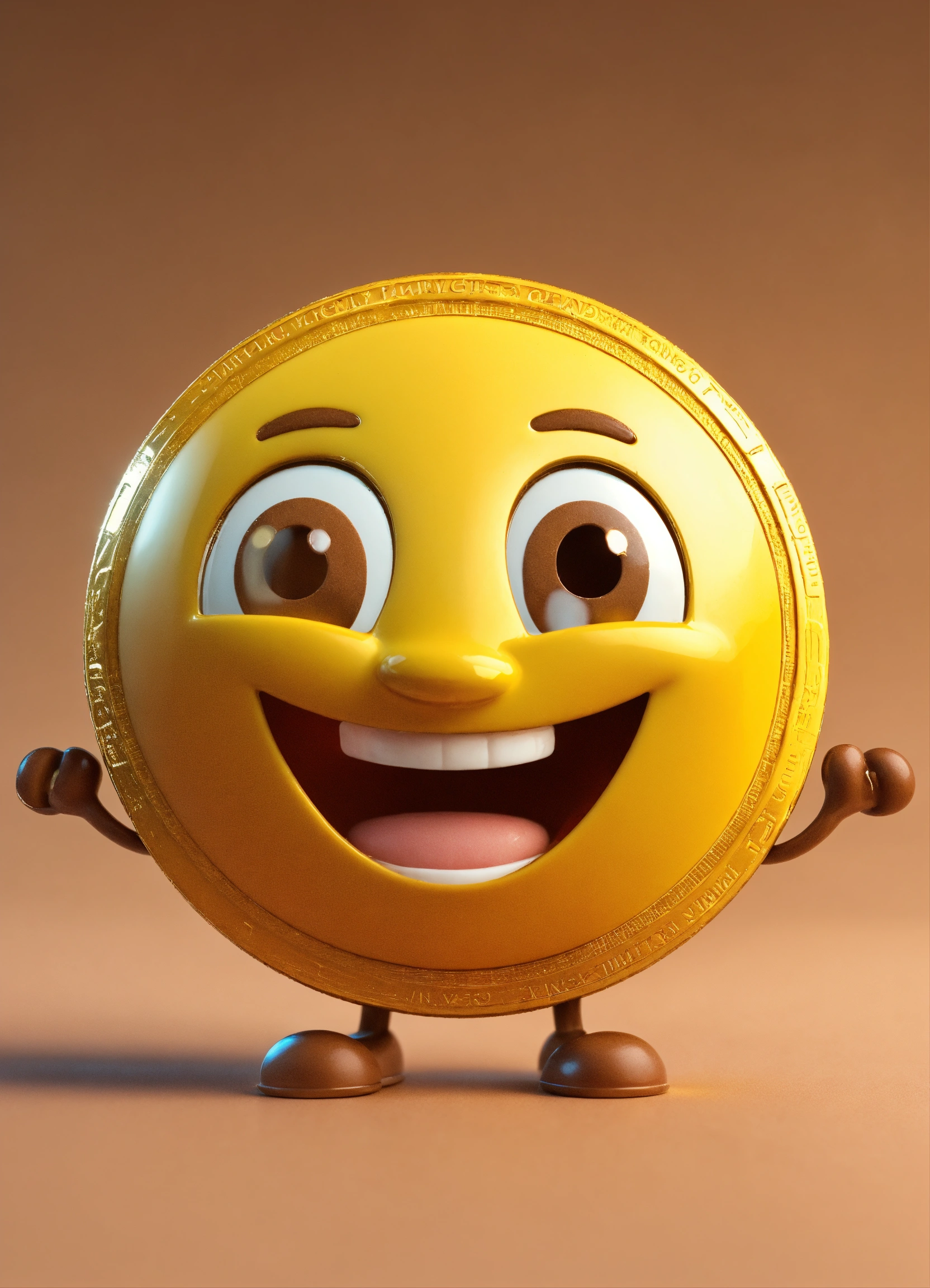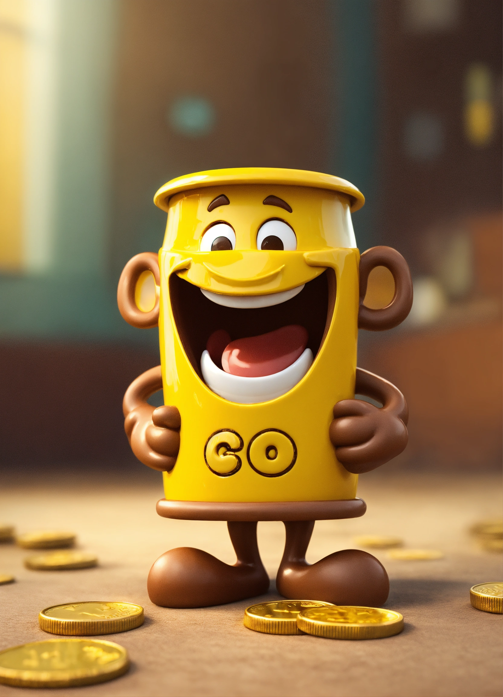 A coin character is a portrait with arms and legs and a smiling face, happy and cute erect yellow and brown name color name is crazycup 3d