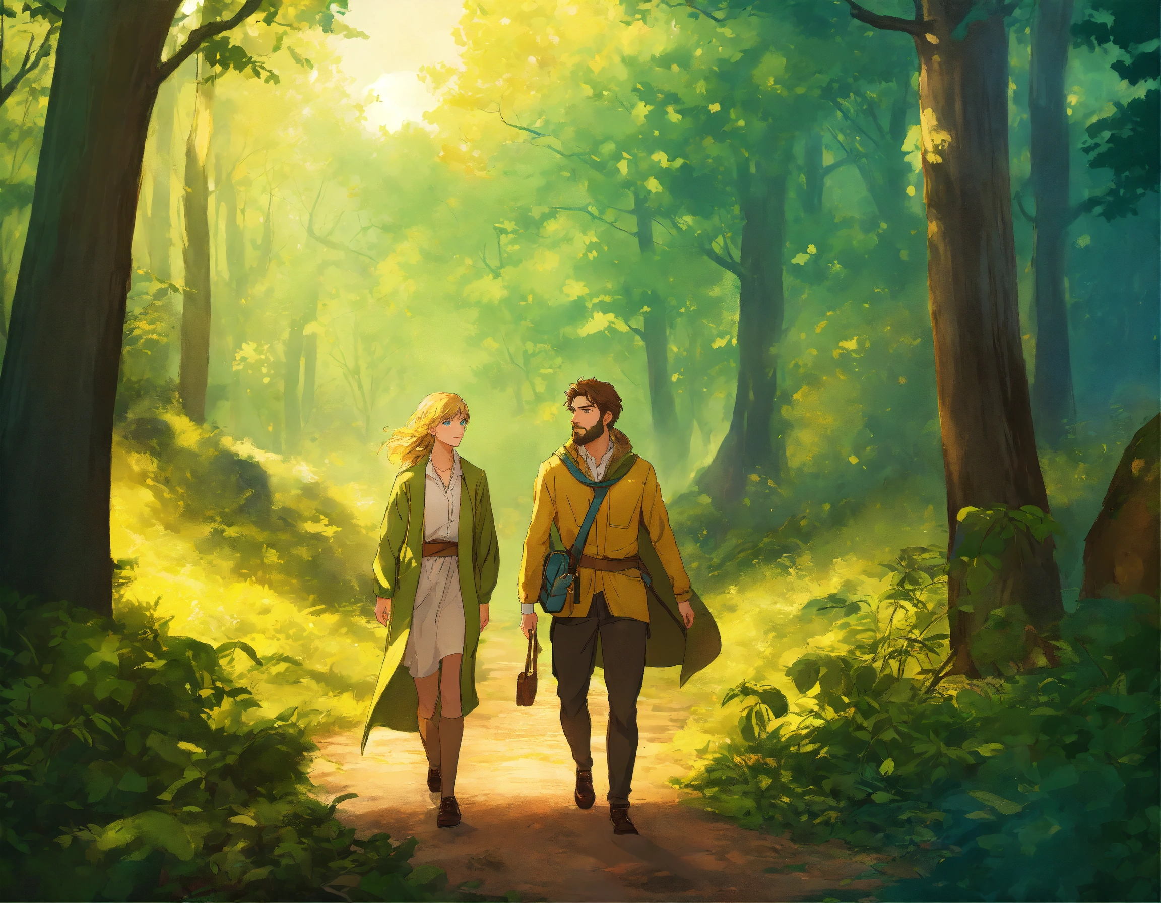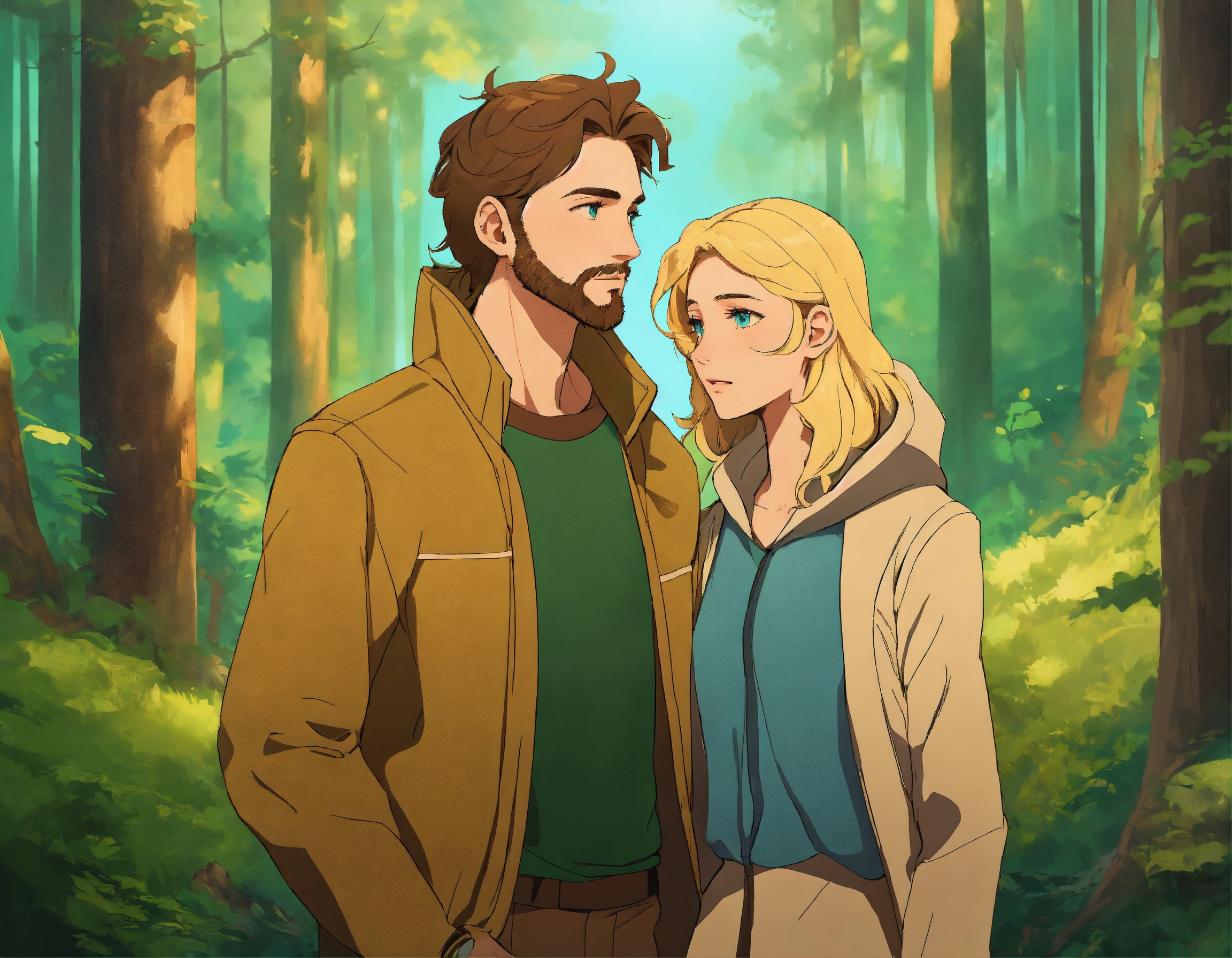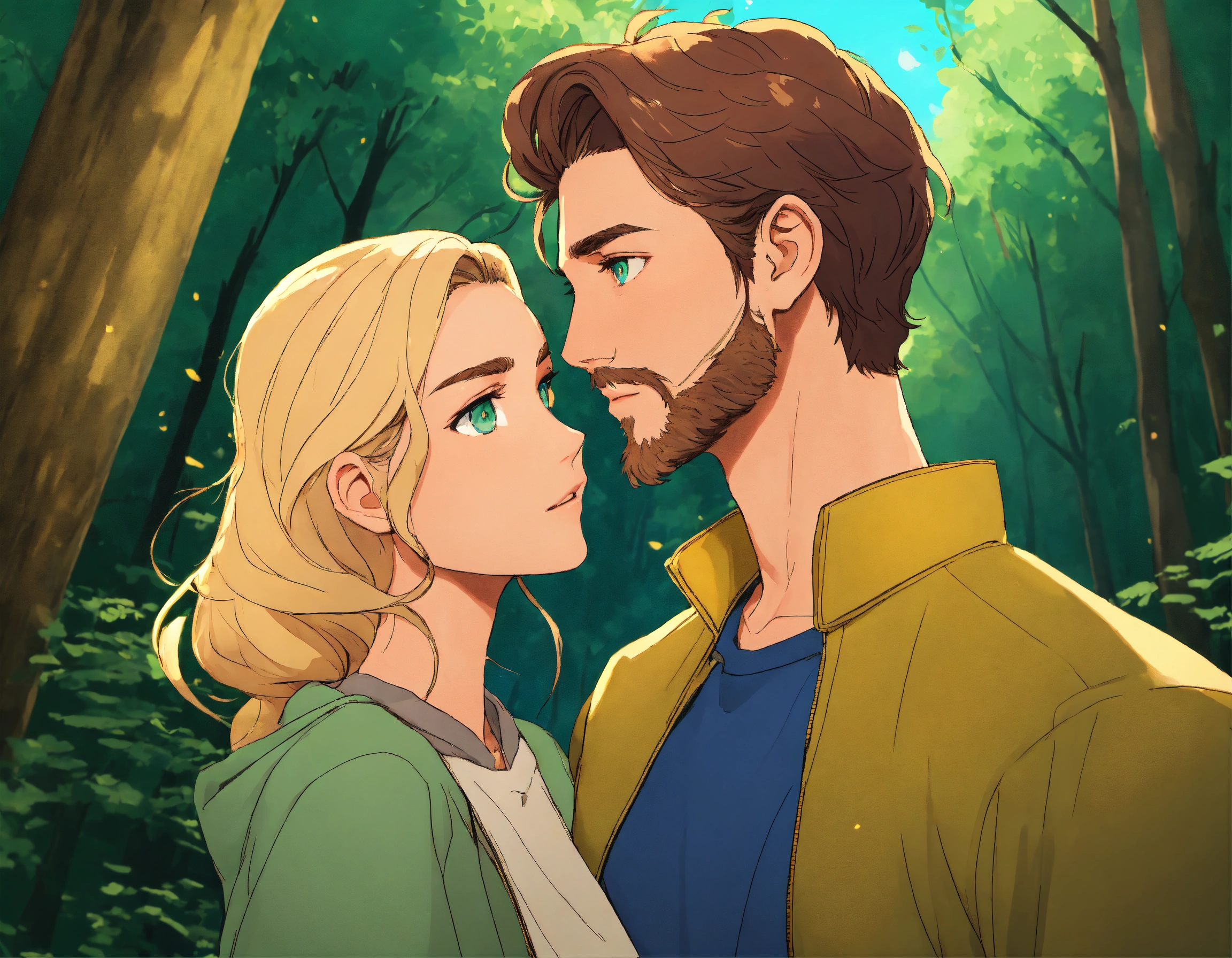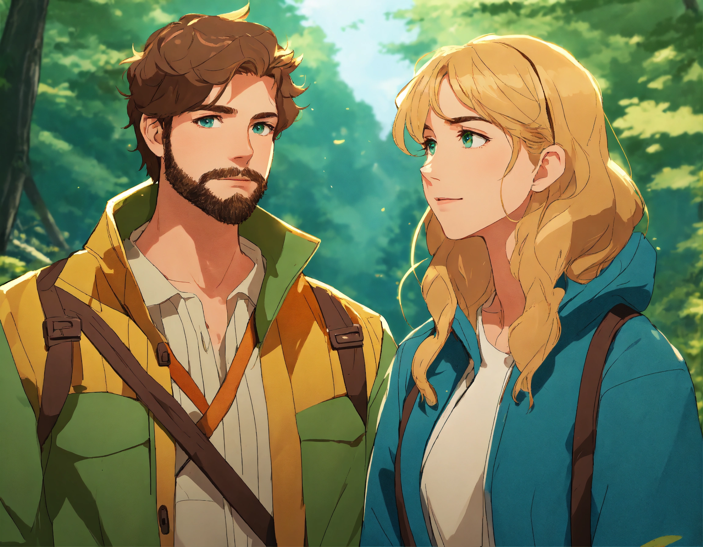 An illustration style where young man with brown hair, light thin brown beard and green eyes, yellow jacket and woman with blonde hair, blue eyes and v shape face, no beard embarks on their journey young man and woman reached to the heart in the forest but a network of traps set by an ancient civilization to protect their secrets . show the whole background view forest and trap set by an ancient civilization