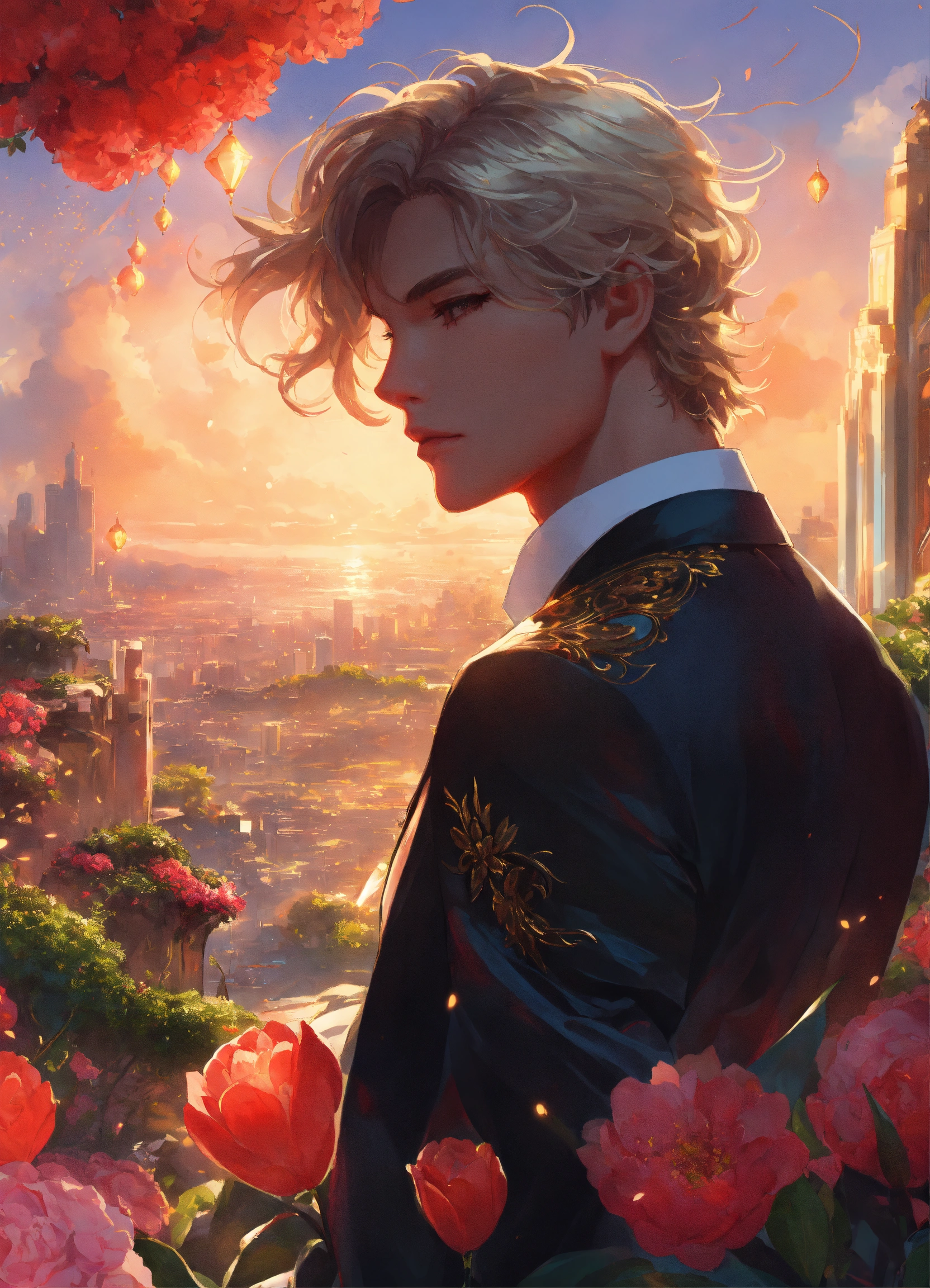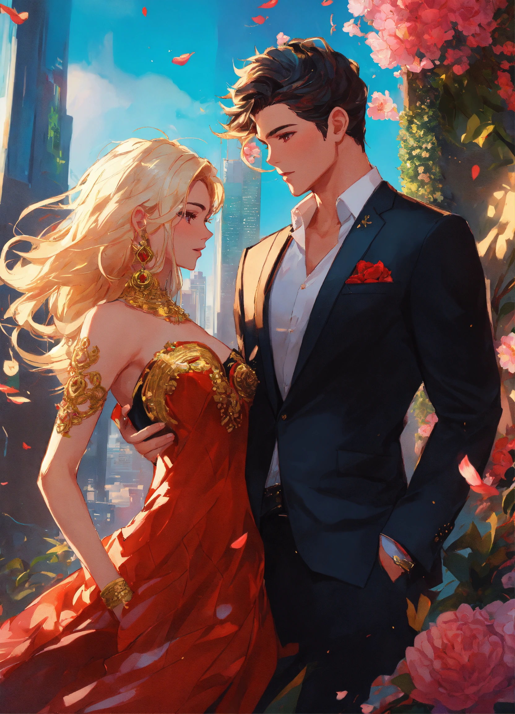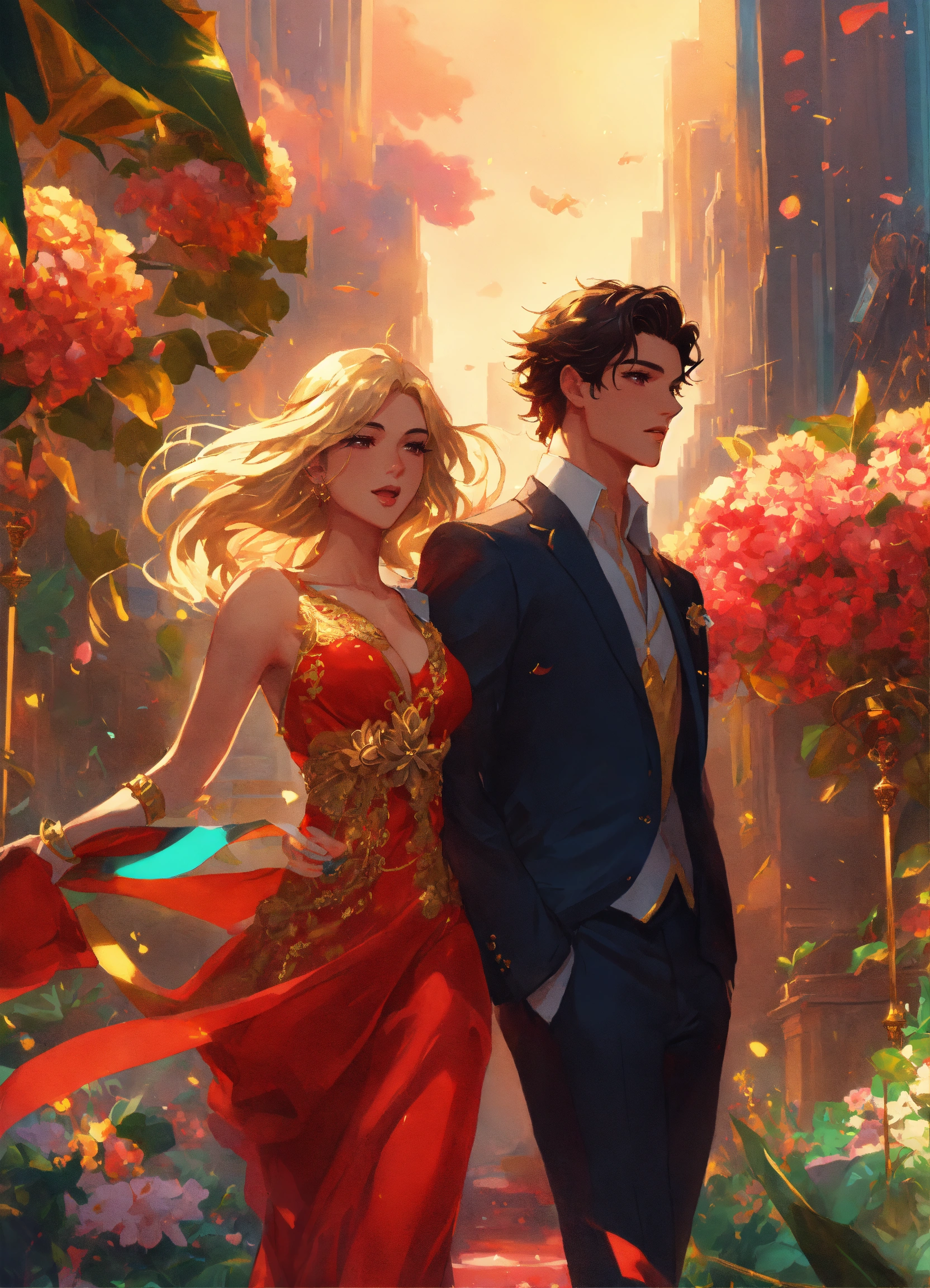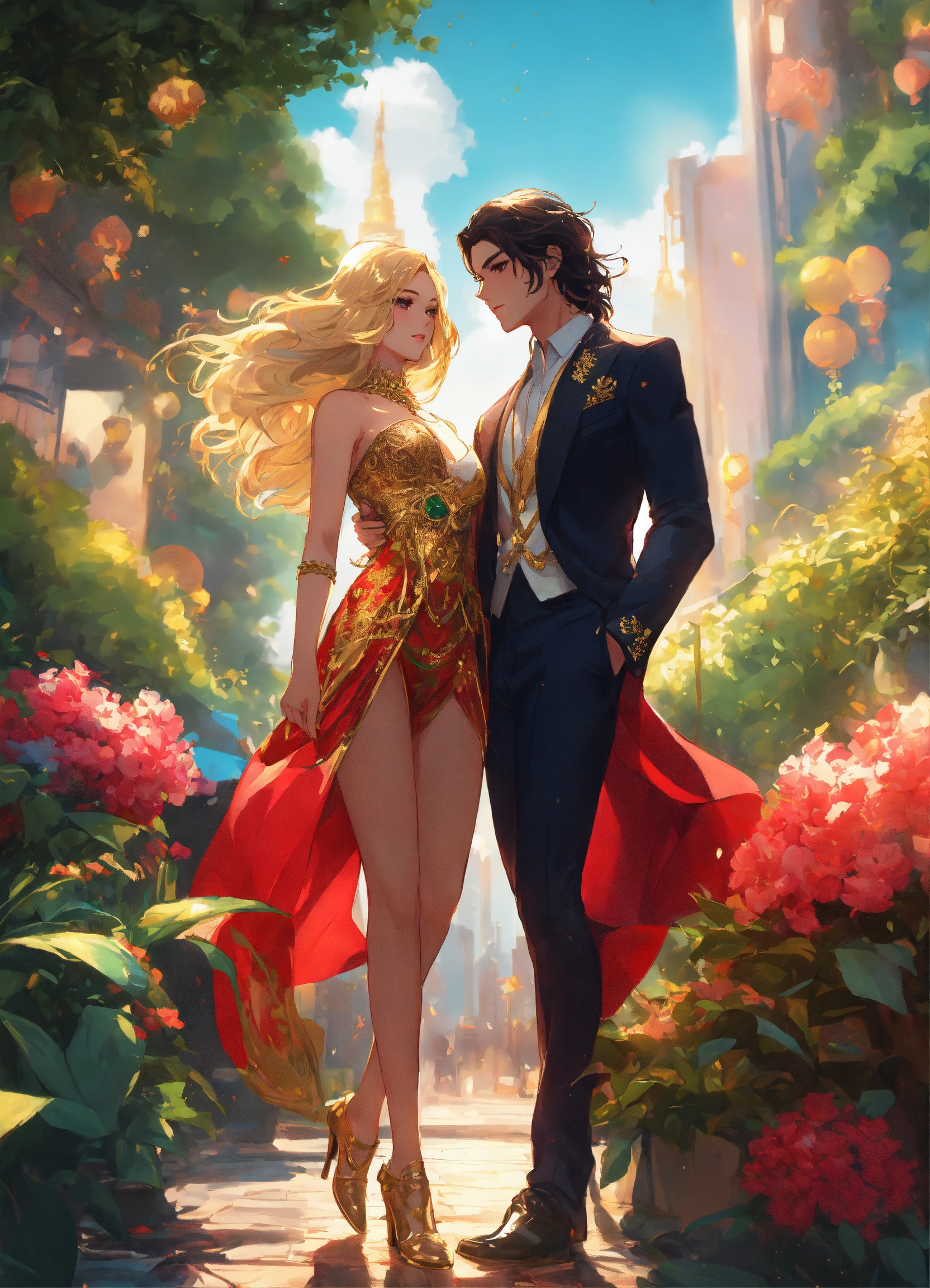 Illustration of beautiful city of towering skyscrapers, islands, vibrant colors, fair skin, the young man wears a intricate black suit with gold ornaments, has wavy black tousled hair, the golden haired woman wears a red intricate dress with gold adornments that shows legs, maximalist, 8k photo, animestyle, by artgerm, by rossdraws, trending on artstation, garden, windy, flowers