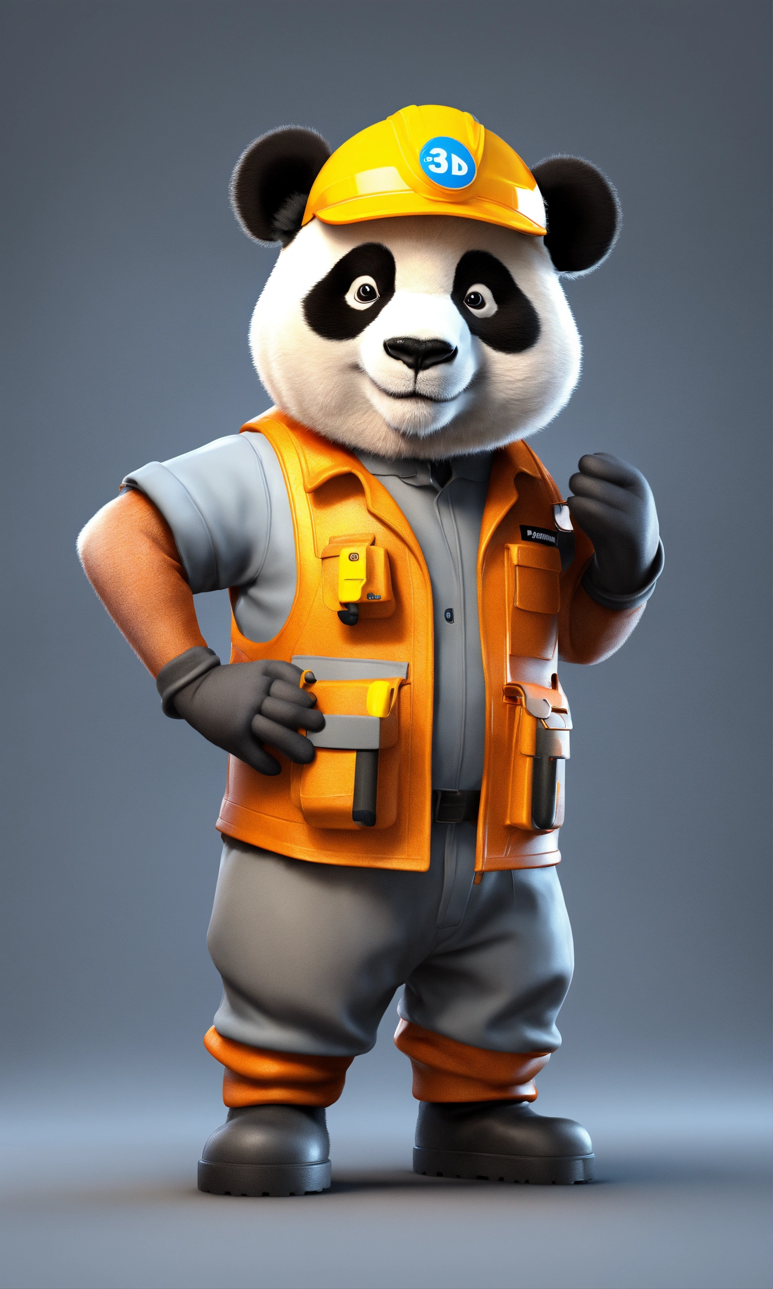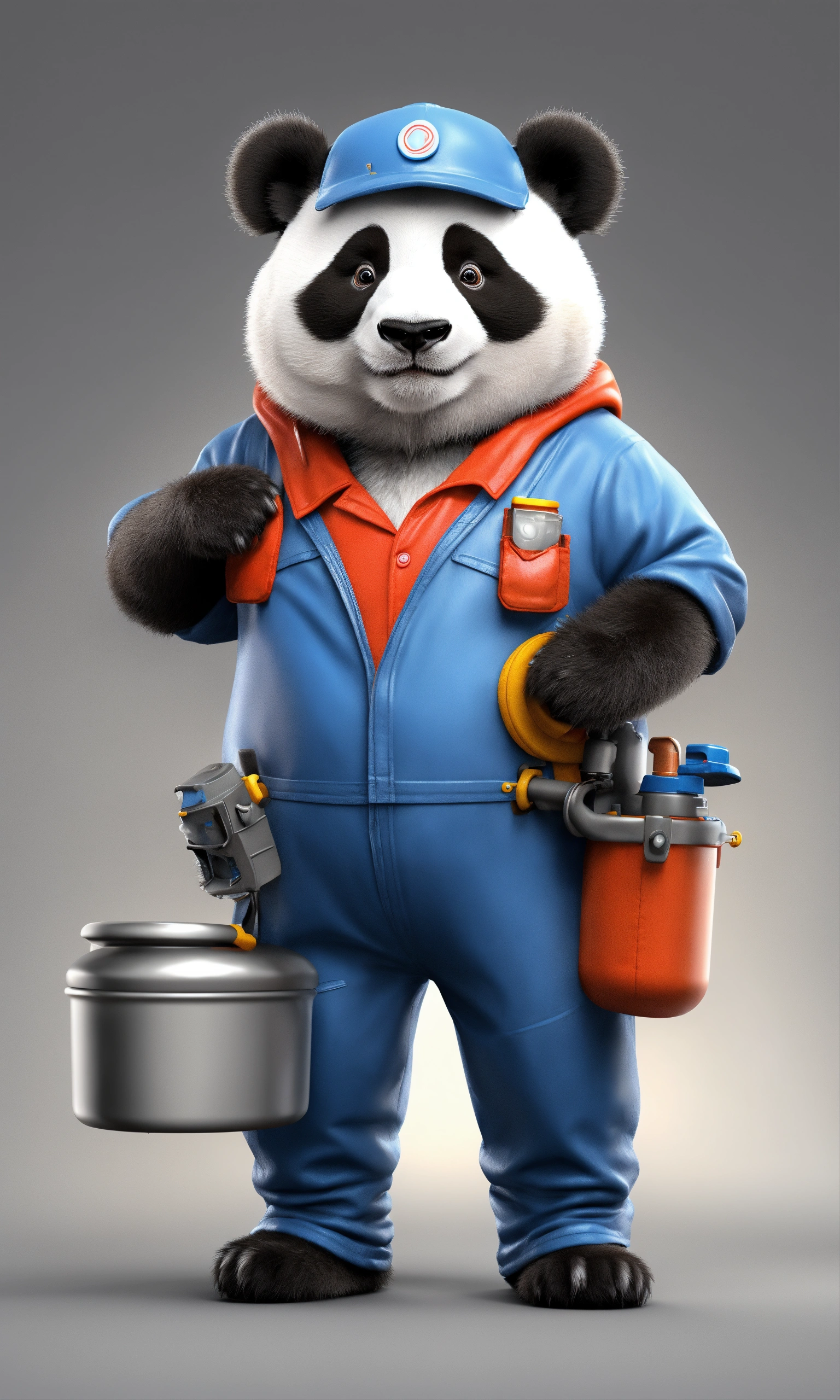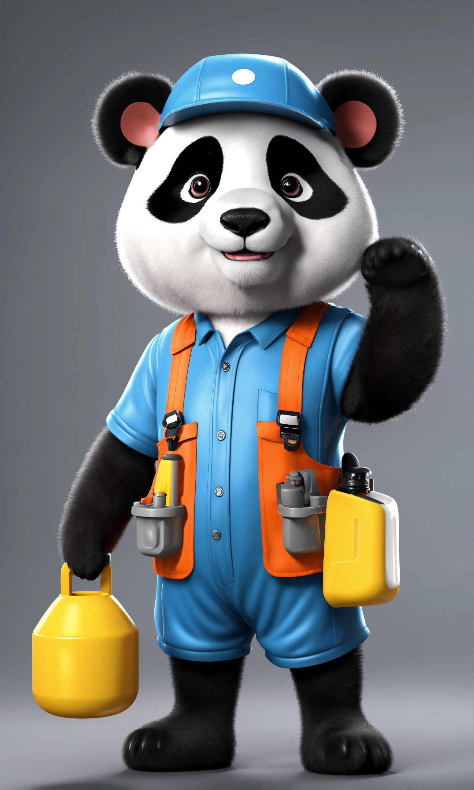 Very high detailed, ultra realistic, character, 3d illustration, grey background, panda in plumber costume