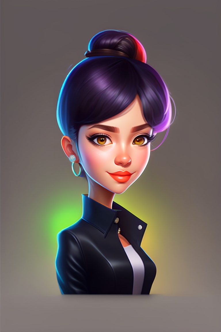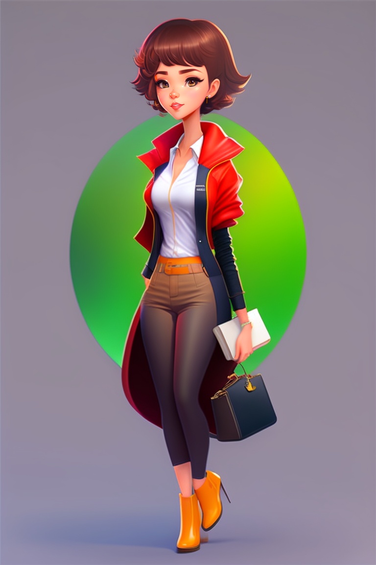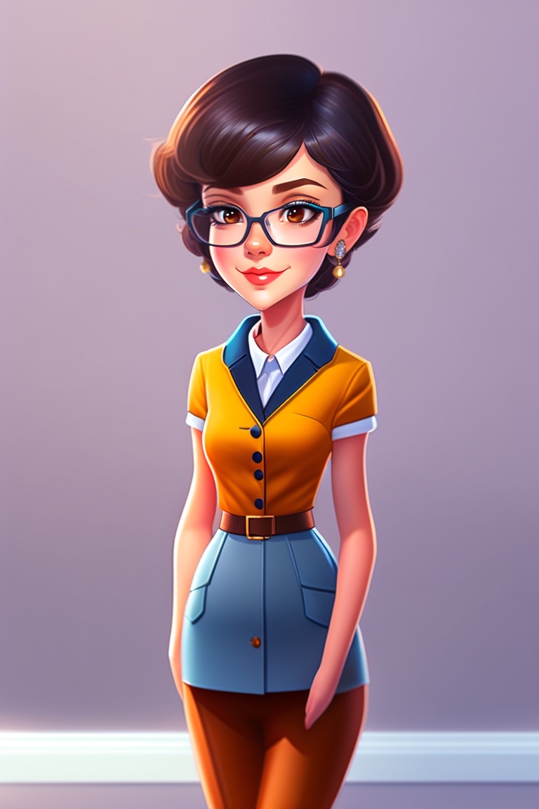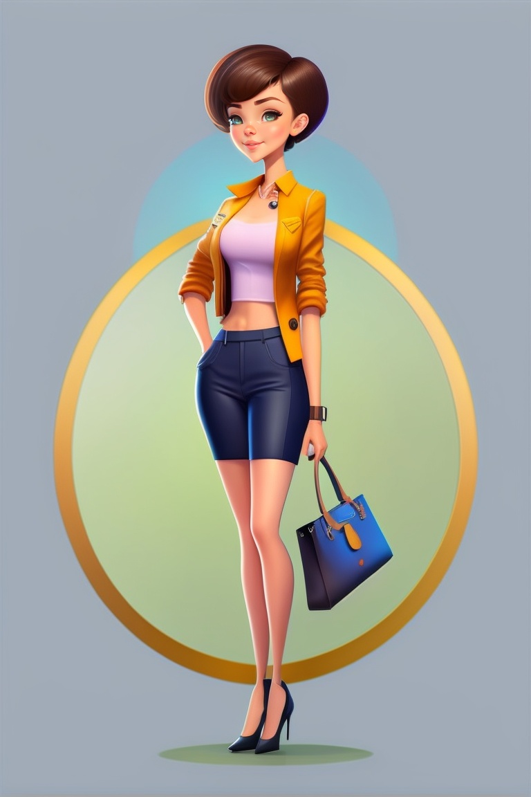 The cartoon character is a beautiful female, short hair, straight face, full body image, educated, modern, active, passionate, interested, knowledgeable, ethical, determined