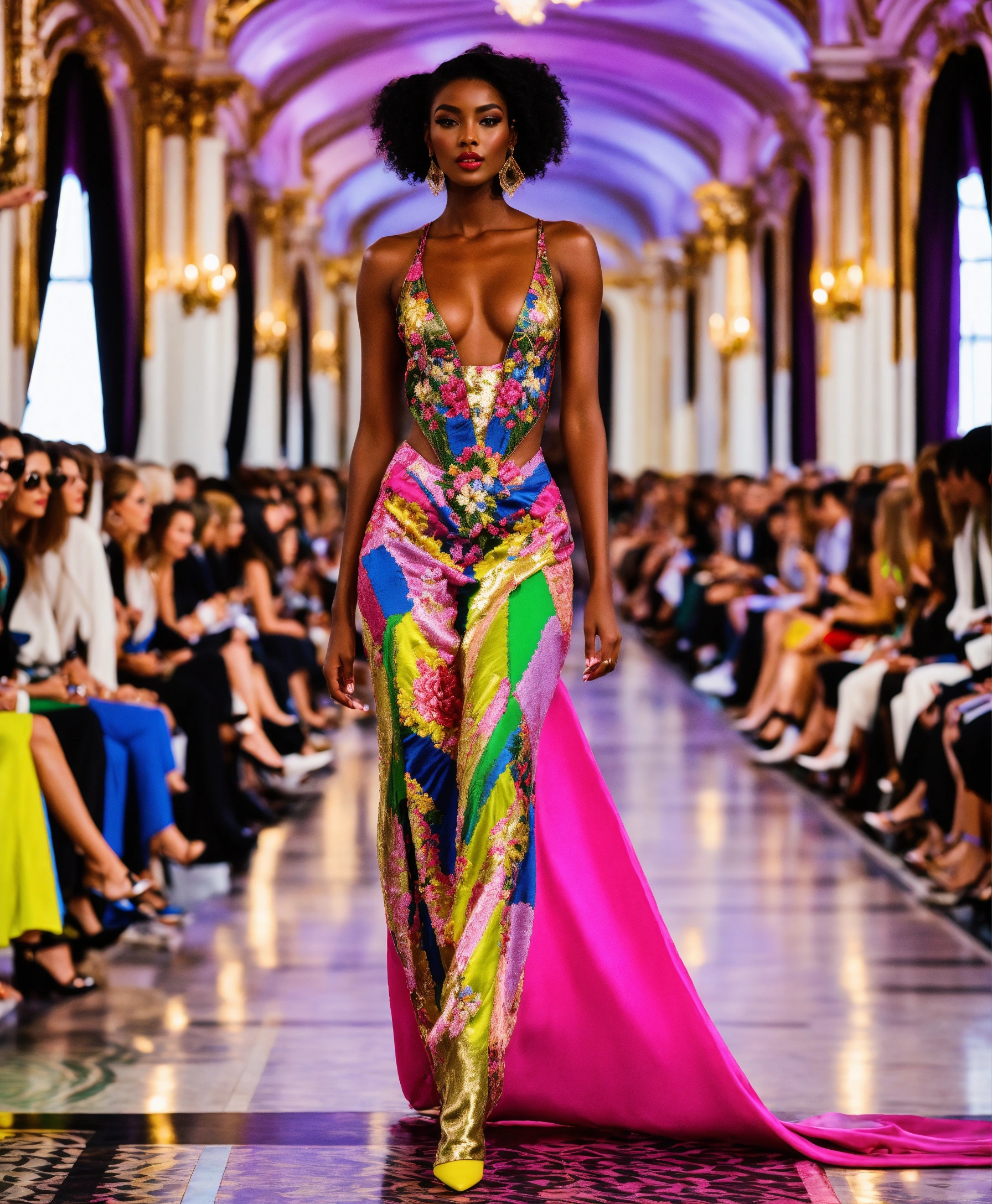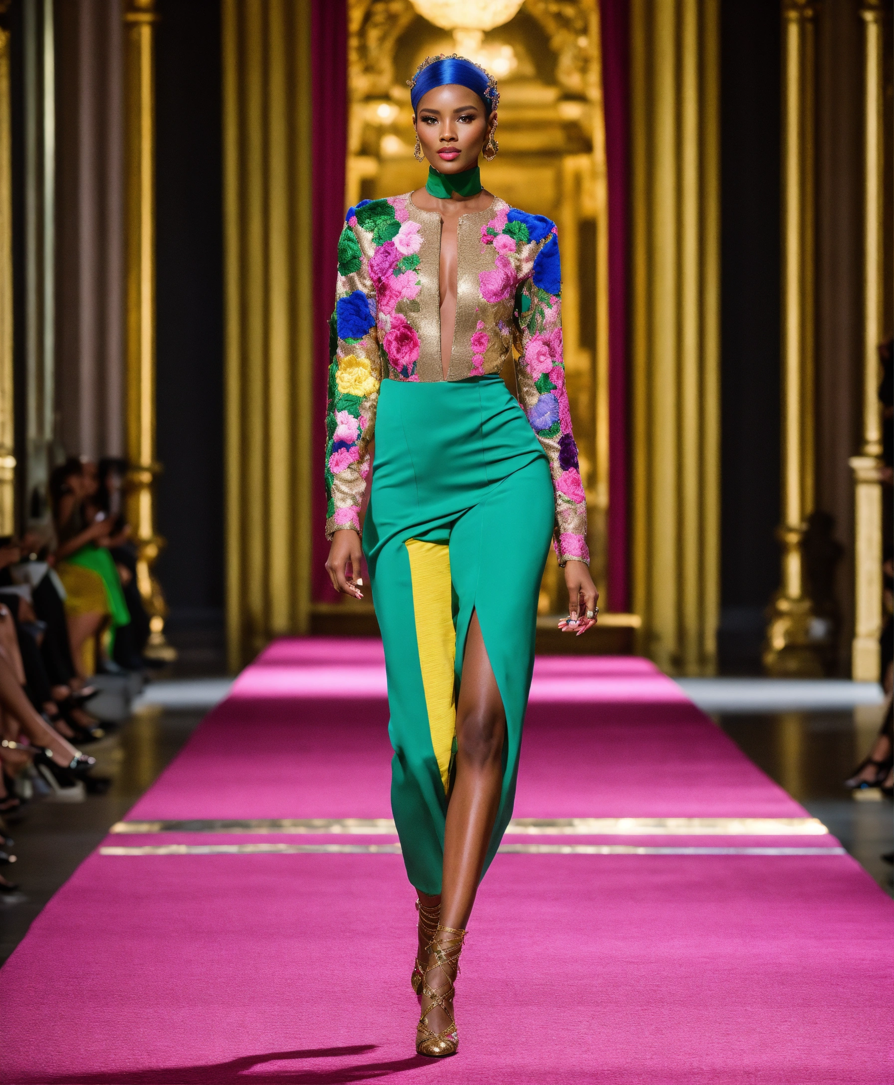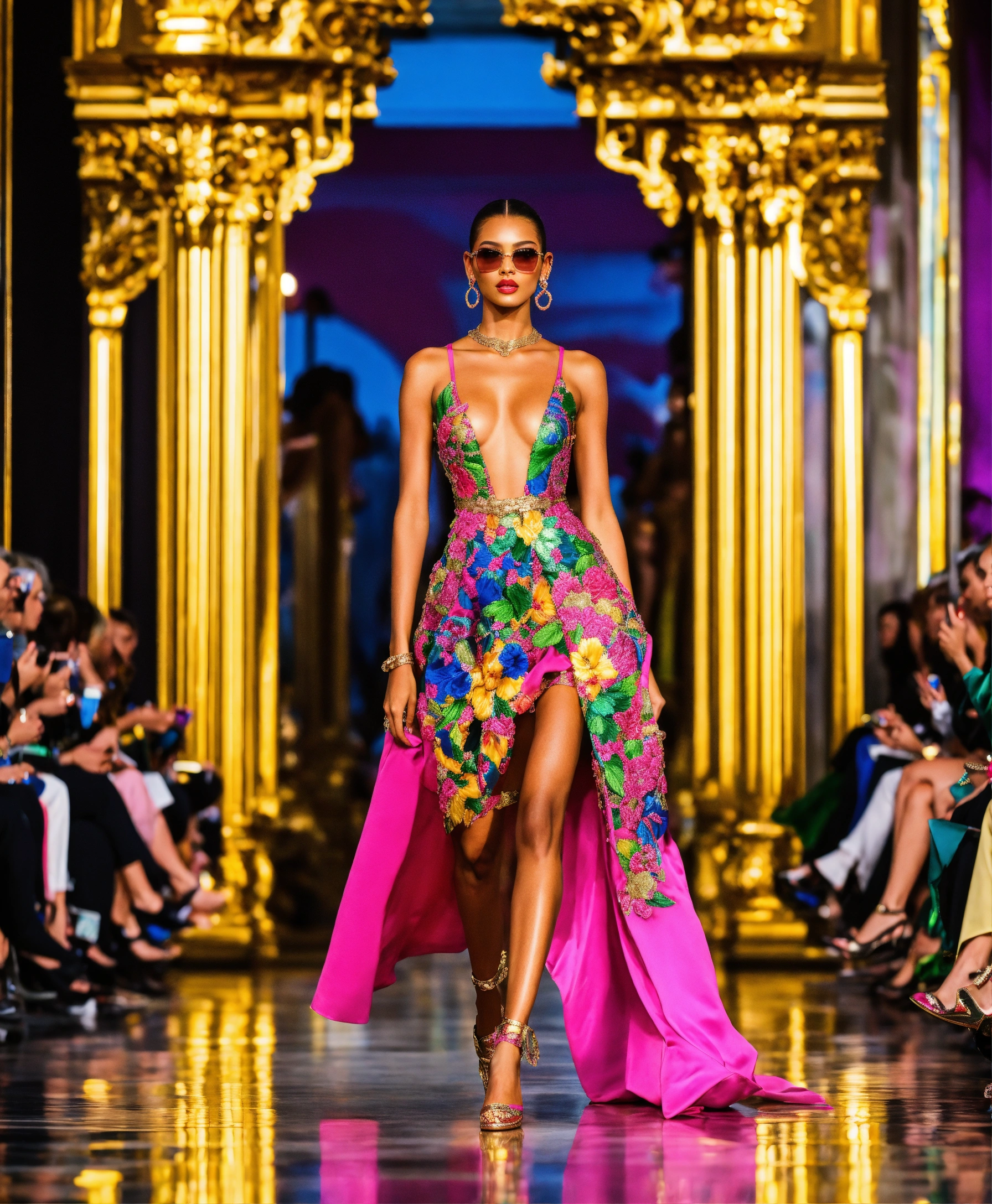 Ultra realistic full body photo of a stylish beautiful model walking the runway modeling summer cruise brave, paris versailles details cutouts and gold geometric pattern floral sportswear pink gold green lilac peridot silver magenta lime fuchsia yellow blue black gray copper mauve bronze haute couture embroidered contrasting colors vivid intricate bold vibrant glamorous ultimate elegance beautiful luxurious awesome wealthy opulent exquisite resplendent magnificent sublime 12k