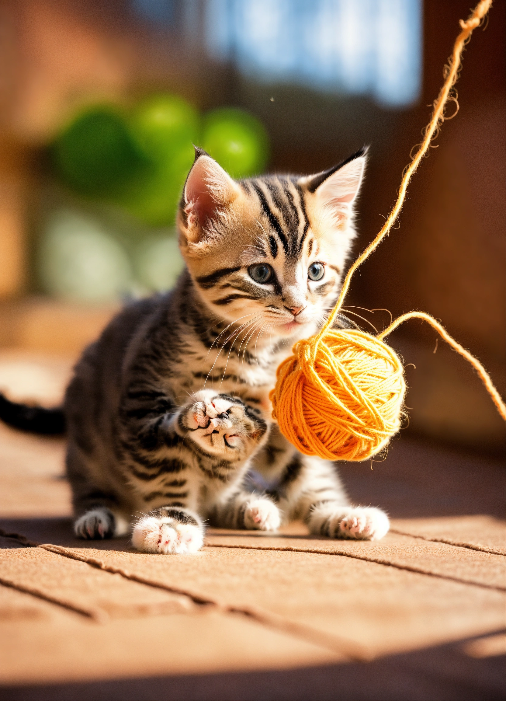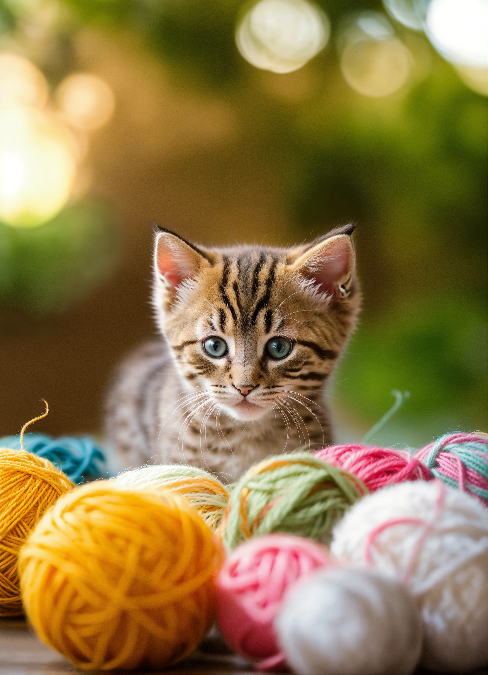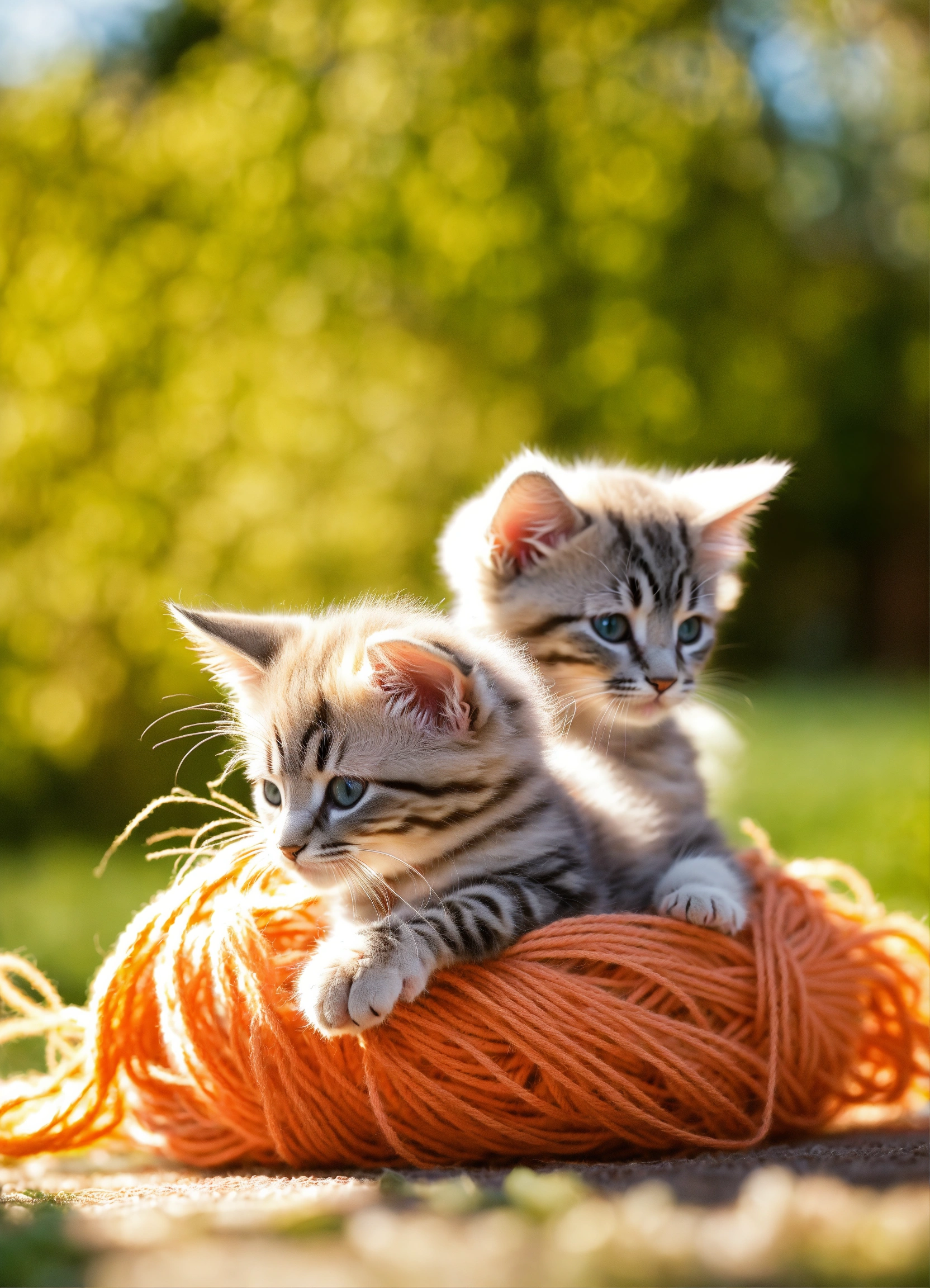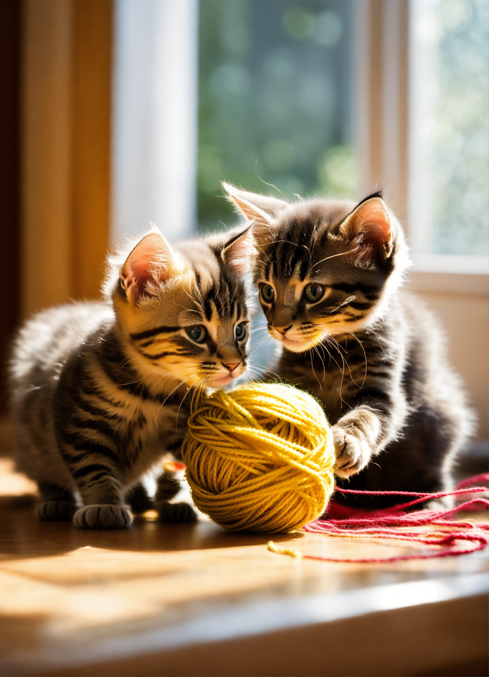 Playful scene of kittens playing with yarn capture the adorable playfulness of kittens as they engage with a ball of yarn. utilize natural light, fast shutter speed, and burst mode to freeze their cute movements. shot with a dslr camera, using a telephoto lens, f/4, and continuous autofocus. --ar 32 --v 5 --q 1