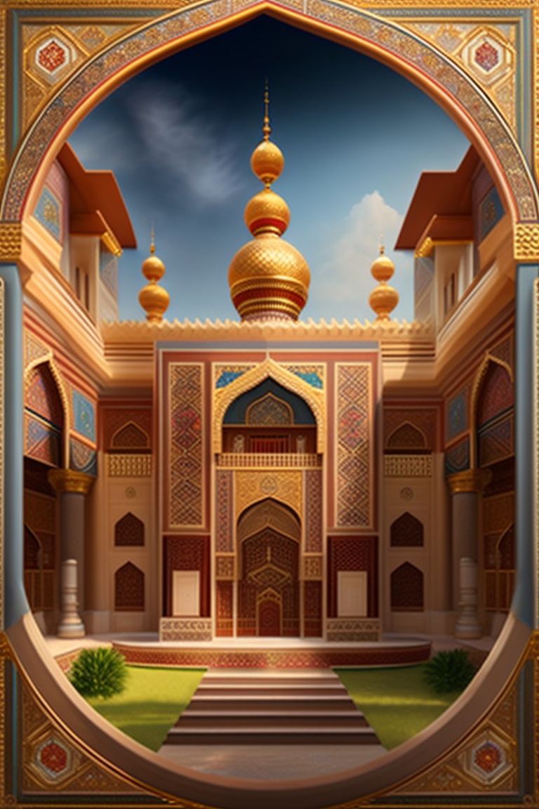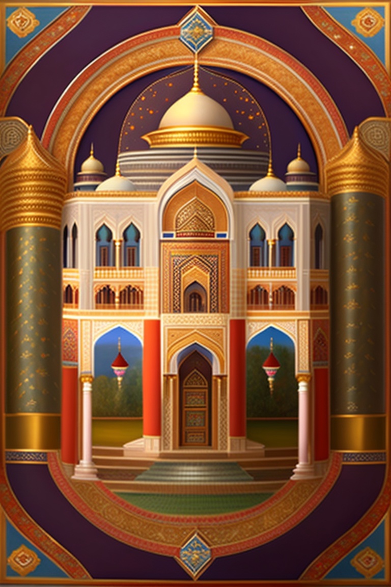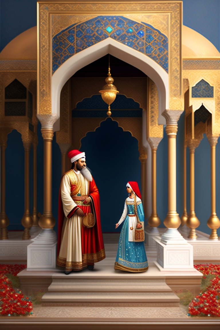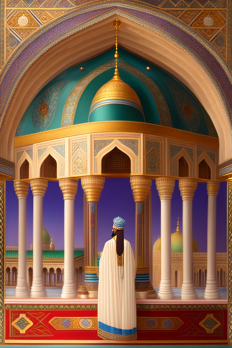 Subject: prophet yusuf, zulaikha, and the magnificent palace. object: prophet yusuf entering the palace, zulaikha captivated, and the backdrop of the opulent palace. location: lavish palace adorned with decorations. the enchanting handsomeness of prophet yusuf
