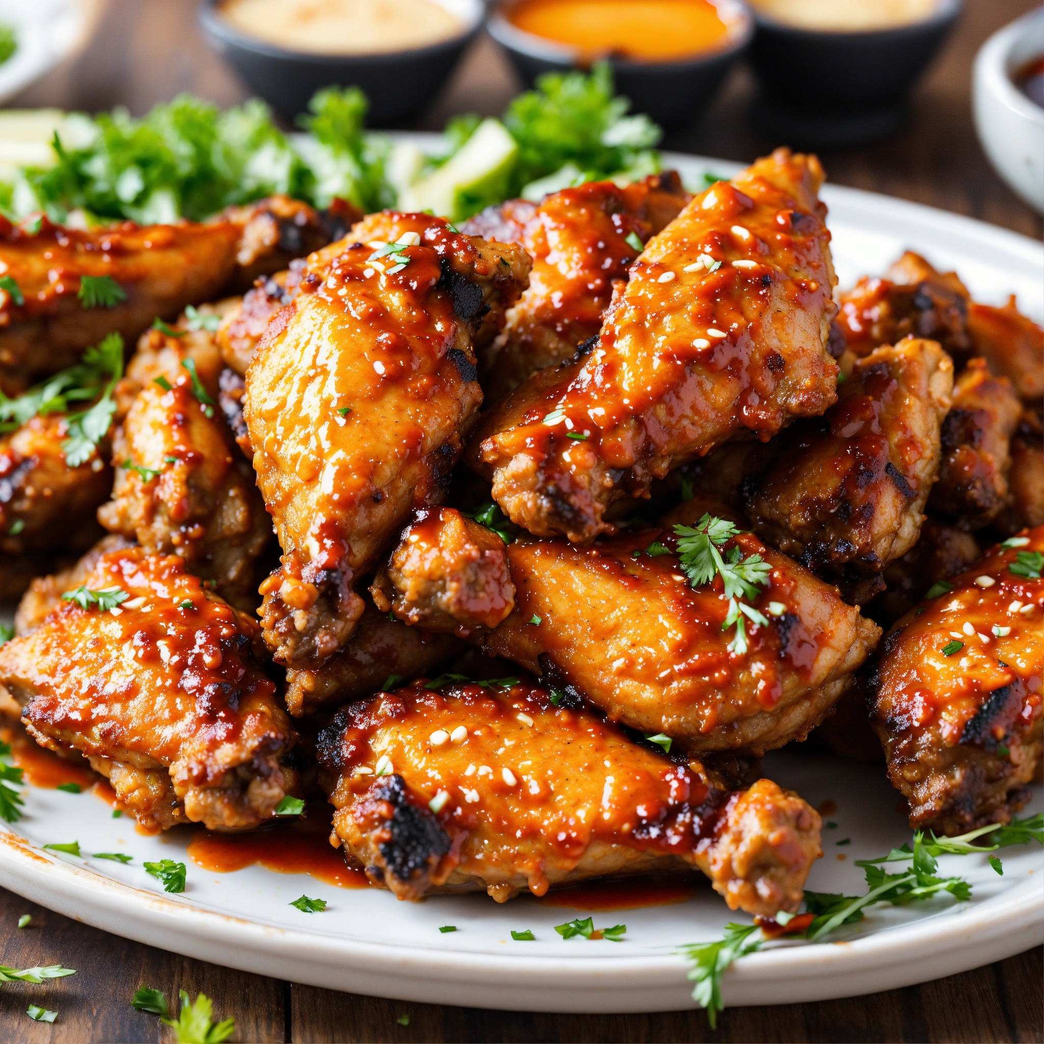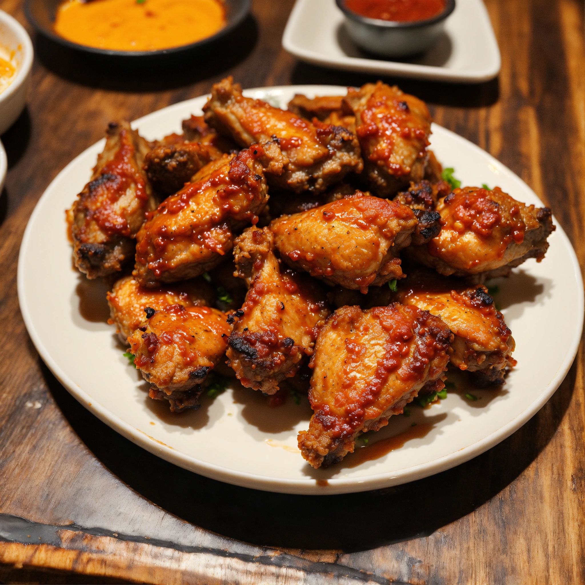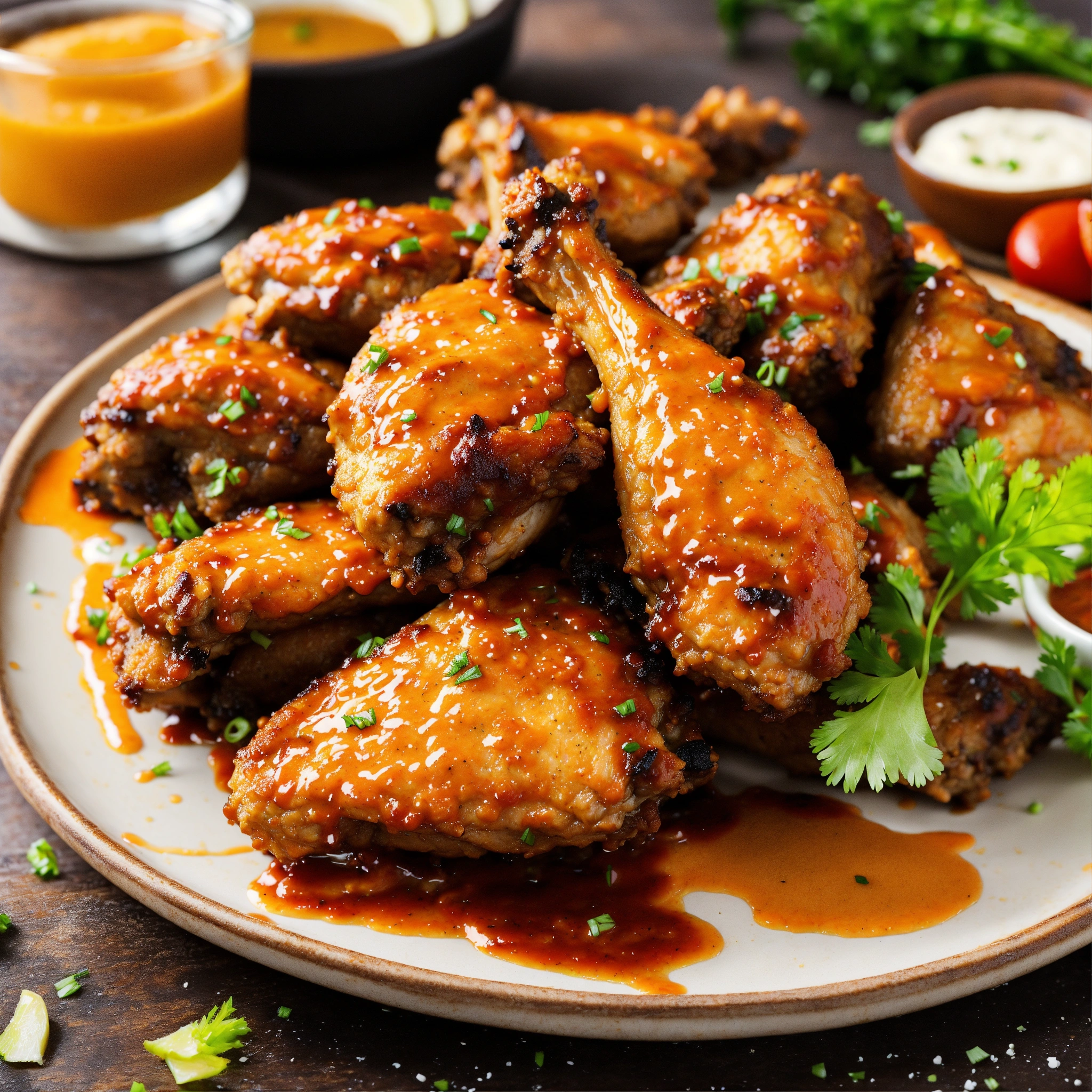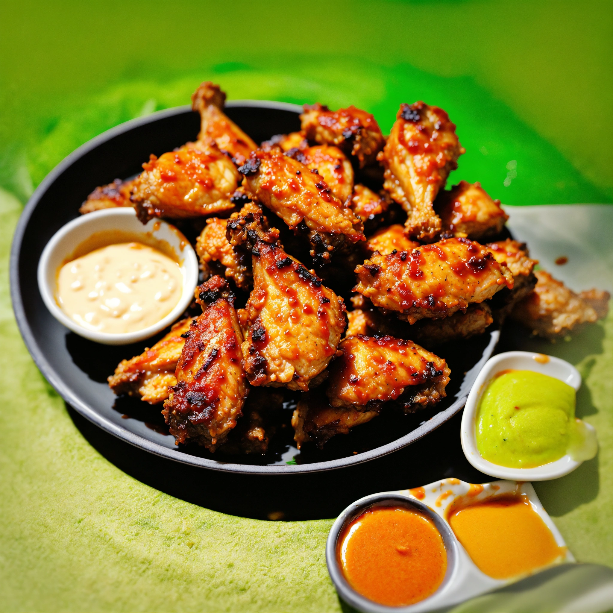 A photo of a plate of chicken wings. the wings are crispy and golden brown, and they are served with a variety of sauces.