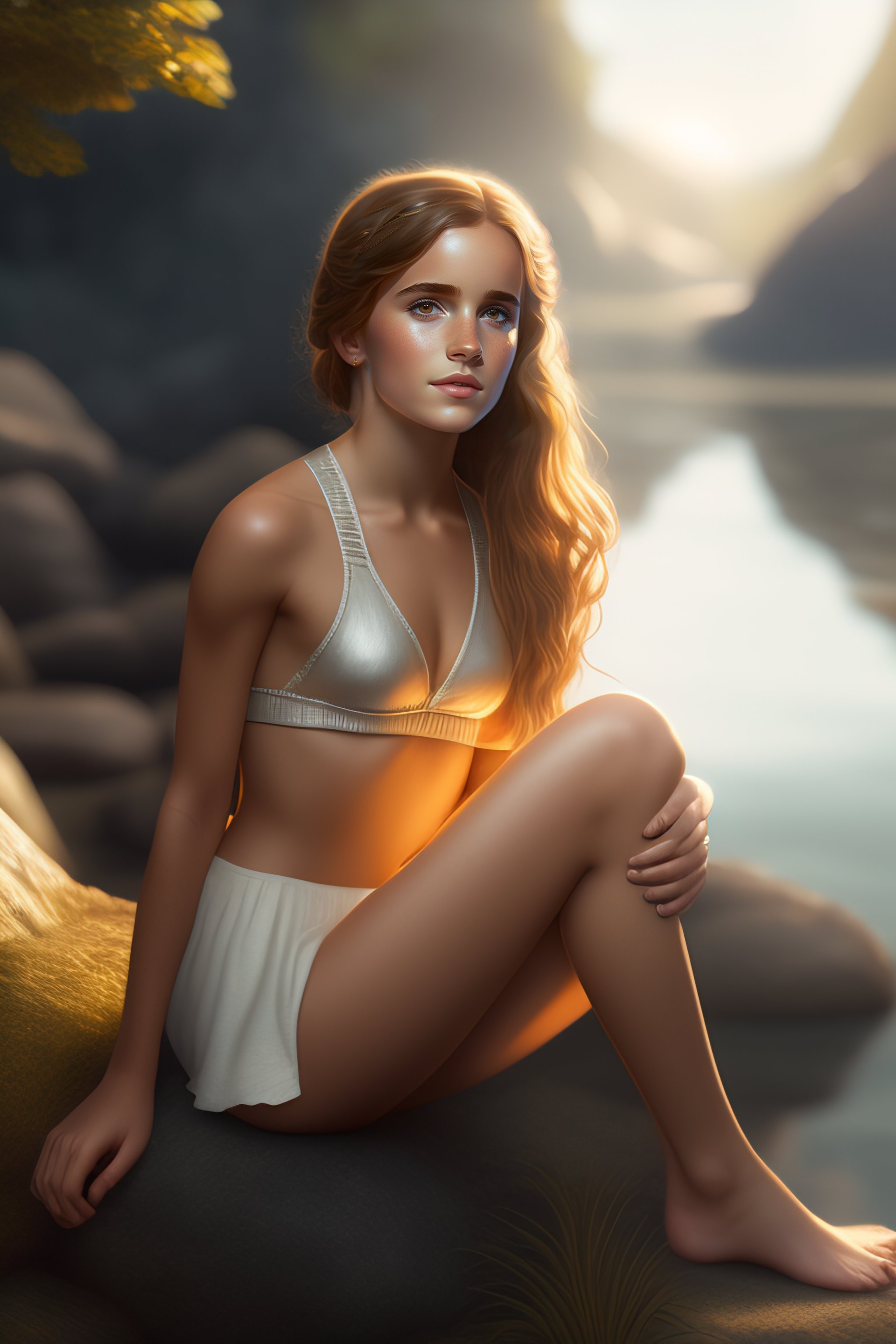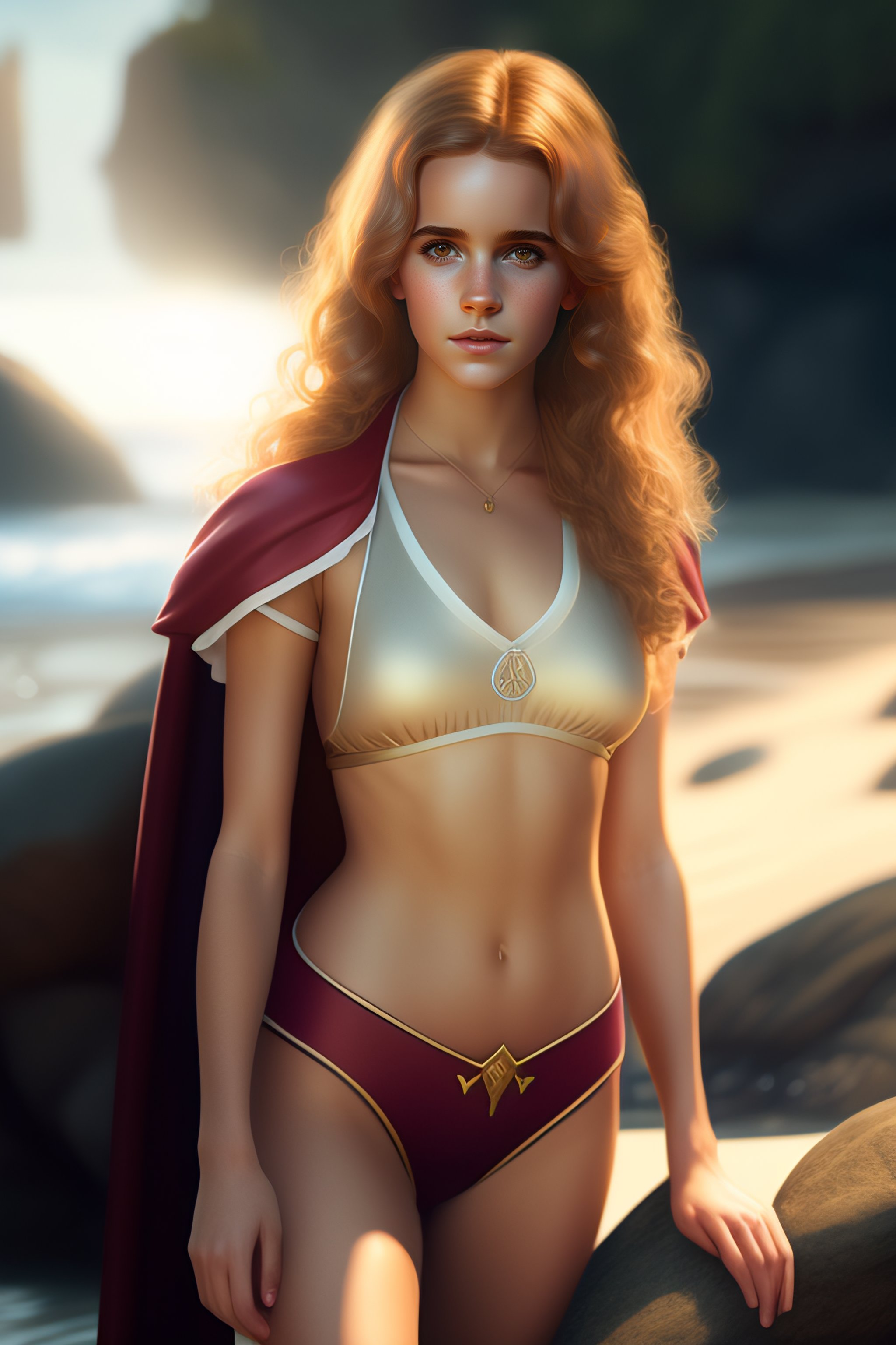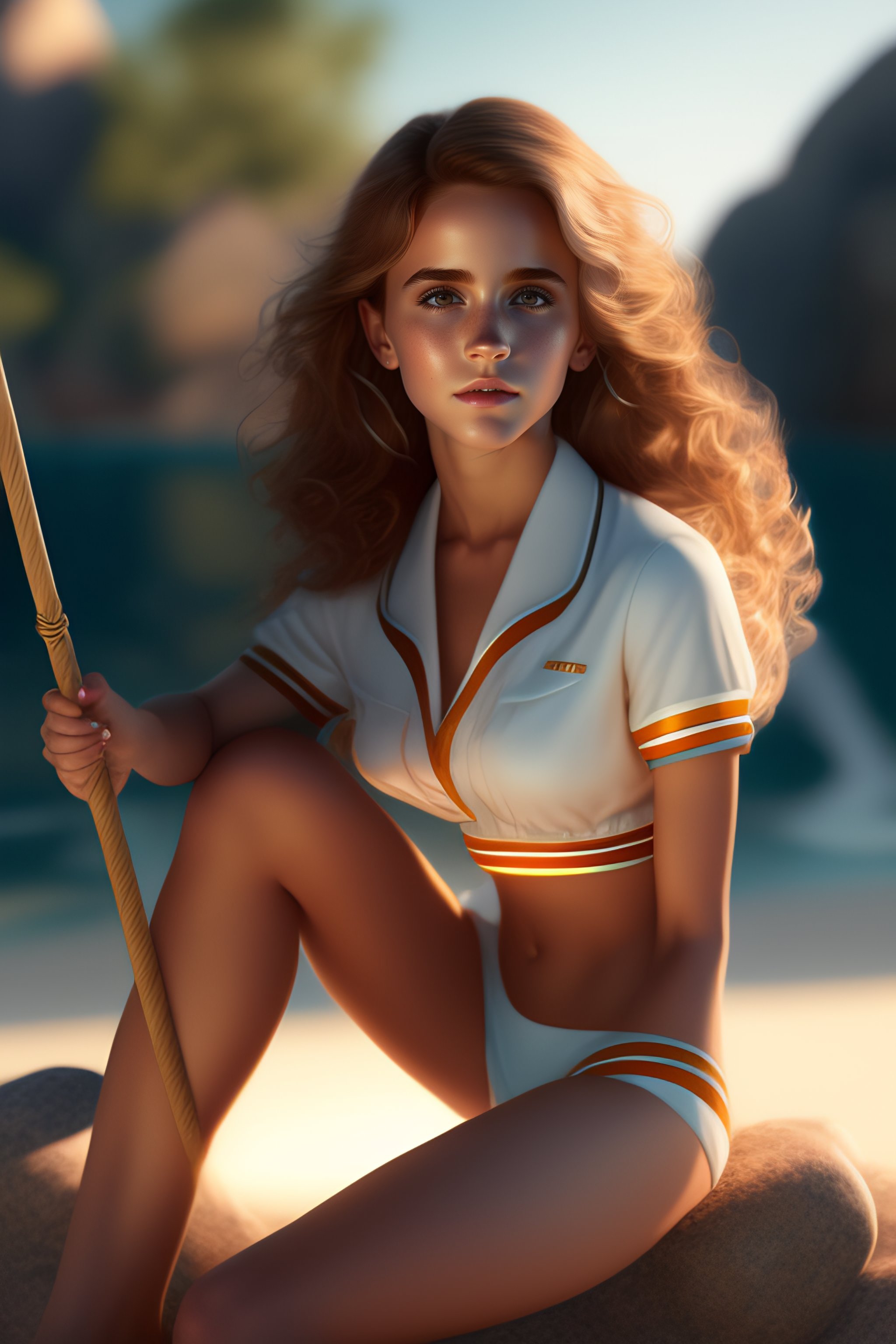 Mini bikini, sitting on a stick, full length, legs, feet, young emma watson as hermione granger, anatomy, bathed in light, highly detailed, photorealistic, artstation, smooth, sharp focus, illustration, unreal engine 5, 8 k, art by artgerm and greg rutkowski and edgar maxence