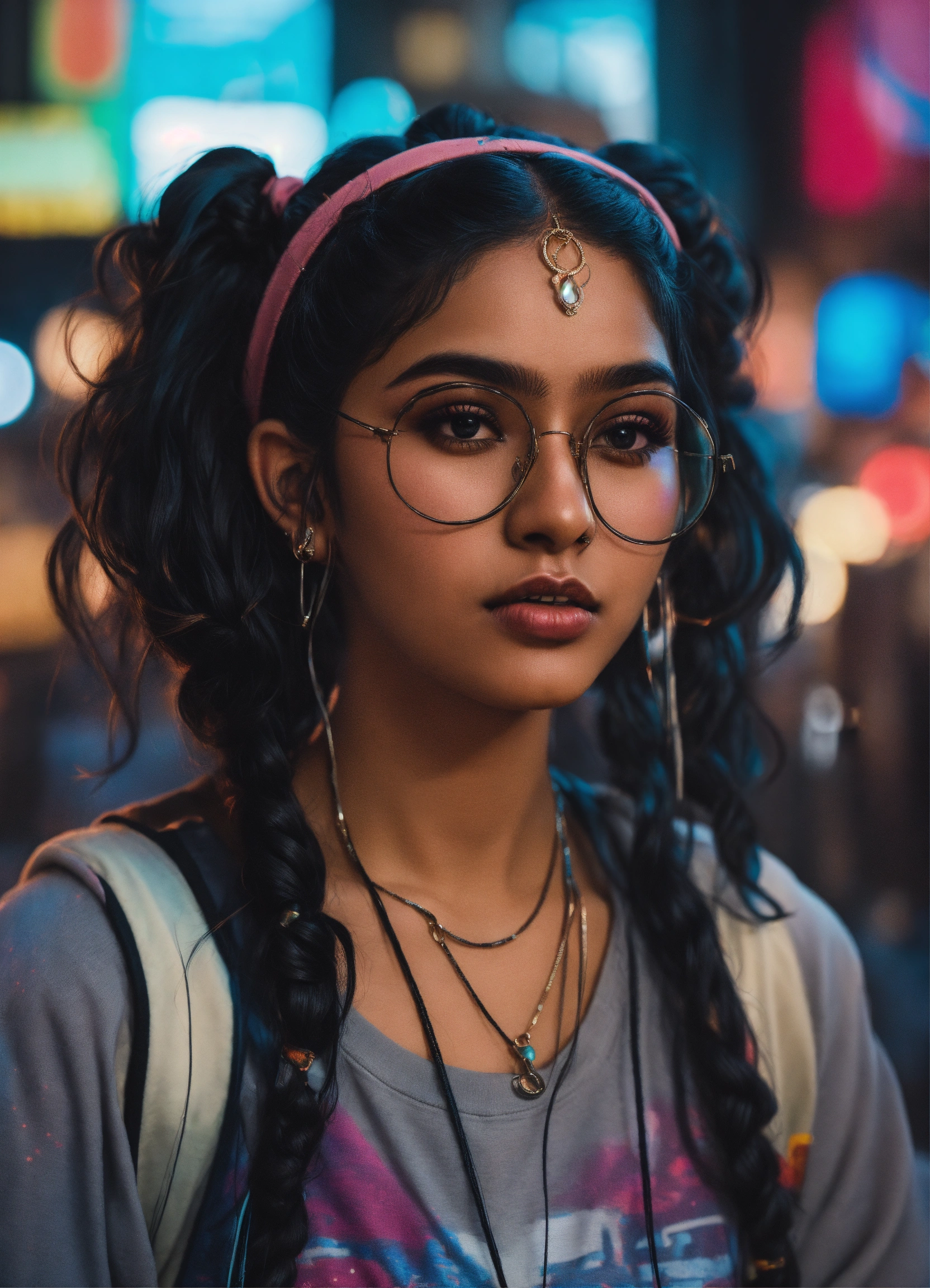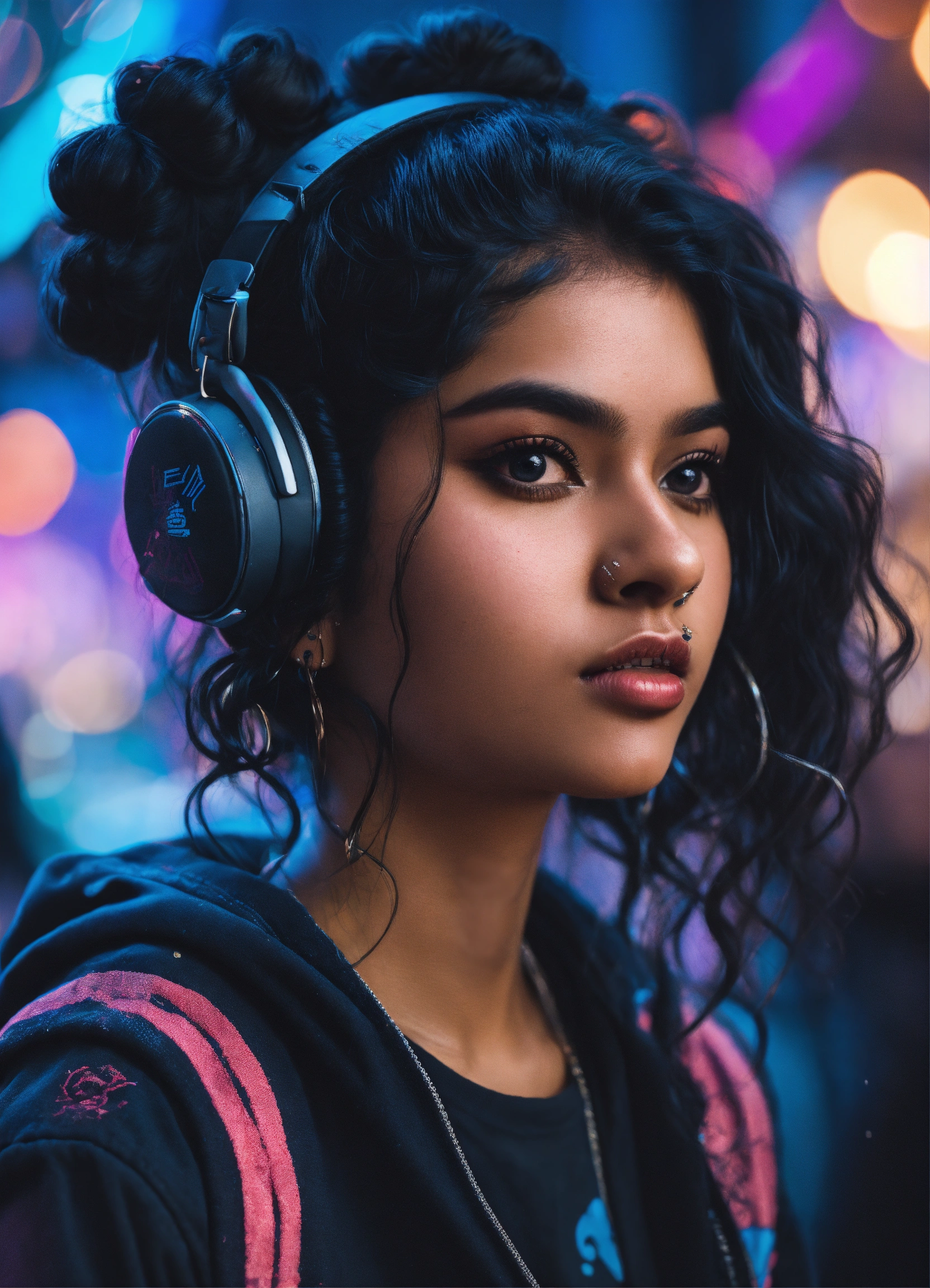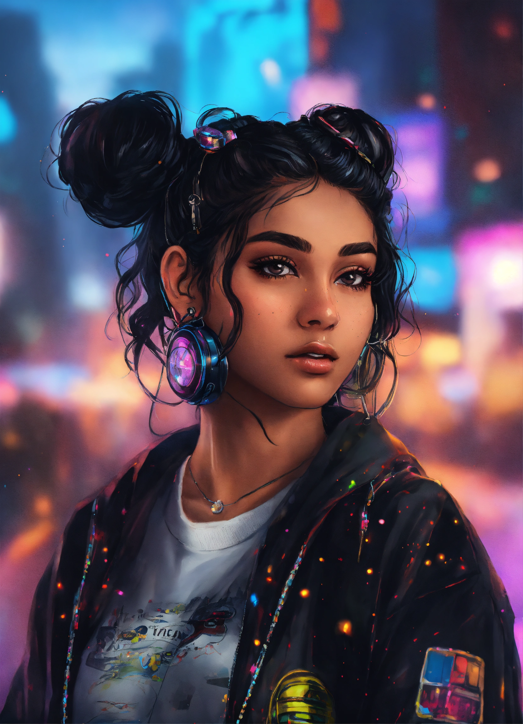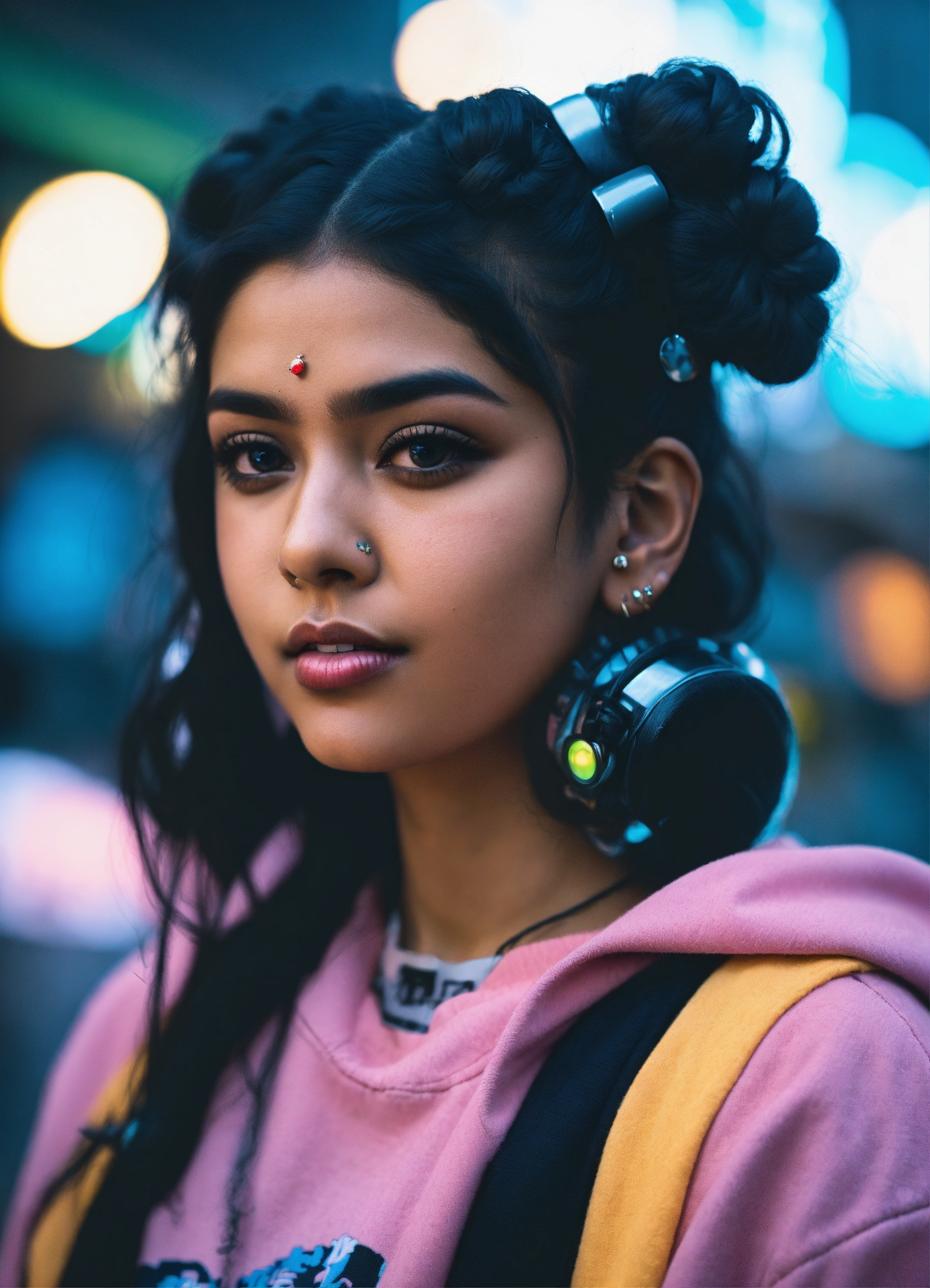 Highly detailed portrait of indian 21 year old woman, wavy black hair space buns, cyberpunk, wearing streetwear, cartoon realism, black, grunge aesthetic!!! bokeh