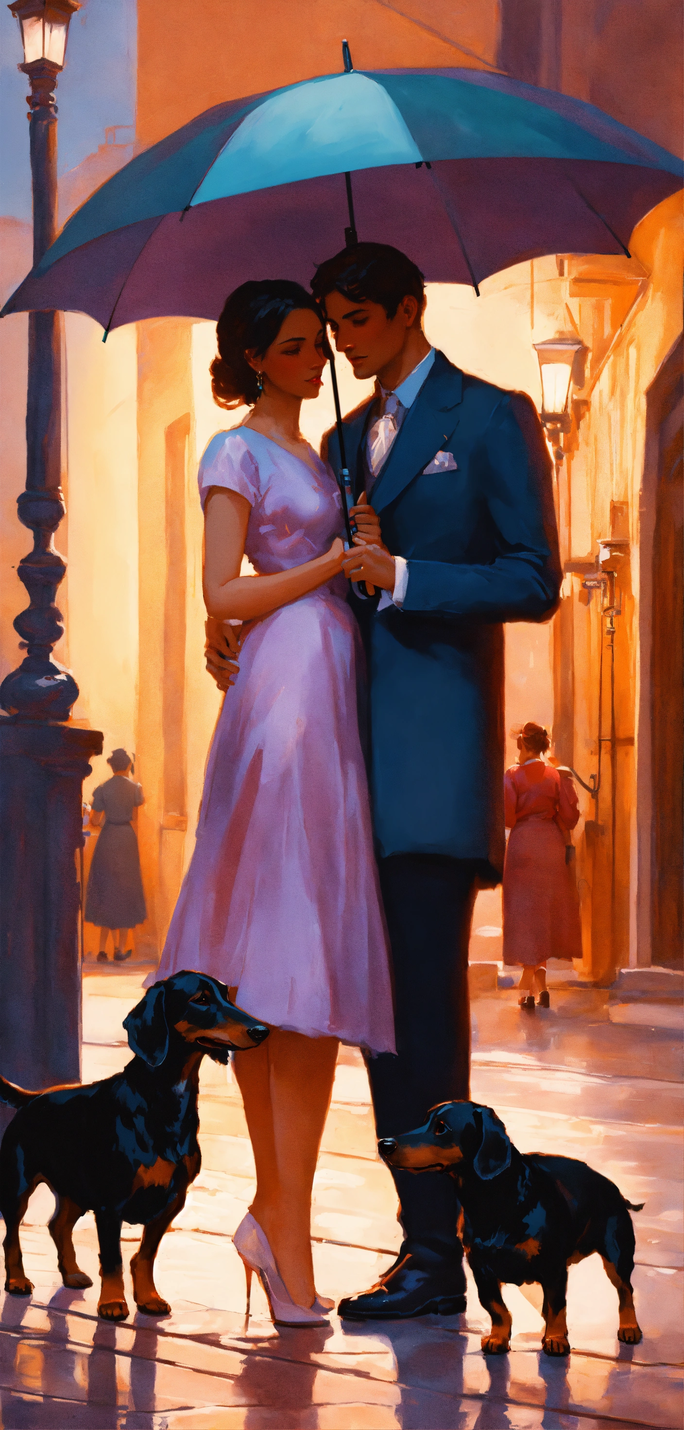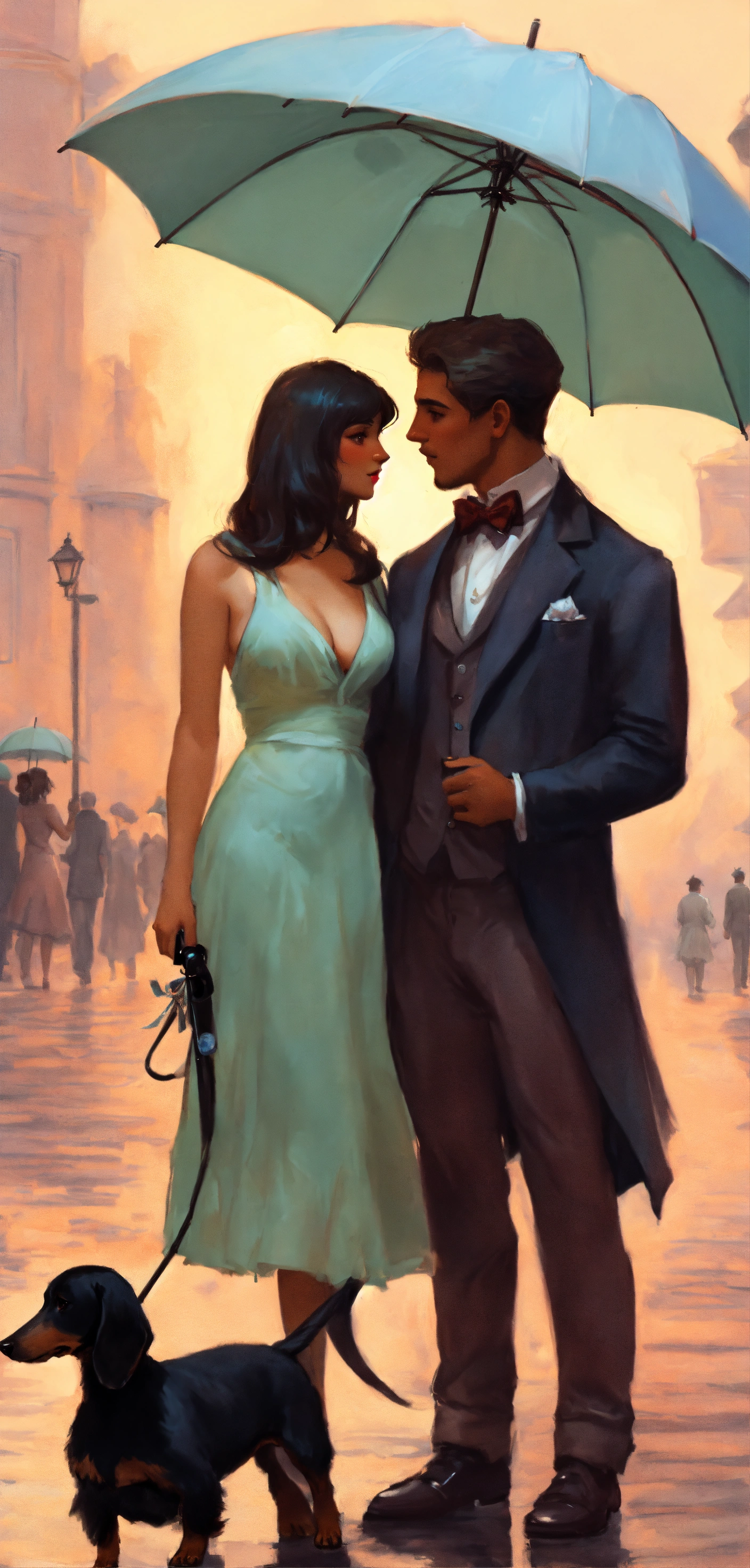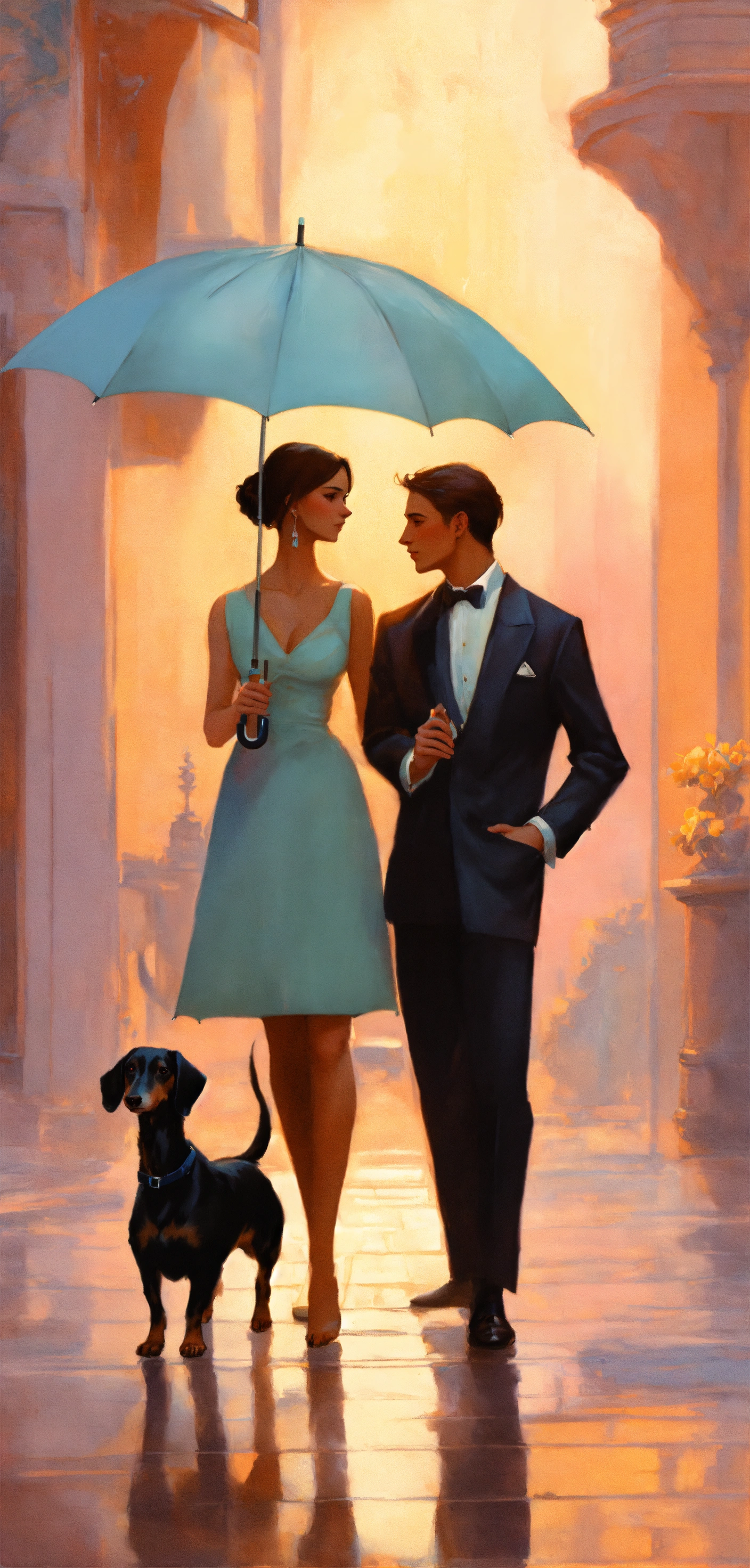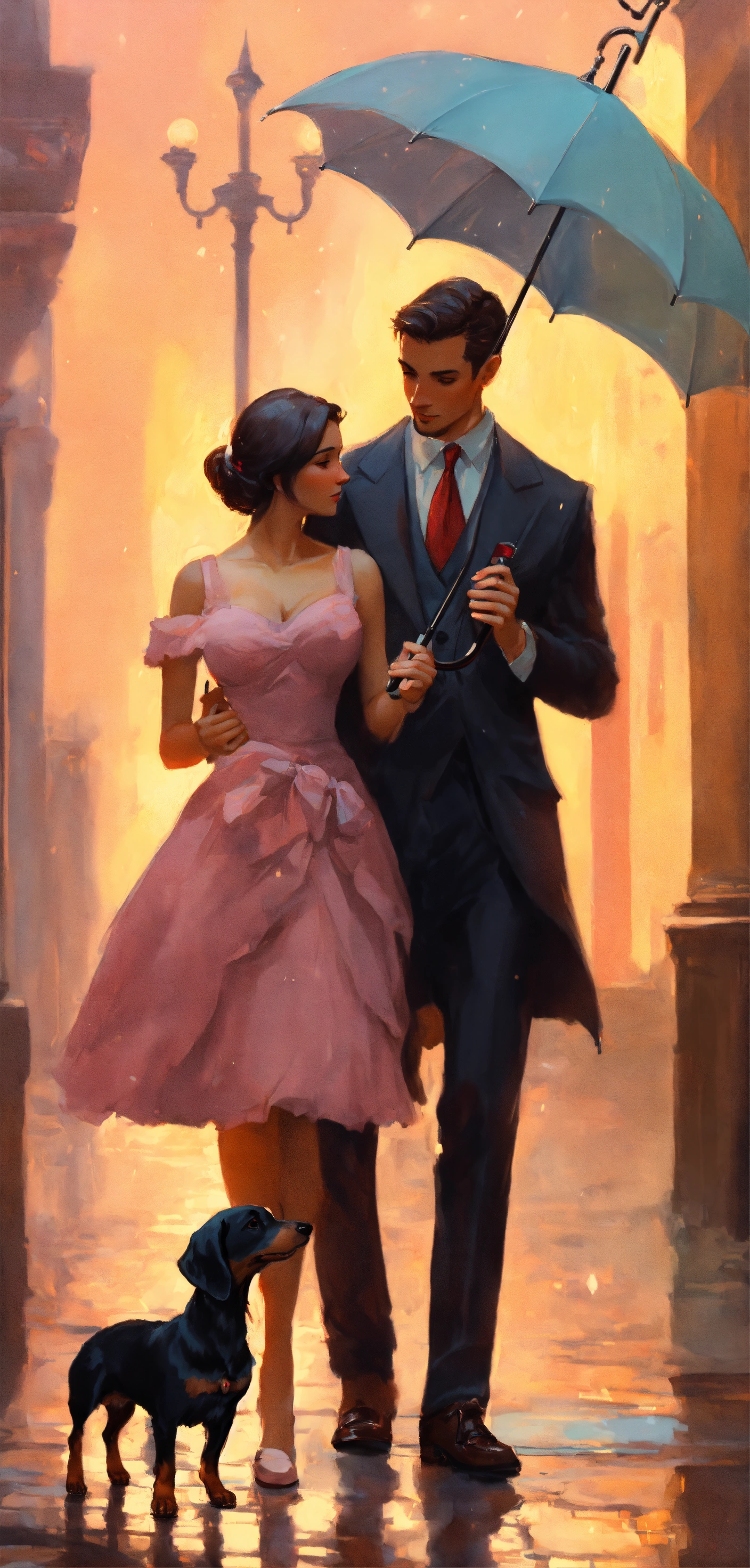 A romantic husband and wife with an umbrella and a black mini dachshund, pastel colors, greg rutkowski fantasy style