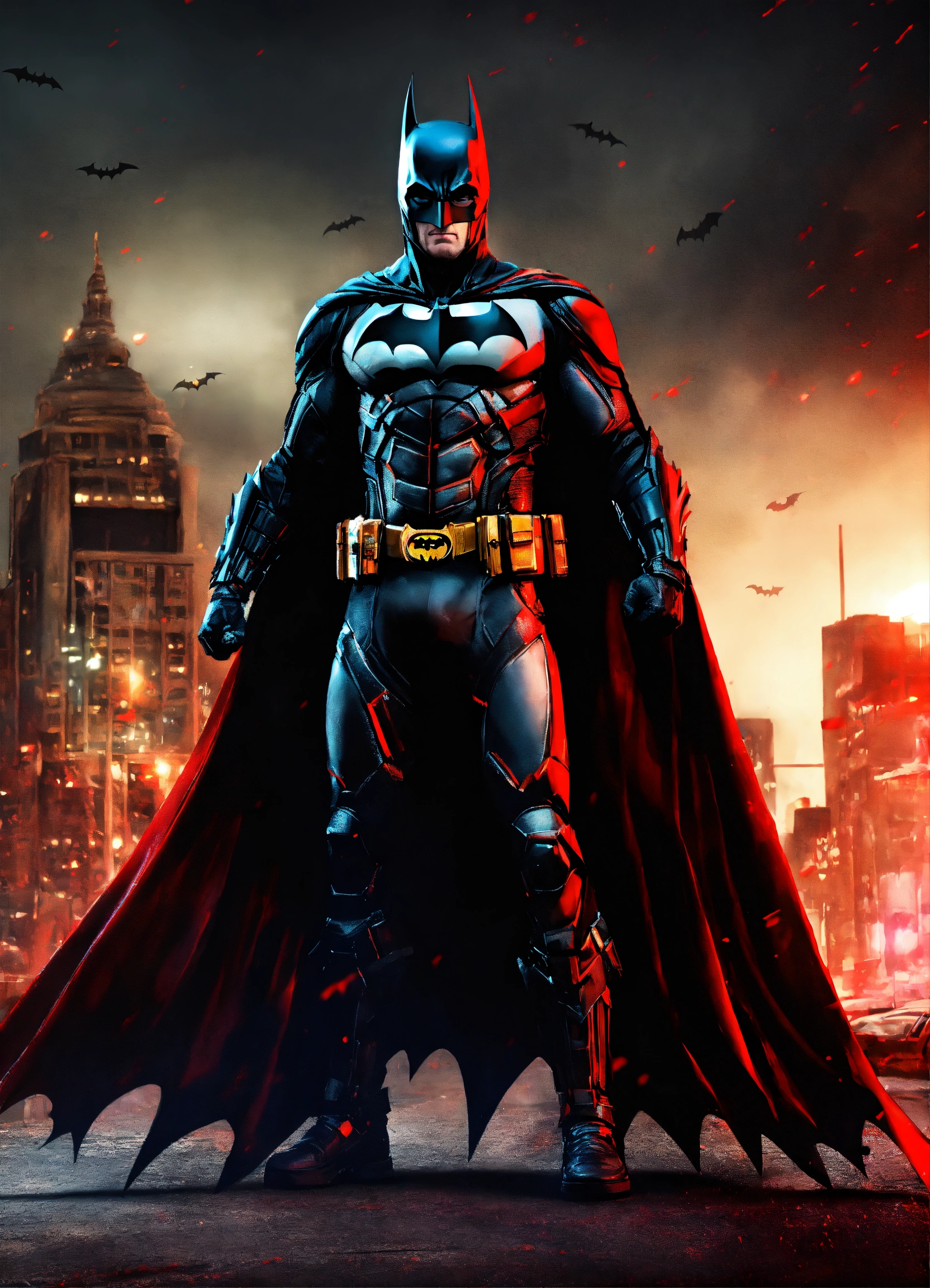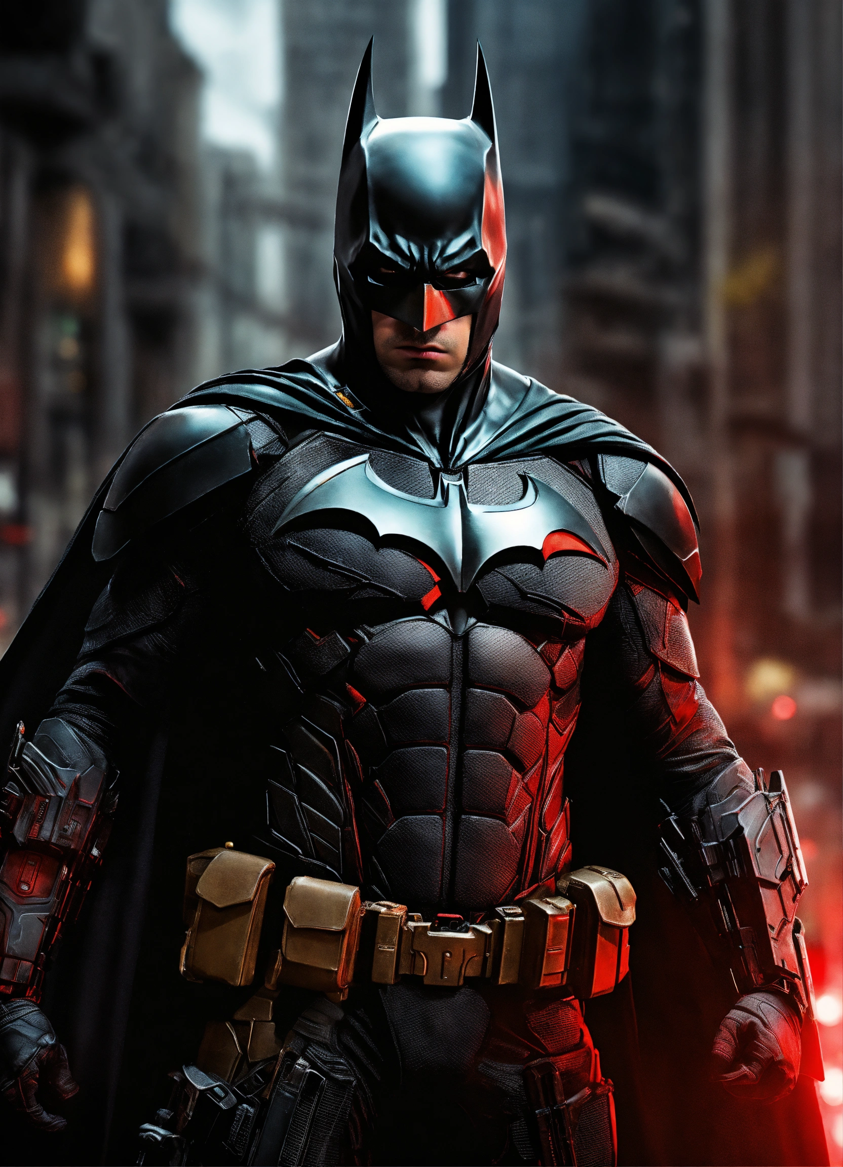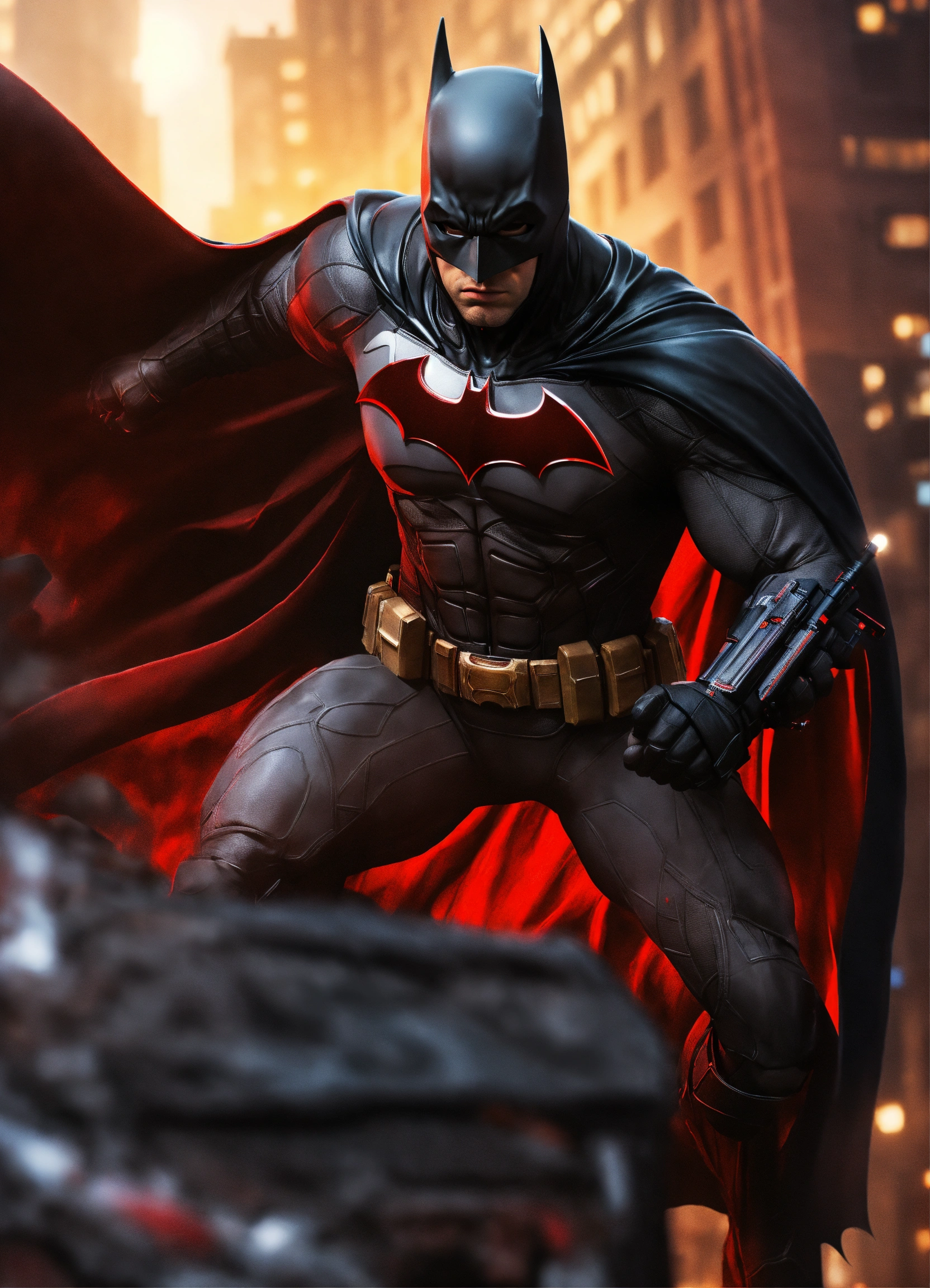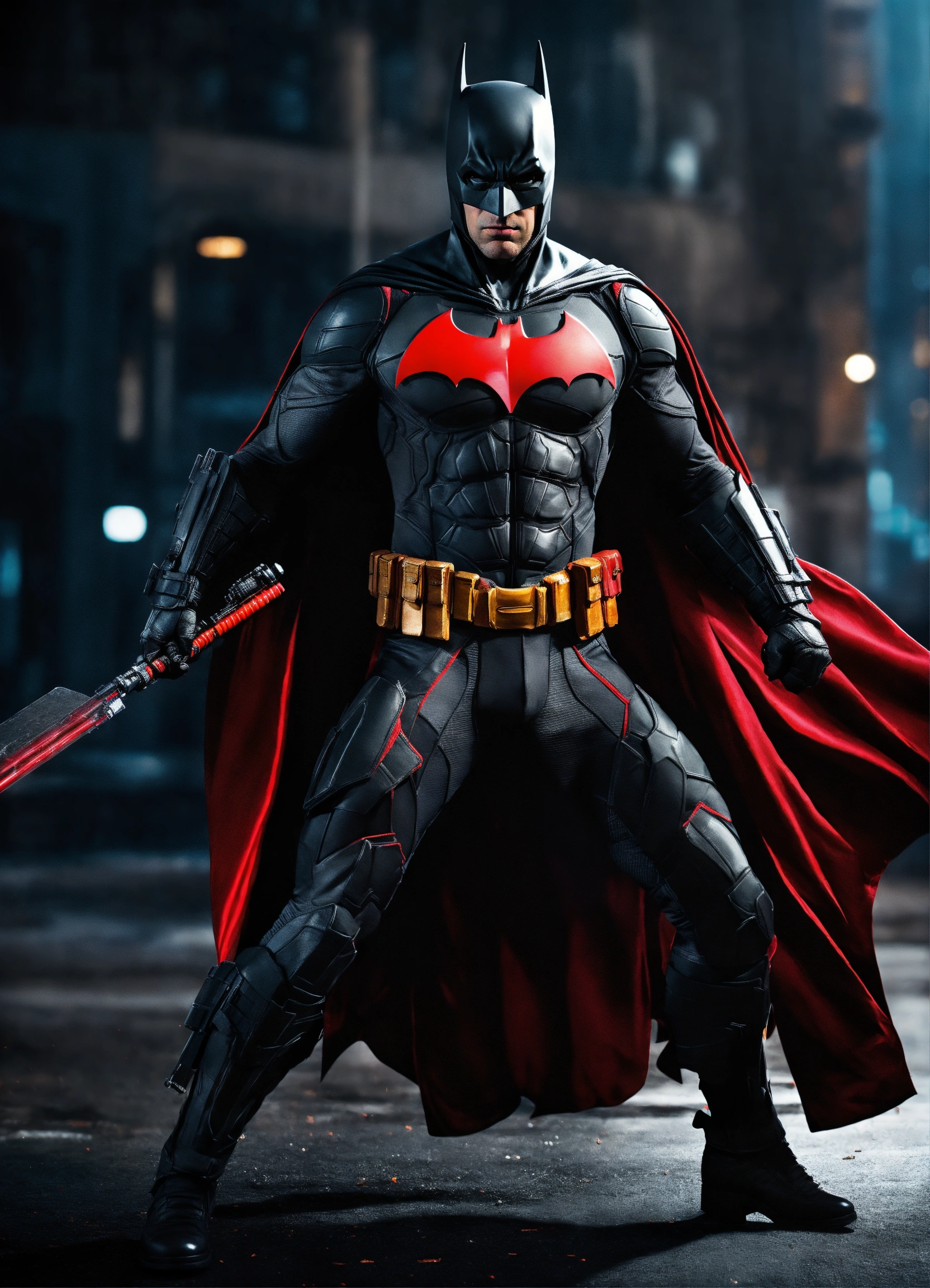 Batman traje negro con rojo y arma en la mano realista hd pose de pelea