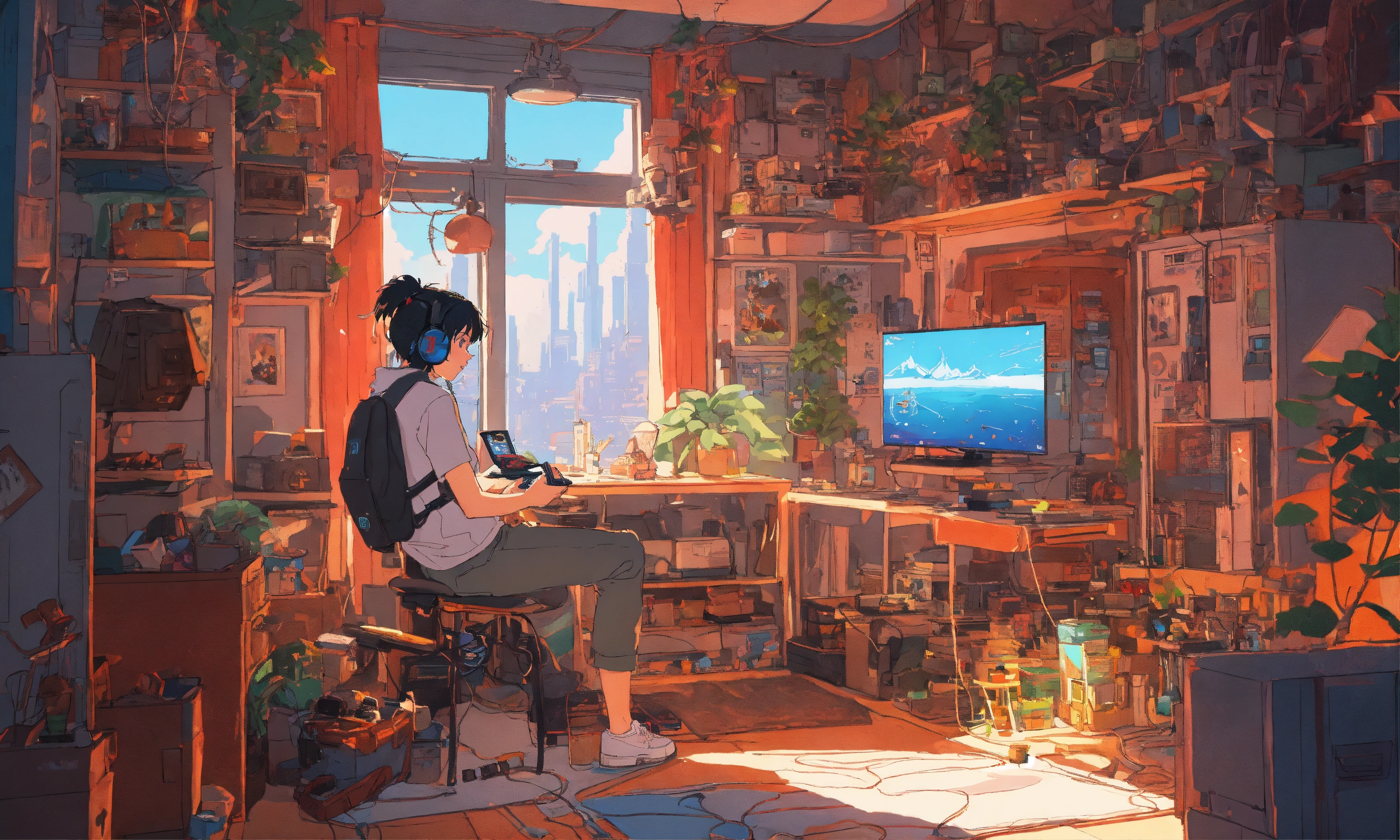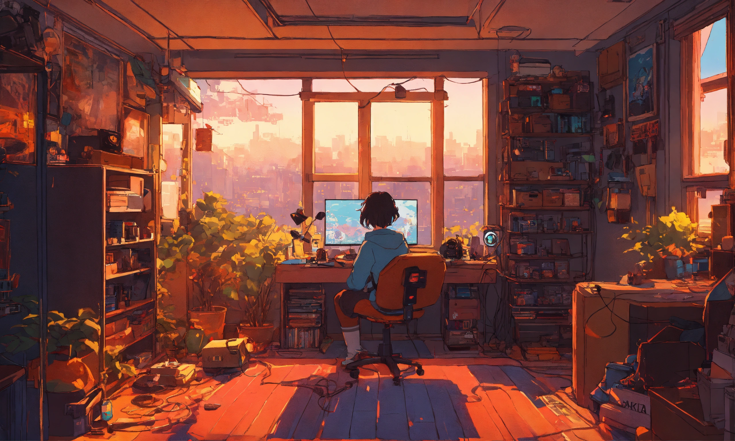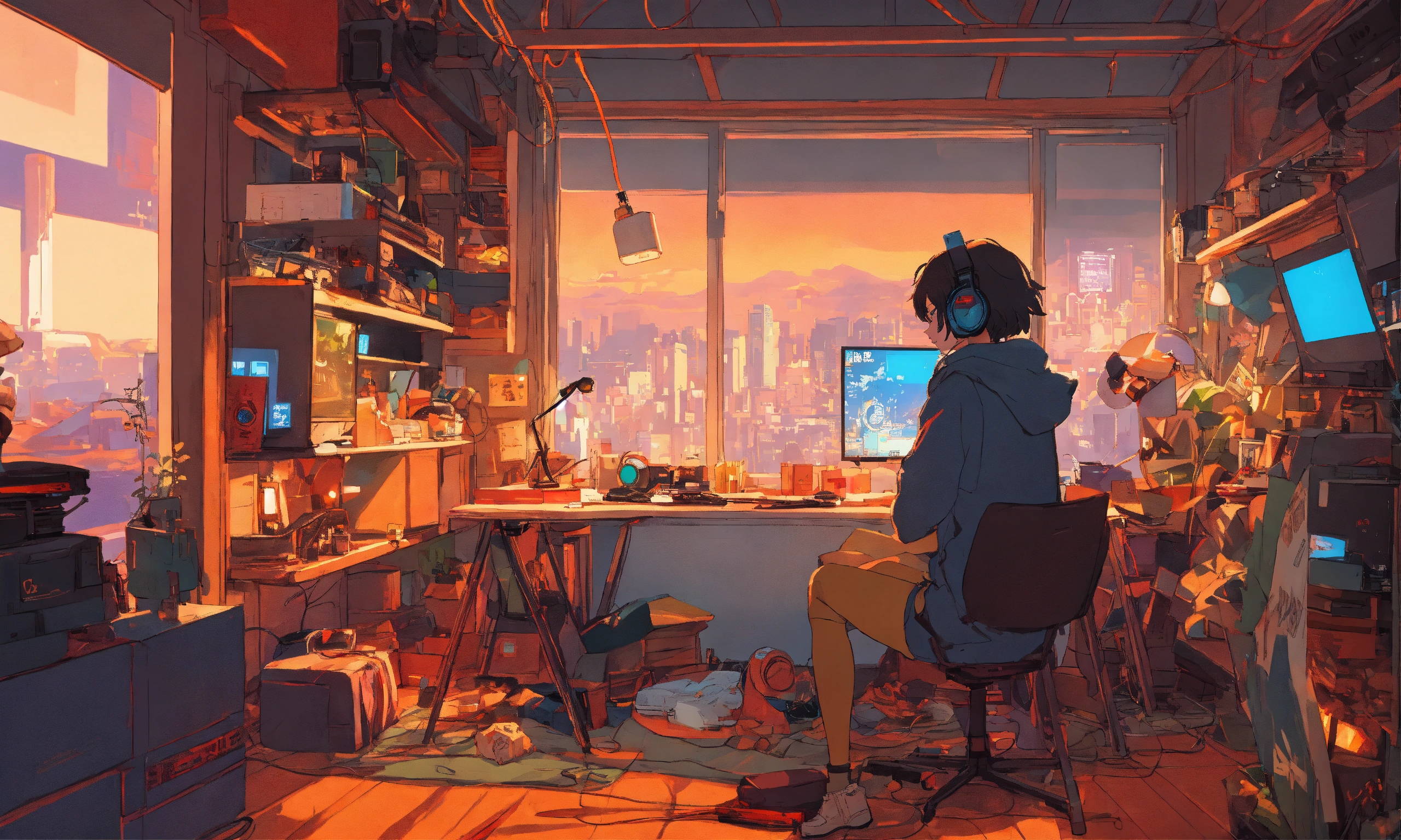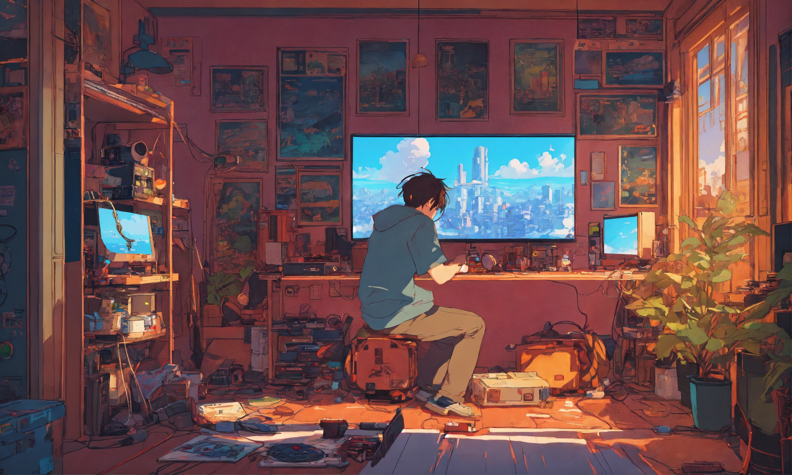 Photo of a gamer playing game in a cozy home, robot city, lots of cables, style of laurie greasley, studio ghibli, akira toriyama, james gilleard, genshin impact, trending pixiv fanbox, acrylic palette knife, 4k, vibrant colors, devinart, trending on artstation, low details
