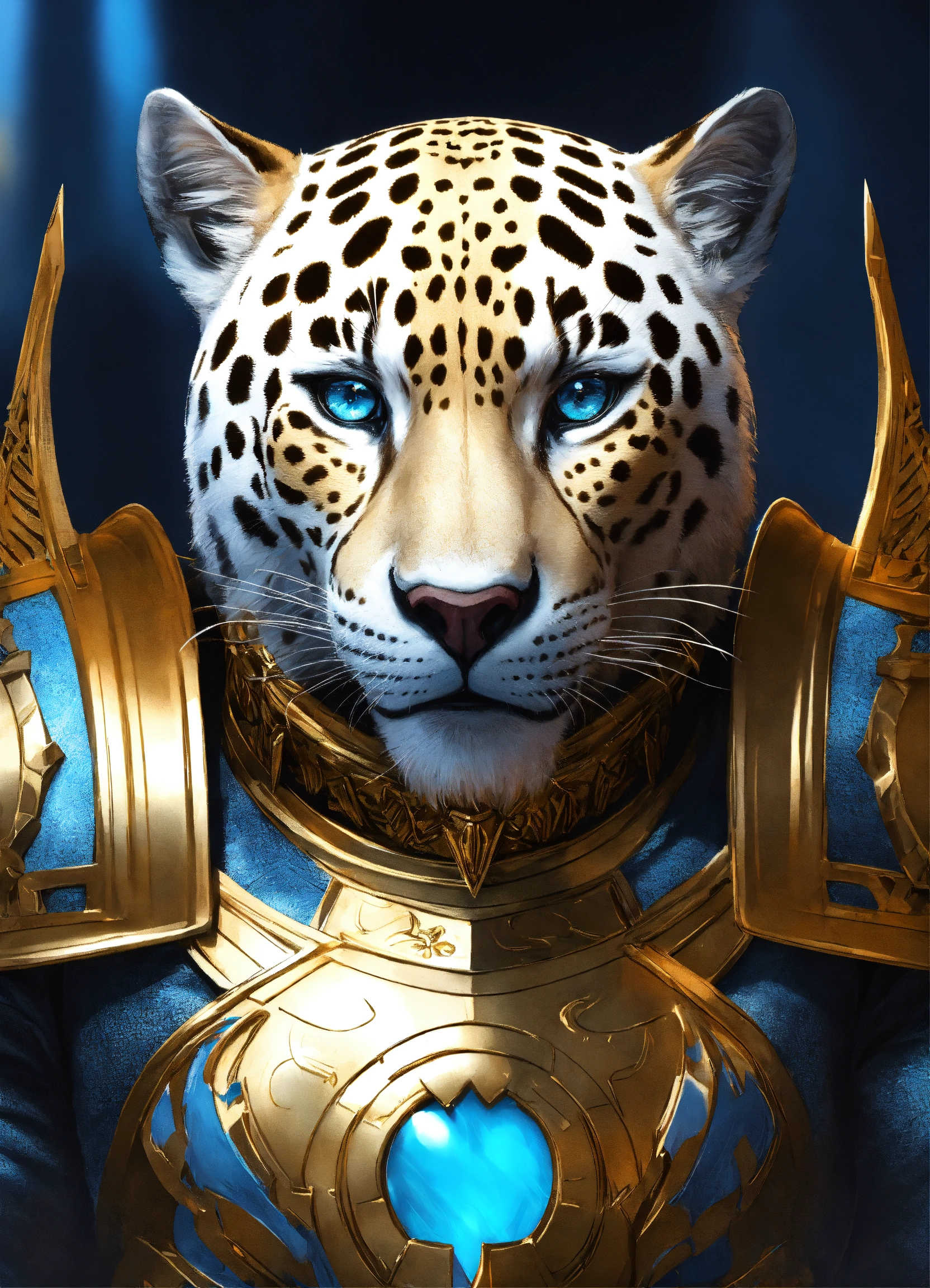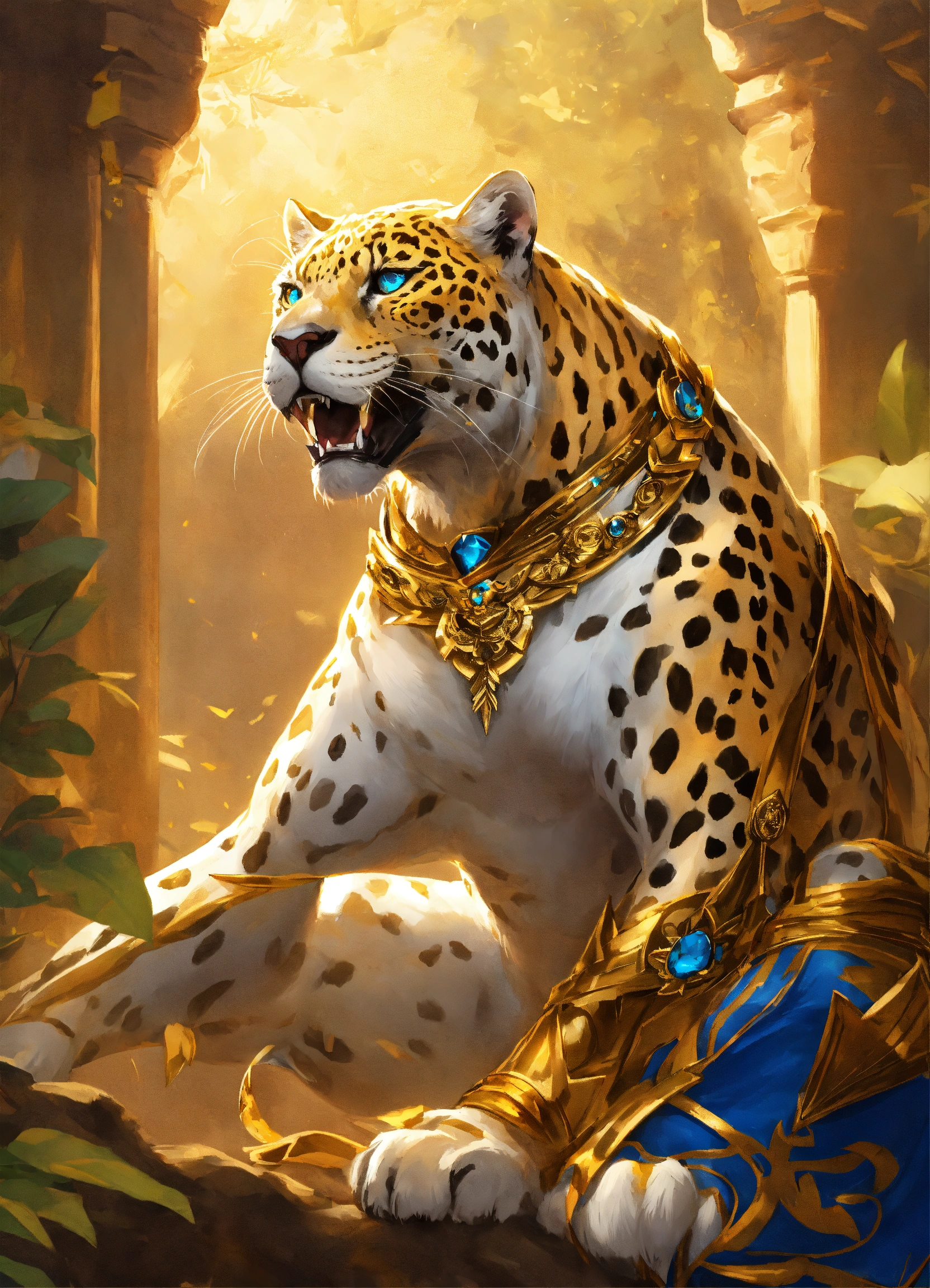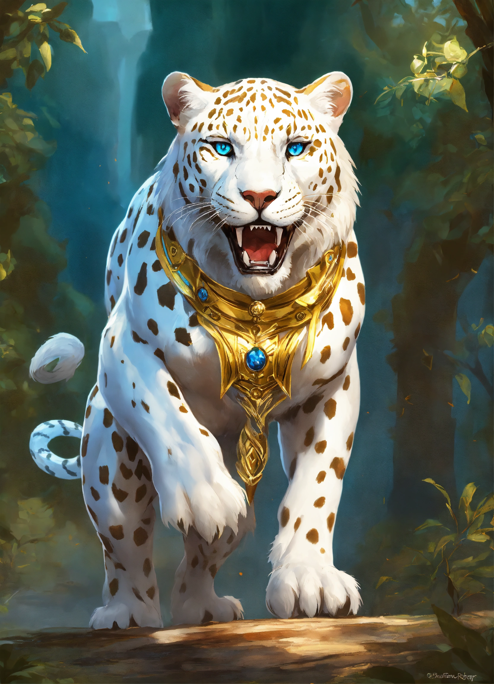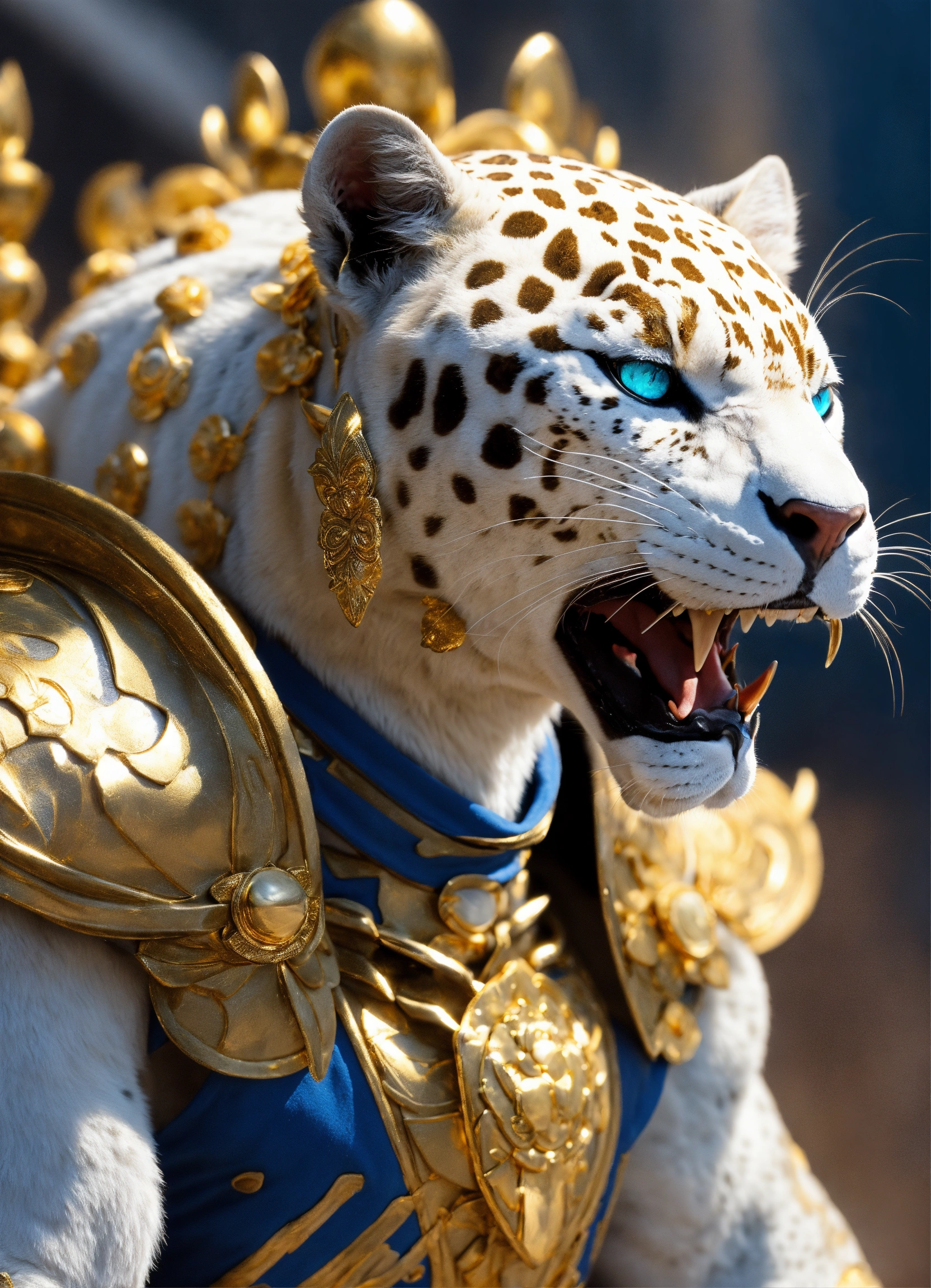 Antho white jaguar with gold rosettes, golden tipped fangs snarling staring straight ahead with blonde braid, golden armor ranger, blue eyes, standing on two legs, blue claws