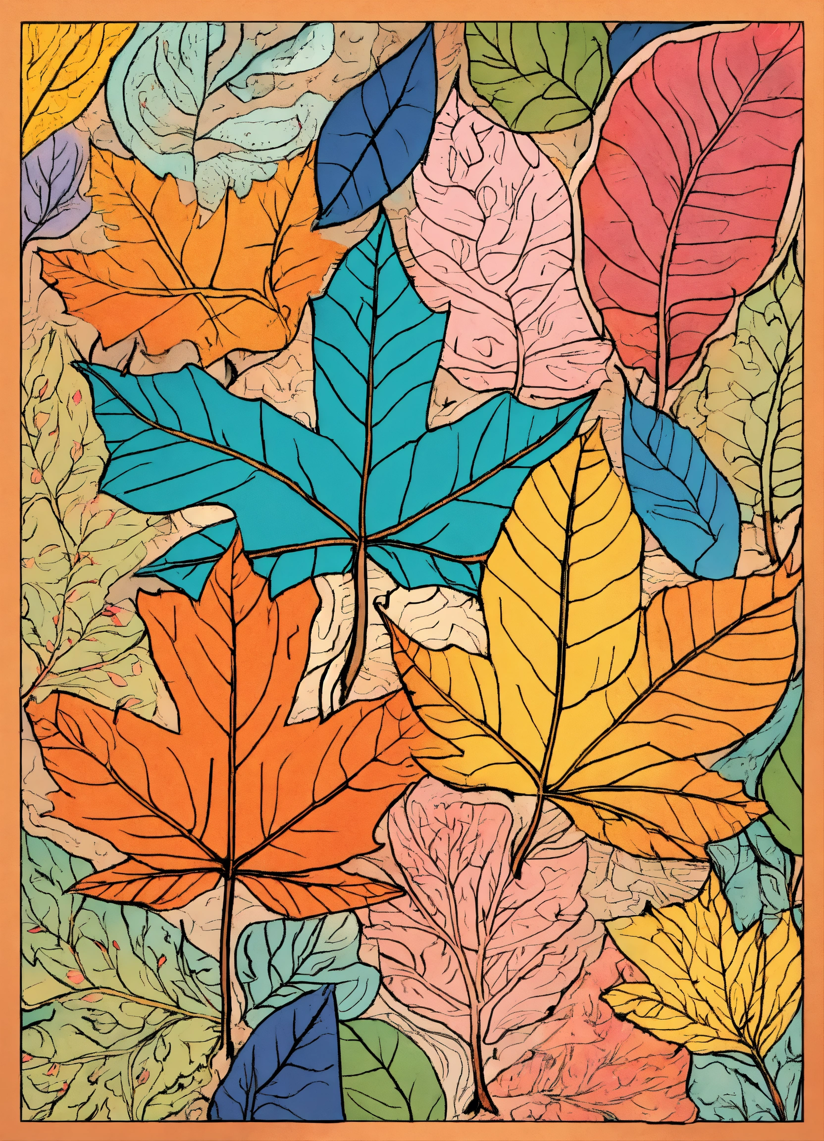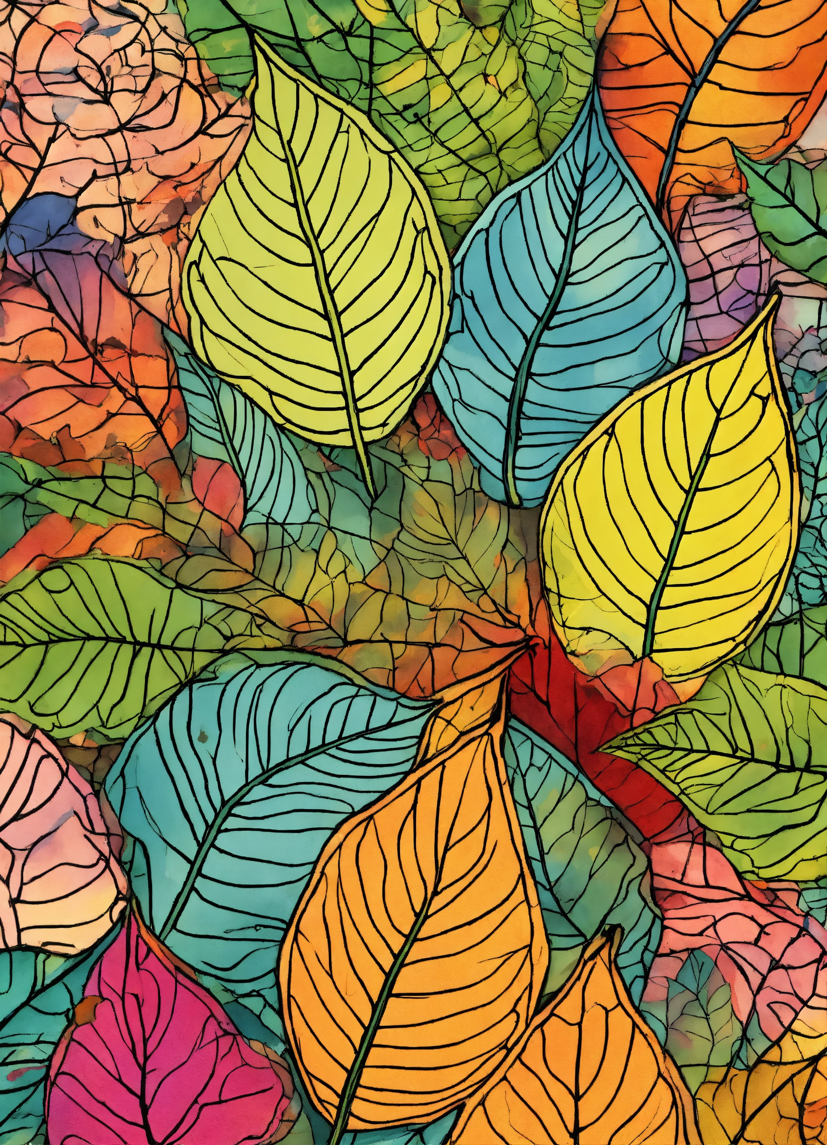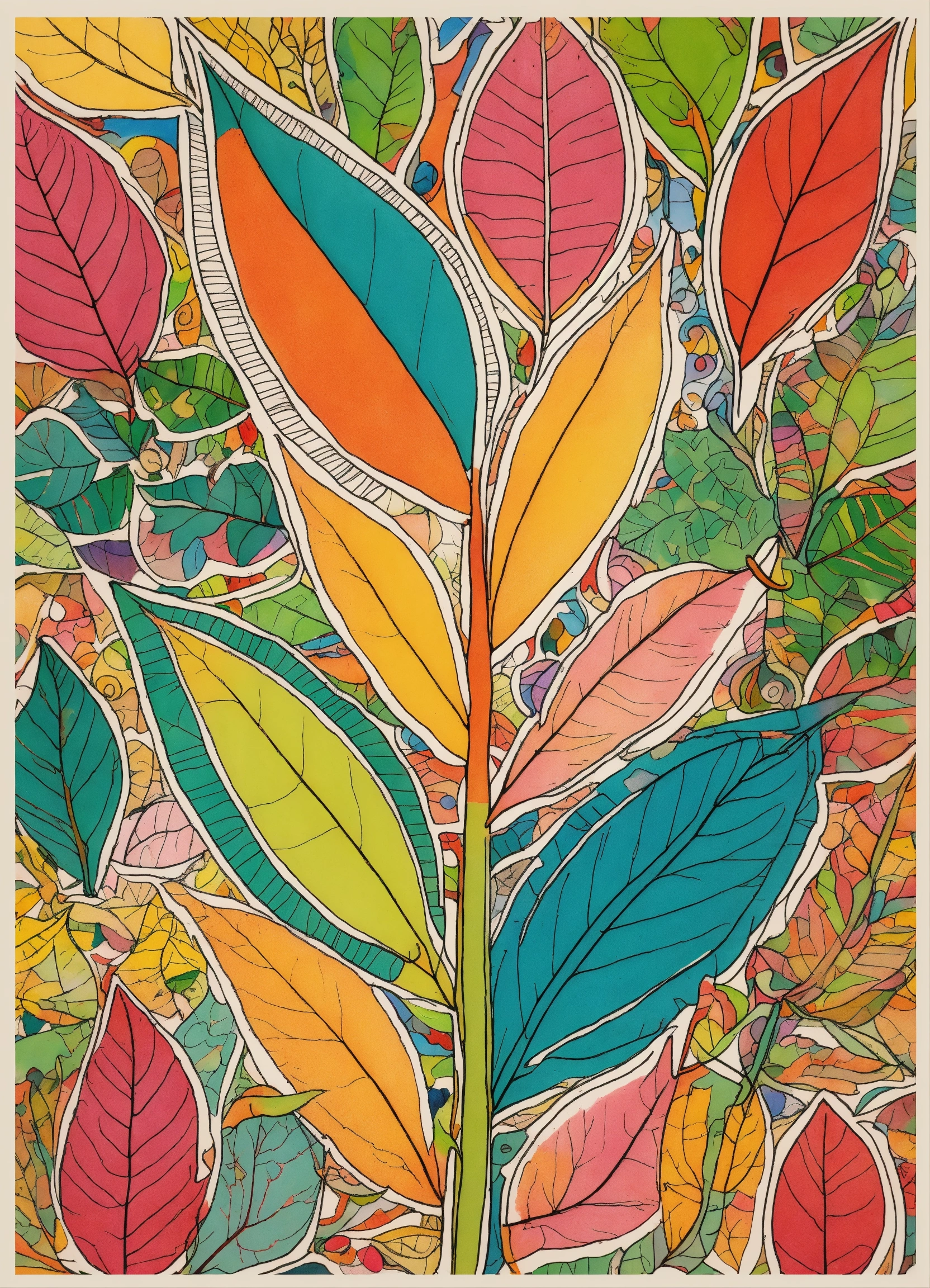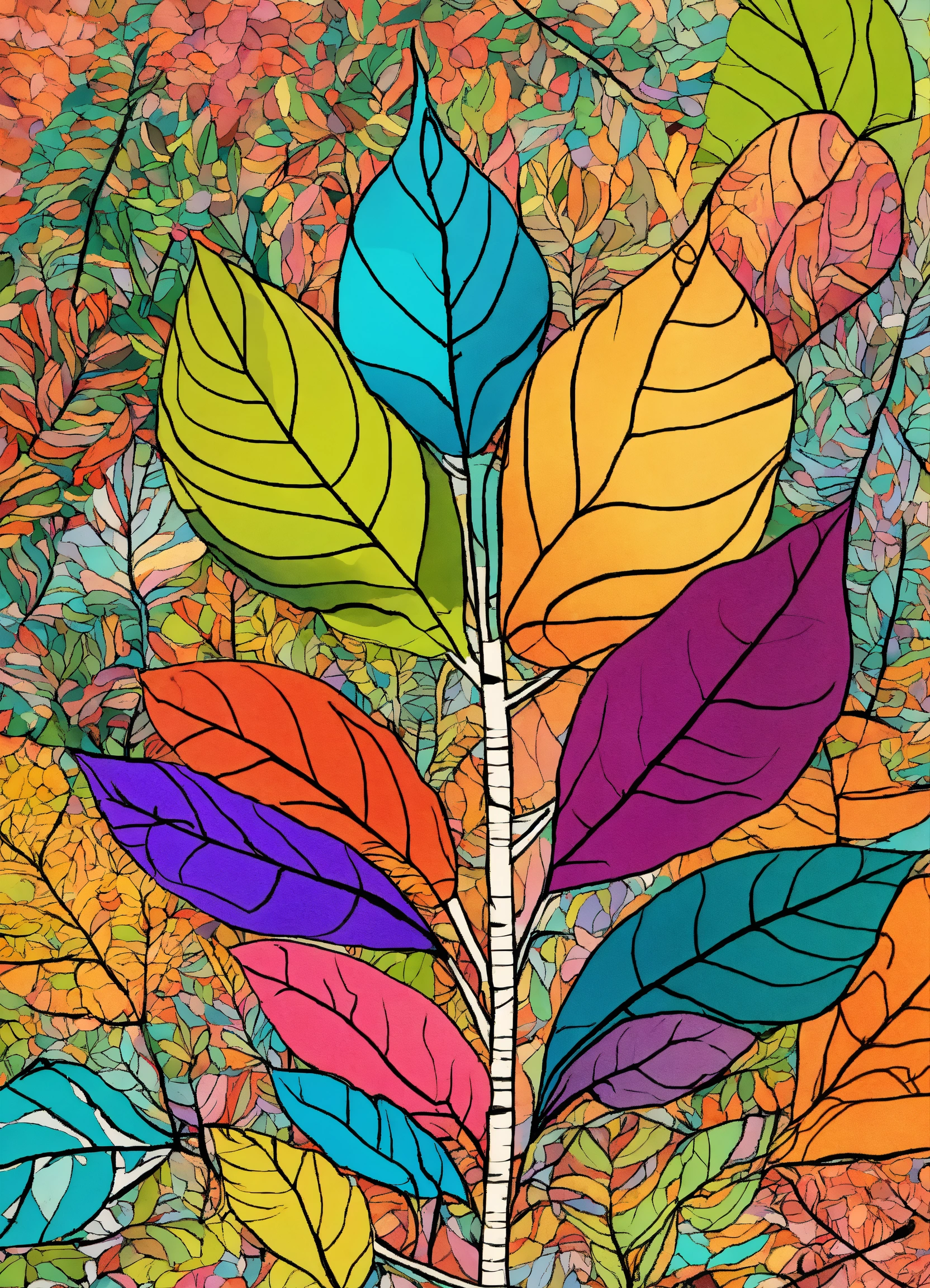Create a large leaf outline, divide it into sections and create repetitive tiny doodles in each section all different multicoloured