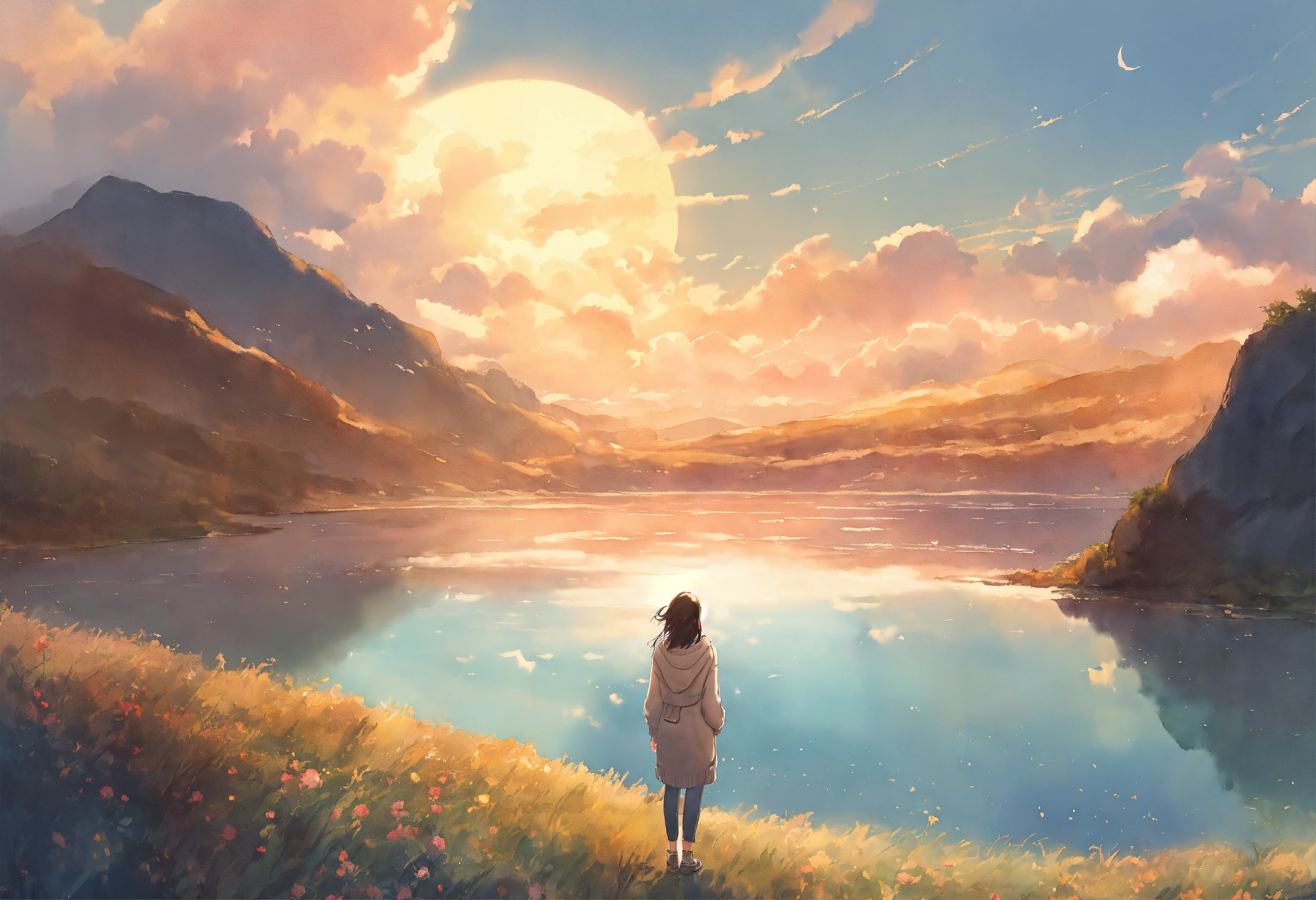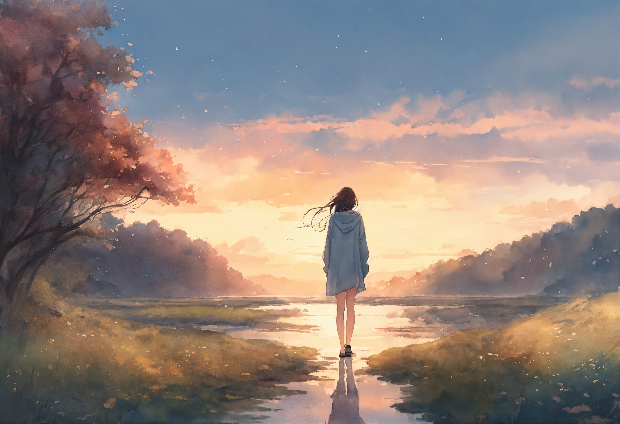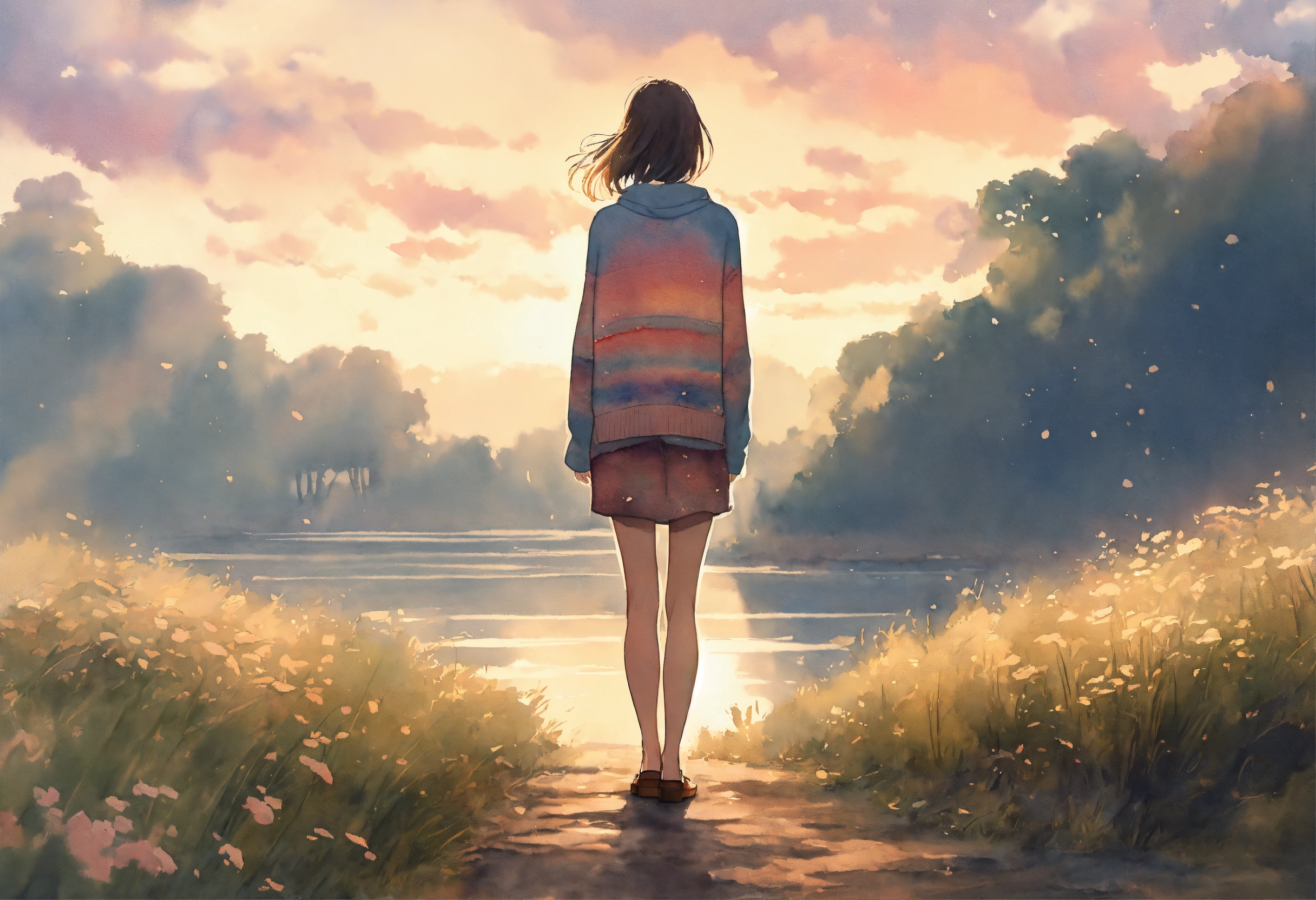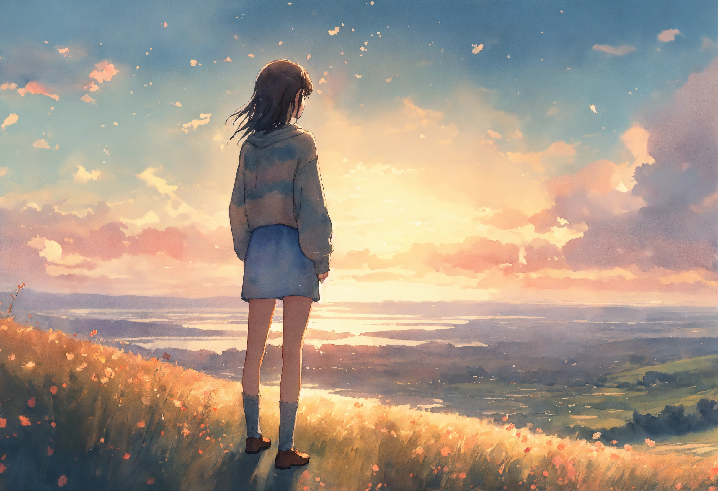 Full body watercolor illustration of a minuscule 20 years old women standing in the middle of an immense magical setting, facing backwards, centered, small figure in large landscape, wearing a long boho sweater, comfortable, stylish, chic, no makeup, effortless, relaxed, casual, laid-back, beautiful light sky, low saturation, muted colors, animation, fantasy art, by makoto shinkai