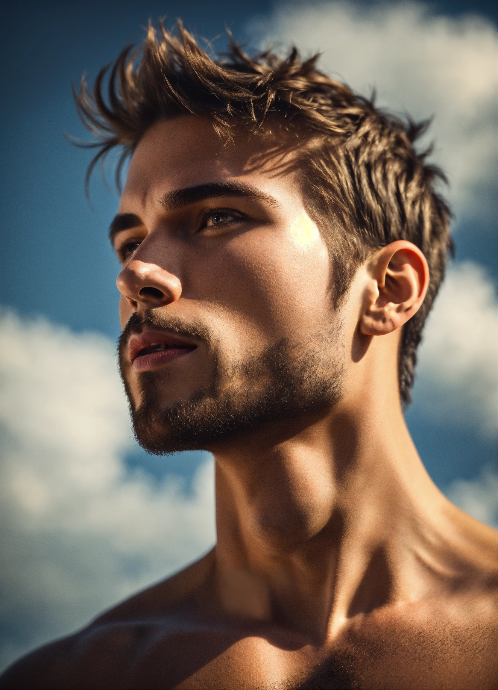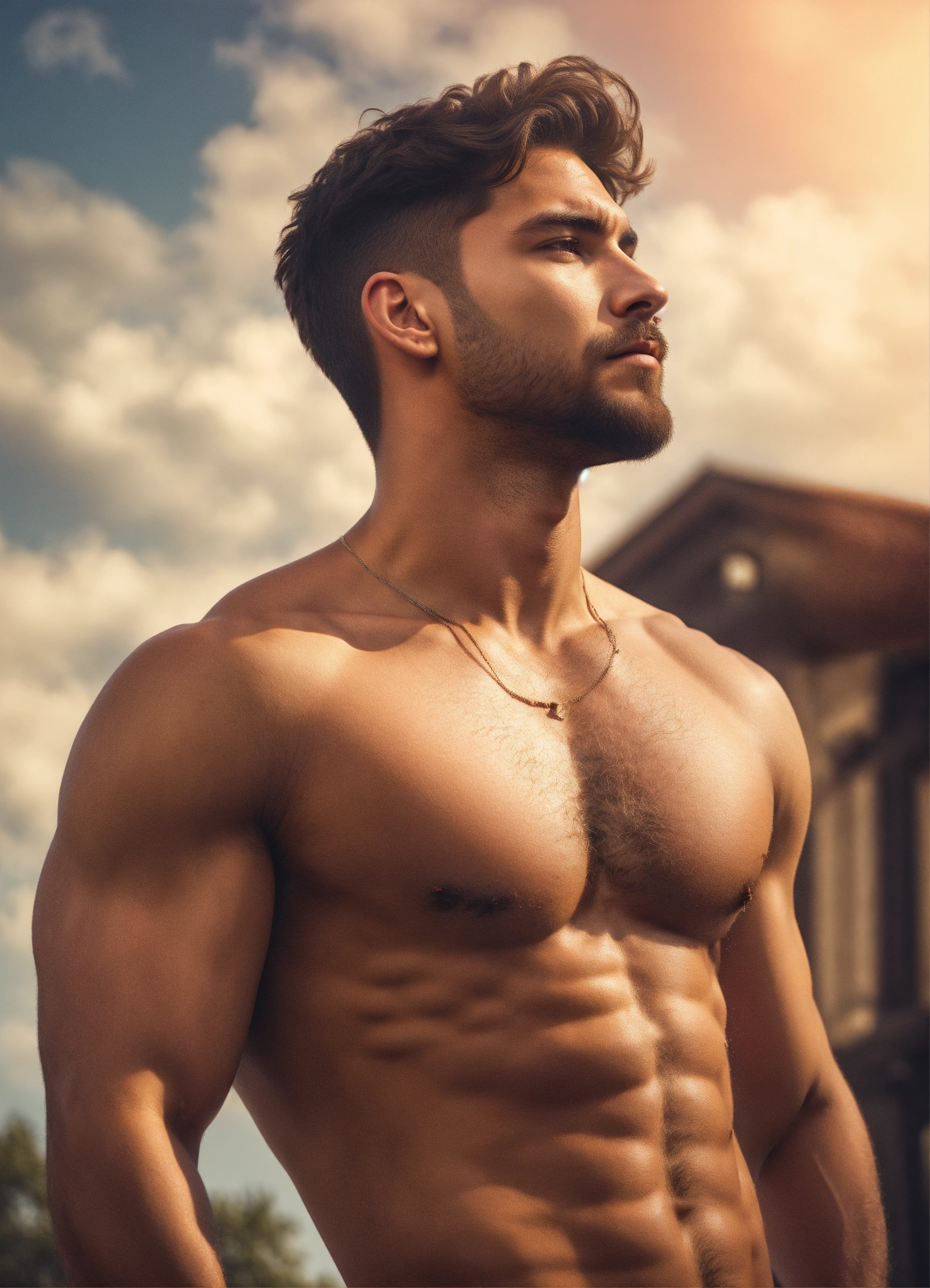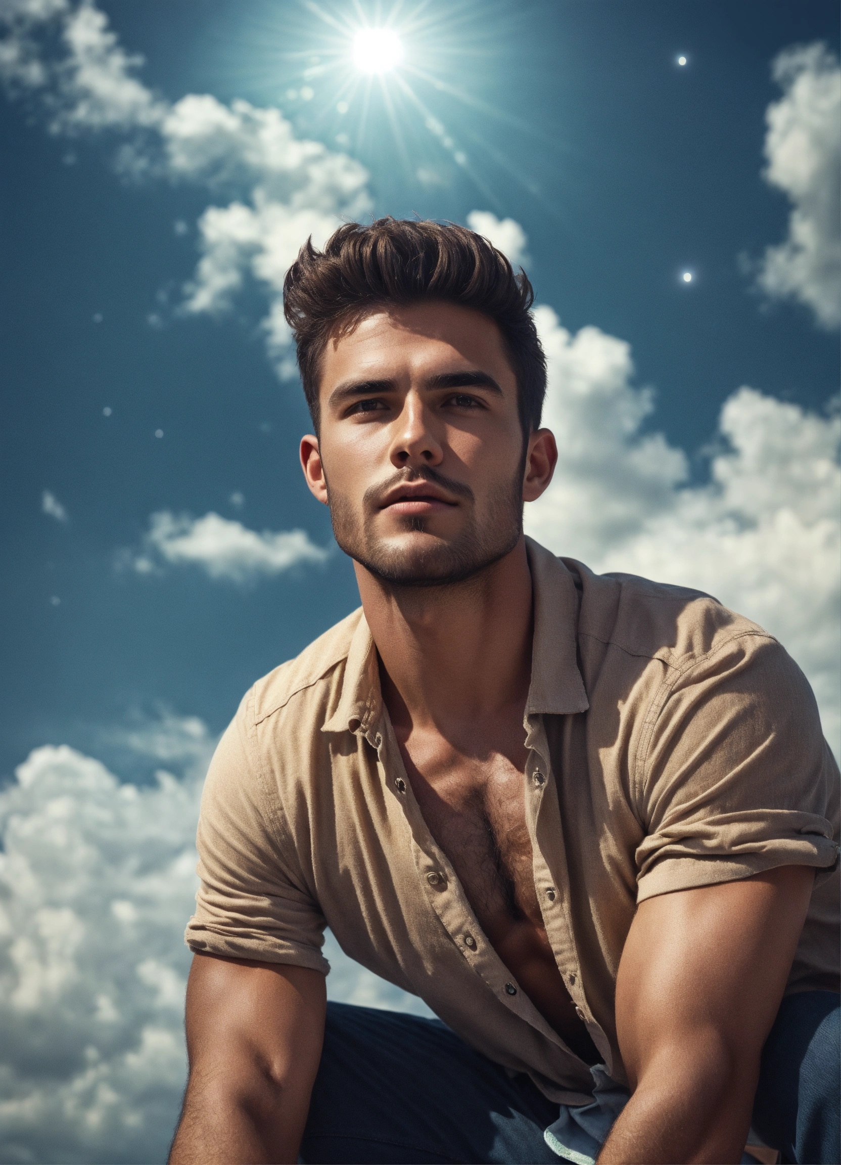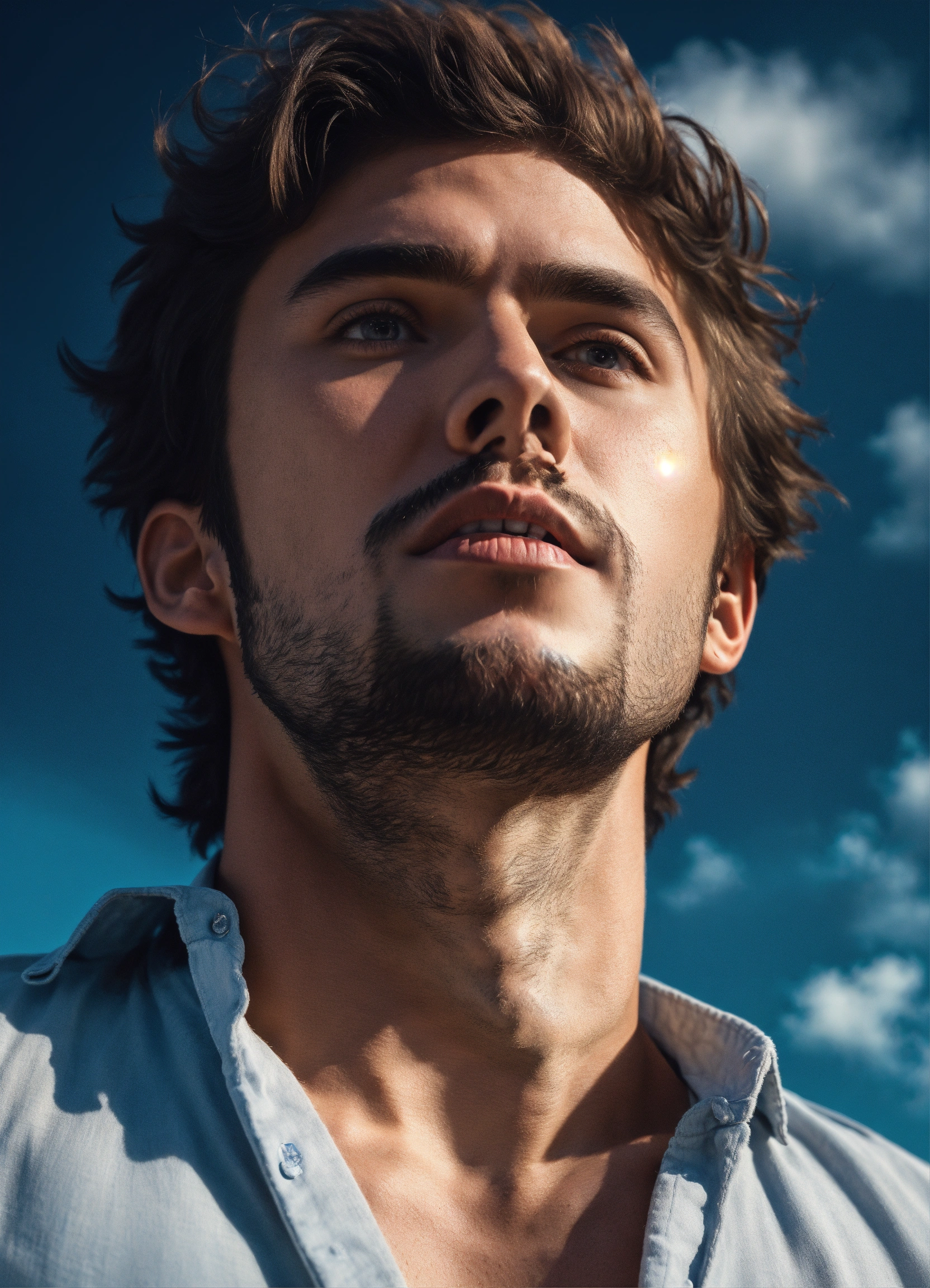 Gorgeous well built guy, short cropped hair, open shirt, hairy chest, looking up at the skies, 4k resolution, photo realistic image