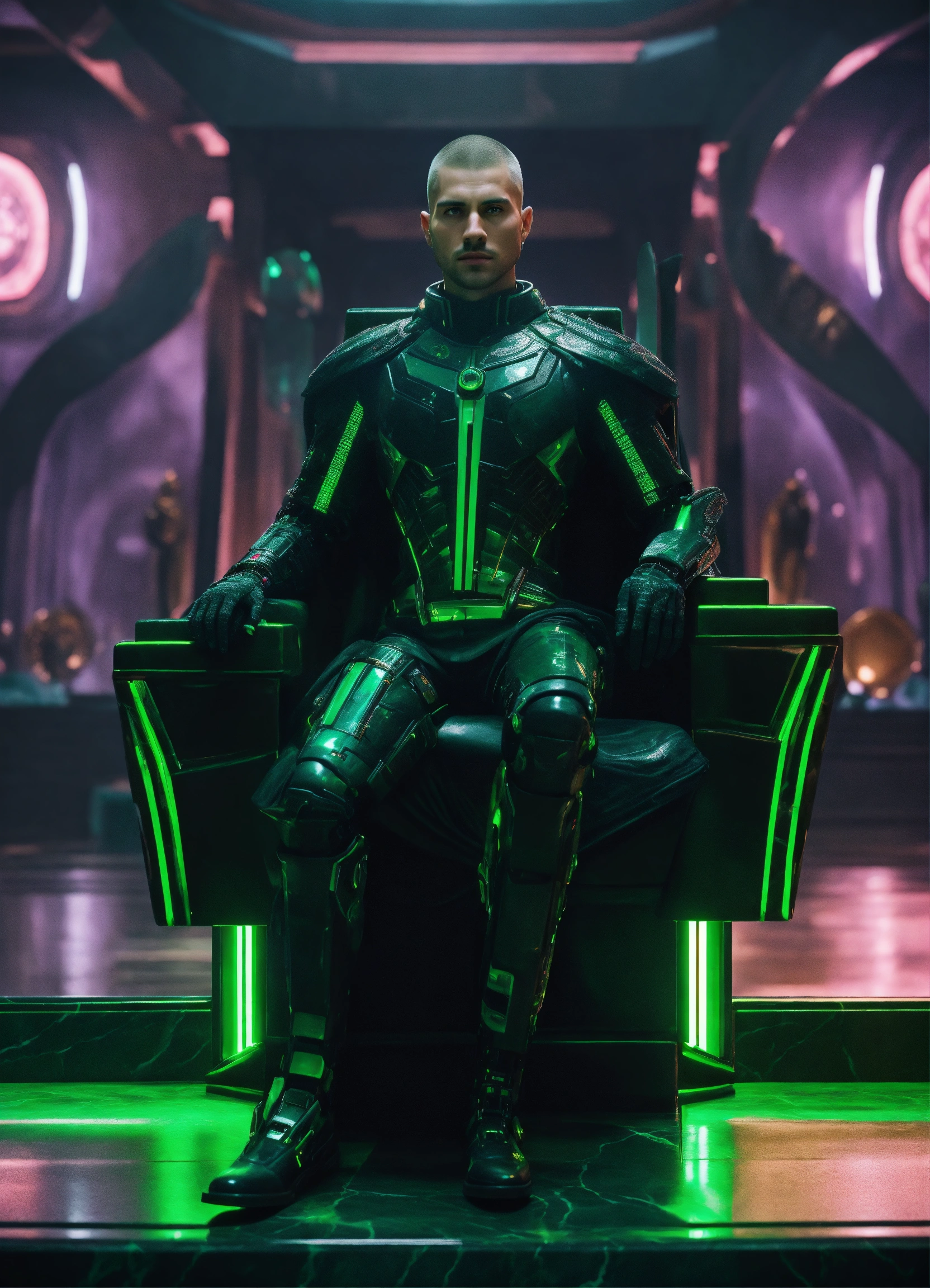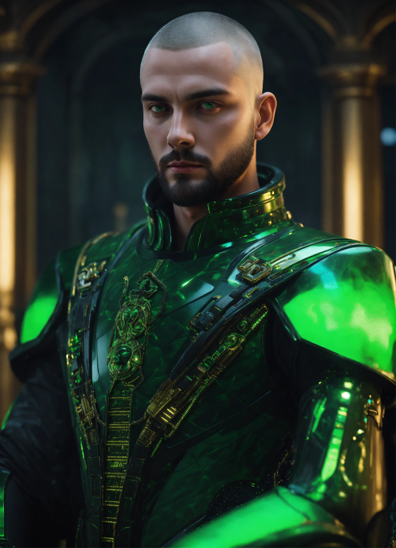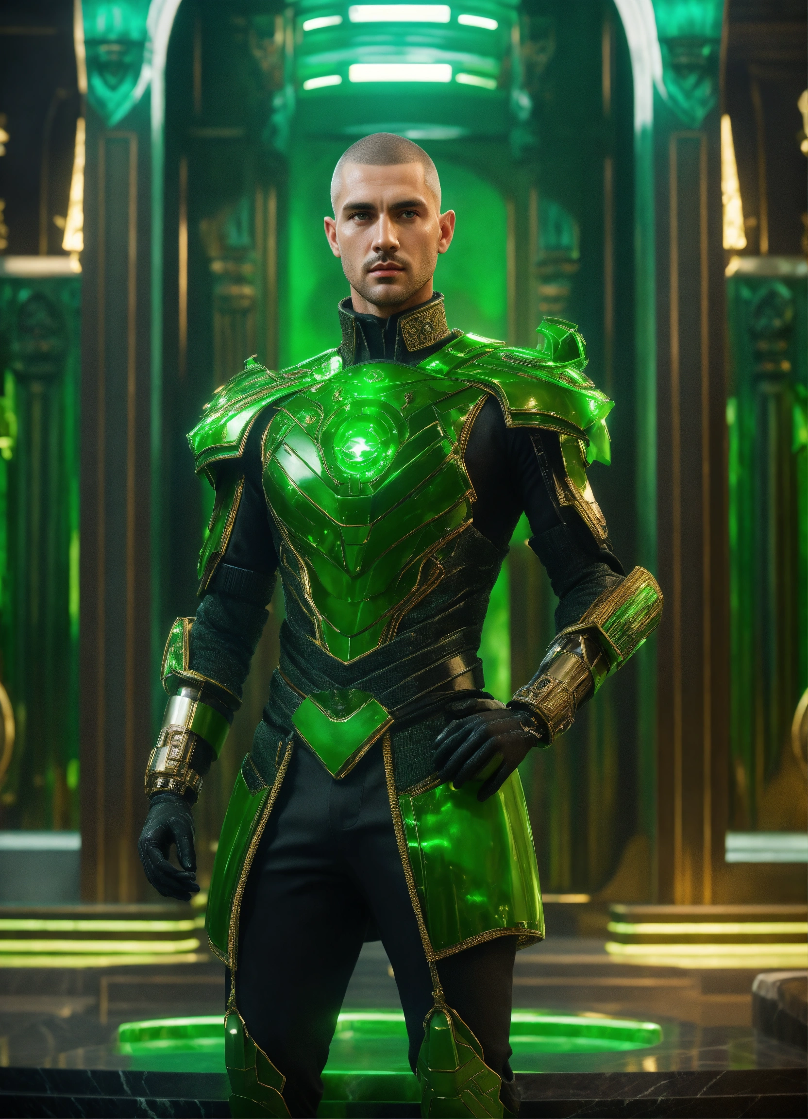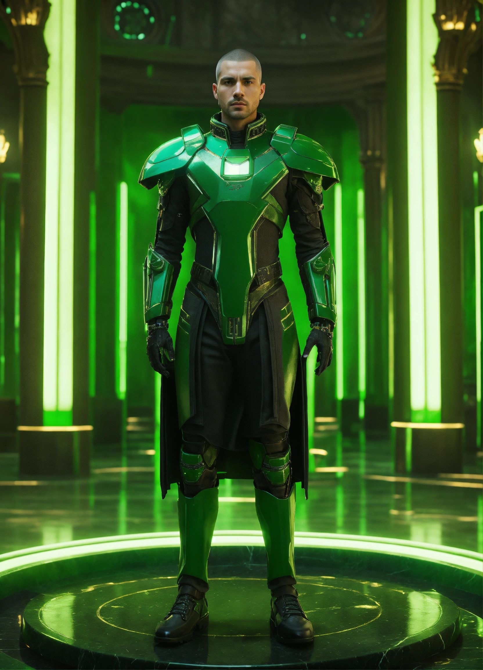 Full body image of a sci fi king wearing a black and green cybernetic uniform, sci fi, olive skinned, futuristic aristocrat standing in a black marble and jade throne room, 35 years old, stoic, buzz cut, royalty, male, handsome, green eyes, unreal engine, 8k