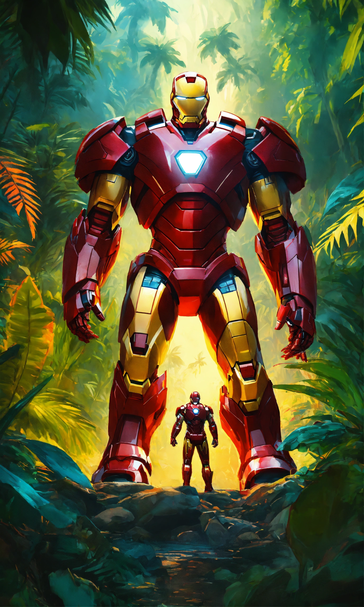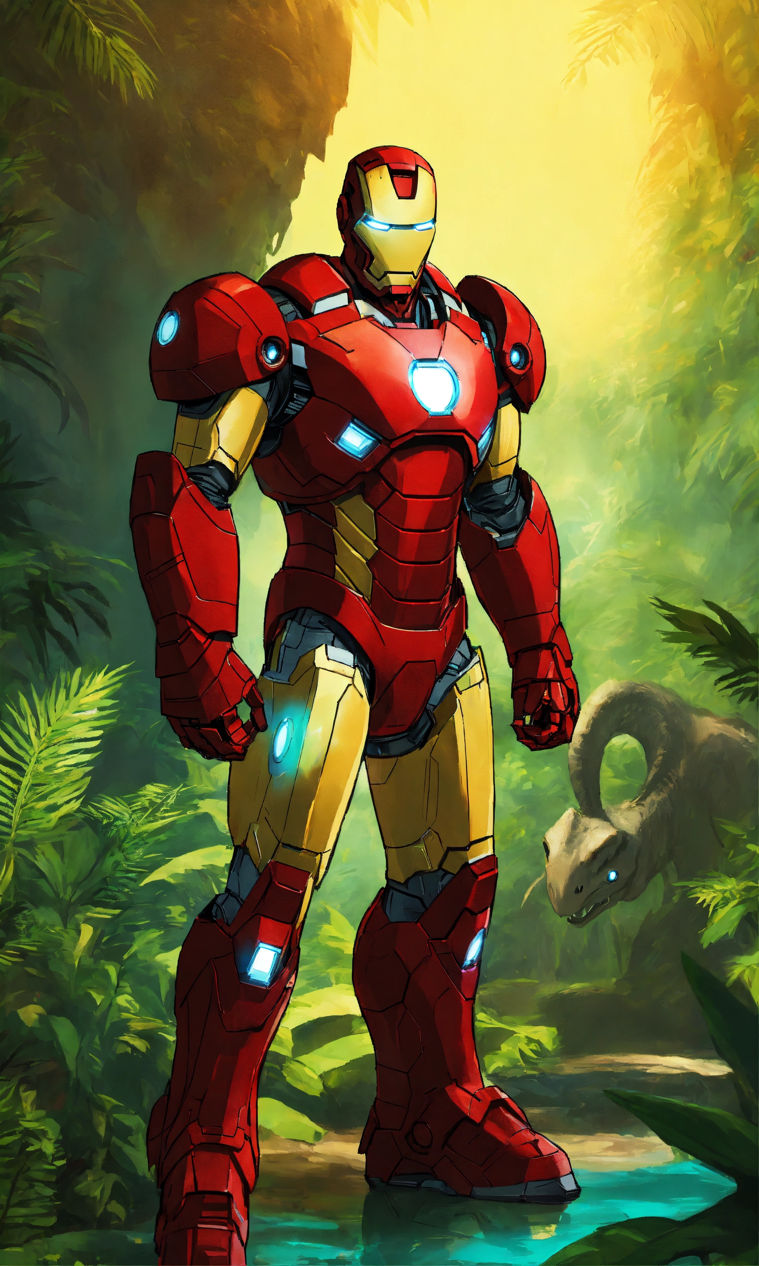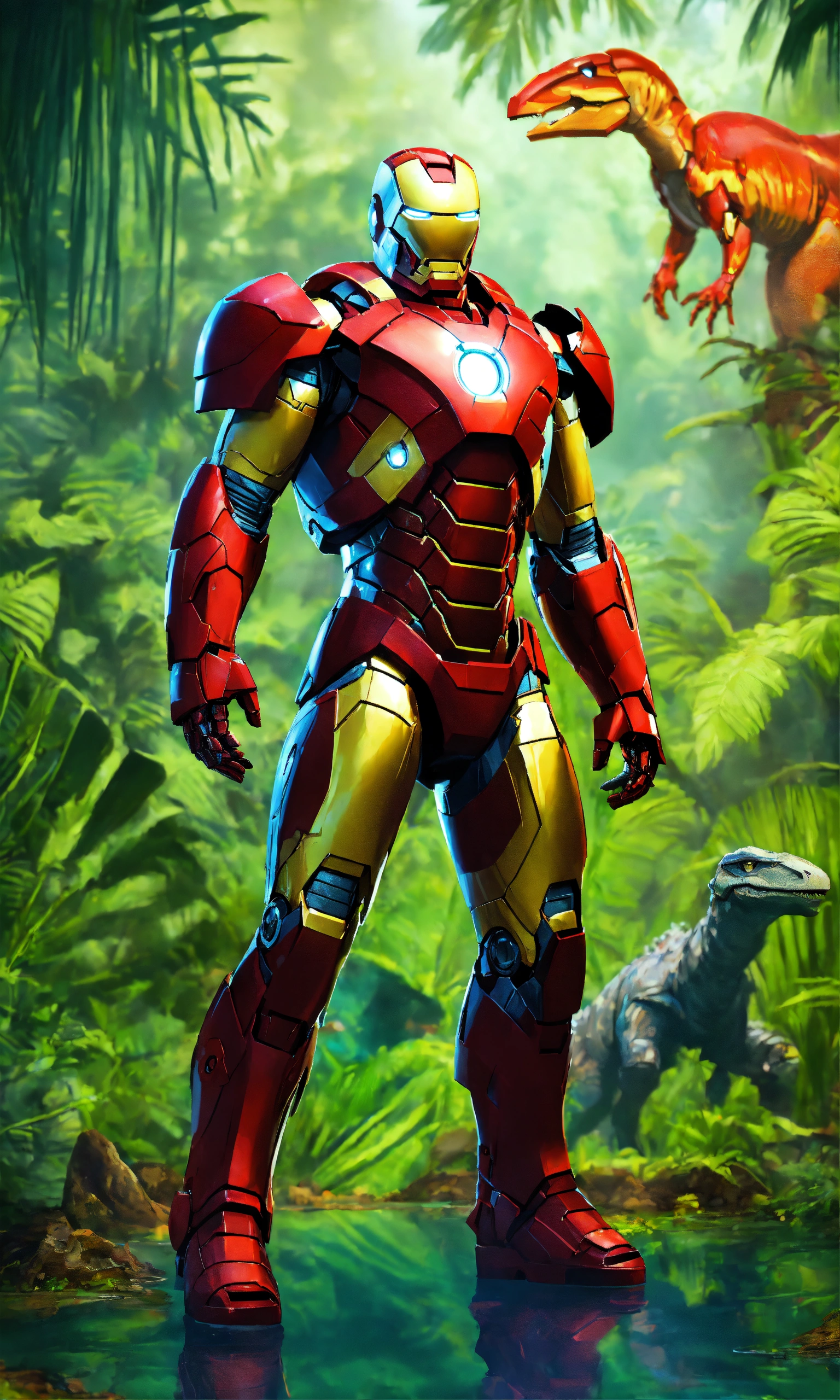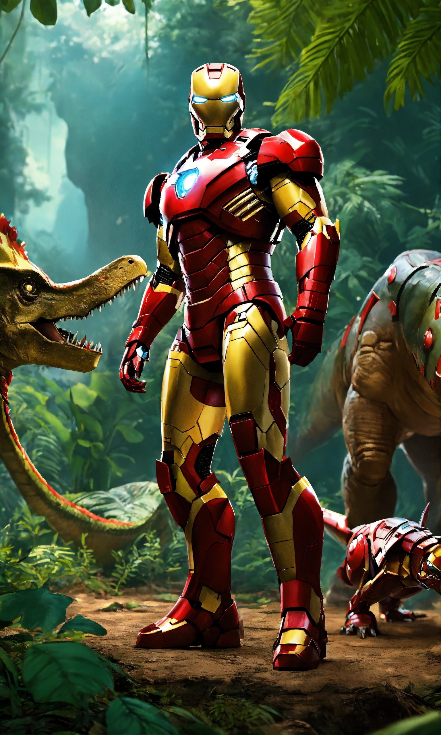 Iron man in front of dinosaurs in the deep jungle full-body, colorful background, 2d render, standing together