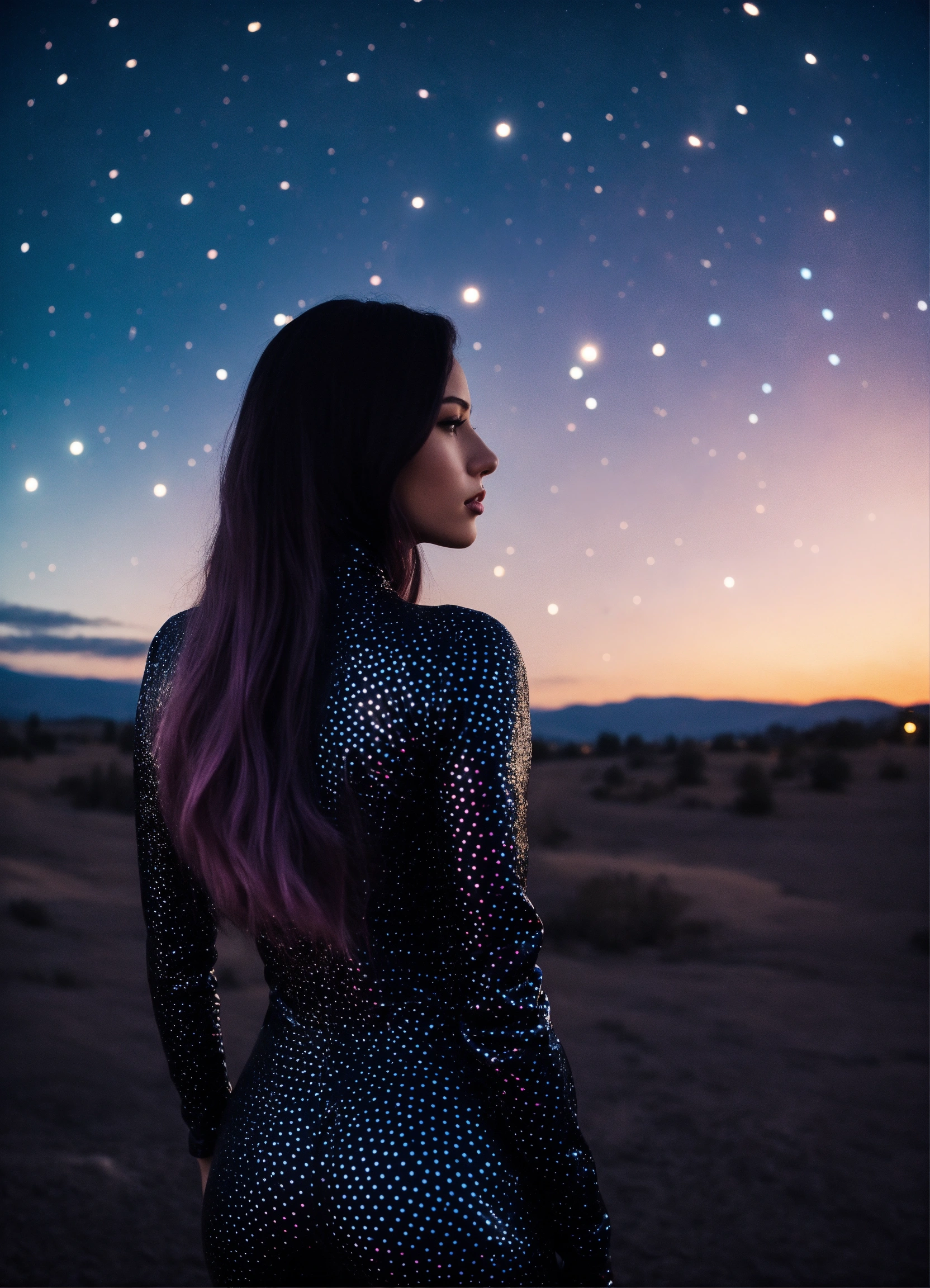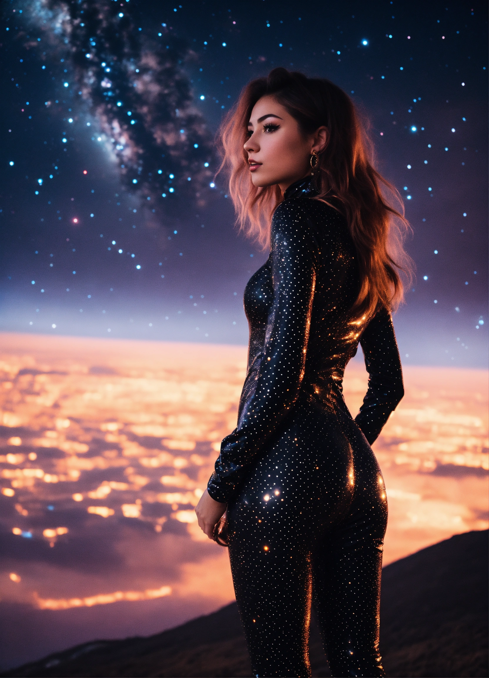 A real photo of a 23 year old girl, she is wearing a dark-metal polkadot catsuit, in the sky we see the galaxy