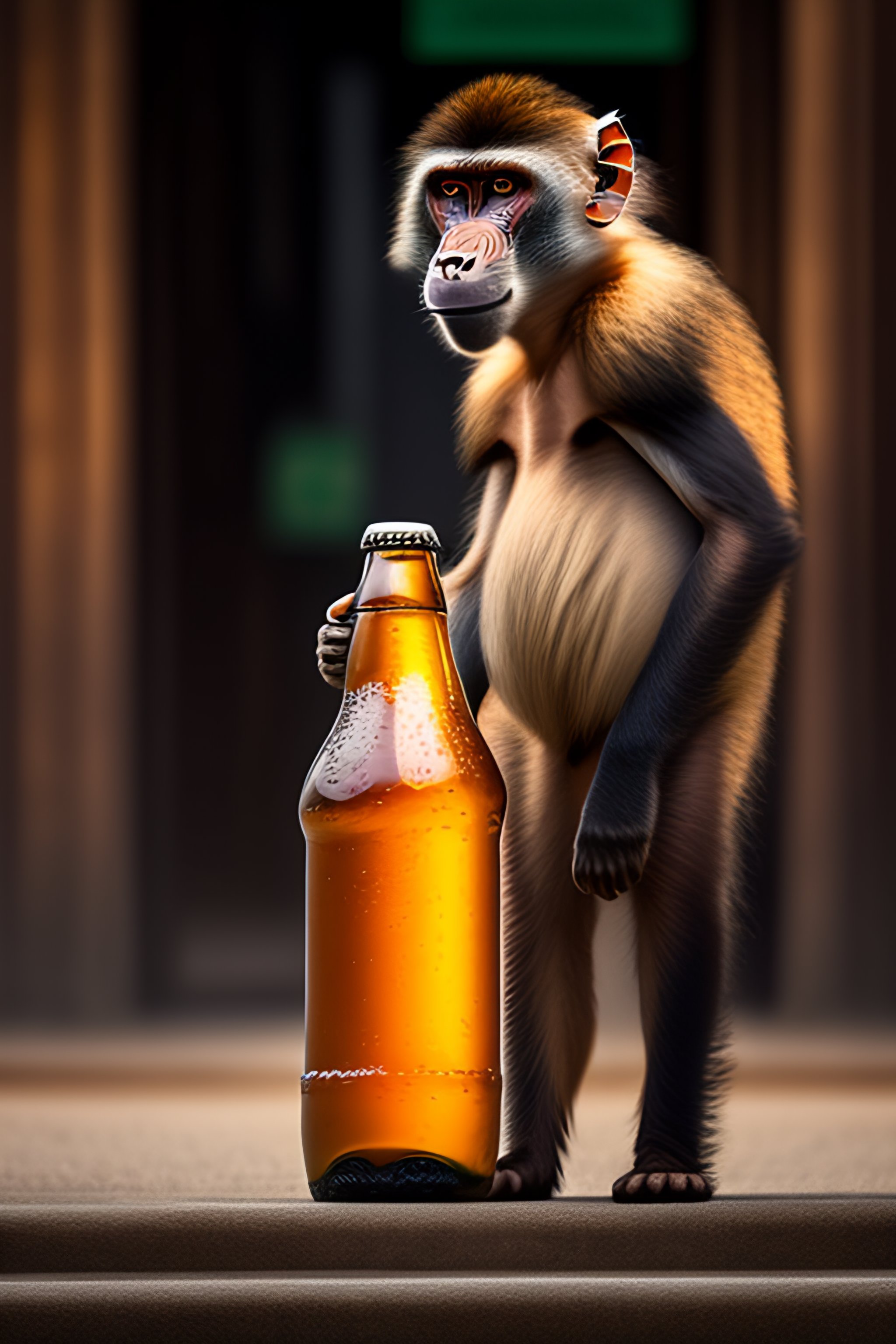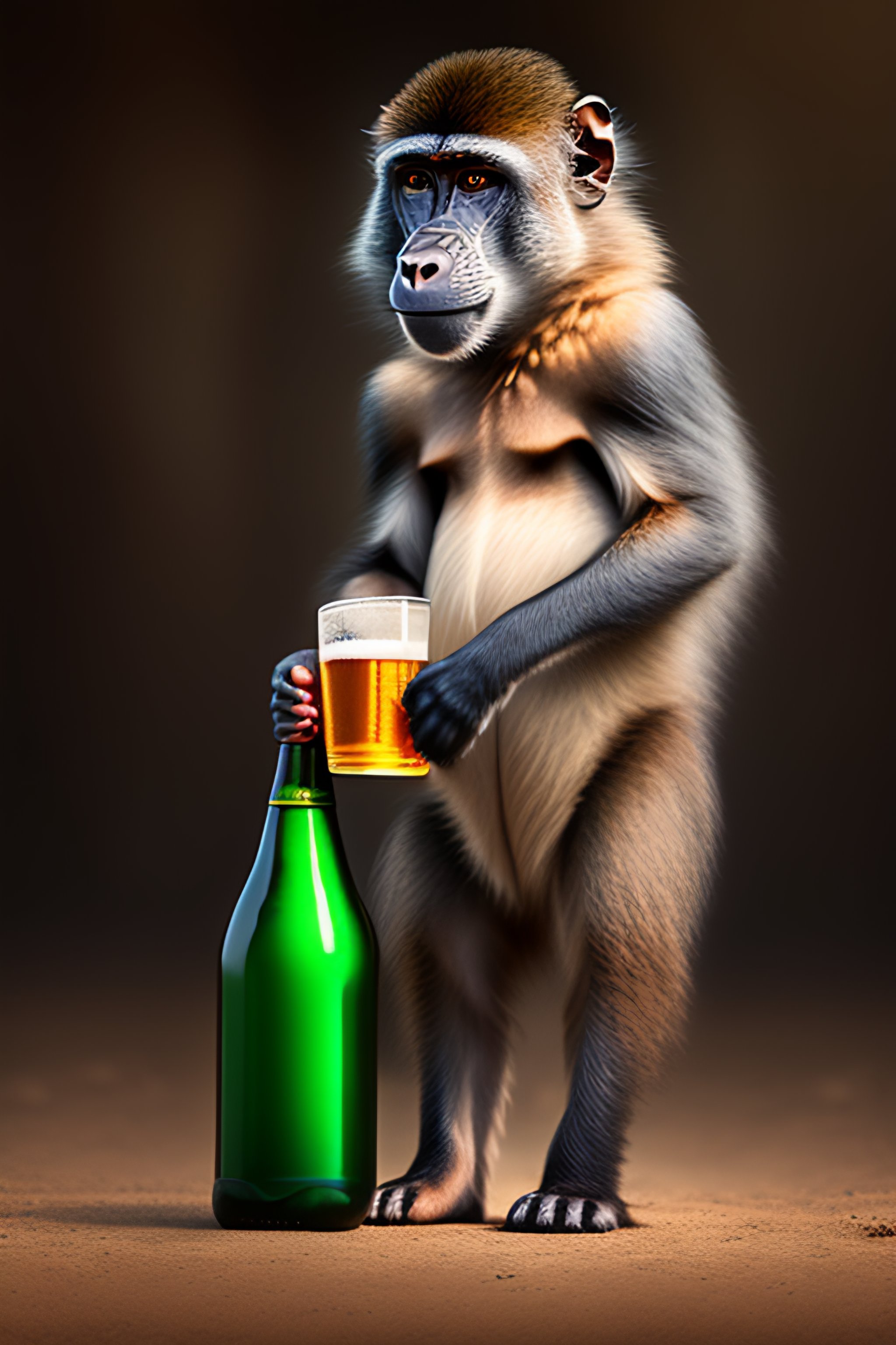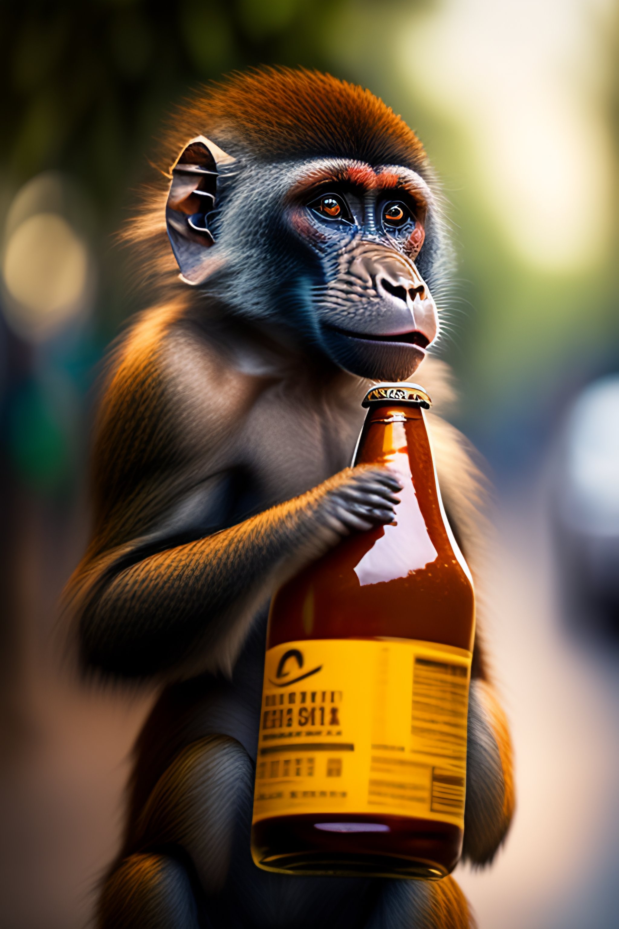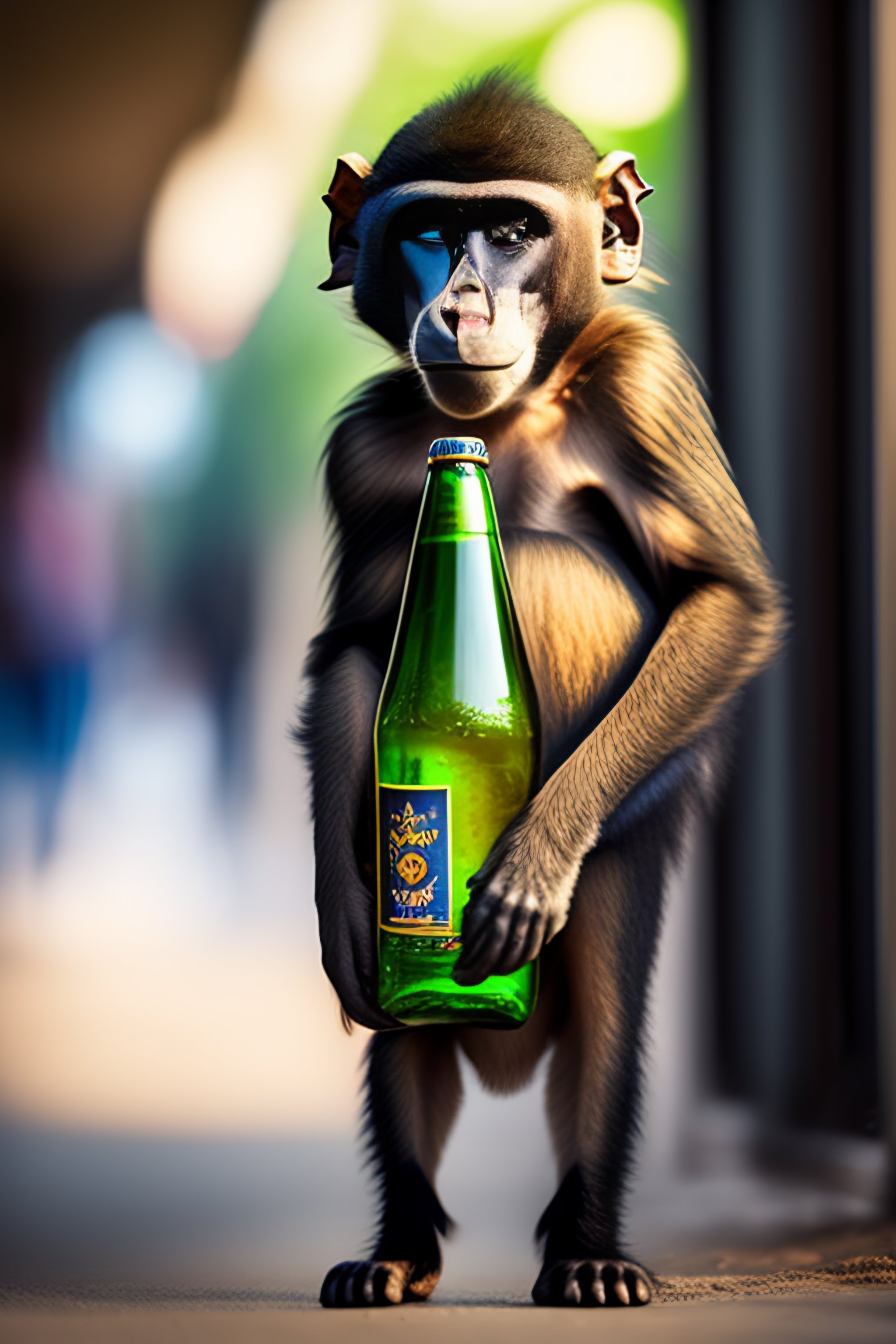 A sad baboon standing with a plastic supermarket bag in one hand and a beer bottle in another hand