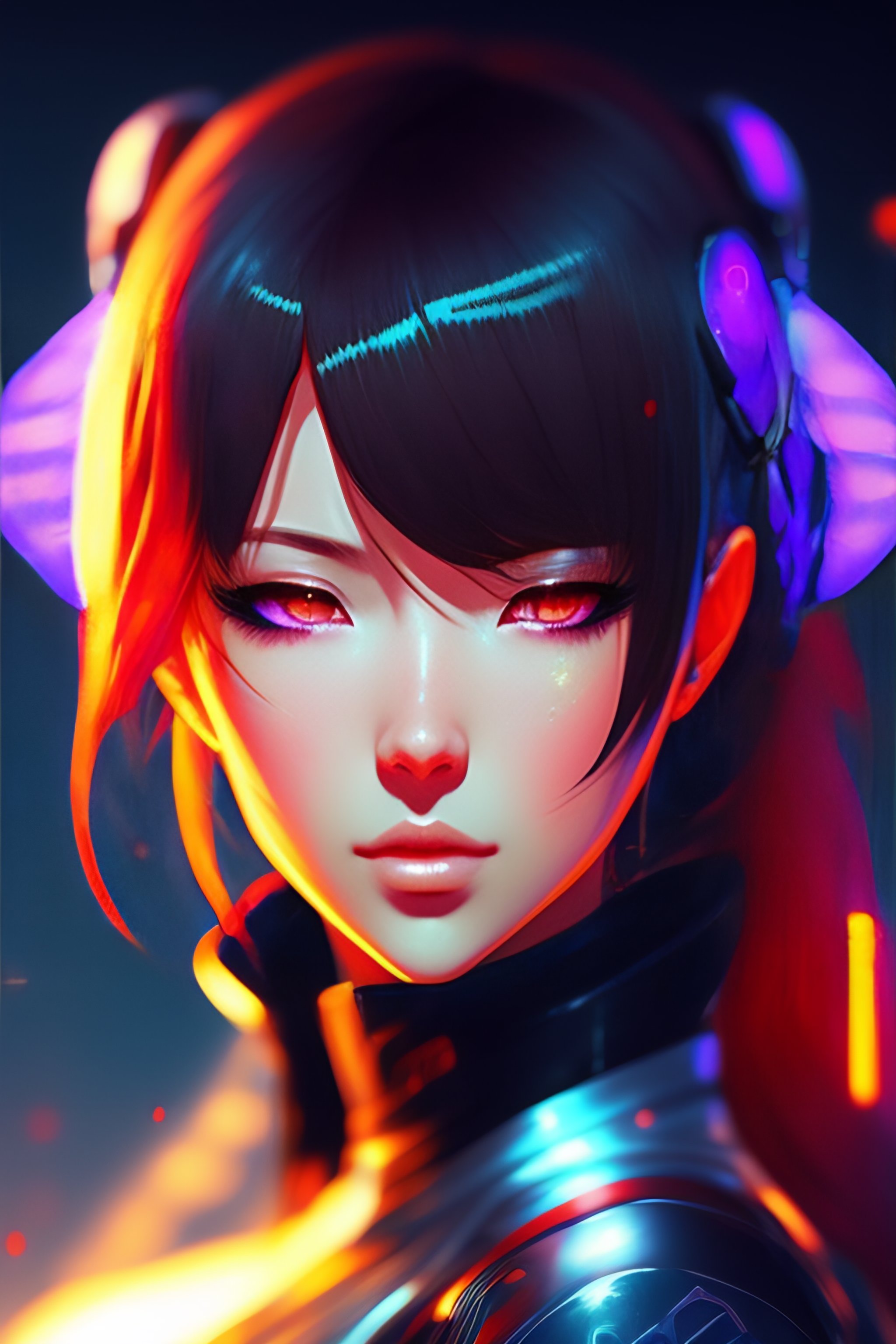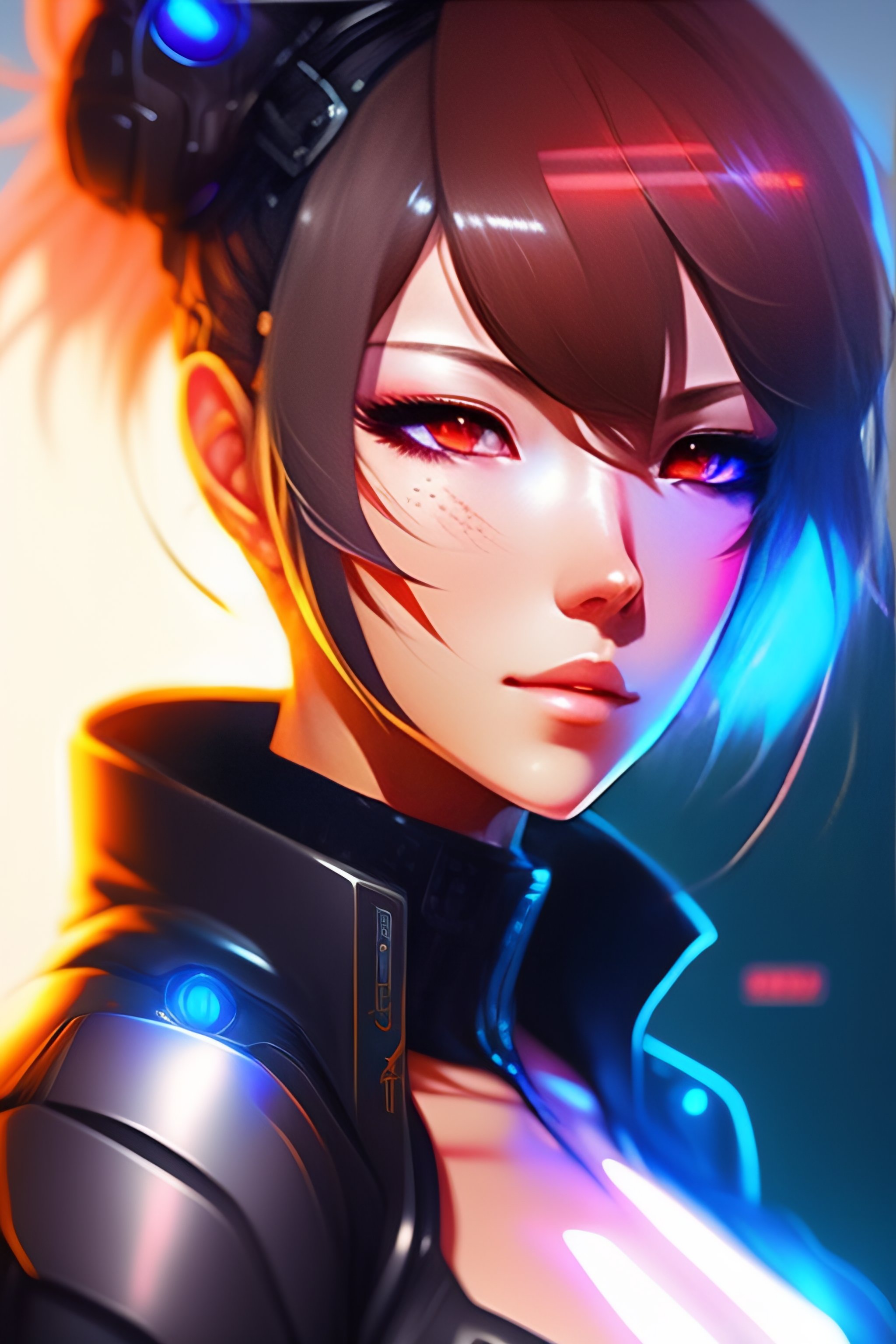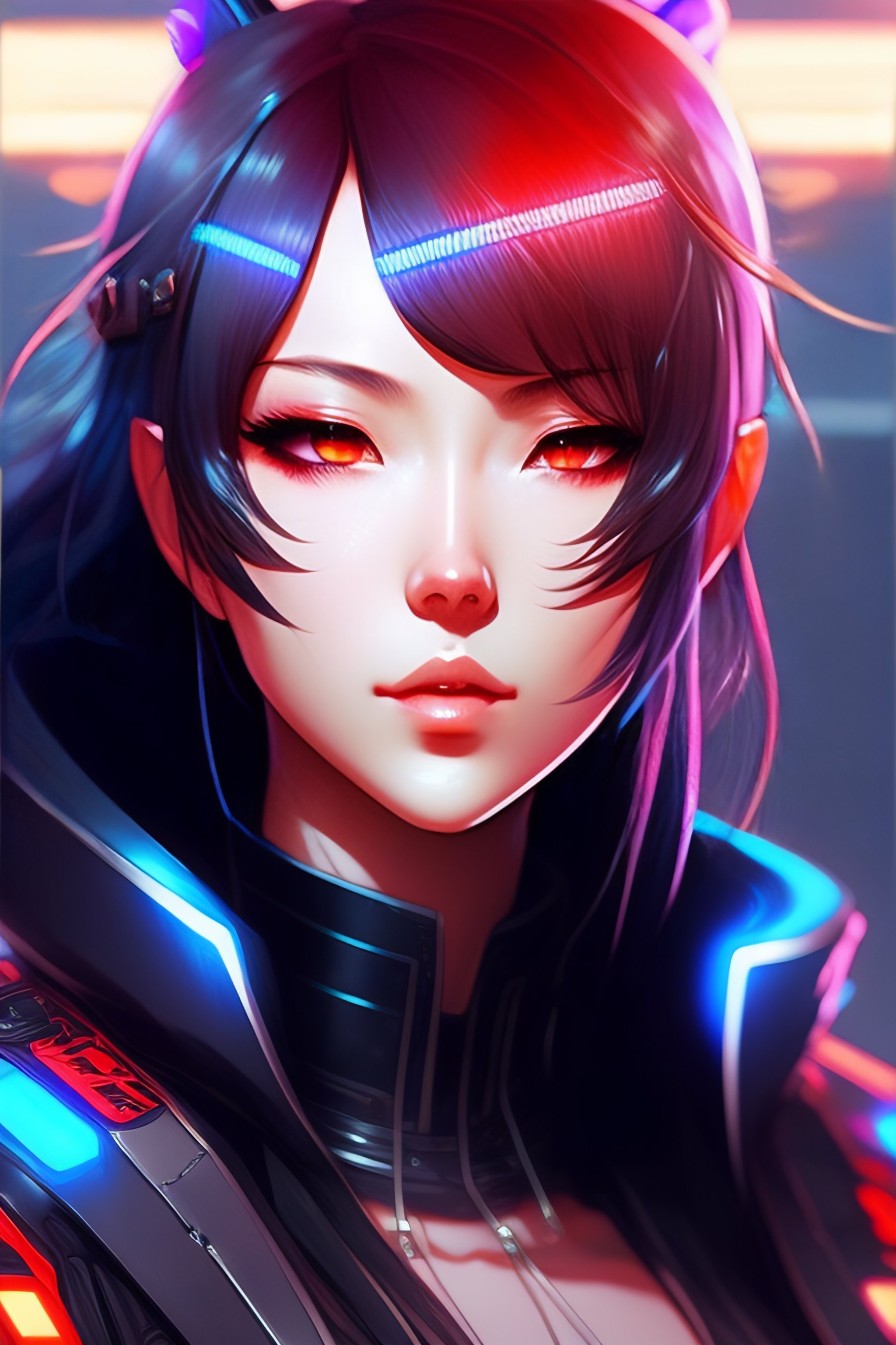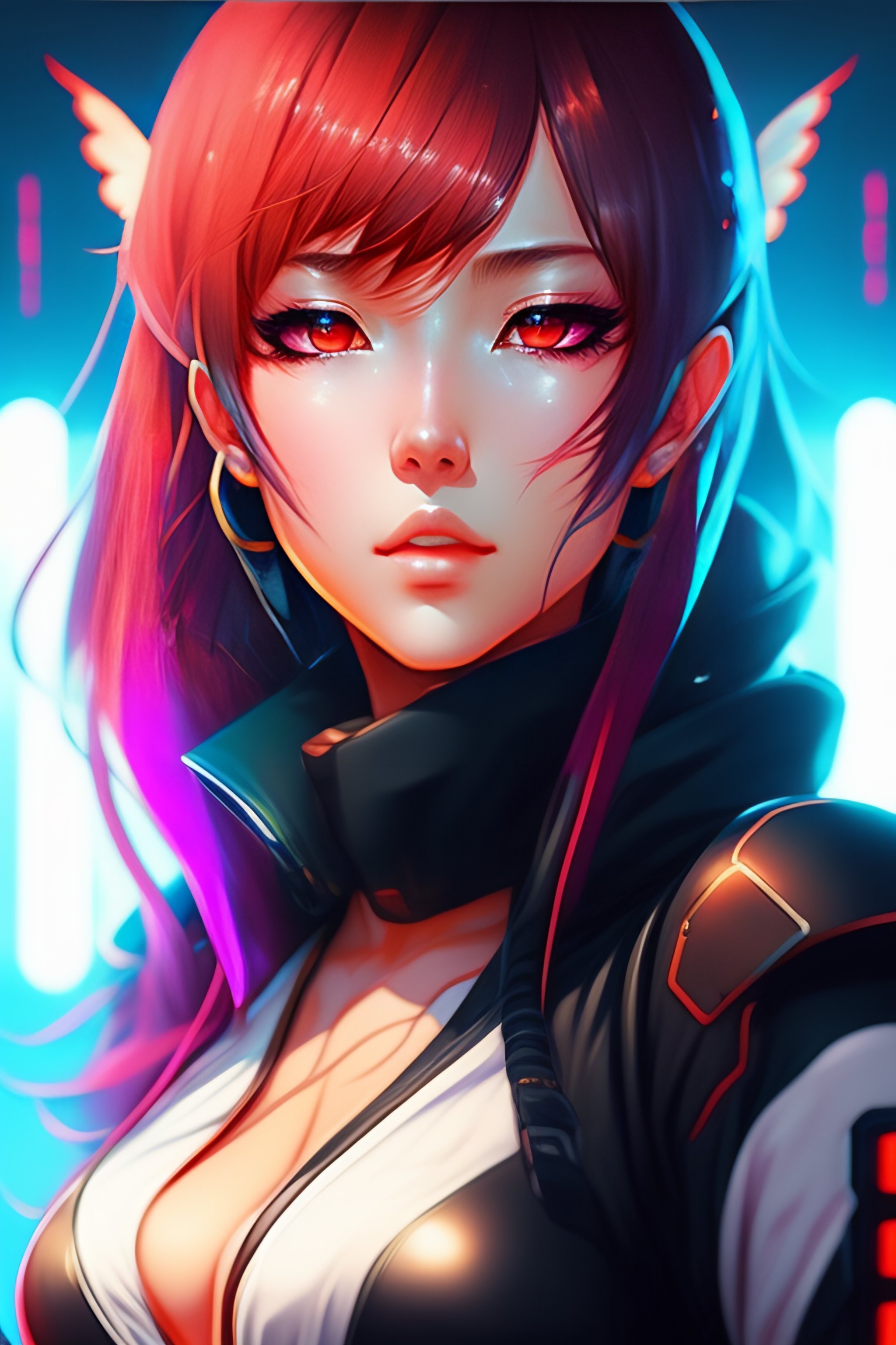 Digital cyberpunk anime character concept art, gorgeous anime girl symmetrical face, small female android cyborg - angel, glowing red left eye and glowing blue right eye, fullbody!! wlop, rossdraws sakimimichan, ilya kuvshinov, krenz cushart, greg rutkowski.