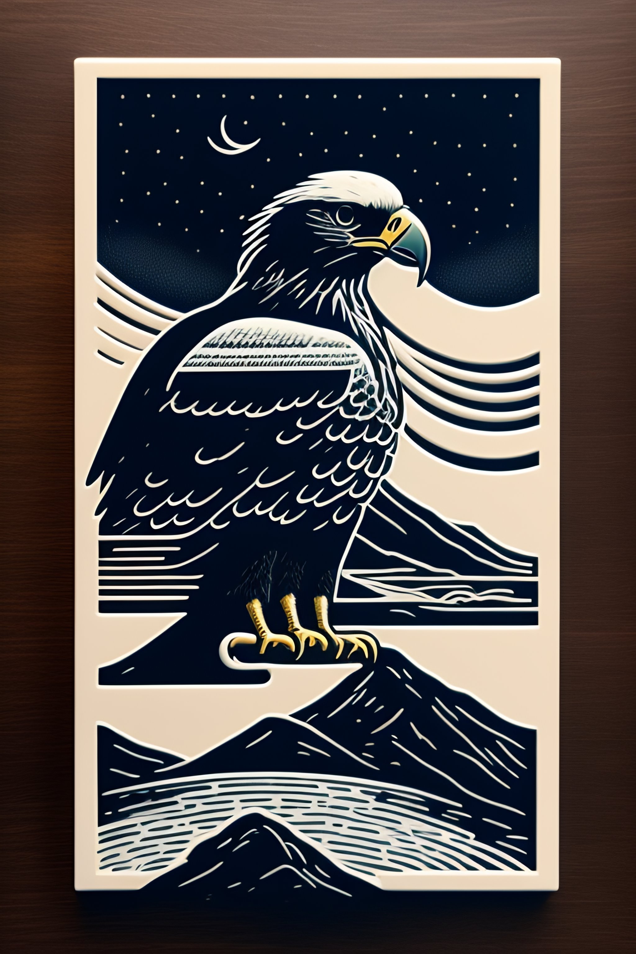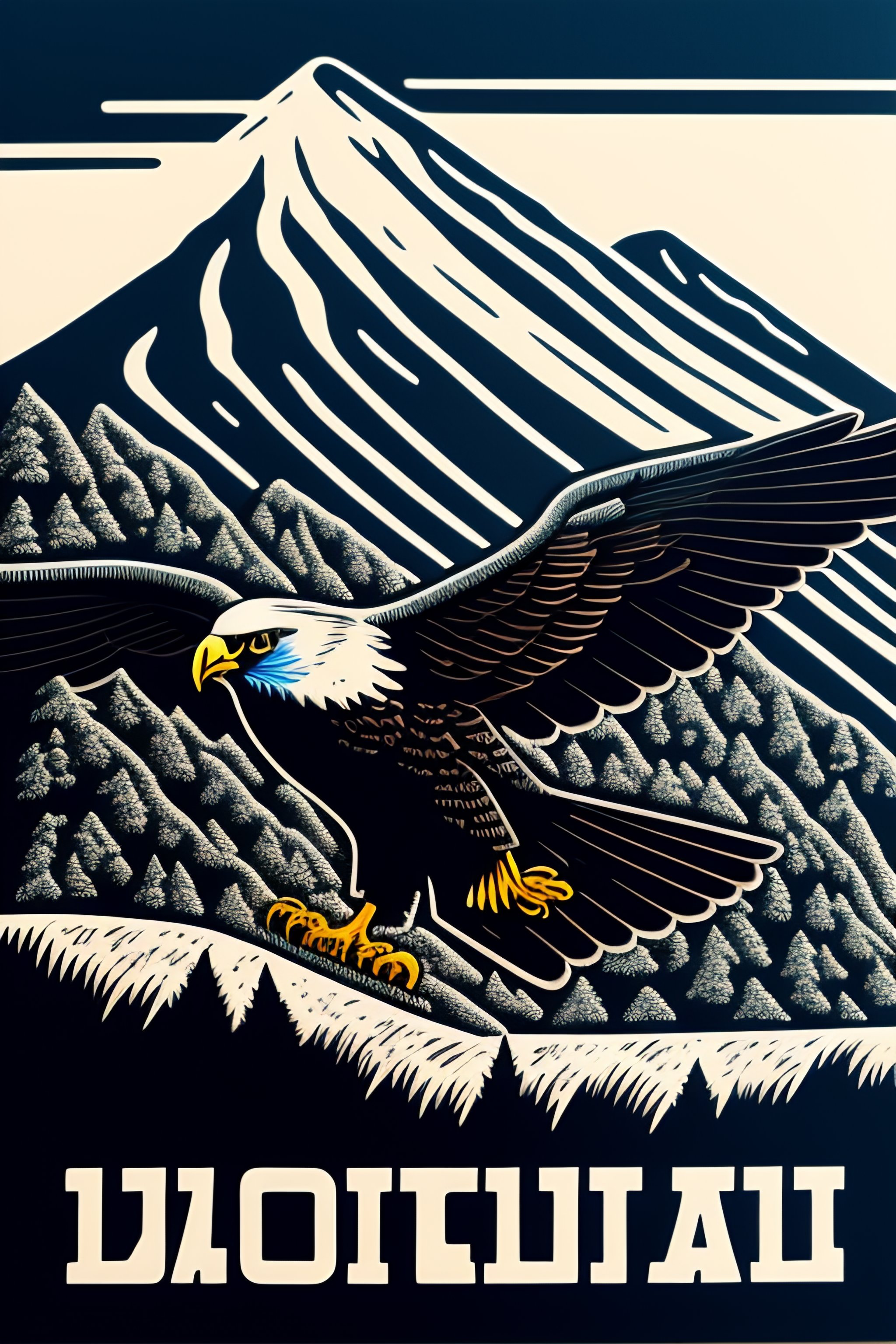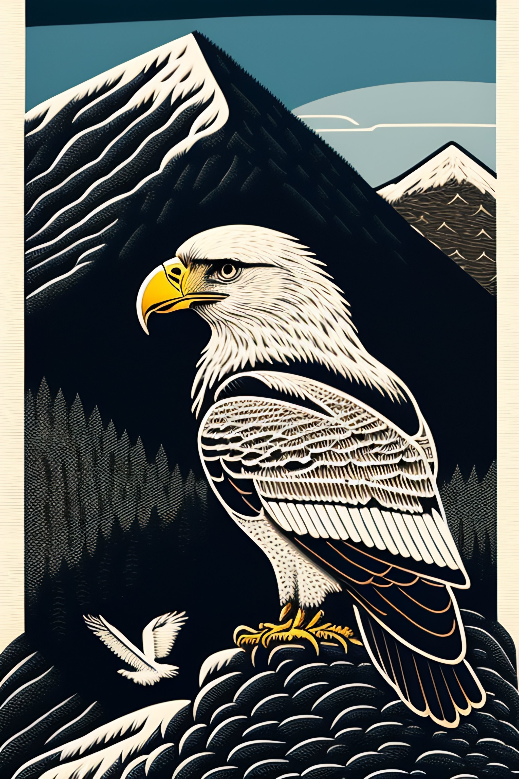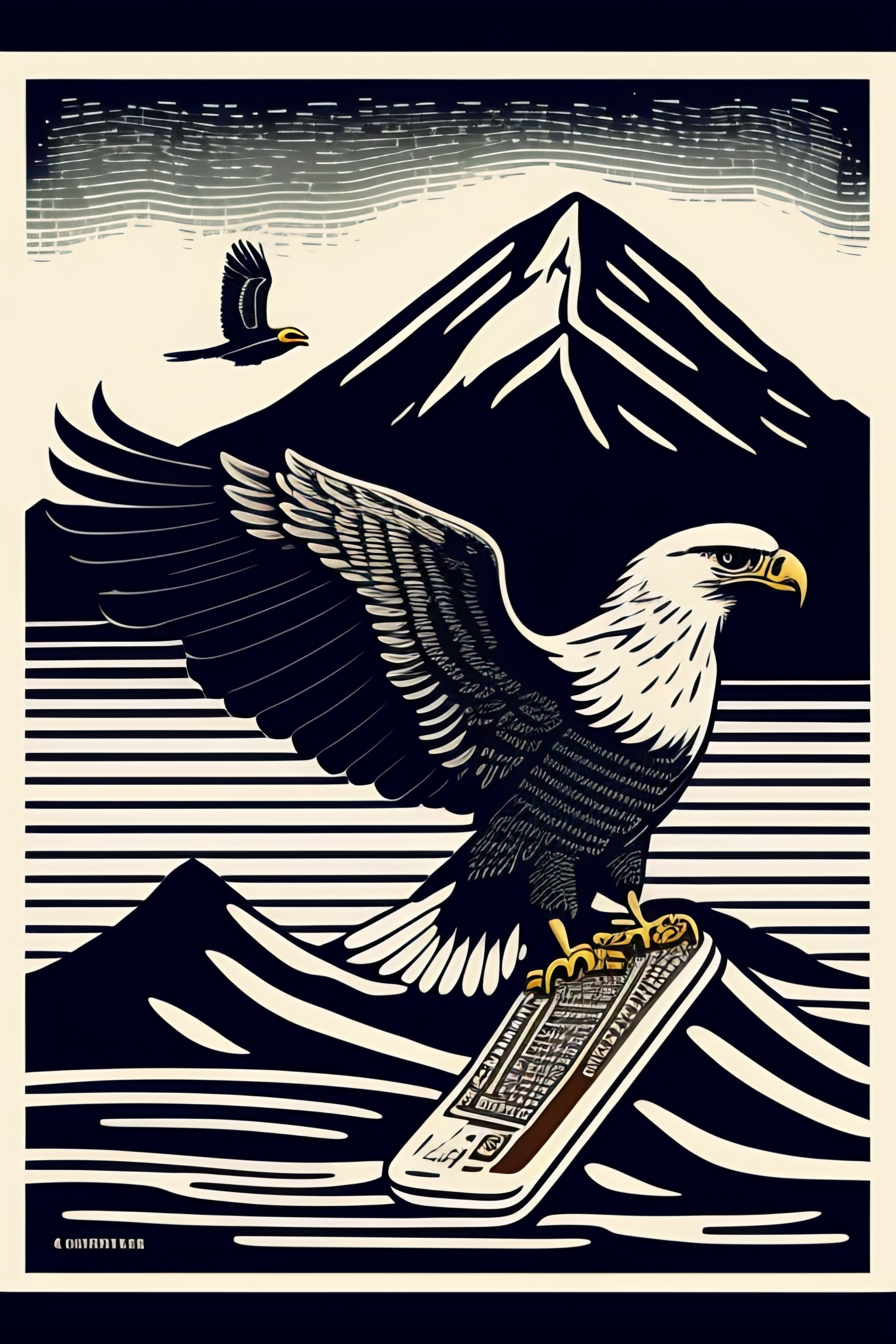 An stunning winning linocut of an eagle carrying a computer mouse, cord dangling, mountain in the background