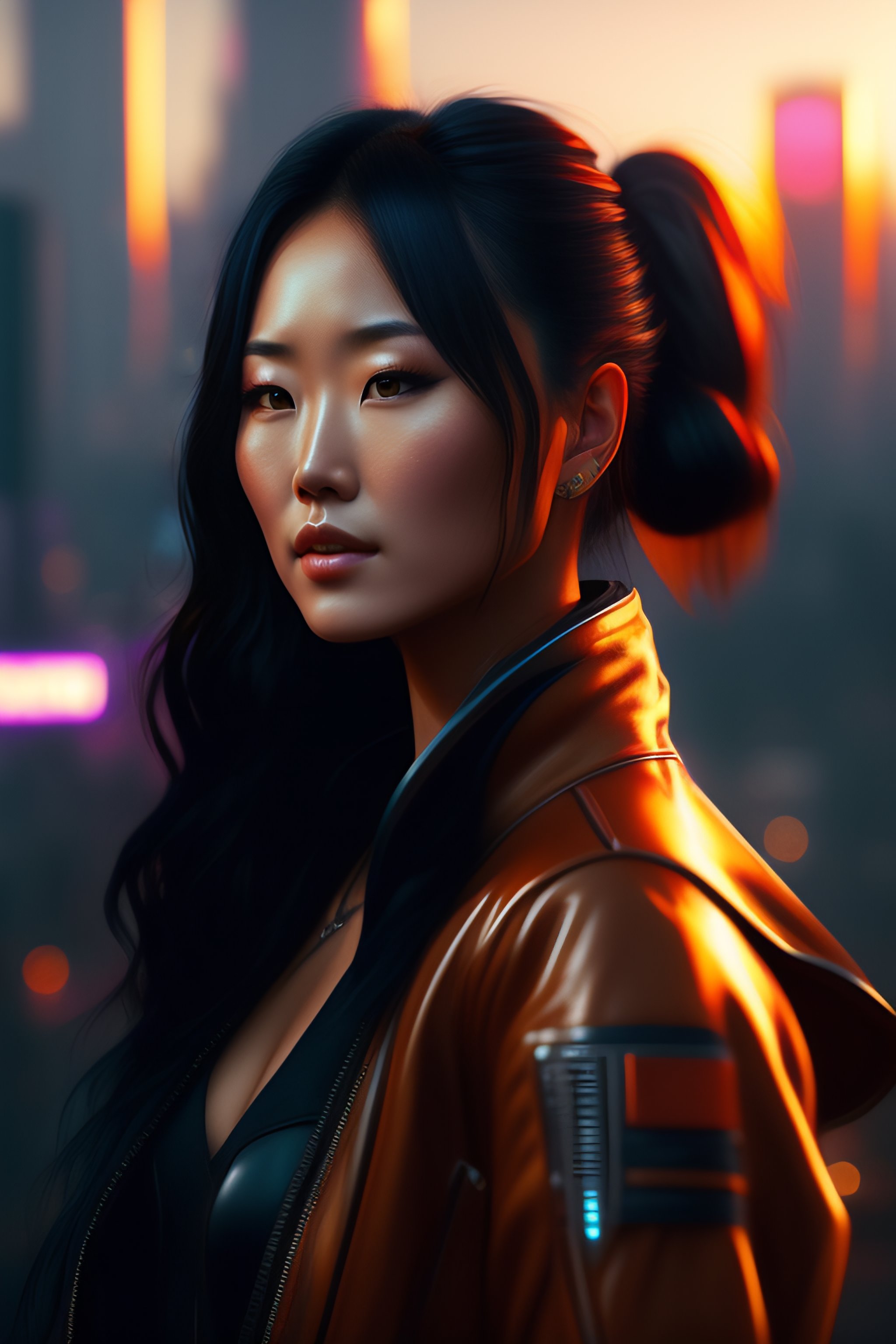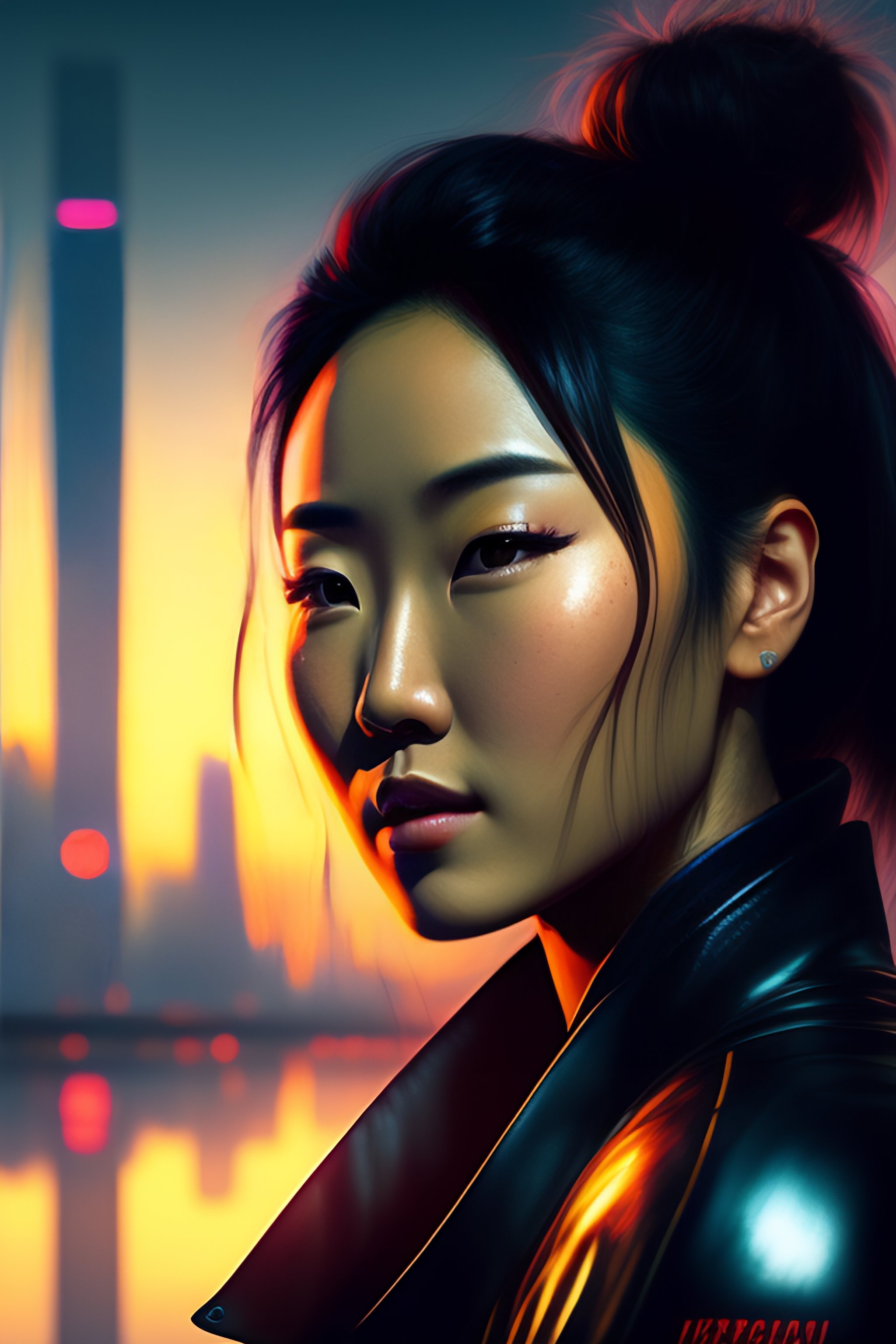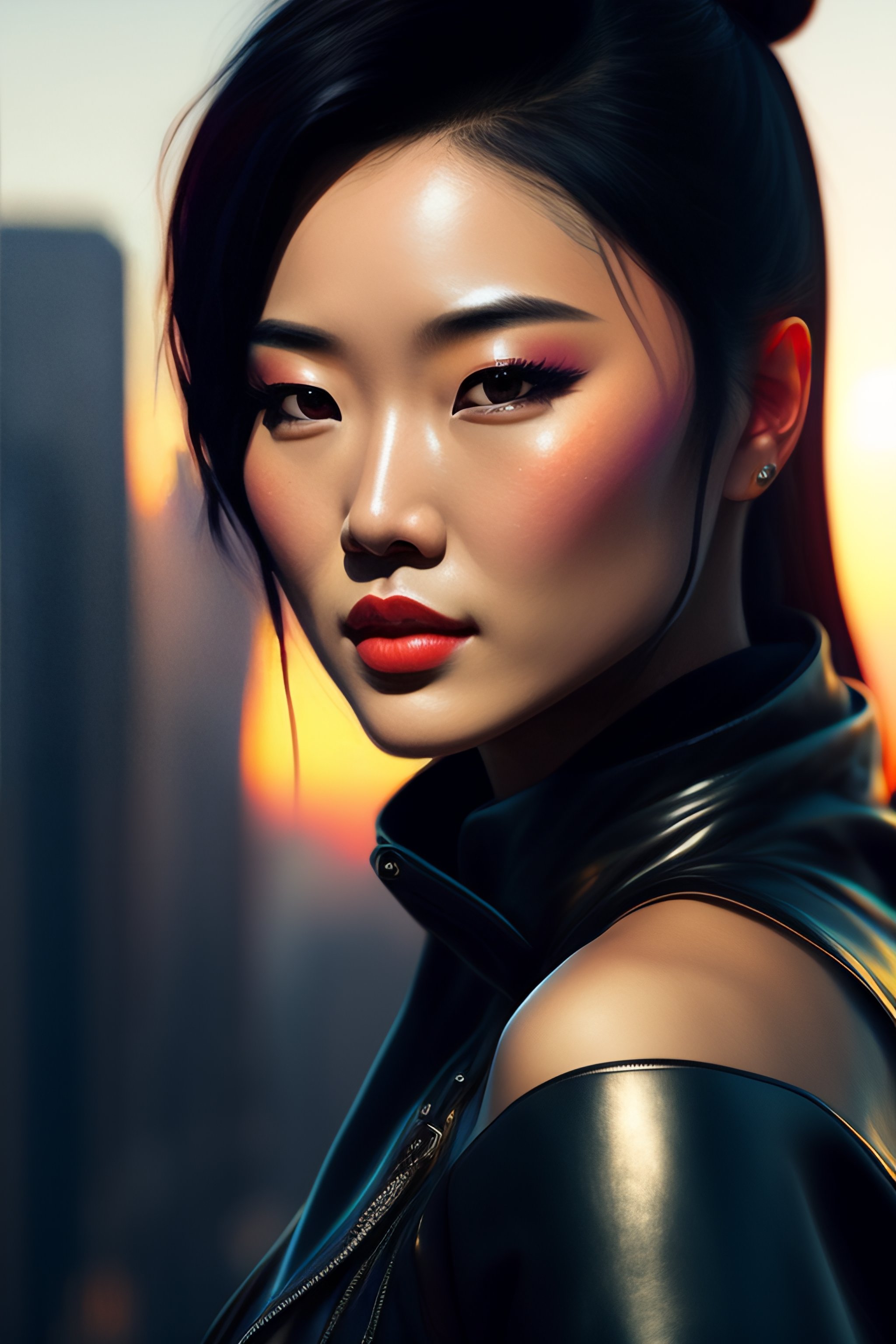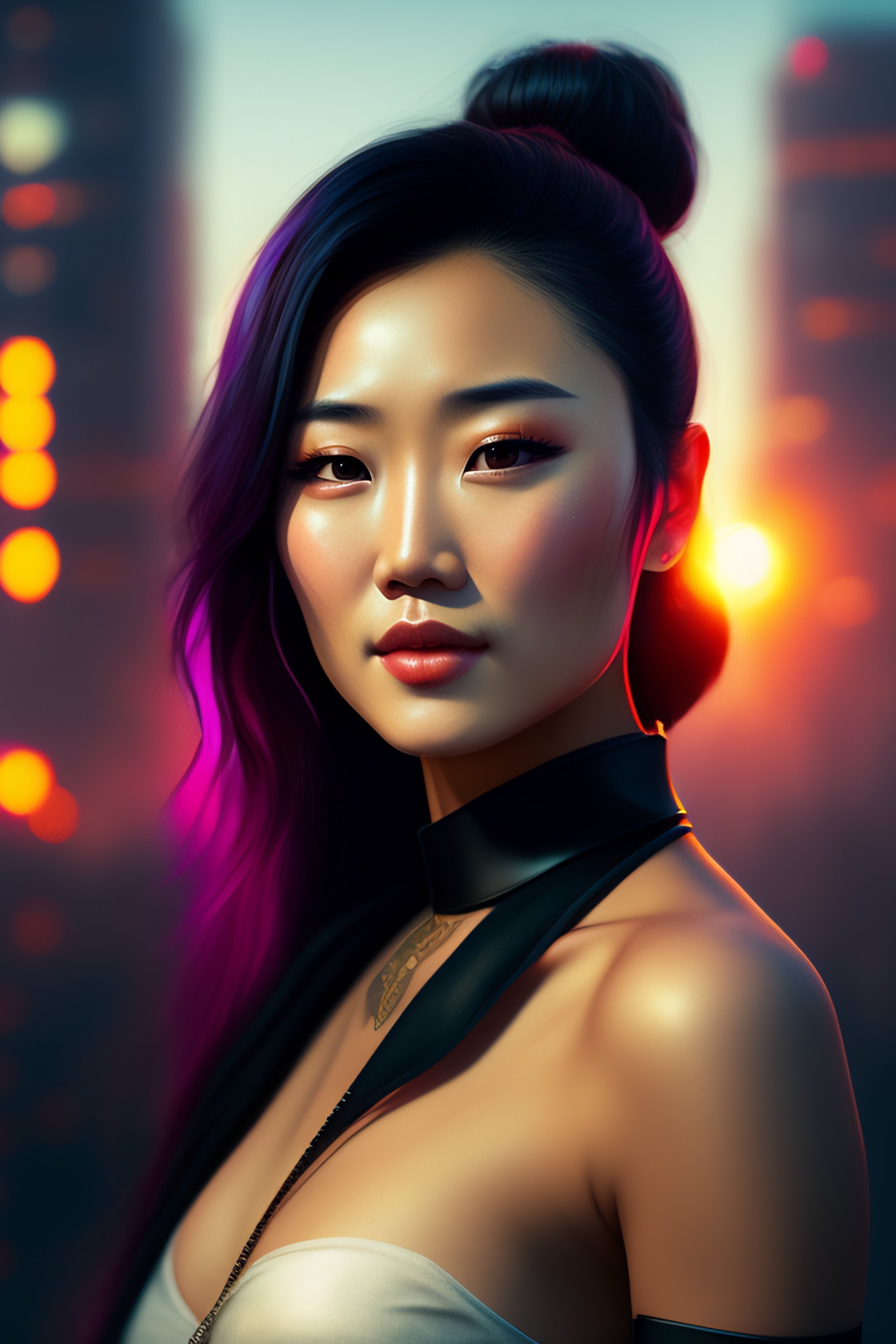 Karen fukuhara, closeup portrait of a young beautiful cyberpunk woman, mirror eye implants, black hair in a rough bun, sunset, neuromancer, street samurai, cyberpunk city background, megacity, gorgeous view, depth, painted by seb mckinnon, high detail, digital art, painted by greg rutkowski, trending on artstation