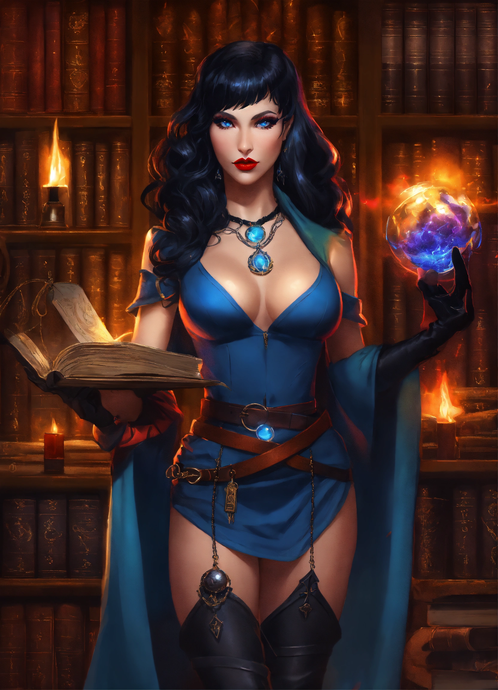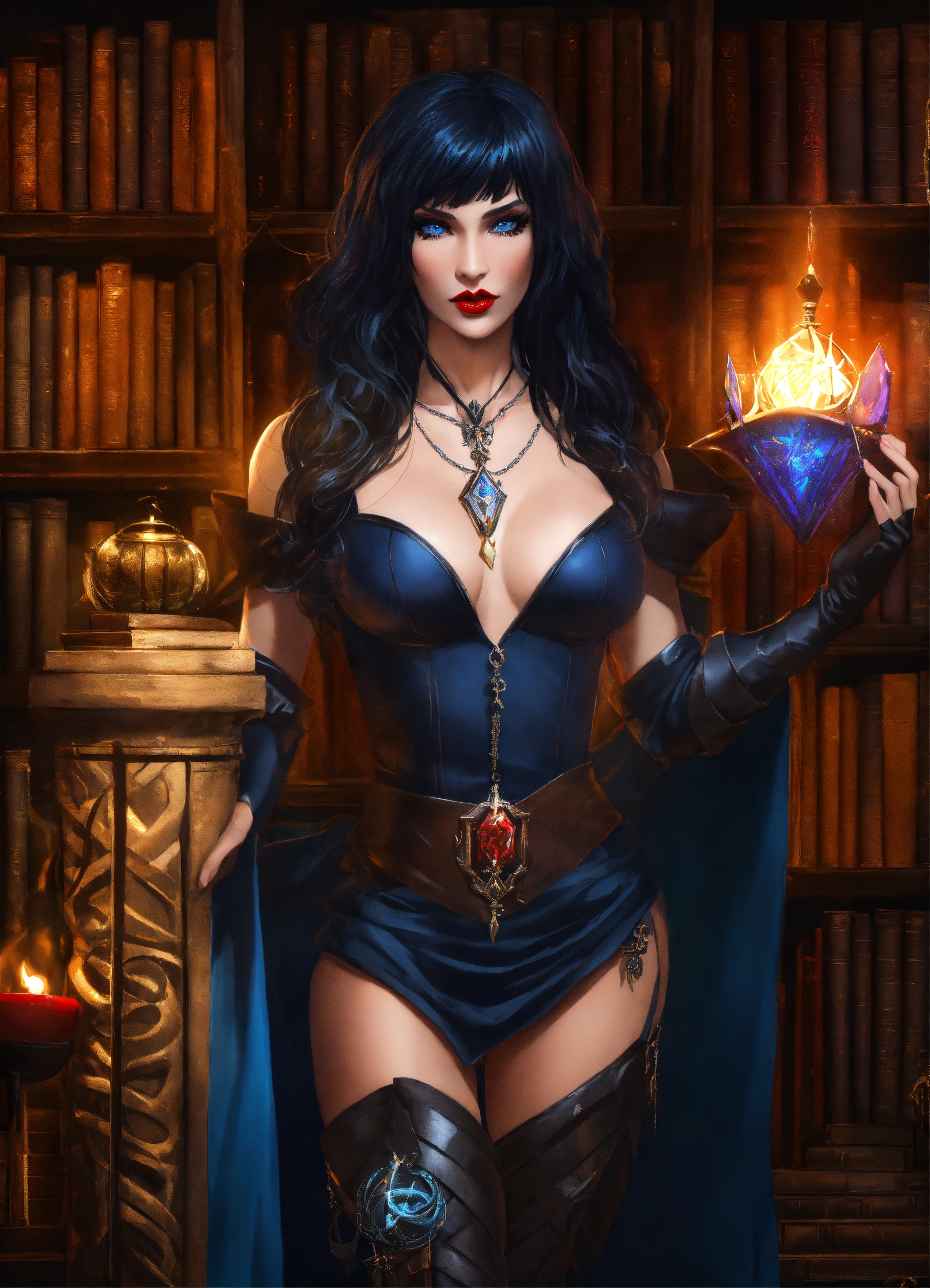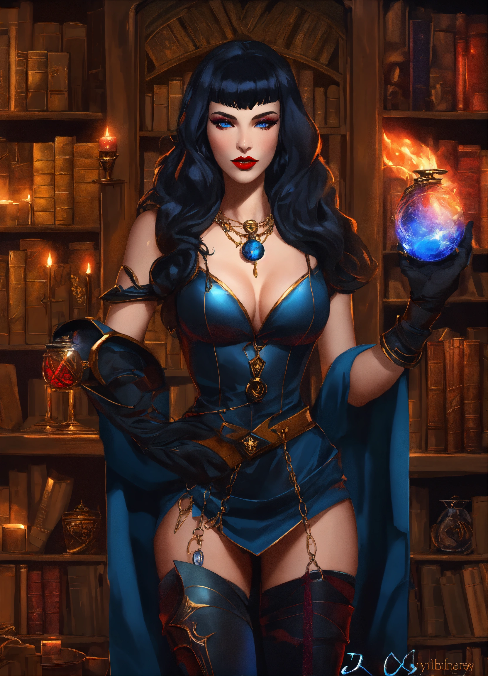8k, fantasy art, arcane library background, enchantress, 5 feet tall, petite build, smaller bust, spell casting pose, long full body dark black robes with arcane runes, bettie page hairstyle, blue eyes, fair skin, red lipstick, excessive dark eyeshadow, full body, high boots, long gloves, arcane runed necklace