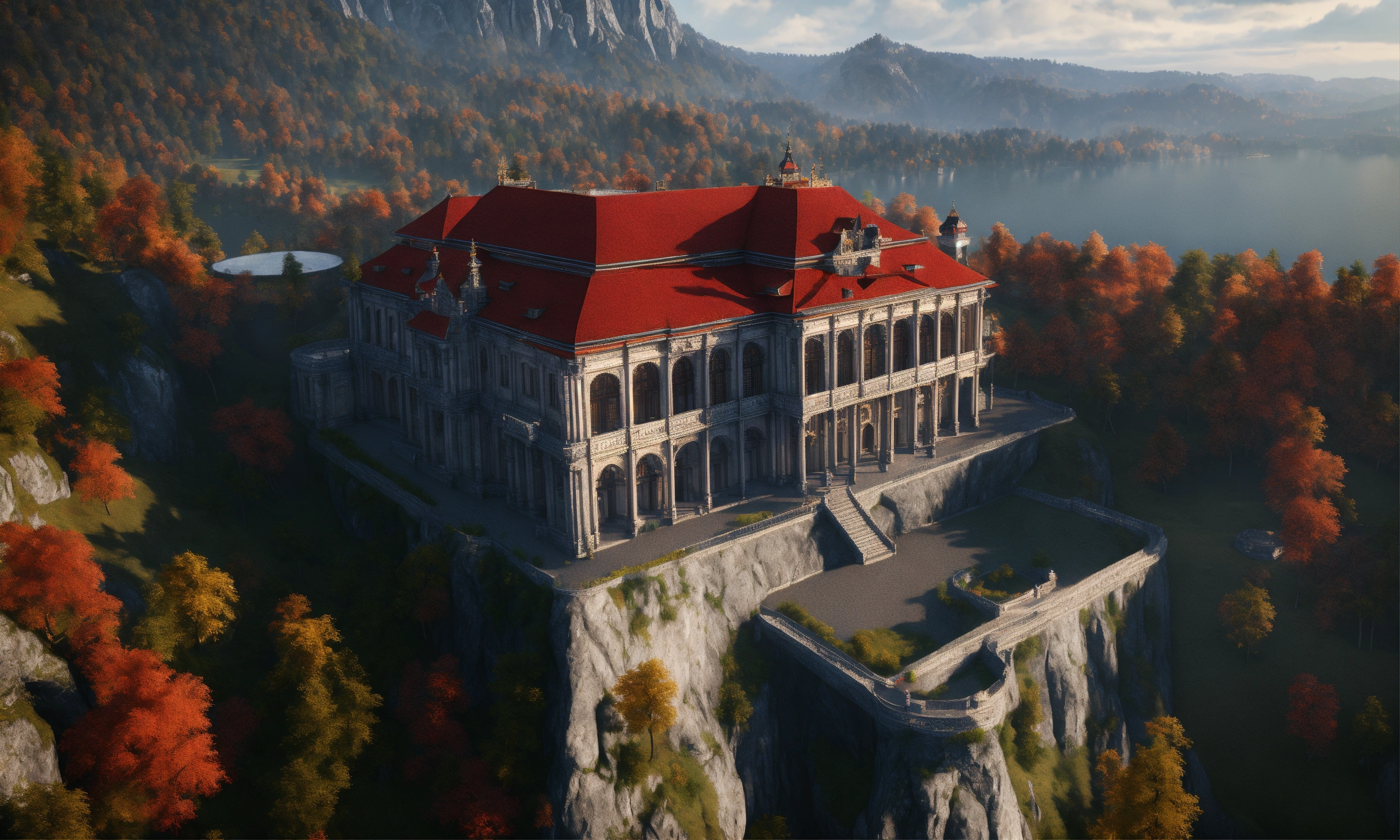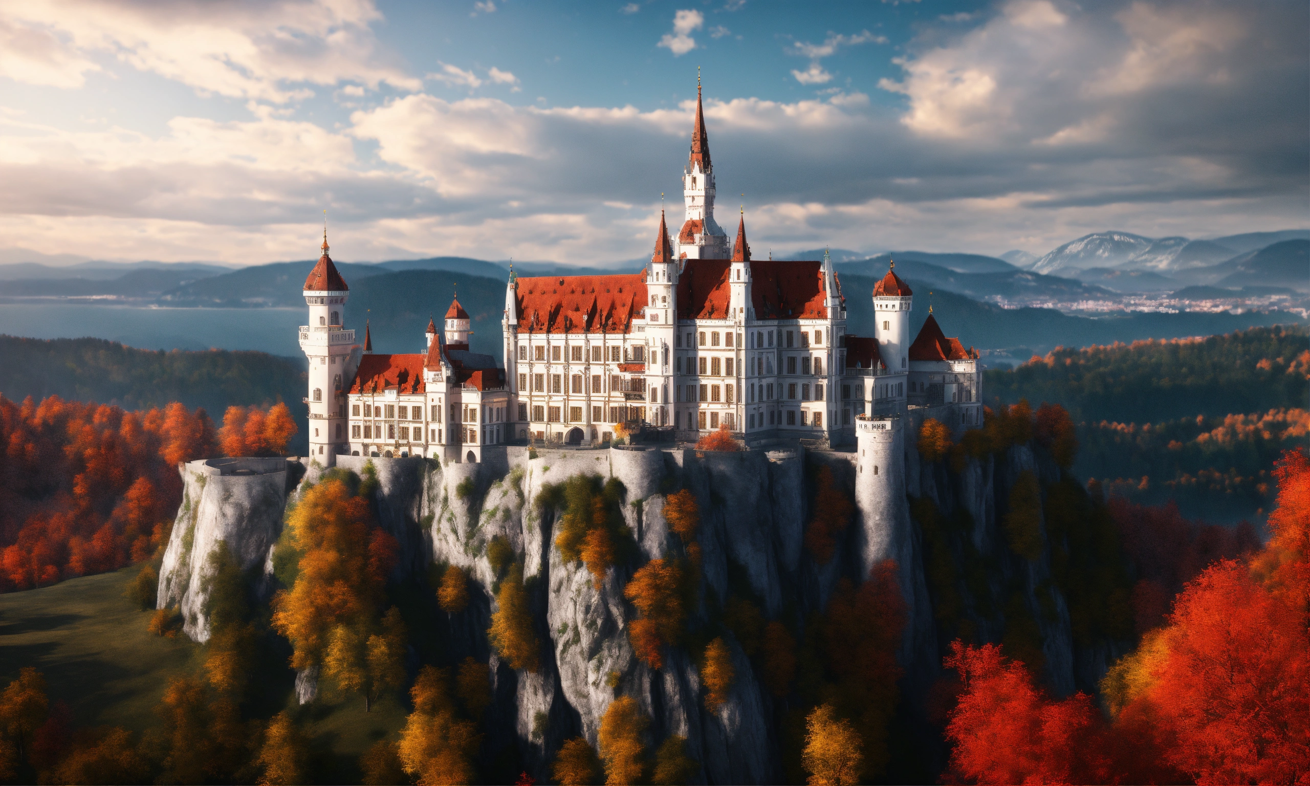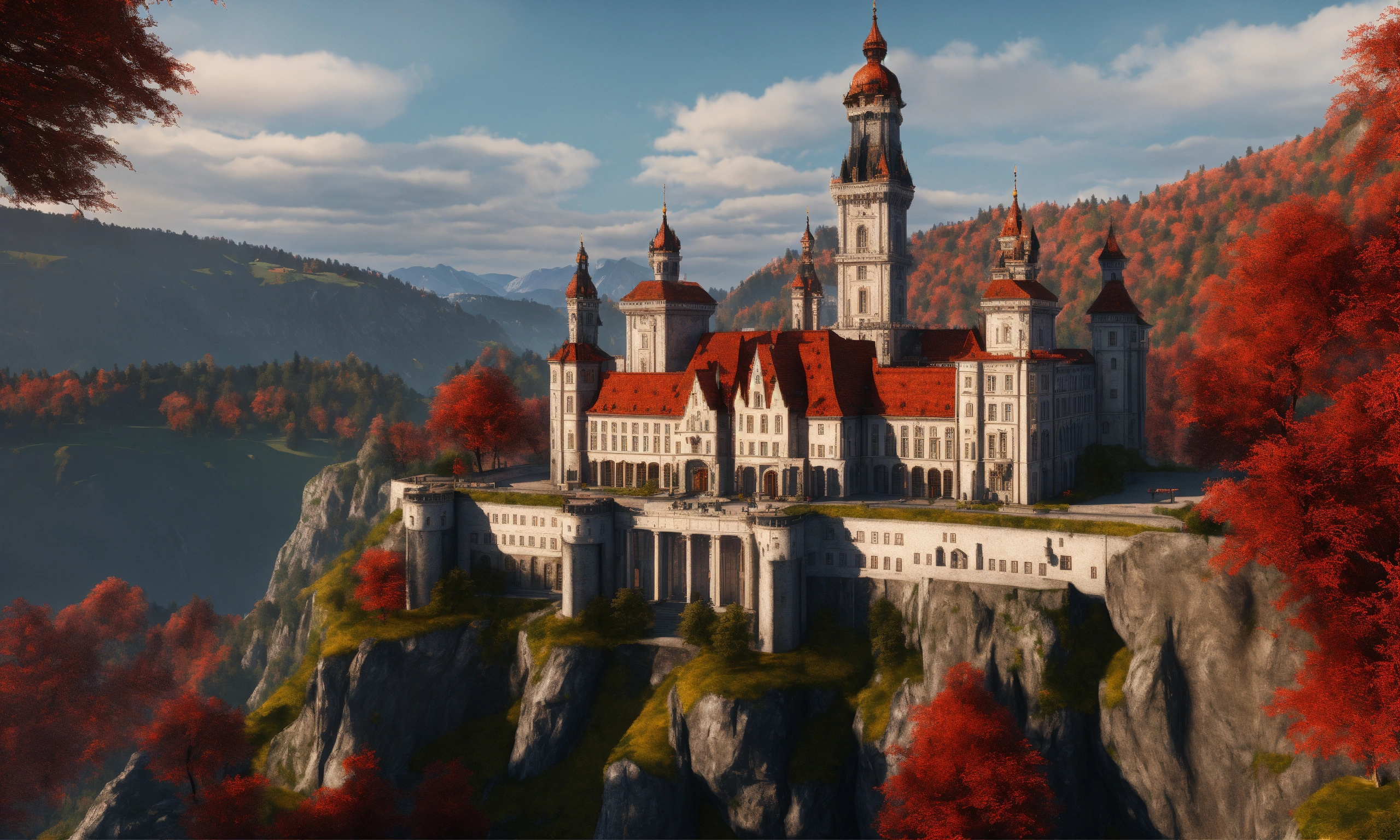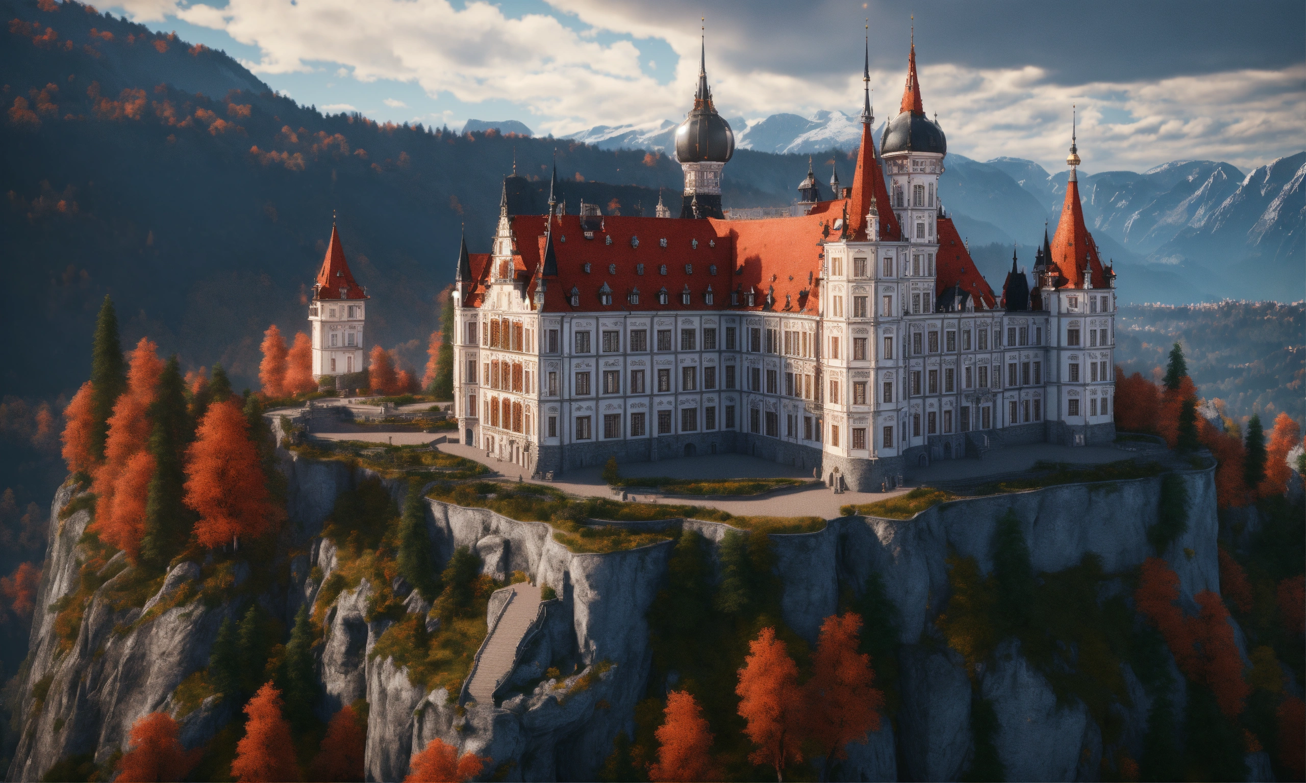 Full image of a massive silver and black royal palace with an red roof on a cliff overlooking bavaria, german architecture, highly detailed, unreal engine, 8d
