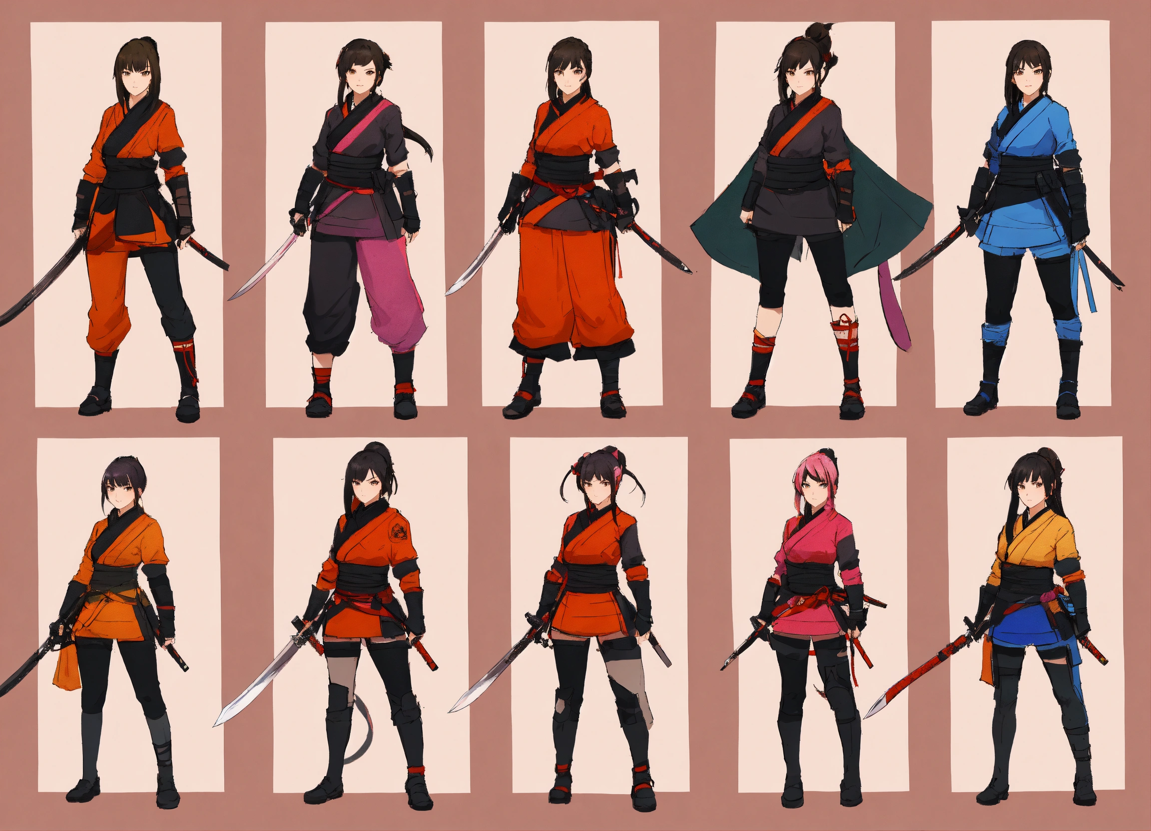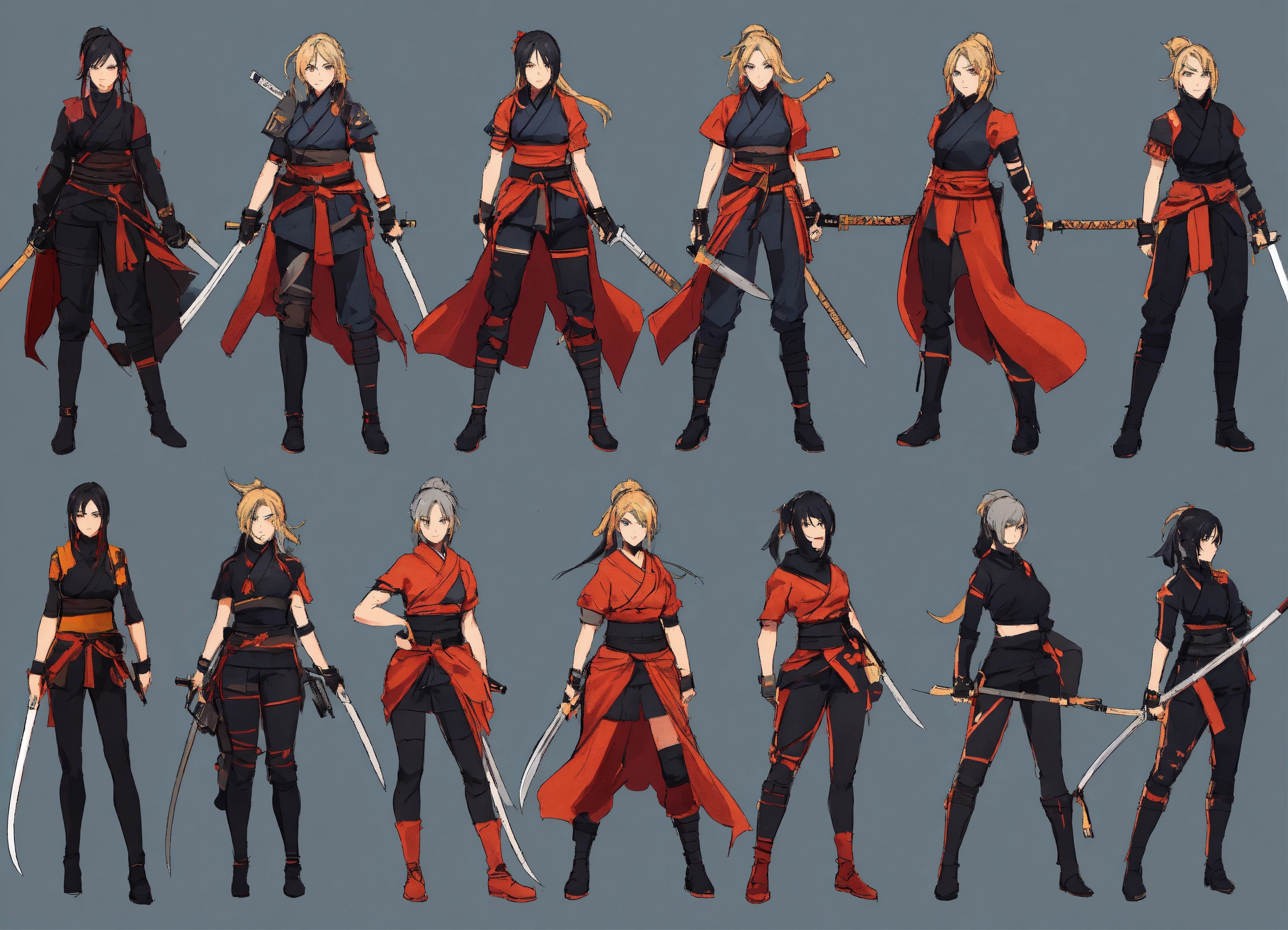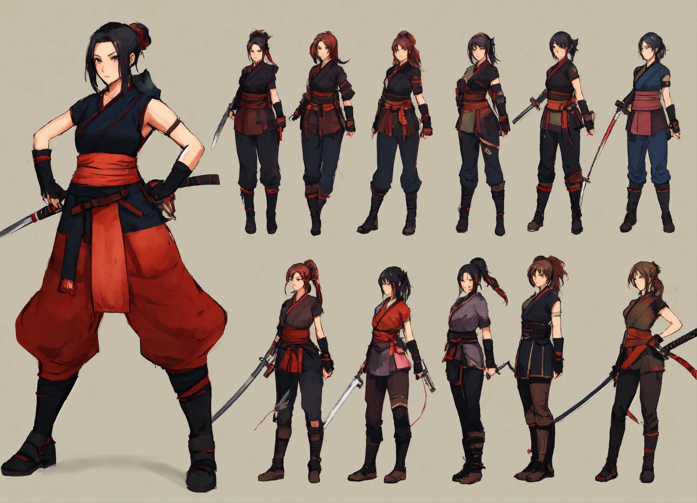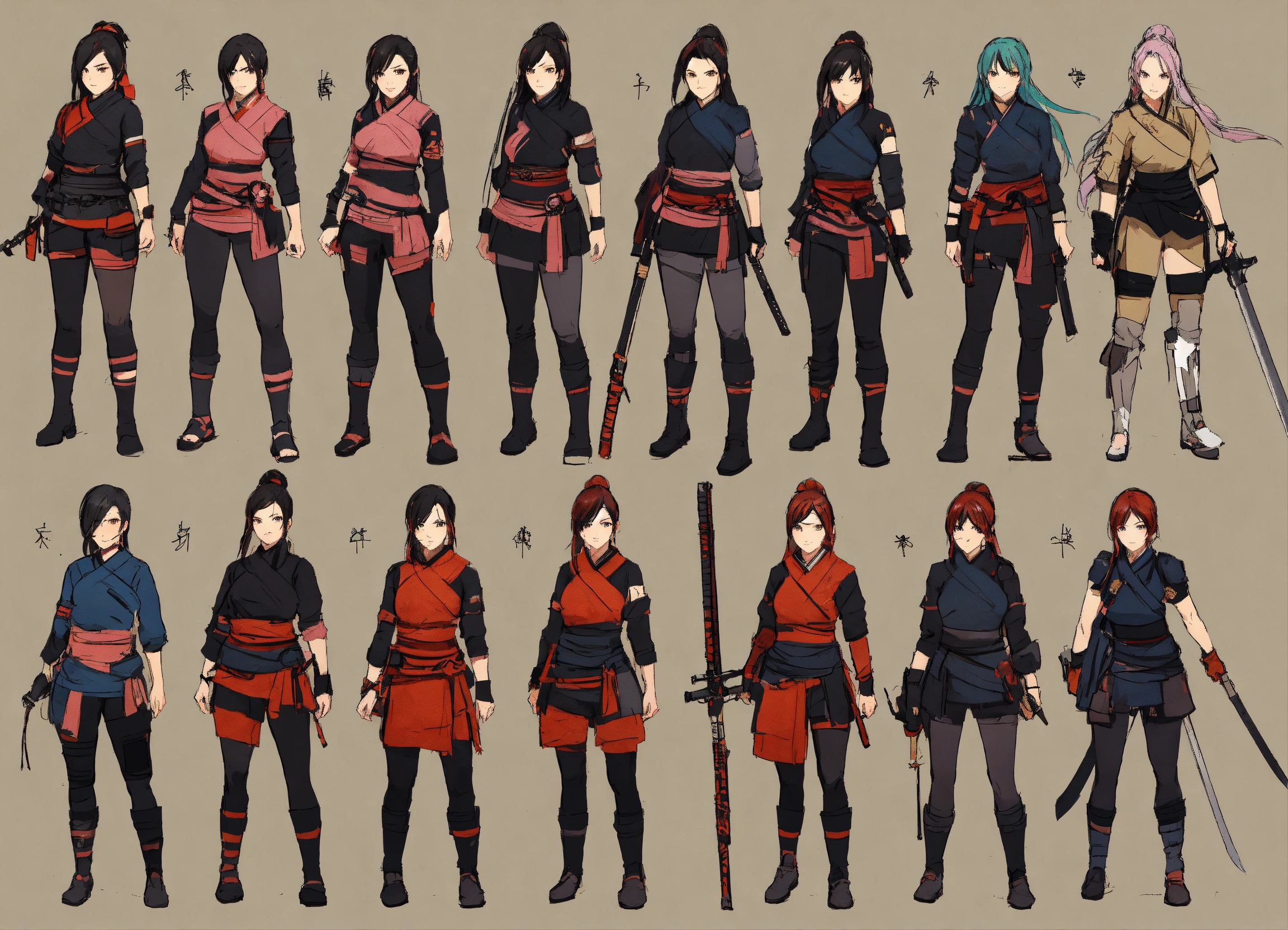 Concept art of kunoichi, 12 different designs with different weapons, wearing dark attire and all are women, rough sketches, with different hairstyles and color hair.