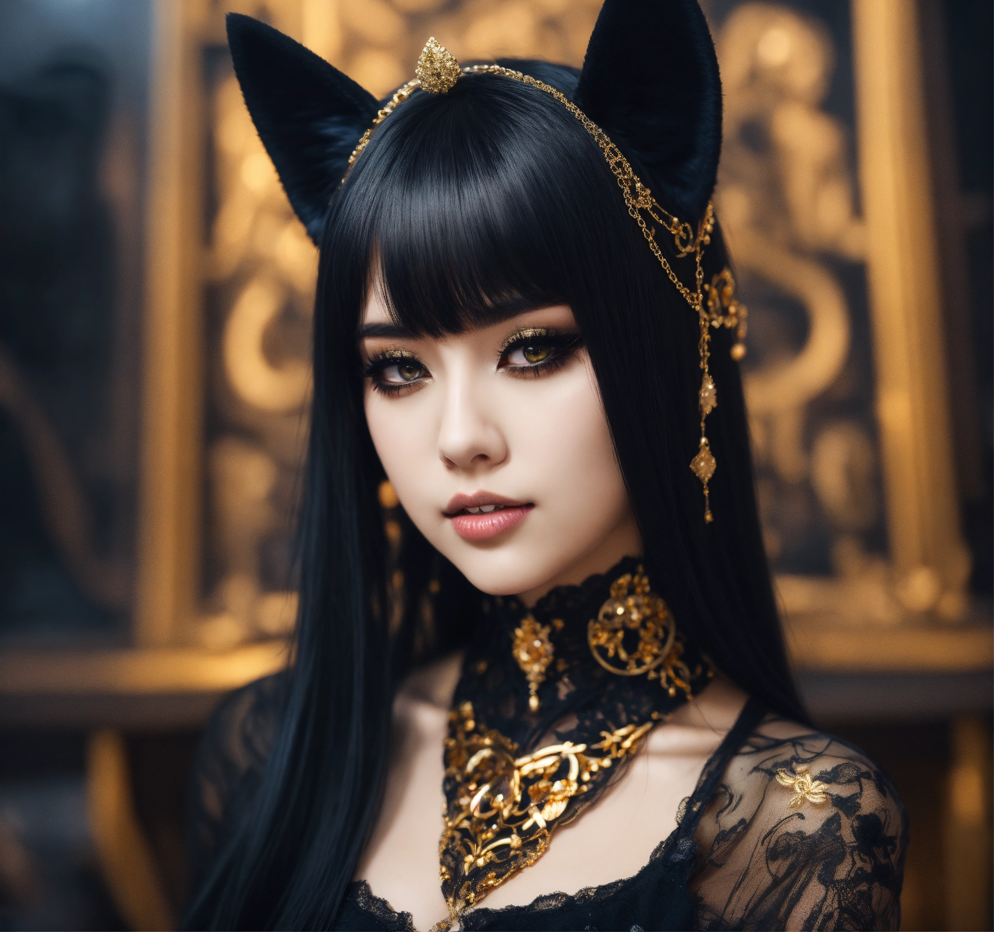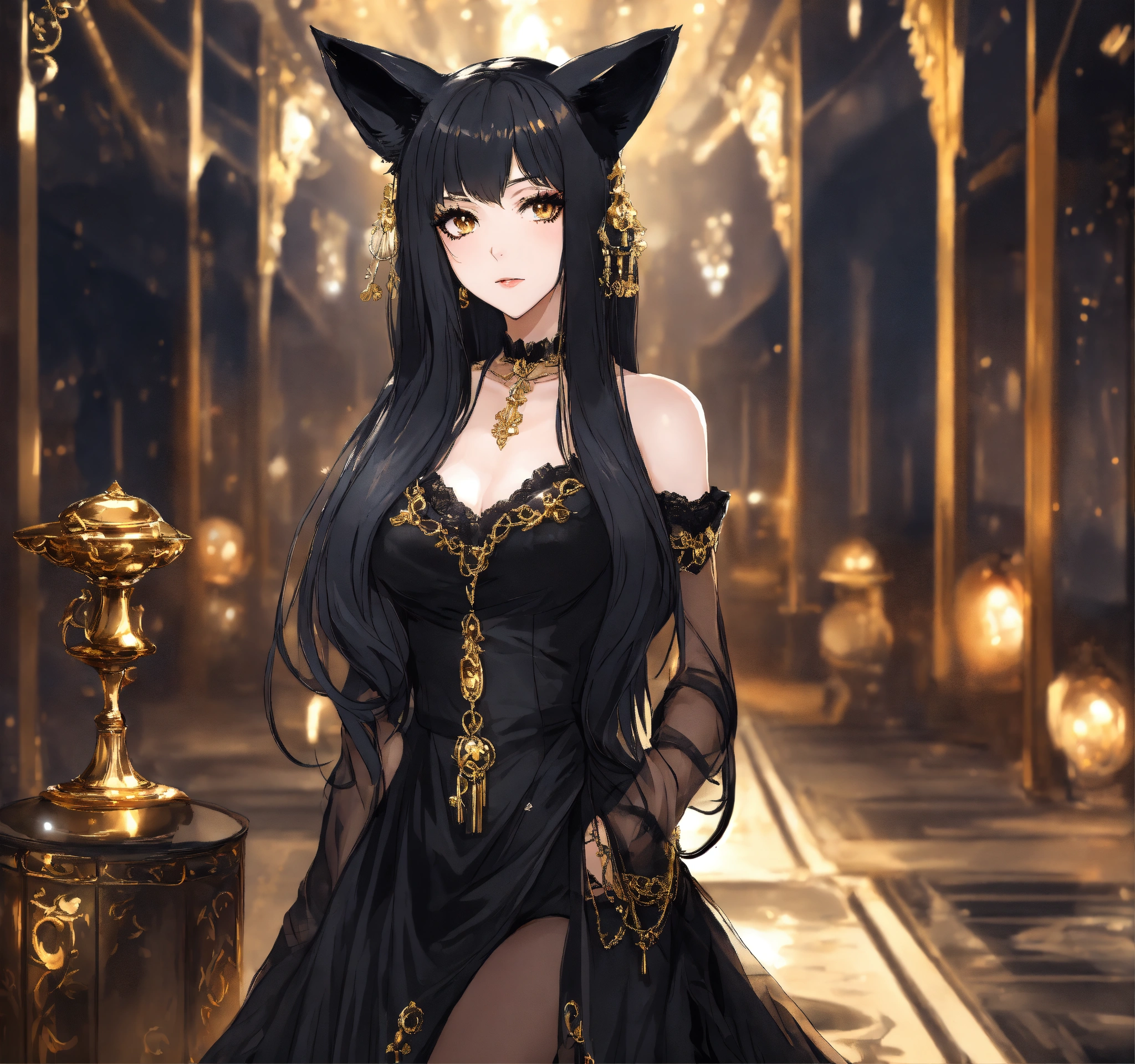 Beautiful woman with black only cat ears, long black hair, gold eyes, heavy black eyeshadow, wearing a black see-through dress with a long black tail, anime style