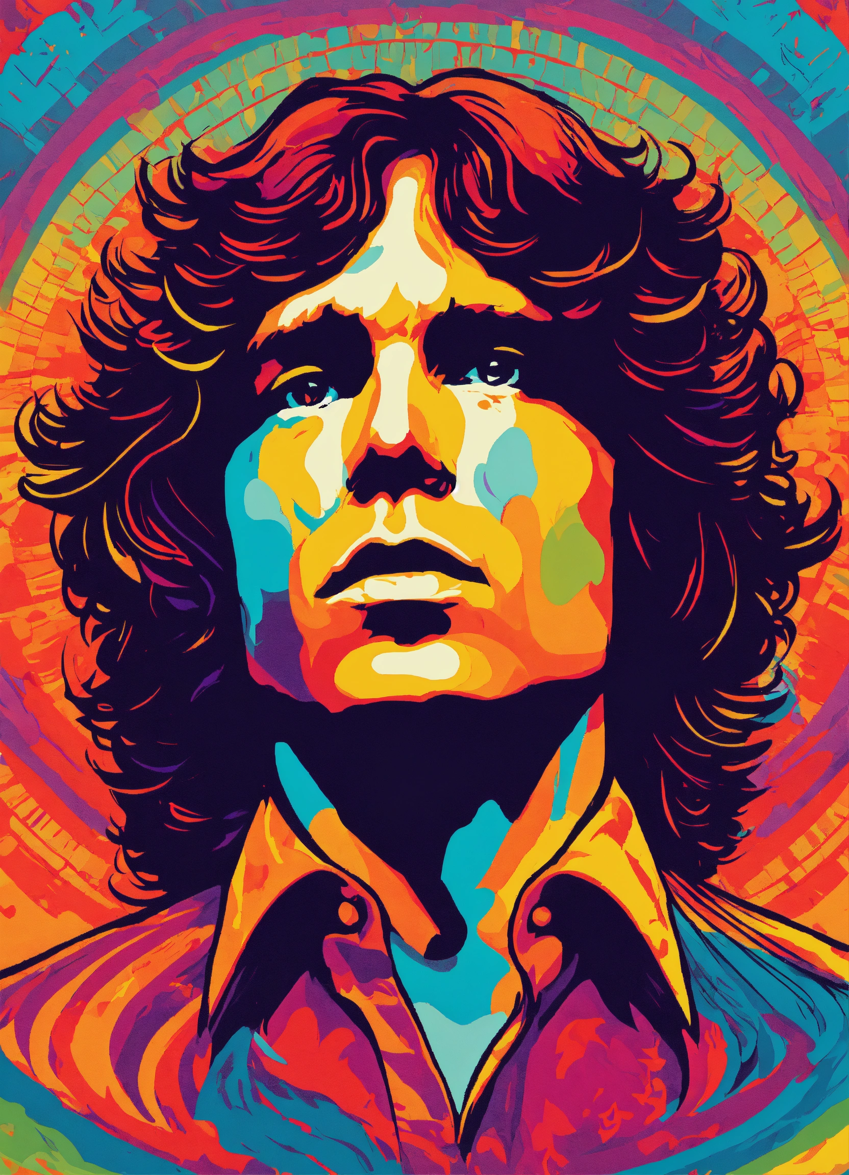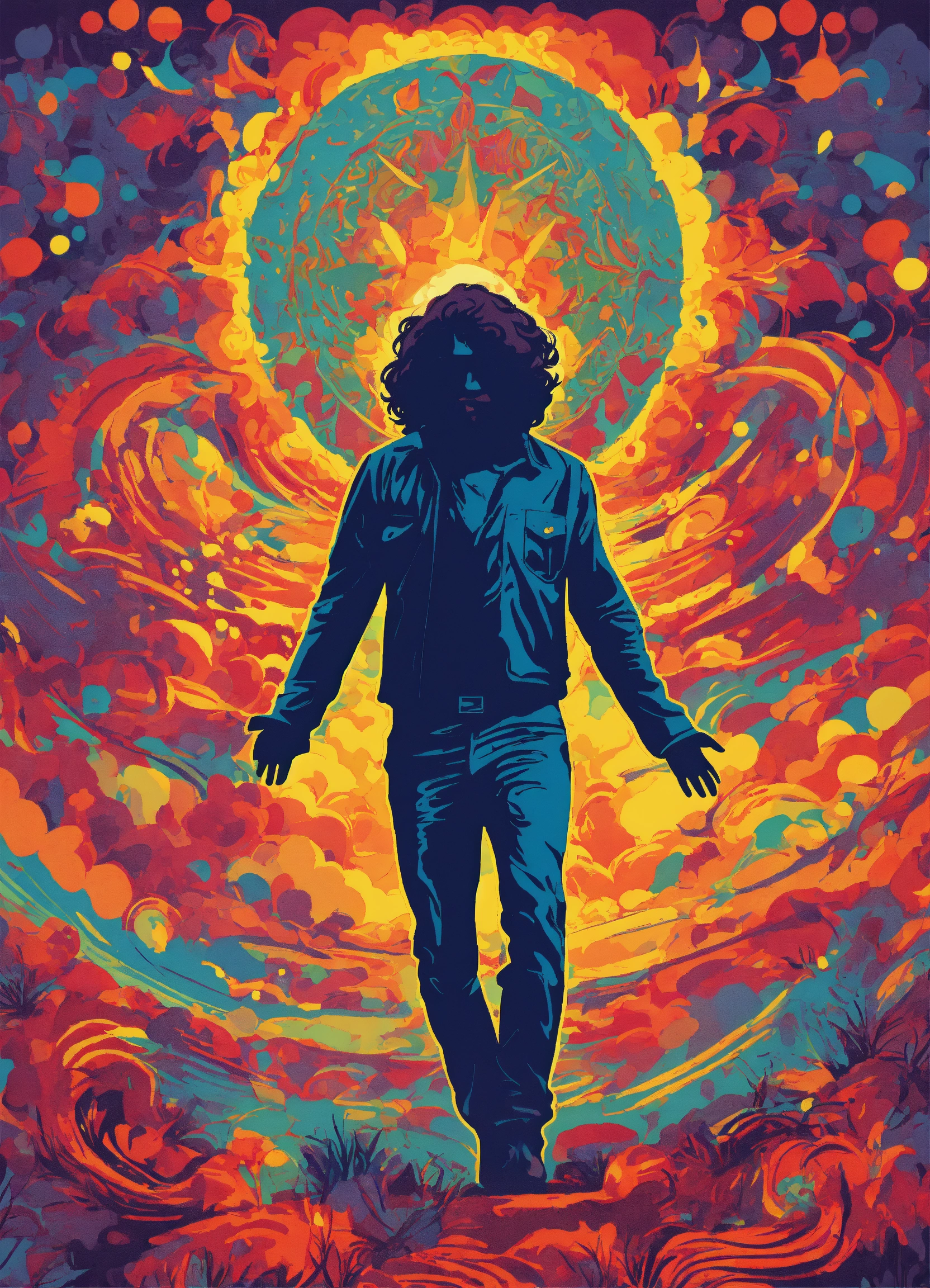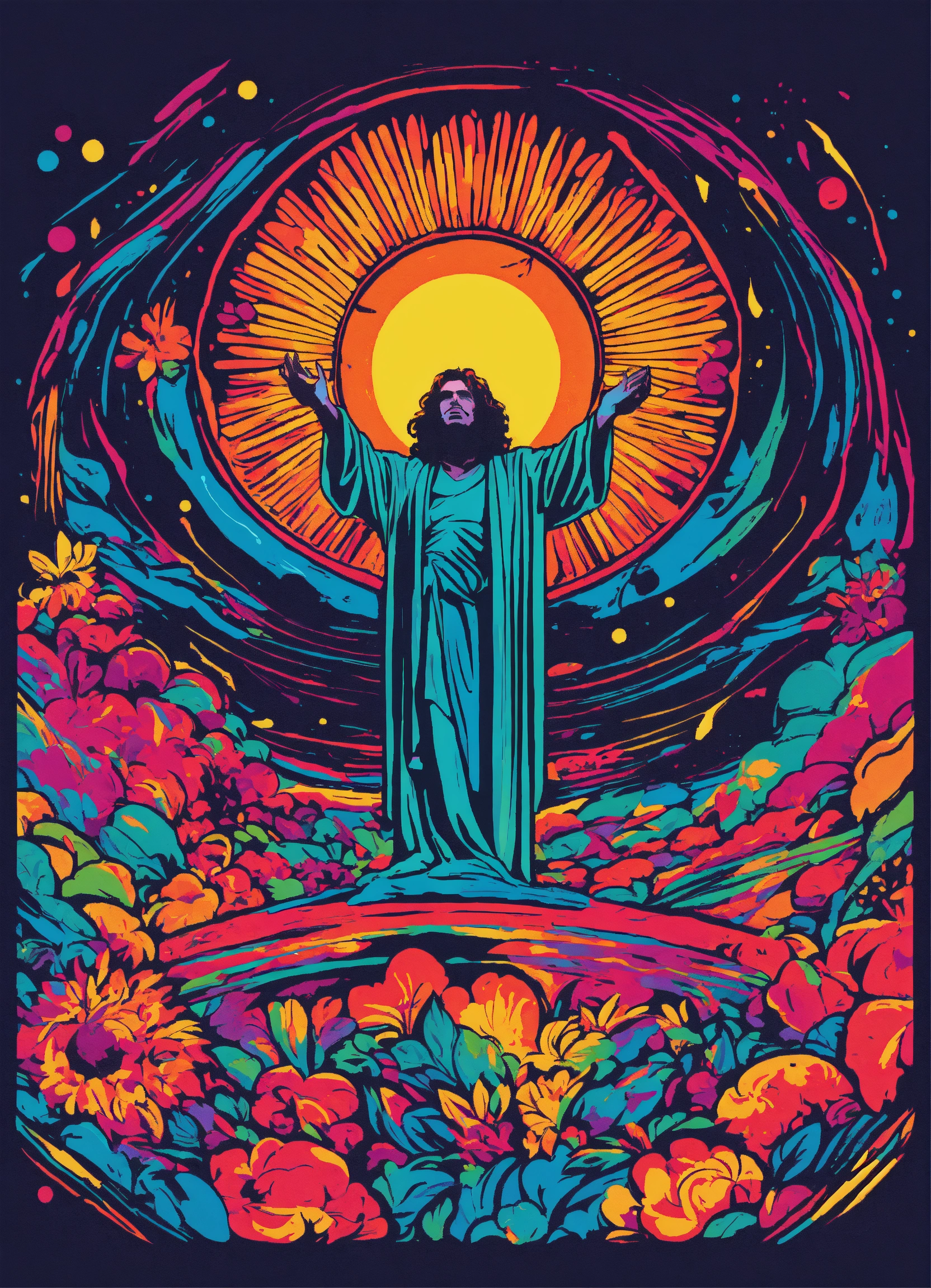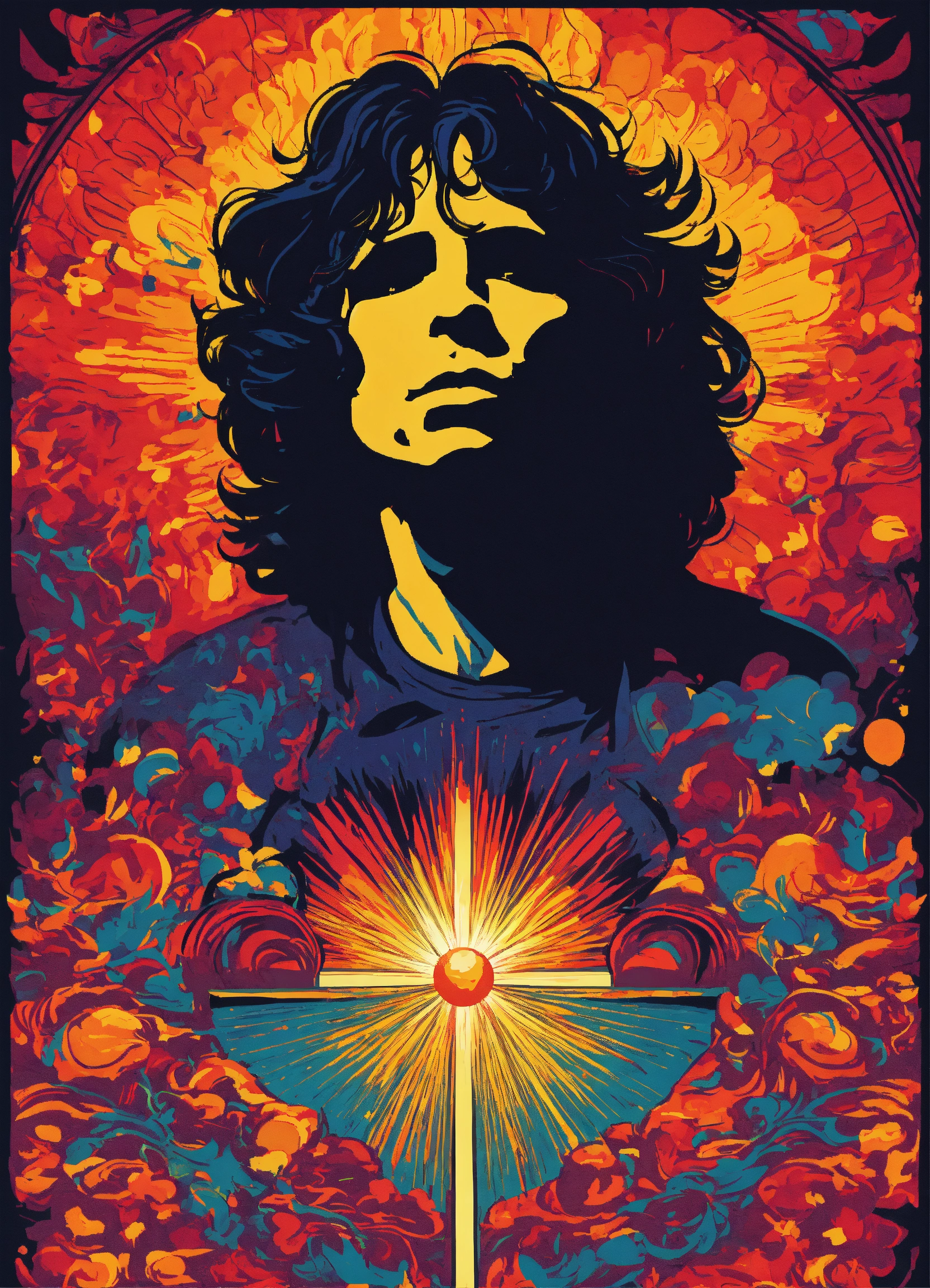 Sticker art, vector t shirt design, vector illustration, abstract representation of the resurrection of jim morrison. a burst of bright, swirling colors emanating from an empty tomb, symbolizing new life and hope.
