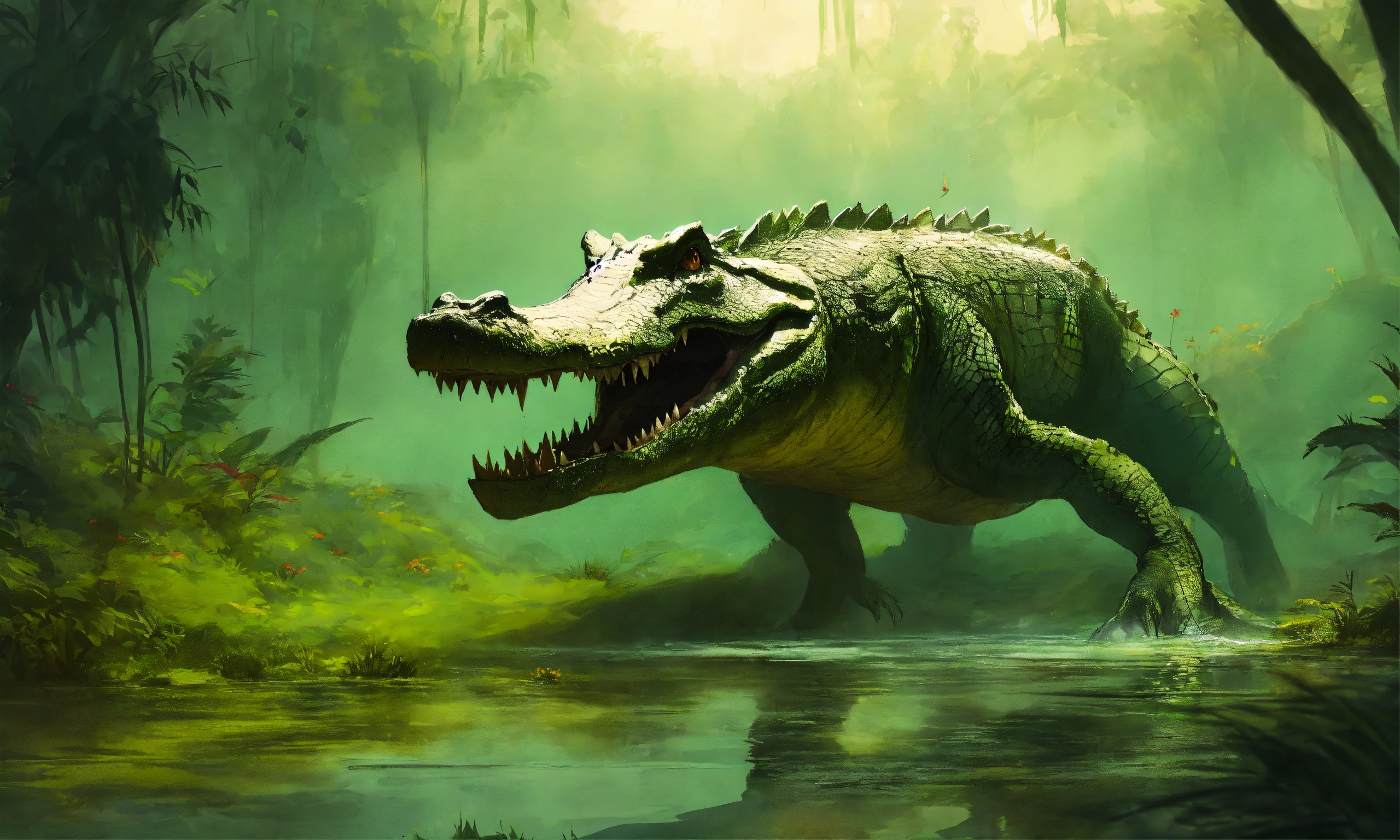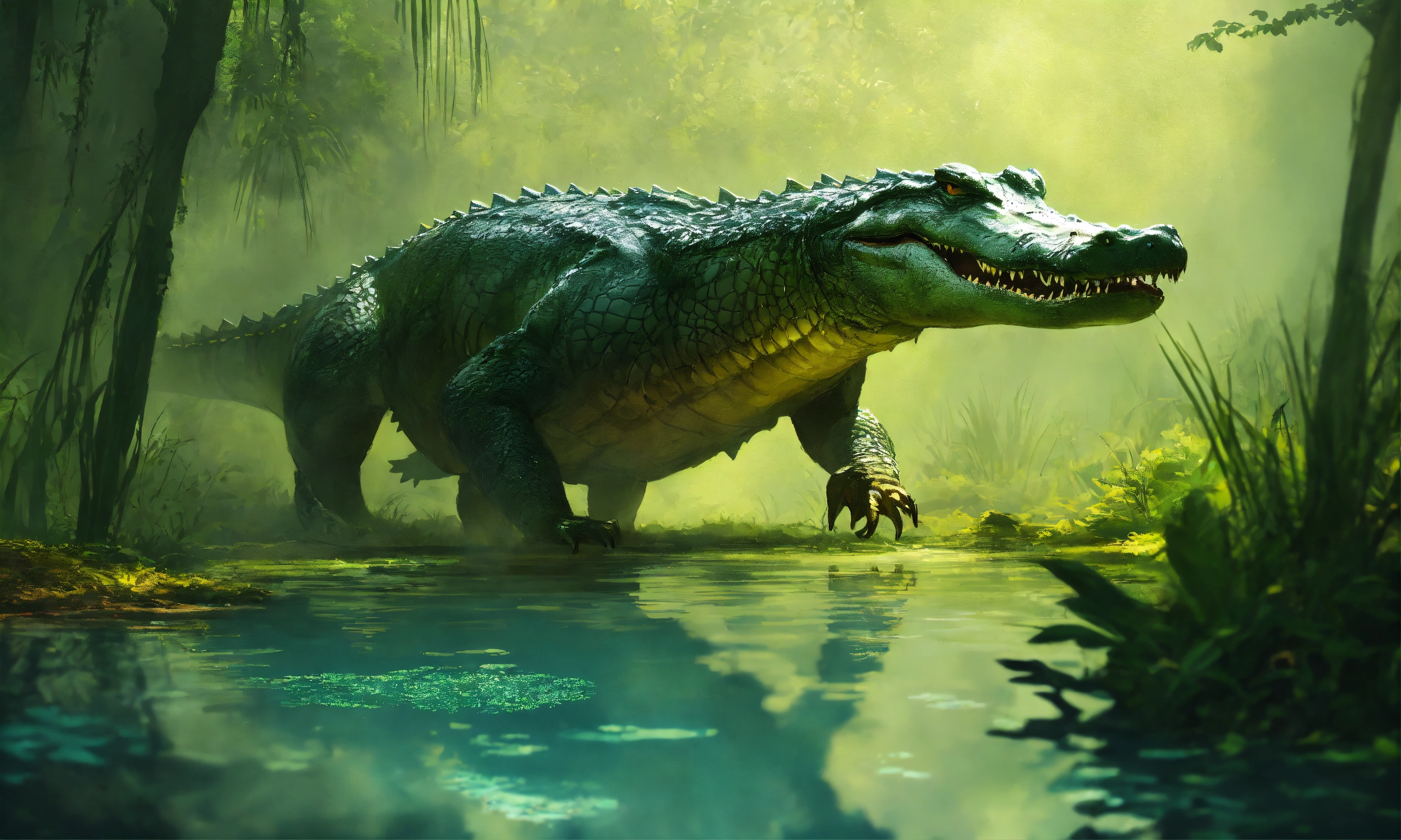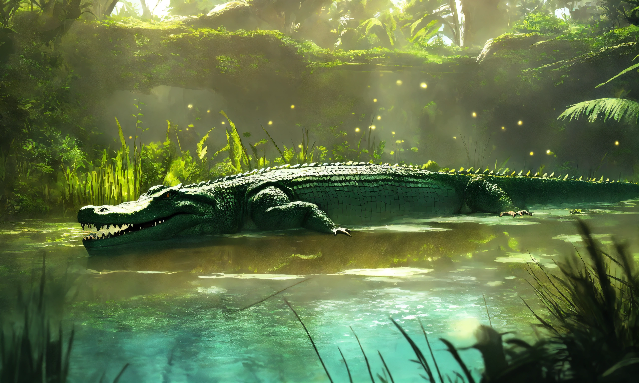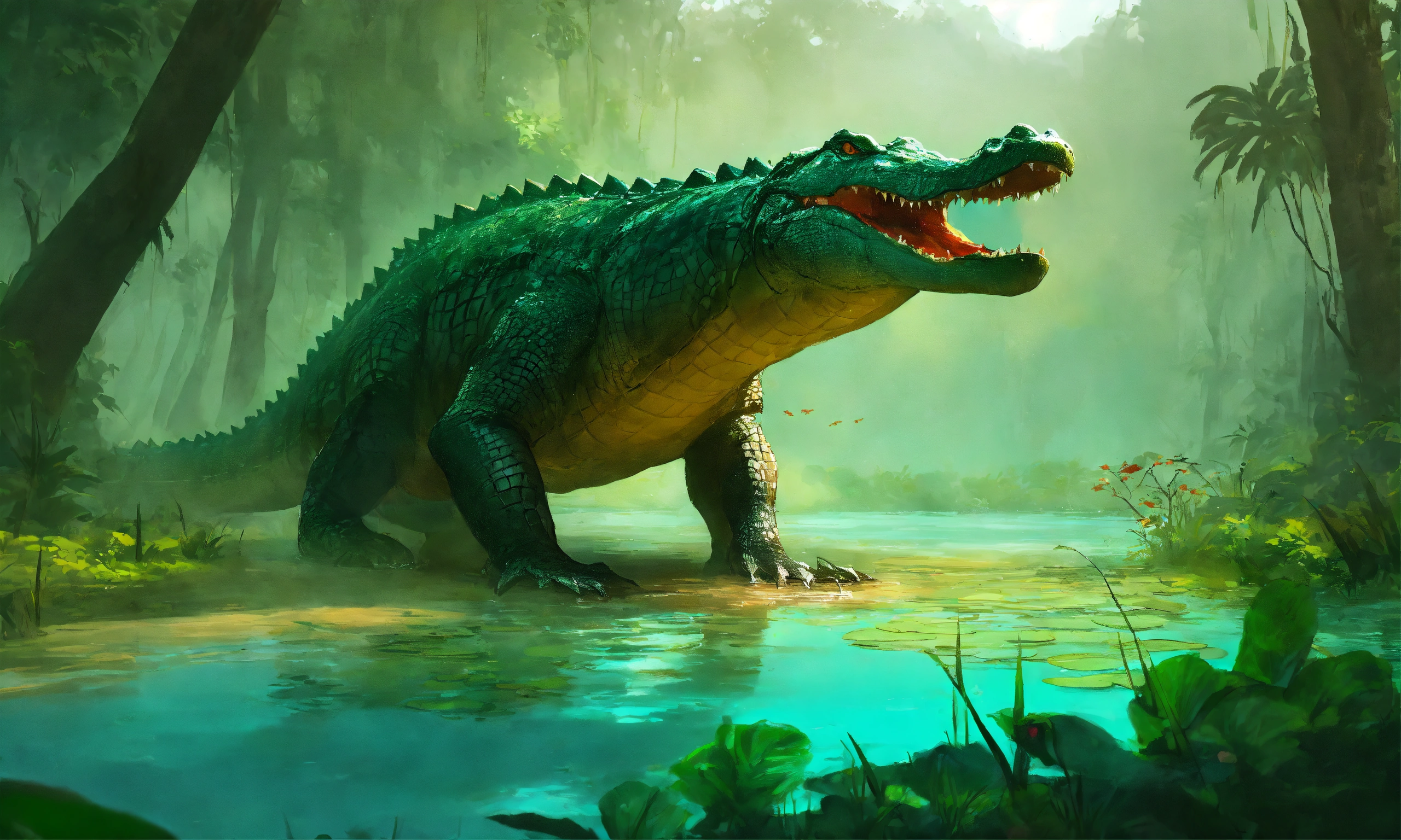 Concept art of a giant crocodile in a subtropical wetland swimming in the murky water