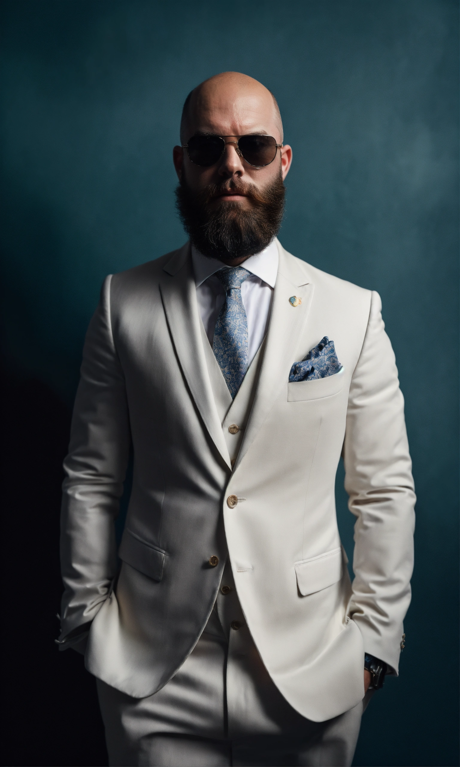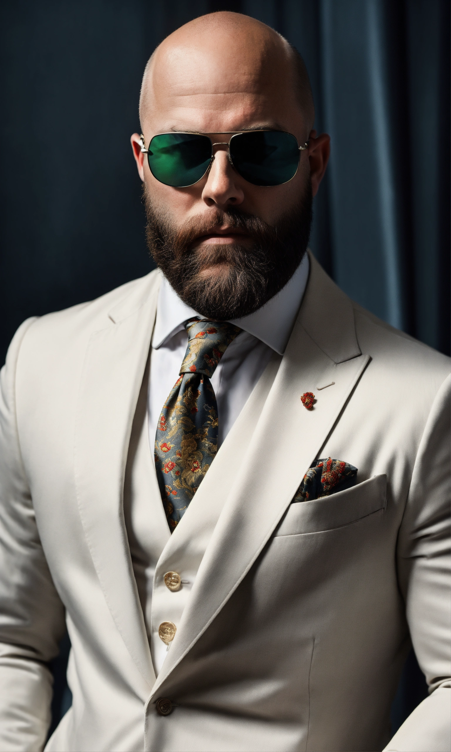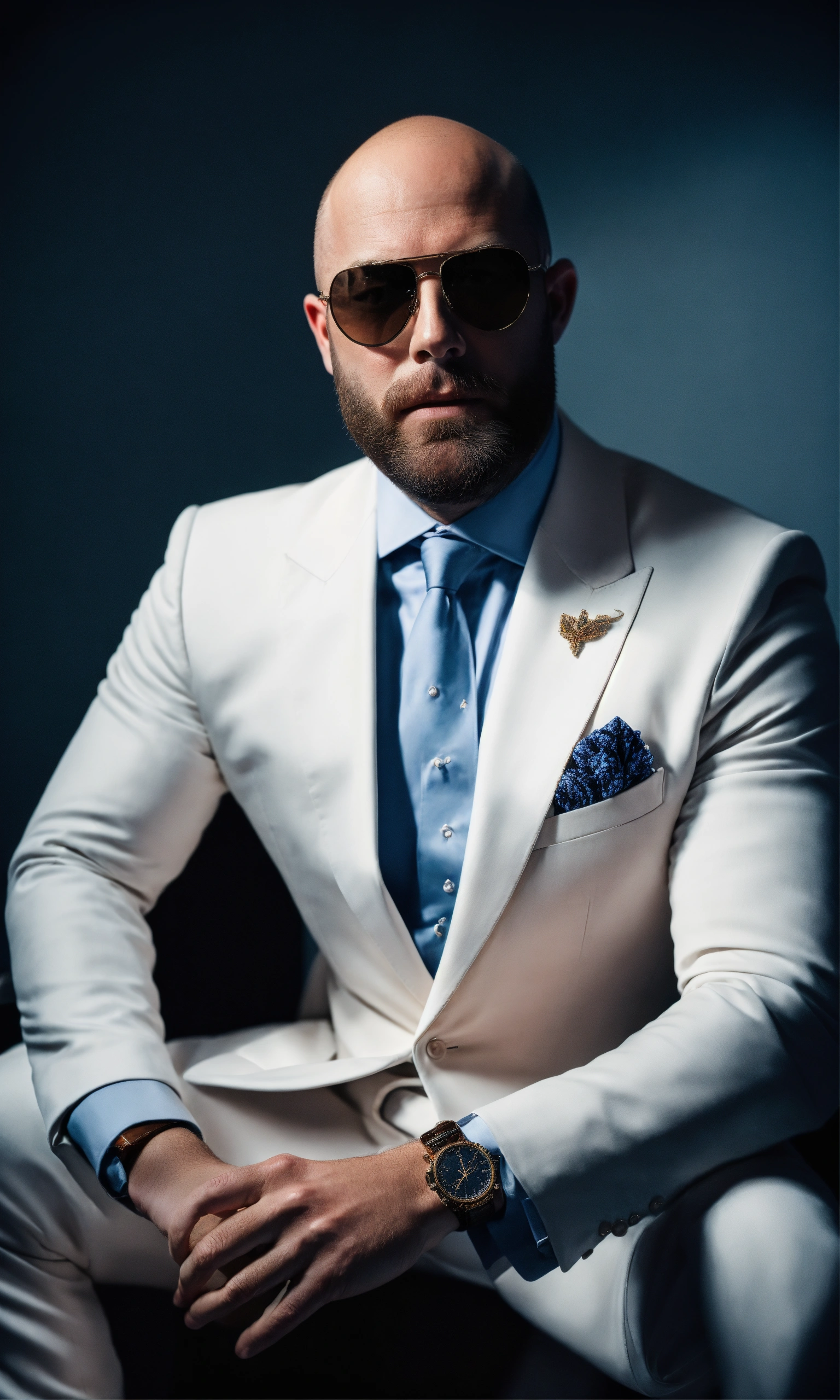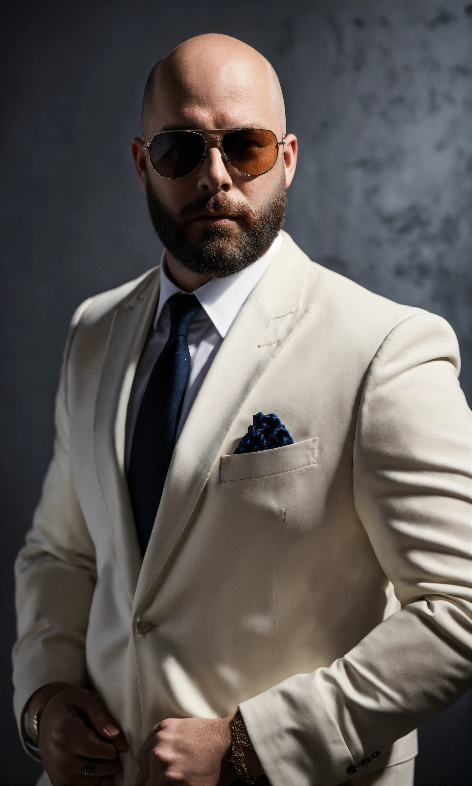 Image of bald andrew tate, three day beard, in a white suit, with luxury sunglasses, facing at camera, super realistic, high resolution, dark room